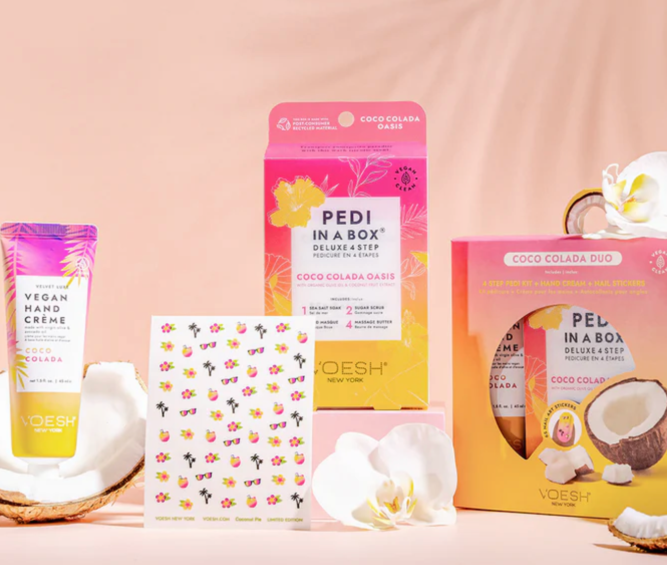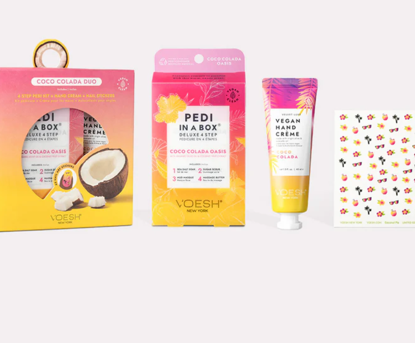 Treat yourself to a tropical getaway with the Coco Colada Oasis Duo, which includes our Pedi in a Box Deluxe 4 Step, Vegan Hand & Body Crème and fun nail art stickers. This spa pedicure and luxurious lotion duo is the ultimate ticket to flip-flop bliss. Get ready to soak, scrub, mask, and massage your way to silky-soft, coconut-scented feet and skin. With the deluxe pedicure kit, you'll start off with a detoxifying sea salt soak, followed by a gentle sugar scrub that will slough off all that dry skin. Then, nourish your feet with a mud masque that will leave them feeling like they've just been to the spa. Finally, seal in all that moisture with a massage butter infused with the warm and creamy aroma of coconuts. And, with the Coco Colada Oasis Vegan Hand & Body Crème, you'll be able to enjoy that same luxurious, tropical experience all over your skin. Whether you're slathering it on after a shower, or using it as a daily moisturizer, this lotion is packed with nature's finest ingredients, like coconut extract, organic olive oil, and avocado oil, to leave you with soft, hydrated, and glowing skin. Close your eyes, take a deep breath, and imagine yourself on a sandy beach with a piña colada in hand. Paradise, here you come