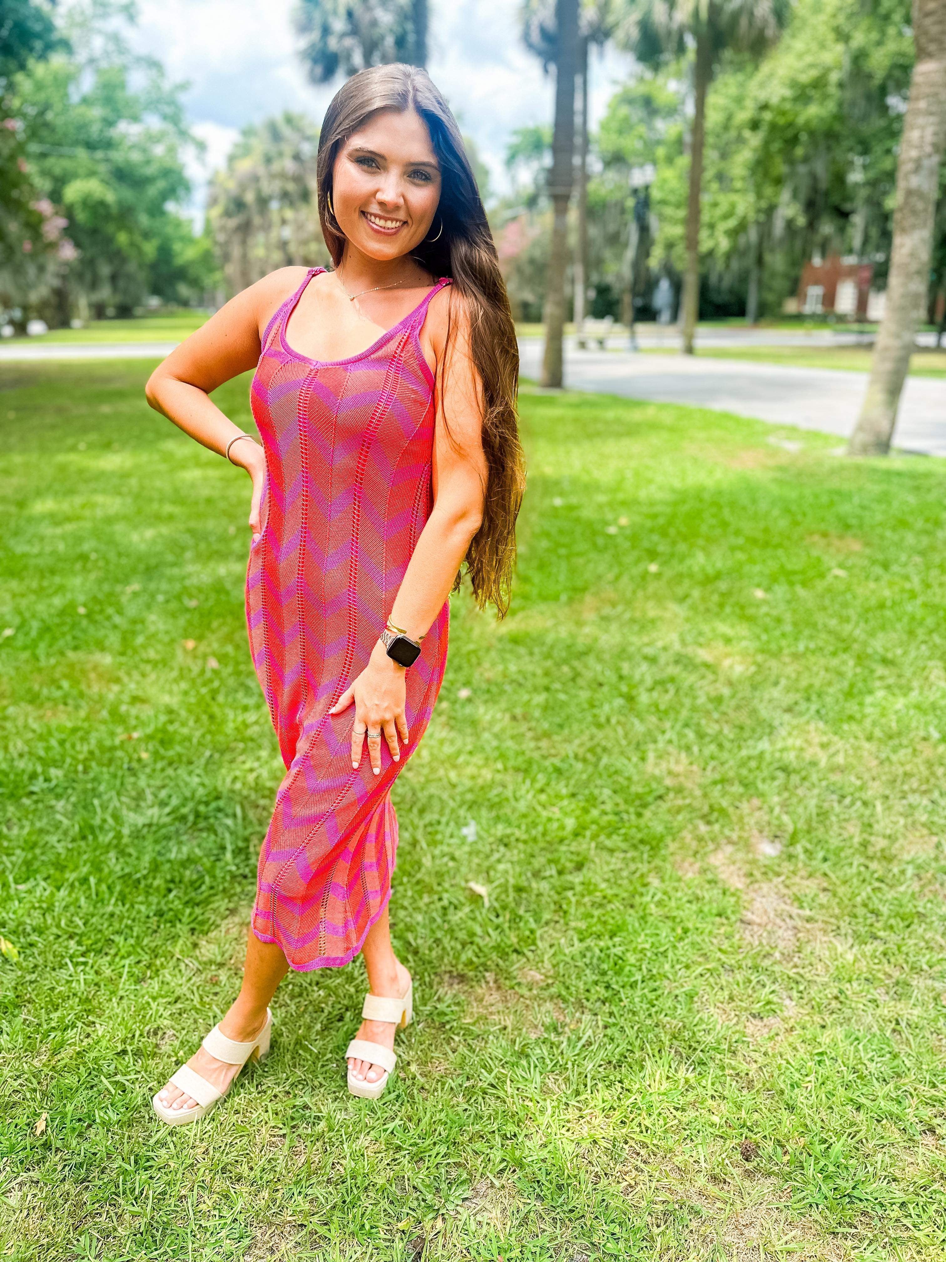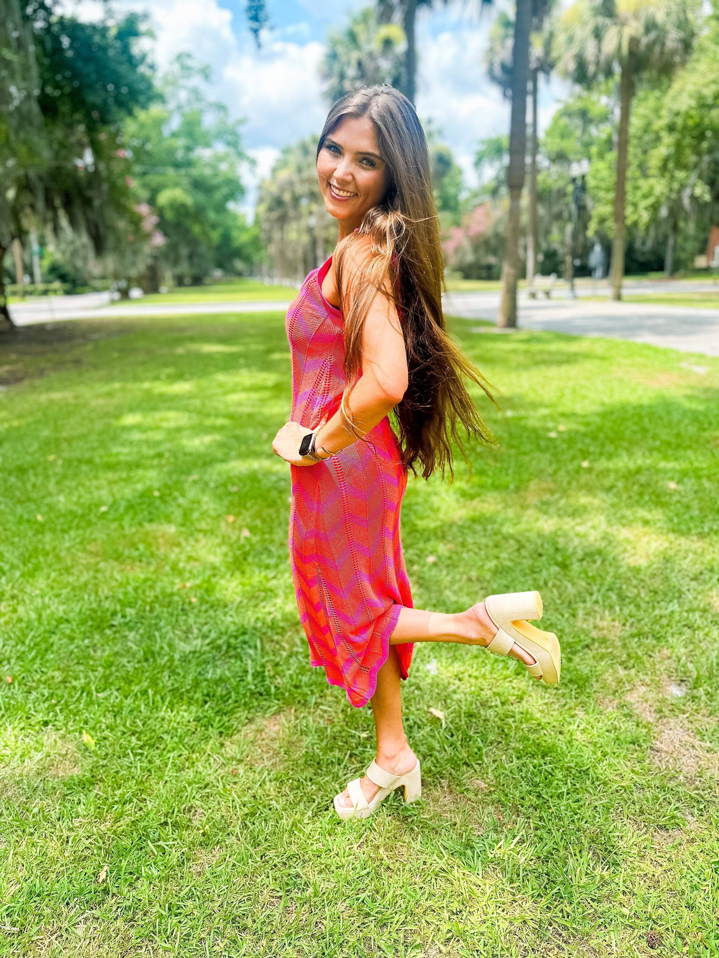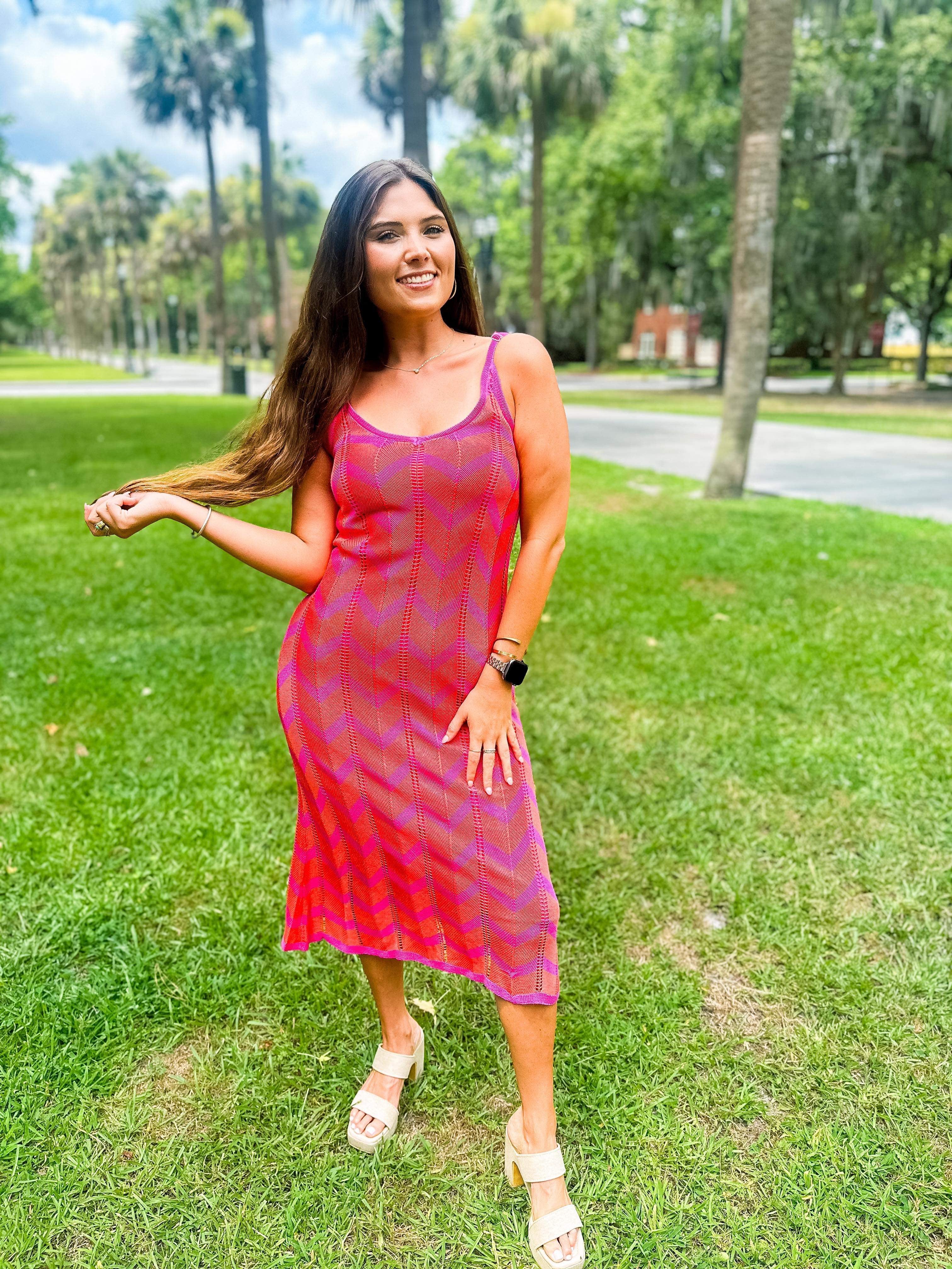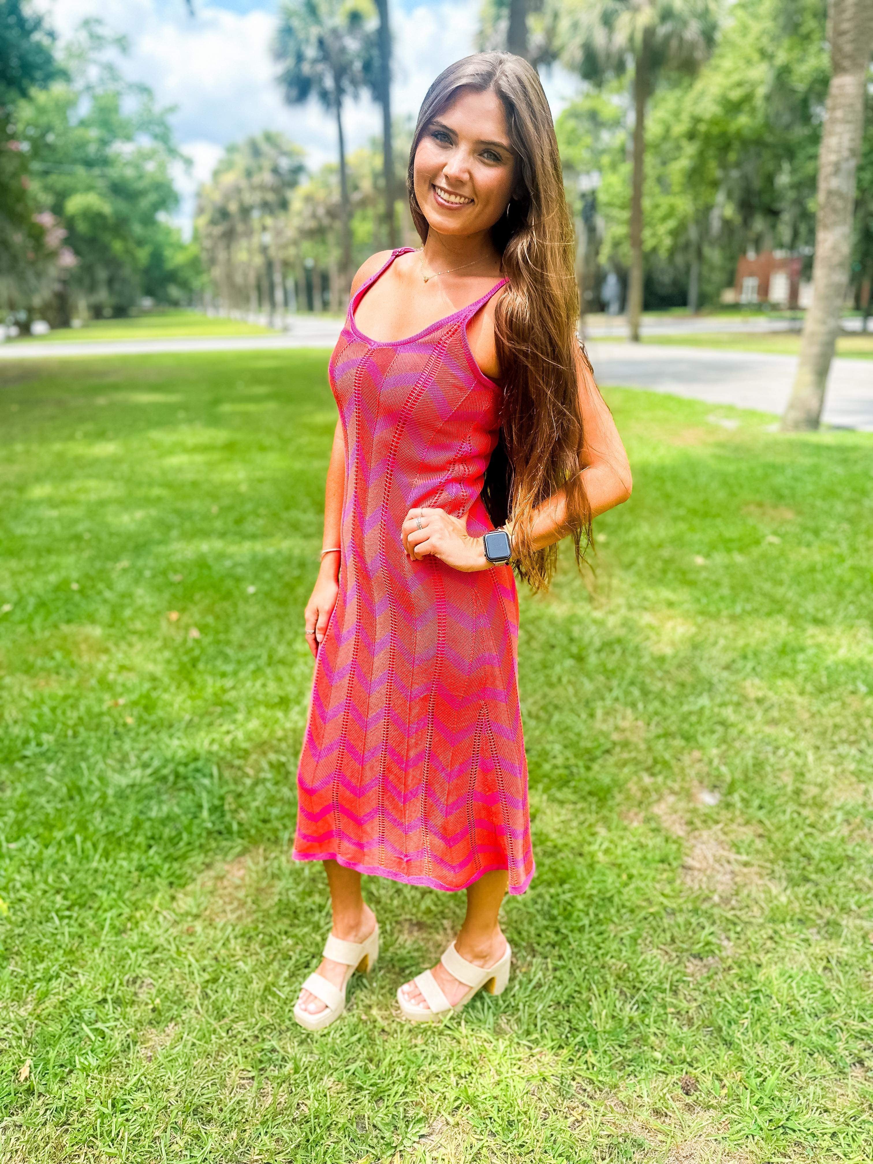 This Color Block Chevron Midi Dress is the perfect addition to your wardrobe. The flattering fit and lightweight fabric make it perfect for vacation dinners and fun days out. Show off your style in a vibrant mix of colors.