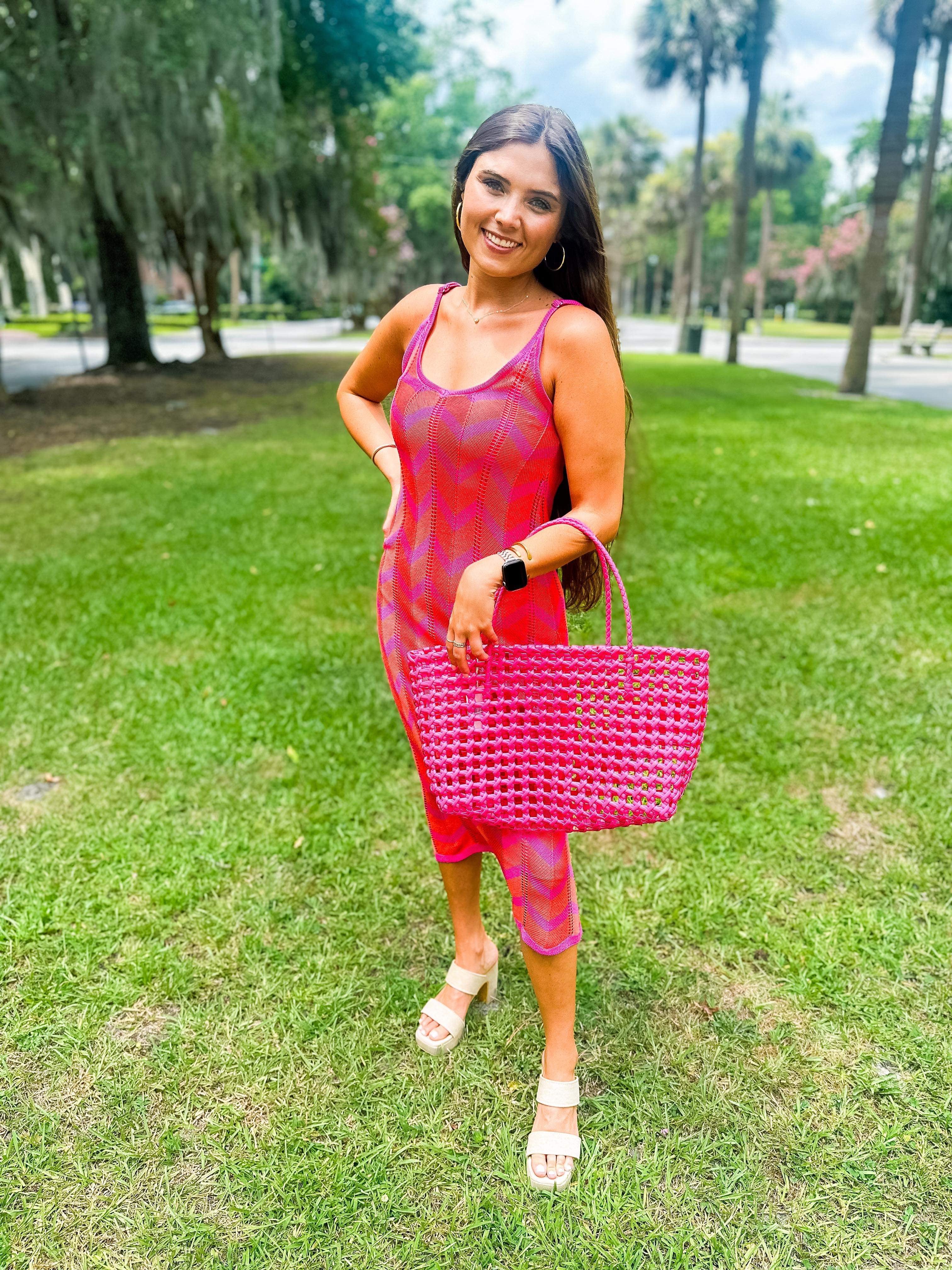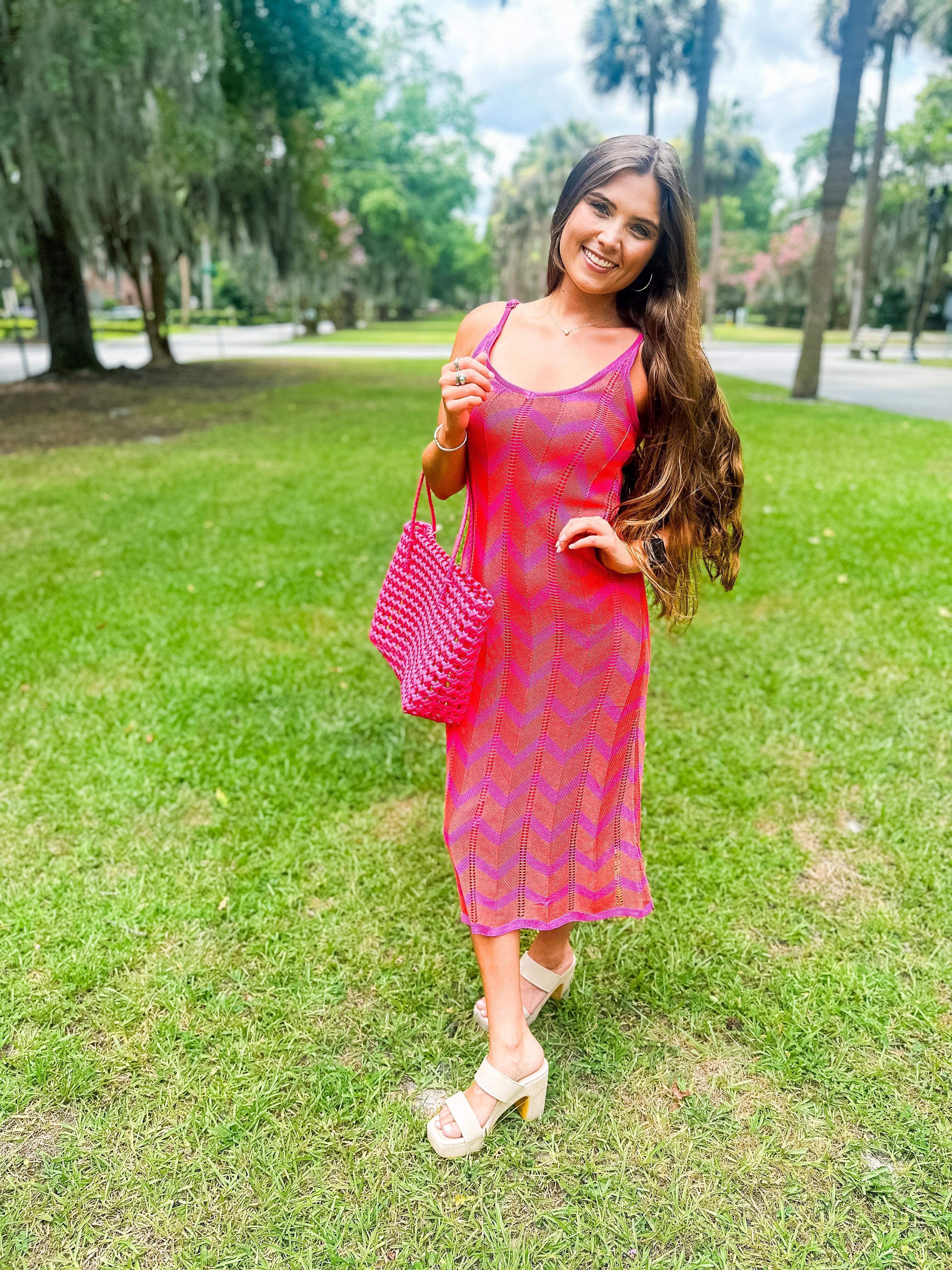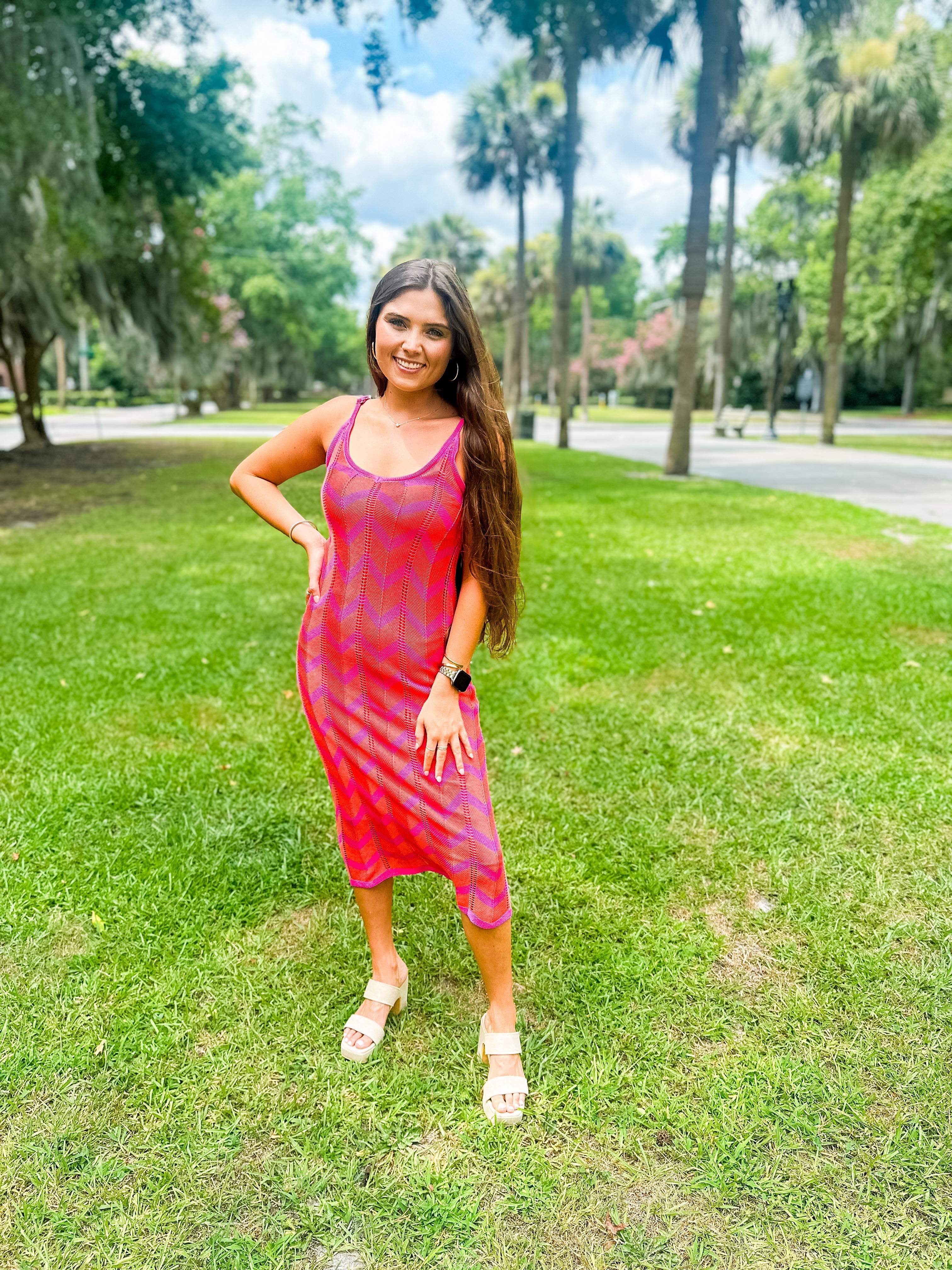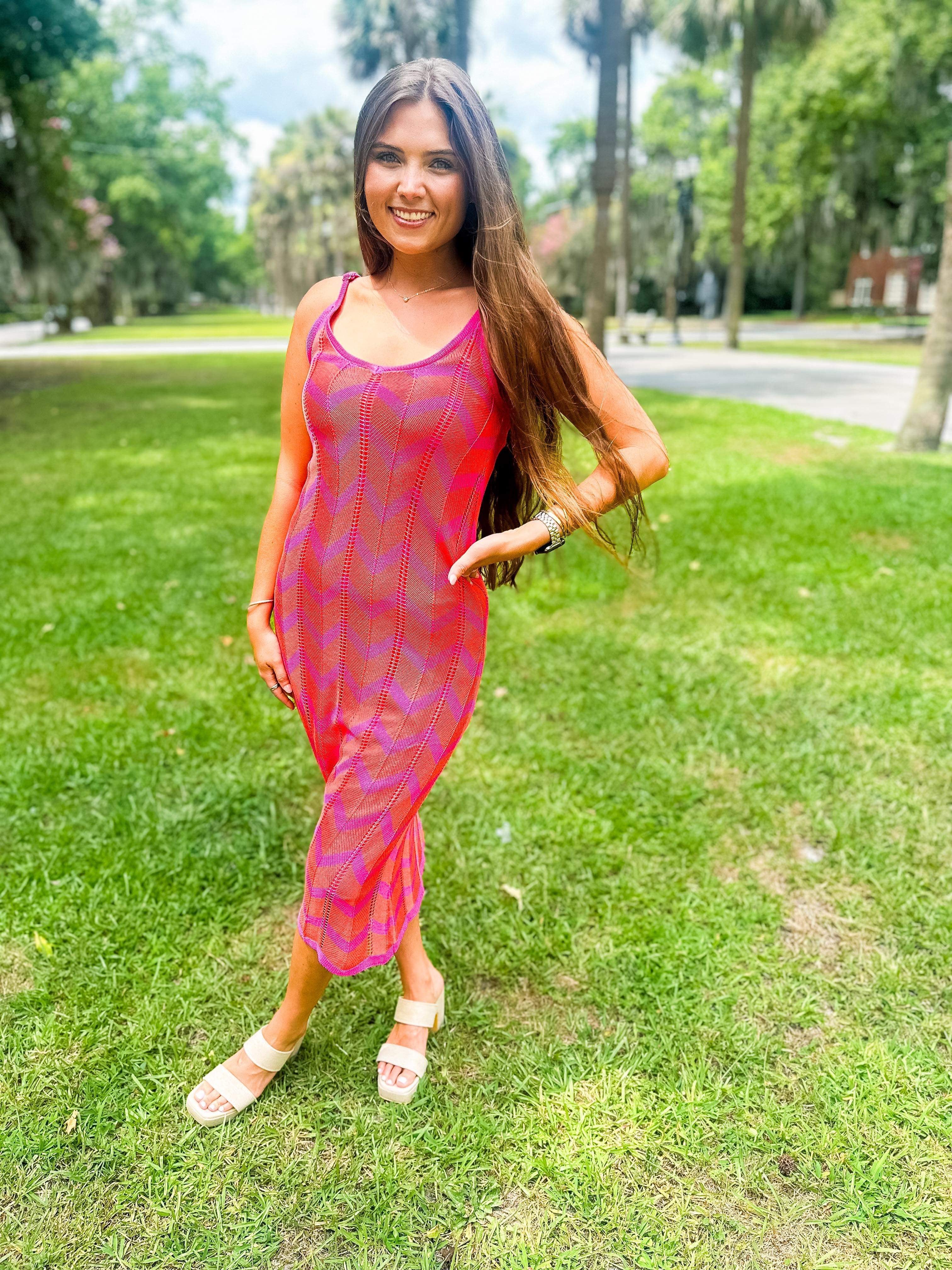 This Color Block Chevron Midi Dress is the perfect addition to your wardrobe. The flattering fit and lightweight fabric make it perfect for vacation dinners and fun days out. Show off your style in a vibrant mix of colors.