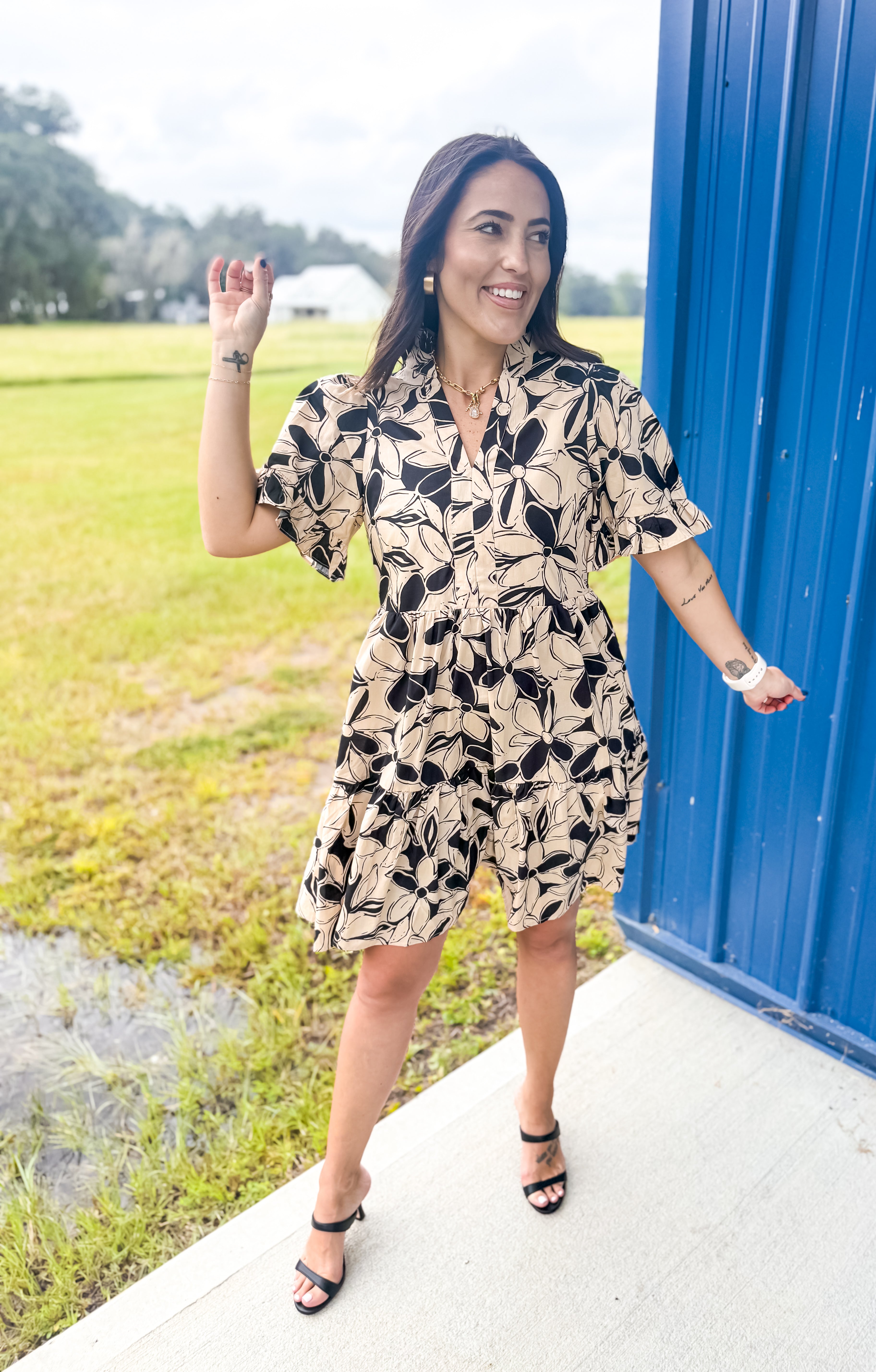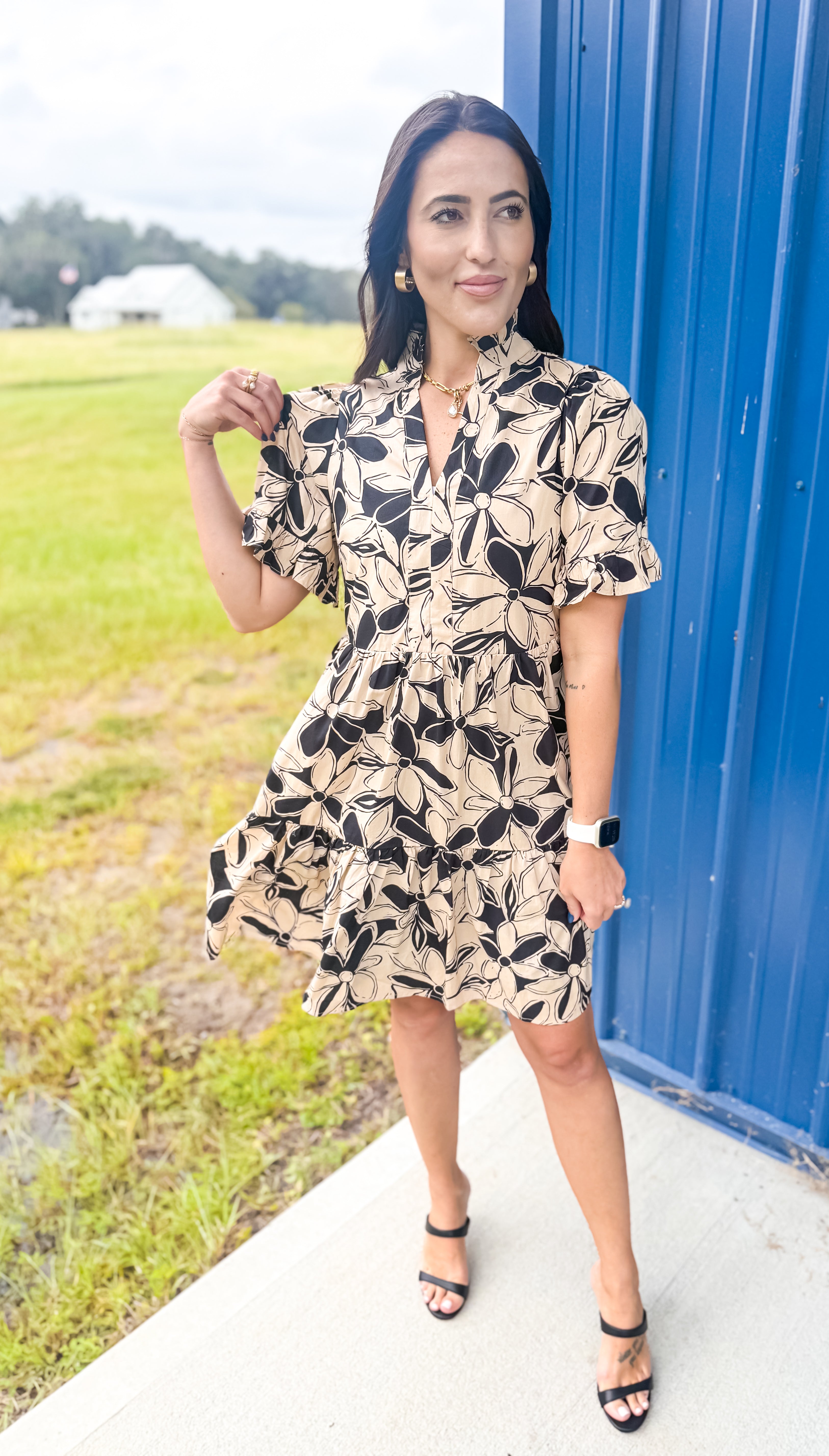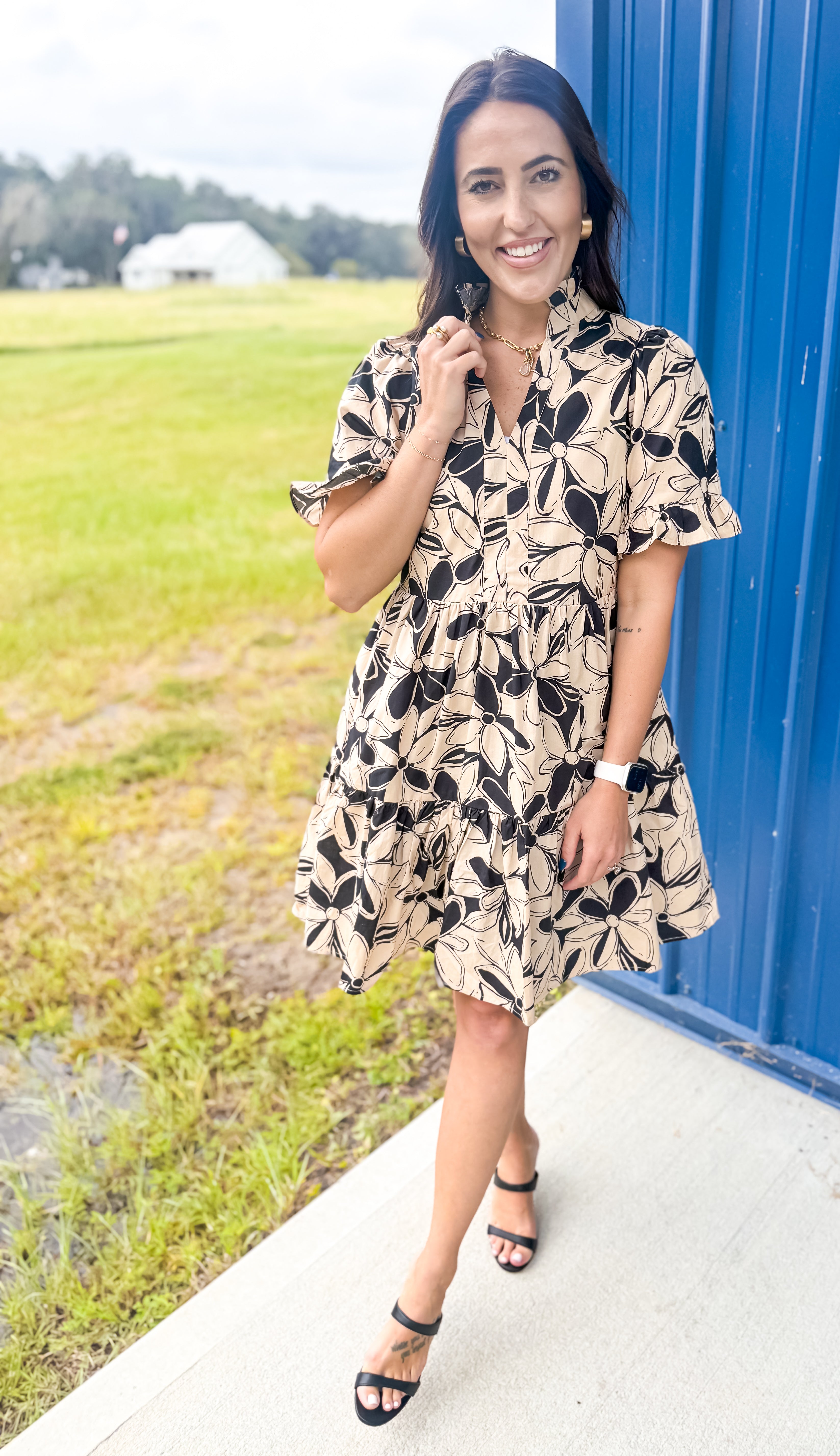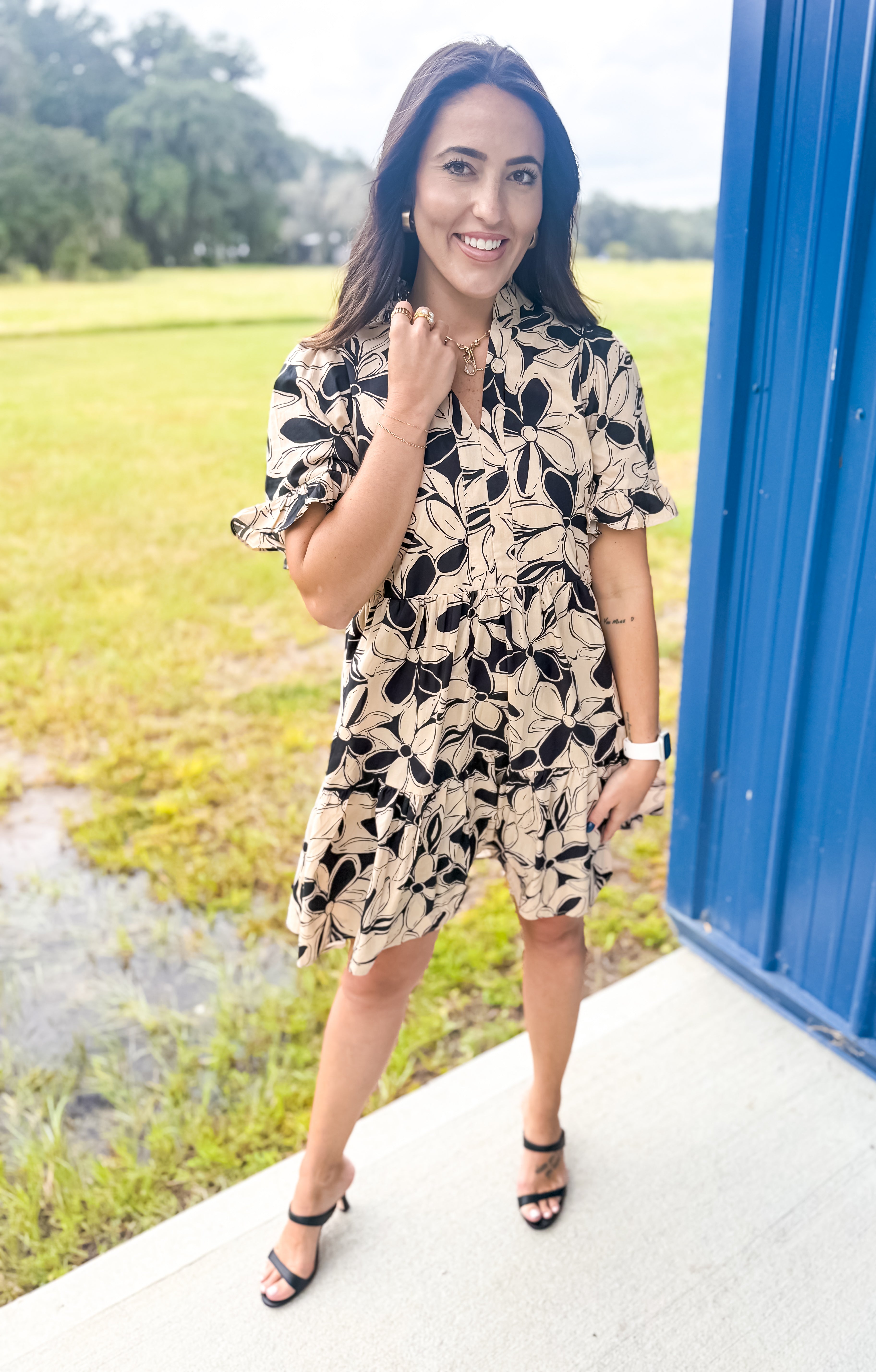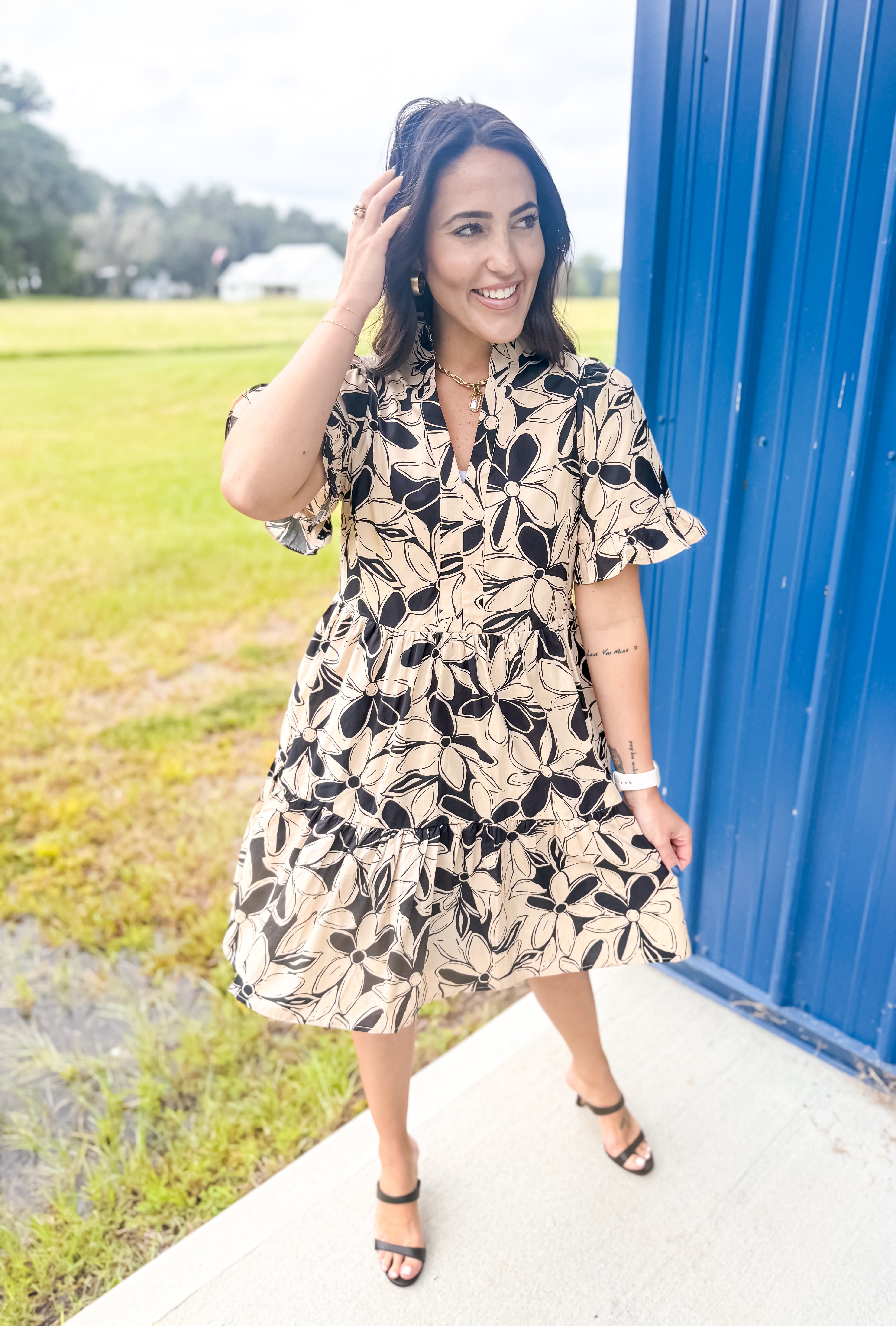 Step out in style with our Colors In The Fall Dress in Taupe, the perfect blend of charm and elegance. This dress features a beautiful floral print on a classic taupe base, with neutral colors that make the design perfect for any occasion. The V-neckline is adorned with a delicate ruffle, complementing the short sleeves, which also have a playful ruffle detail. Fully lined for comfort, this mini dress offers a modest length with the convenience of side pockets. Perfect for any occasion, this dress combines femininity with practicality in a way that’s effortlessly chic.