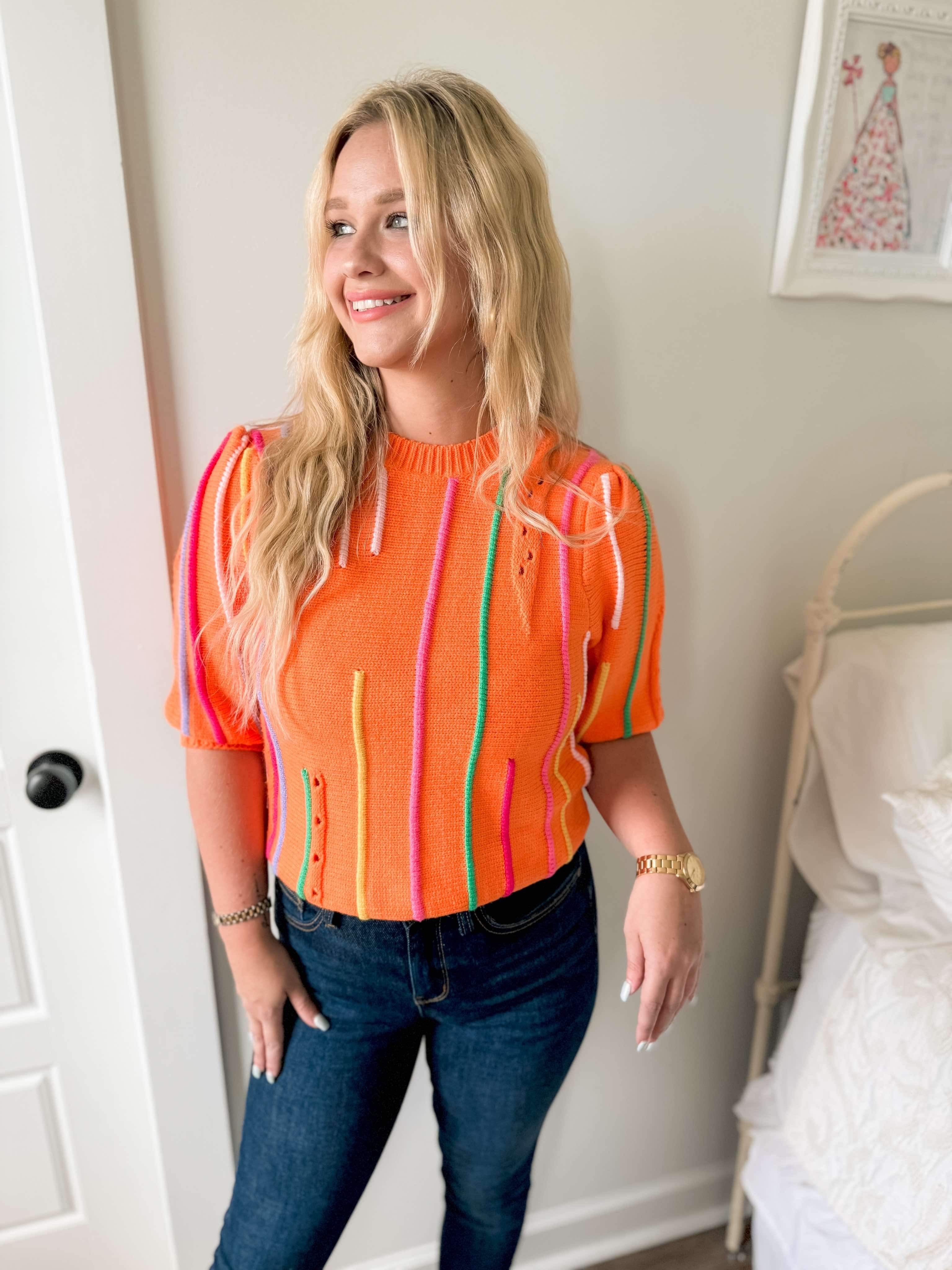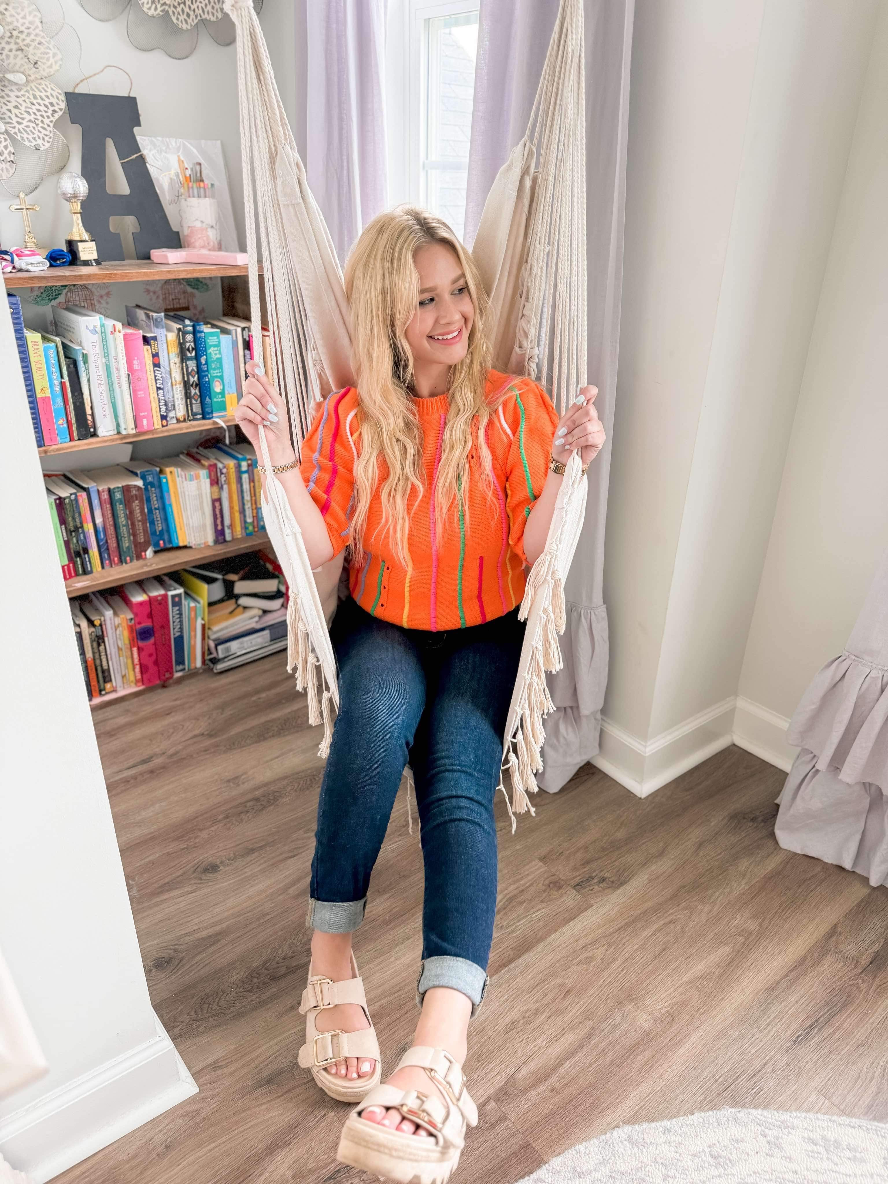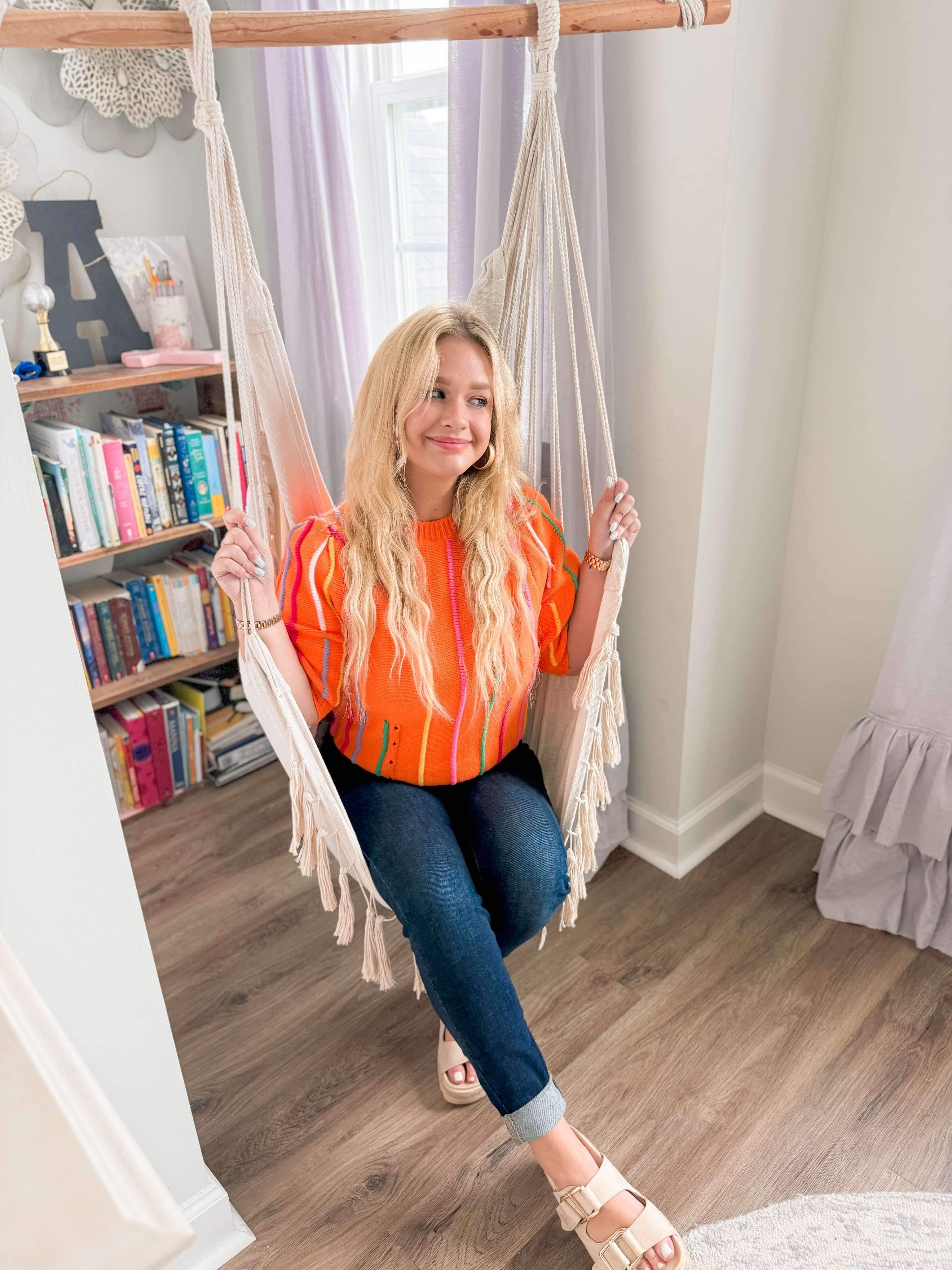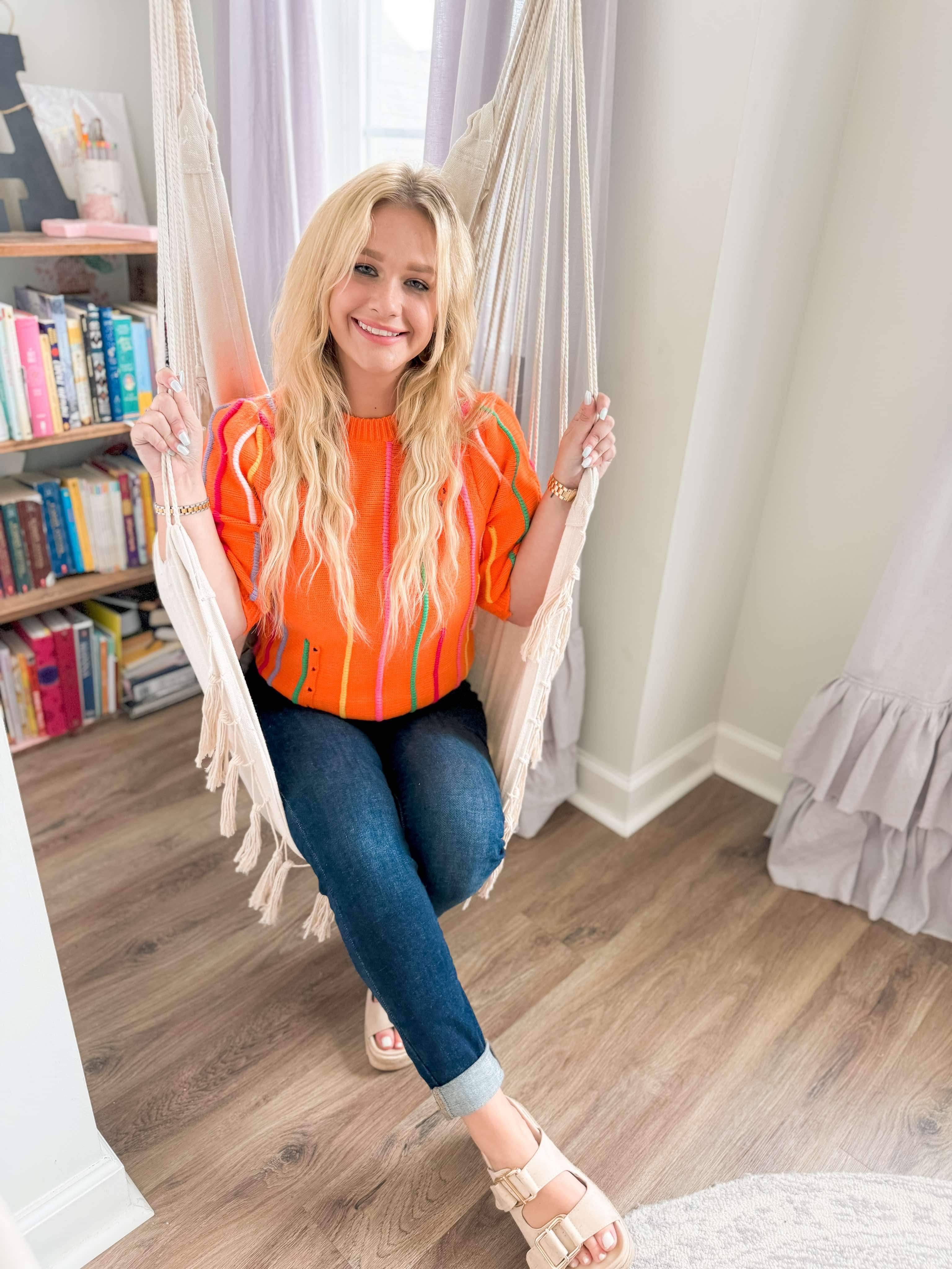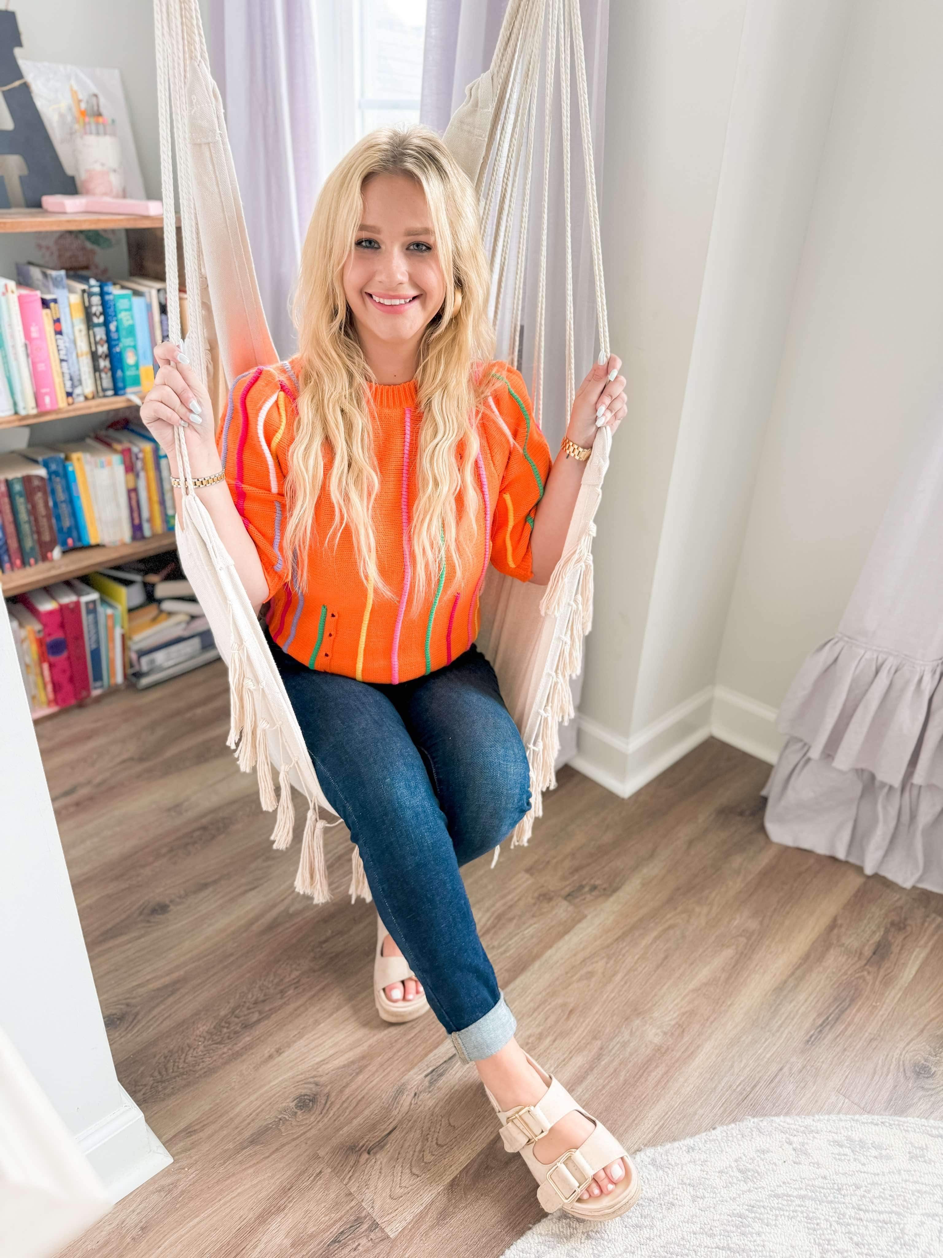 Introducing our Come Back Sweater in Orange. GIRLS - do you even need to read this? This sweater is absolutely beautiful. We are loving the colors for fall. It is on an orange base with pink shades, green, blue, purple and yellow stripes through out that are broken up around the sweater. We are loving all the little extra details on this sweater. Wear her with any type of bottoms.