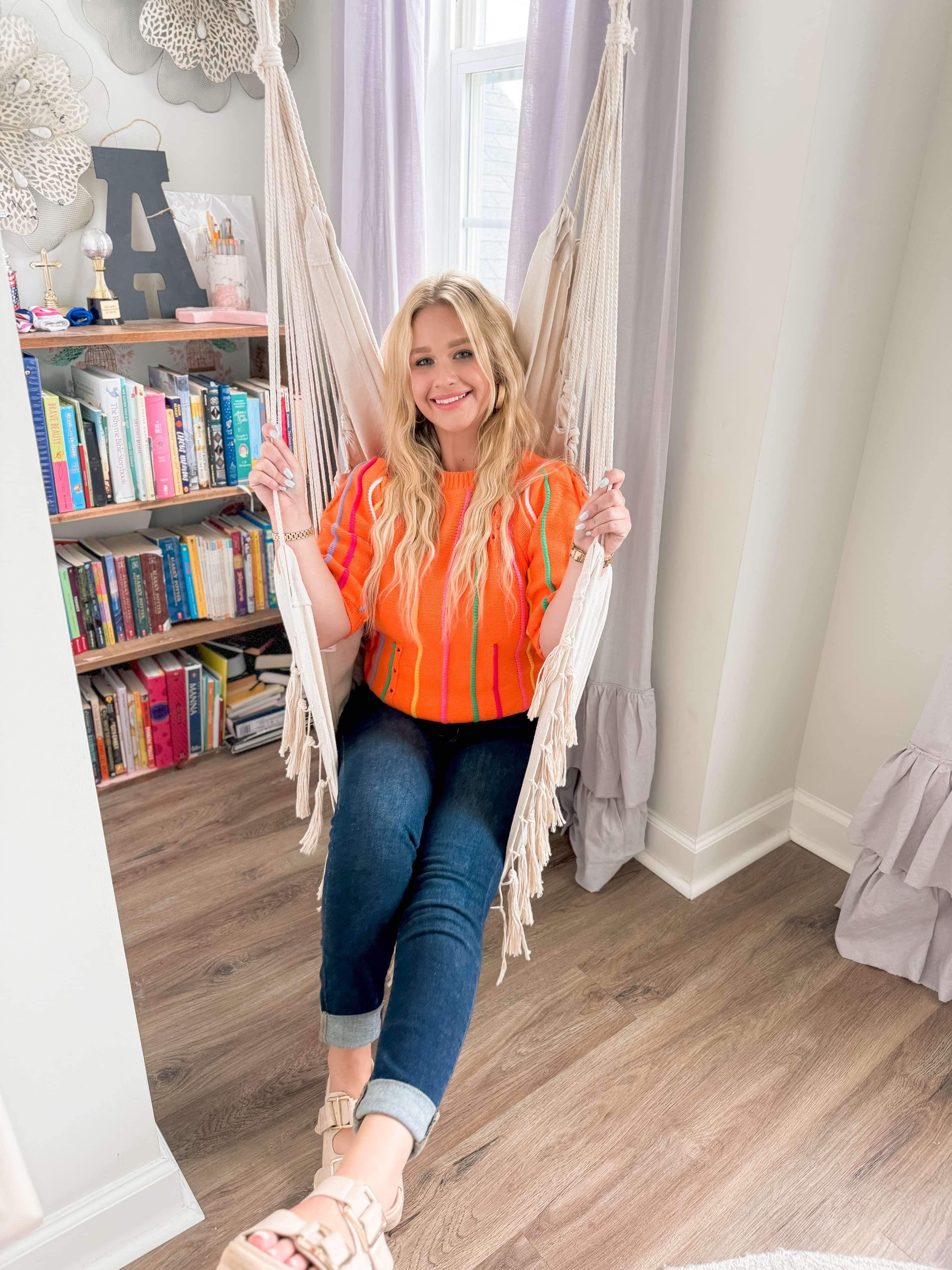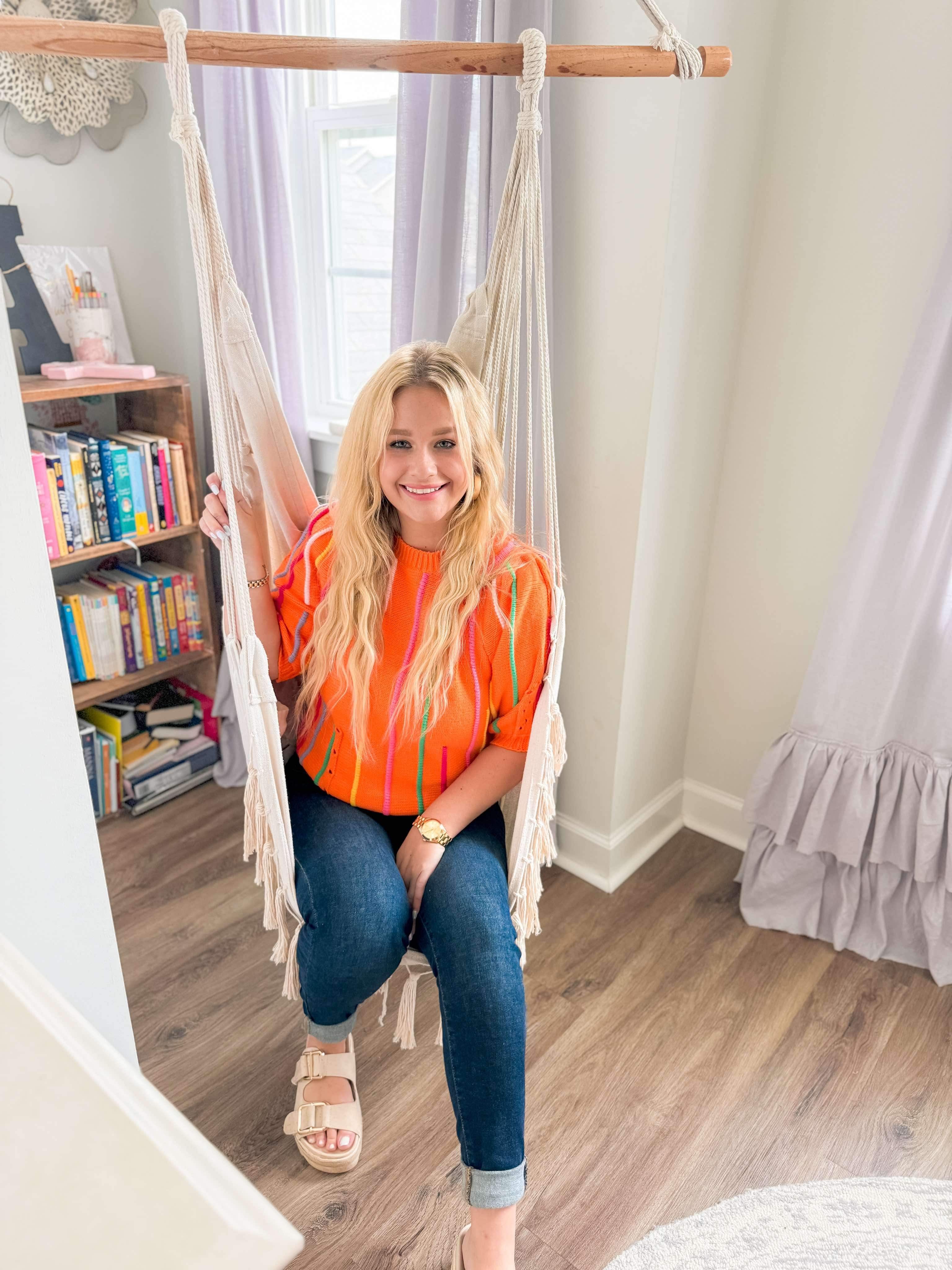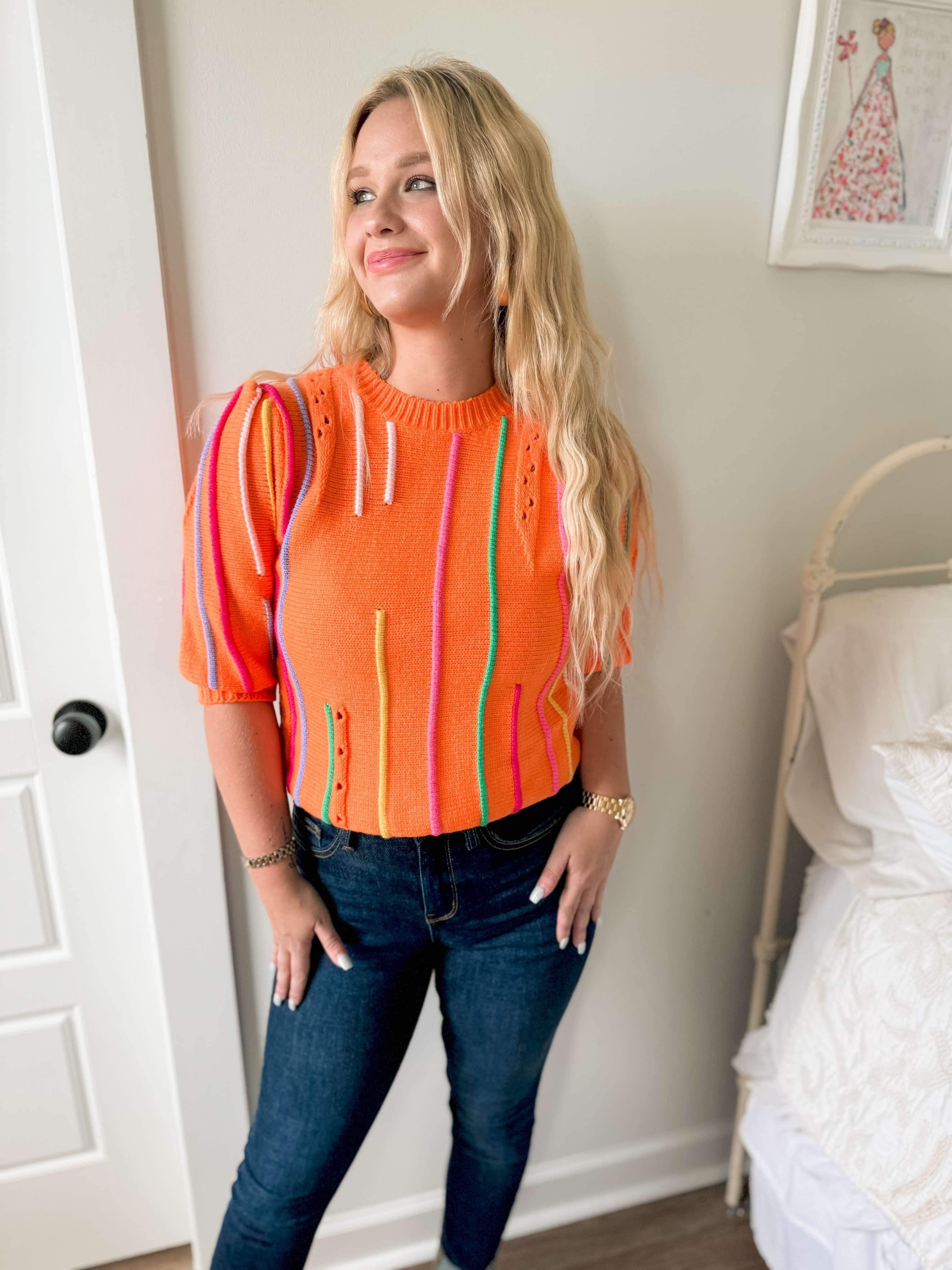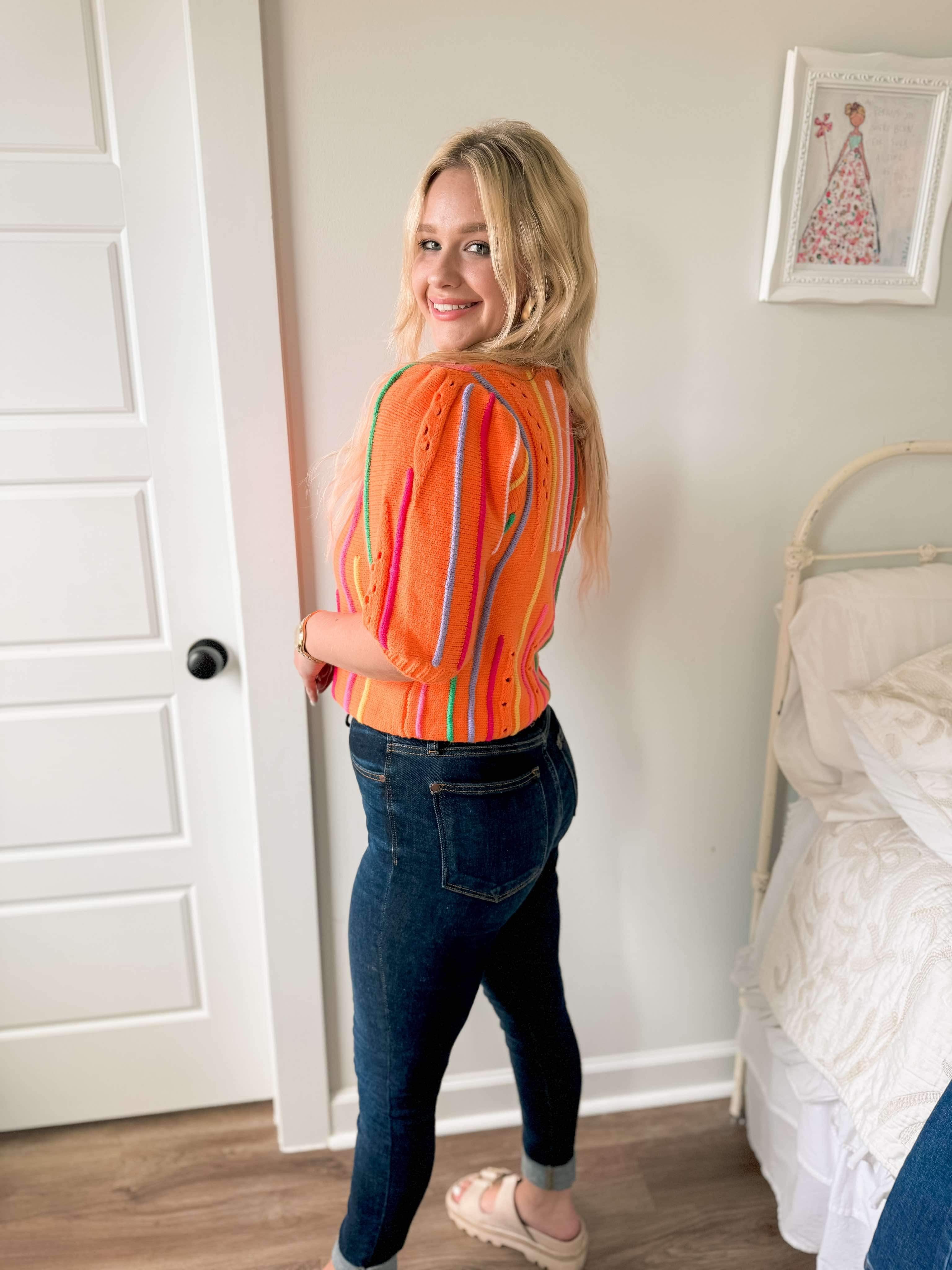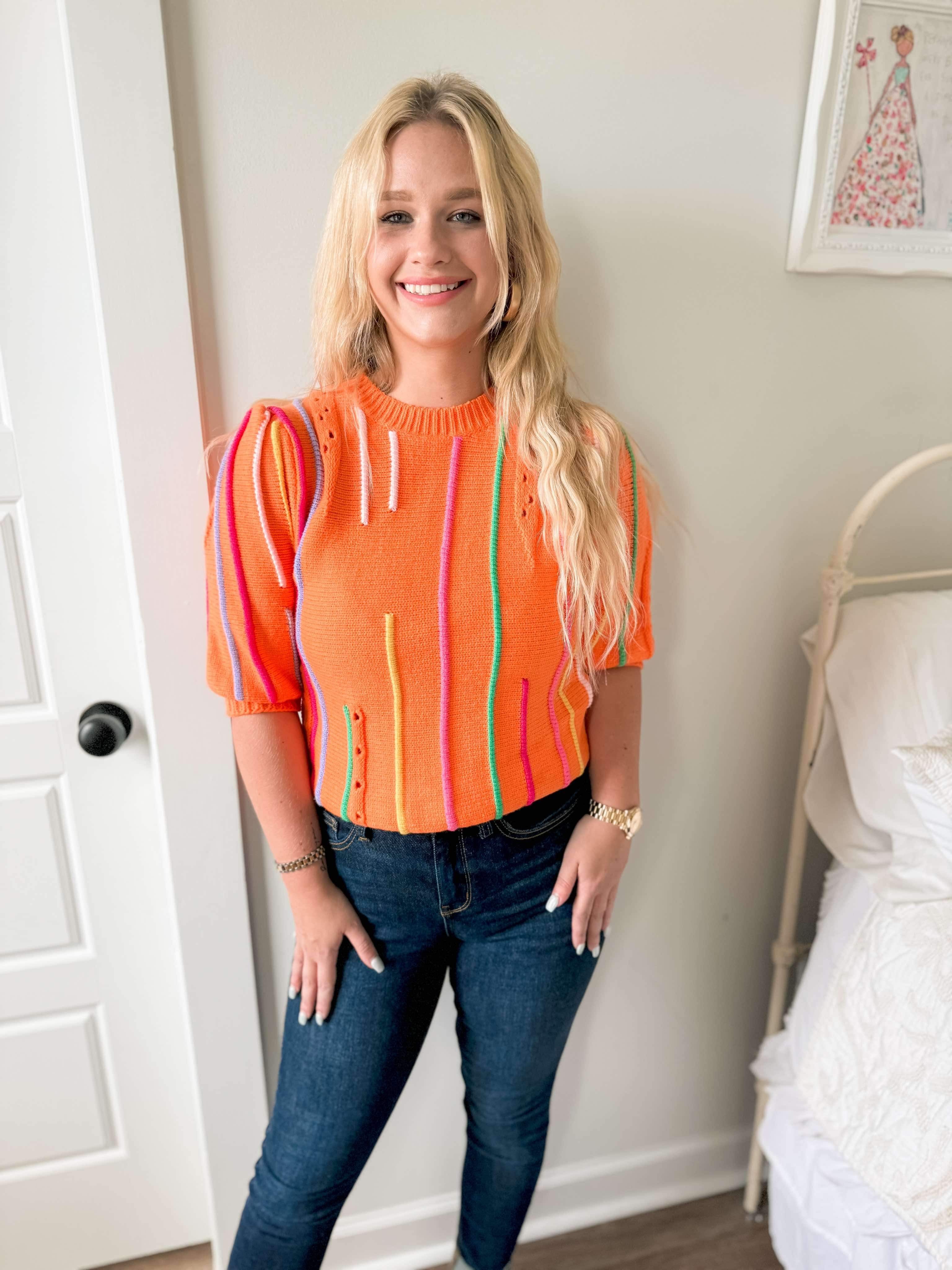 Introducing our Come Back Sweater in Orange. GIRLS - do you even need to read this? This sweater is absolutely beautiful. We are loving the colors for fall. It is on an orange base with pink shades, green, blue, purple and yellow stripes through out that are broken up around the sweater. We are loving all the little extra details on this sweater. Wear her with any type of bottoms.