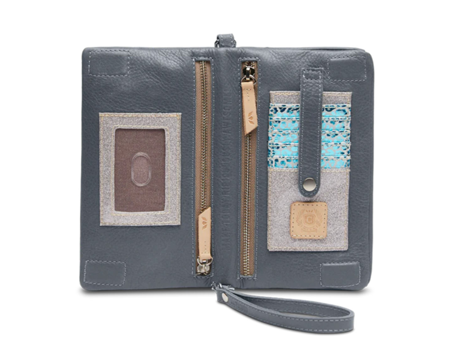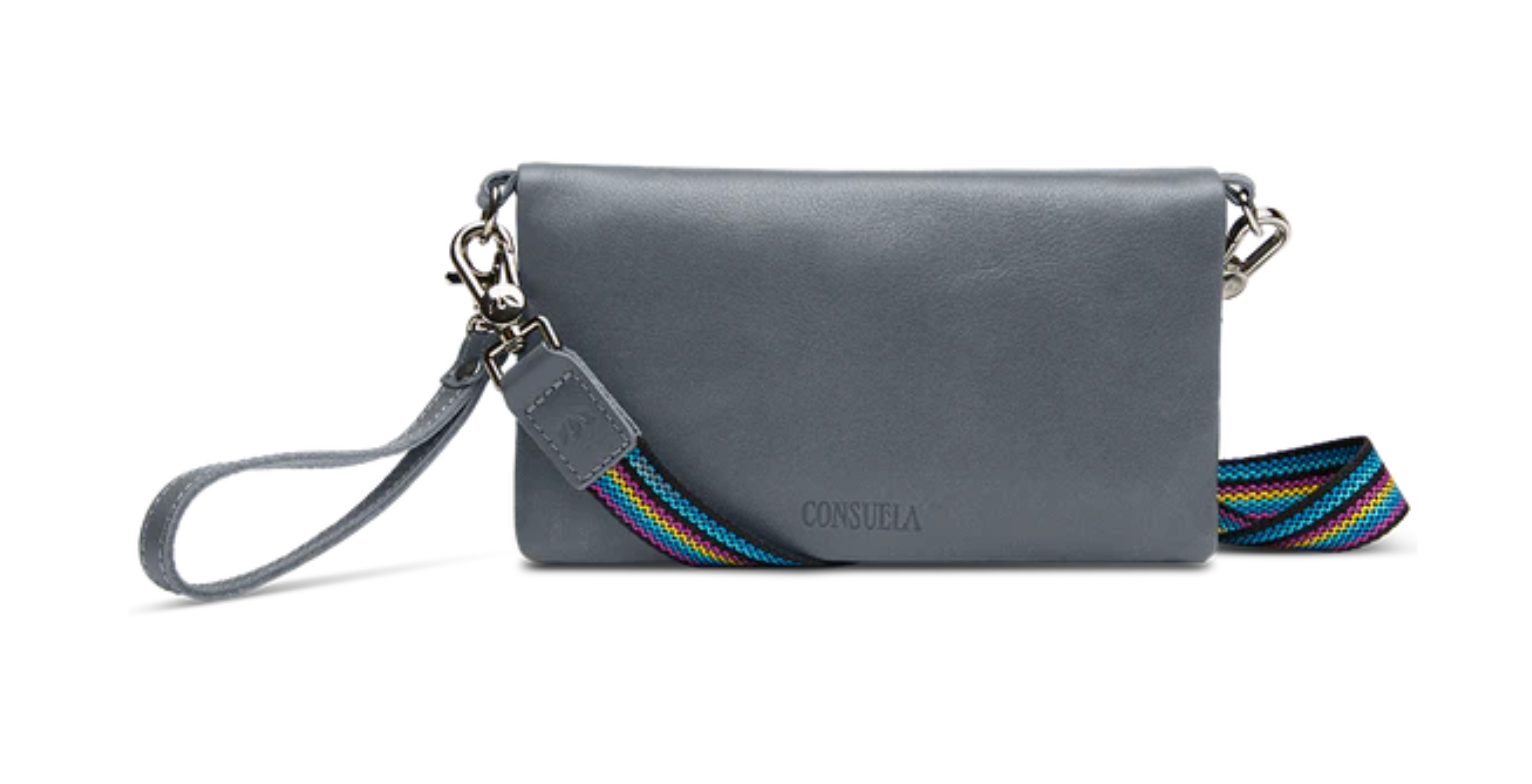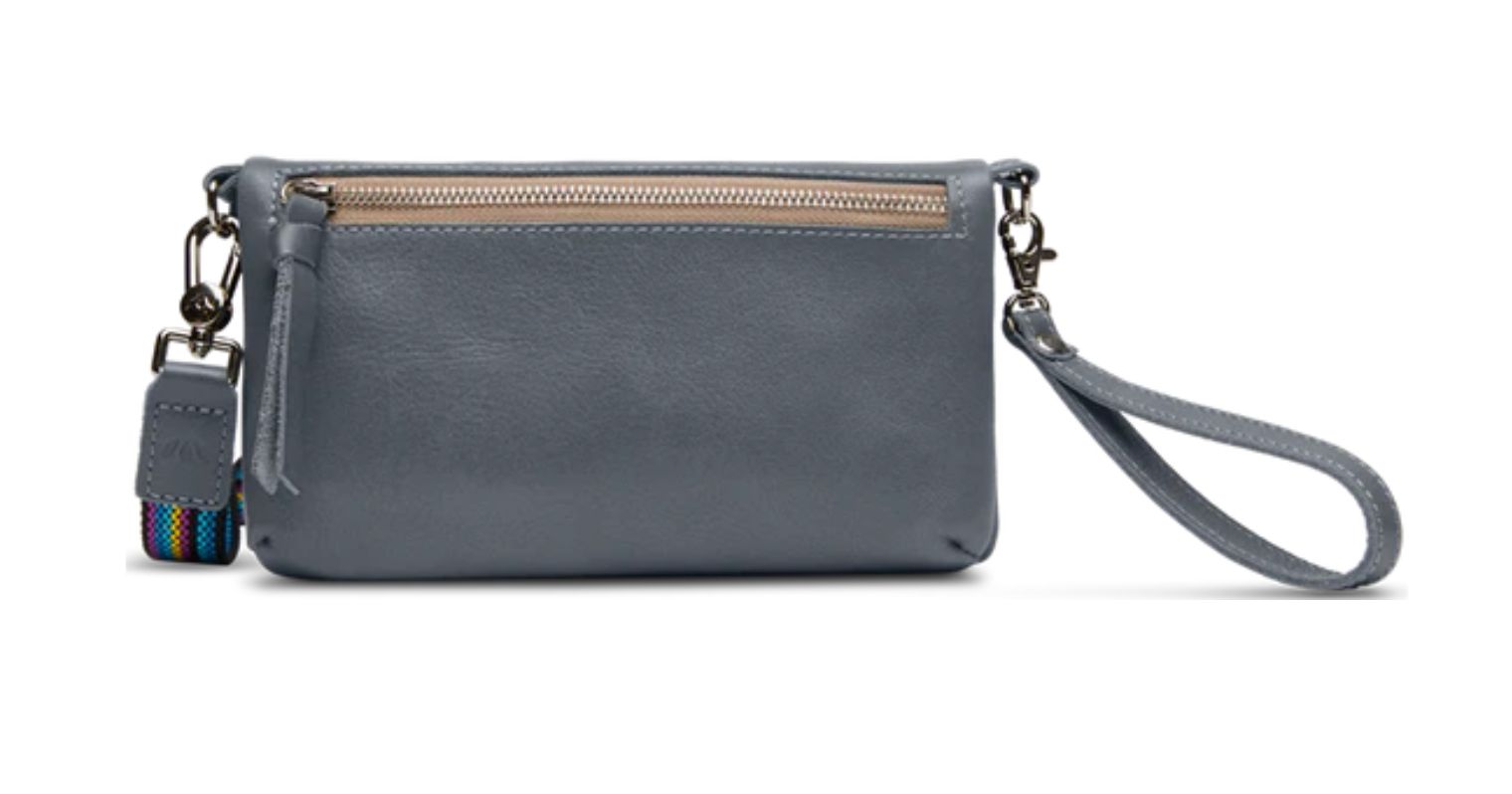 - Included detachable wristlet strap and adjustable woven crossbody strap