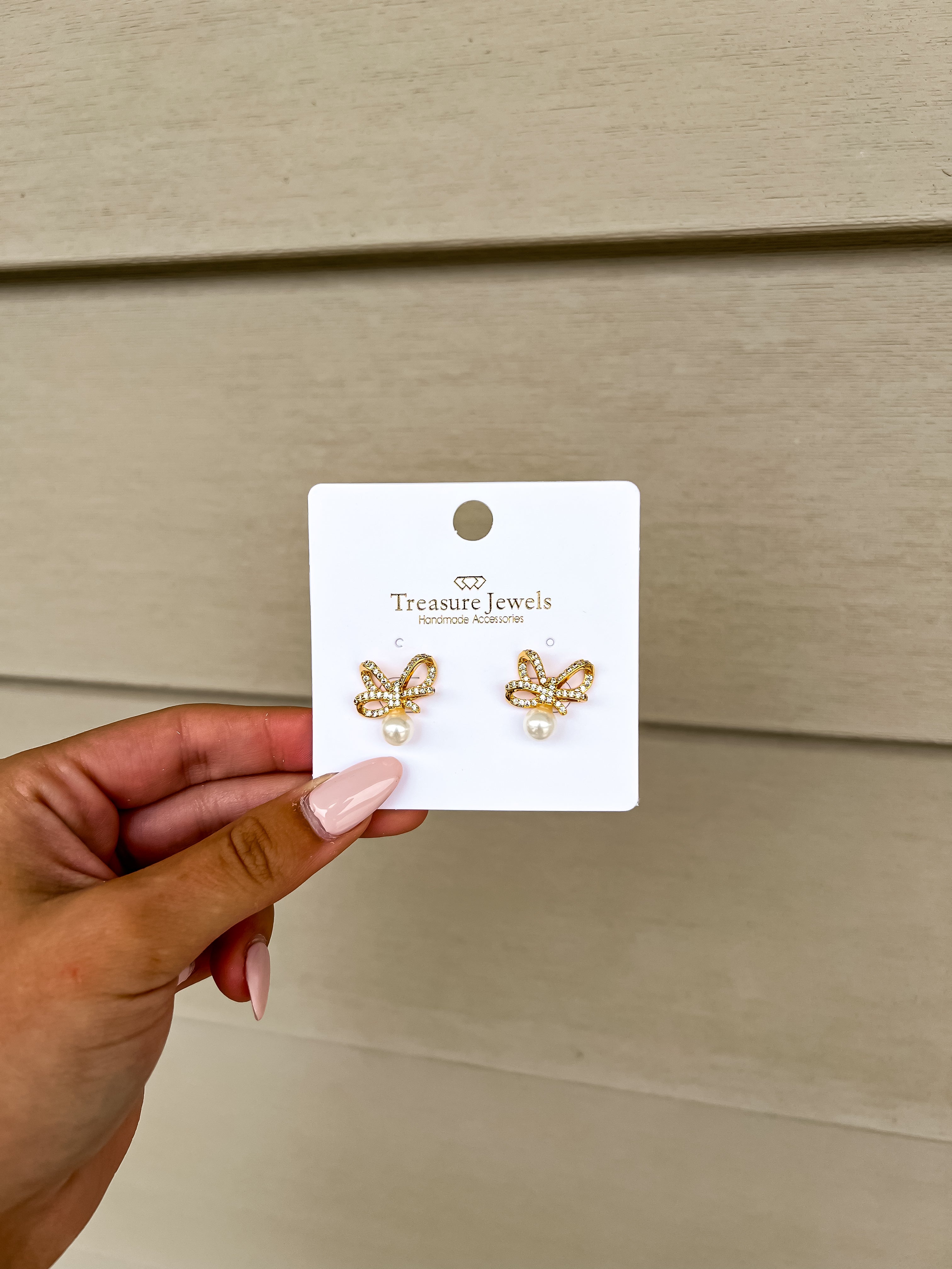 These crystal ribbon earrings are precious. They have an all gold metal with crystal detailing, and a petite pearl detail. Wear these as an everyday earring.