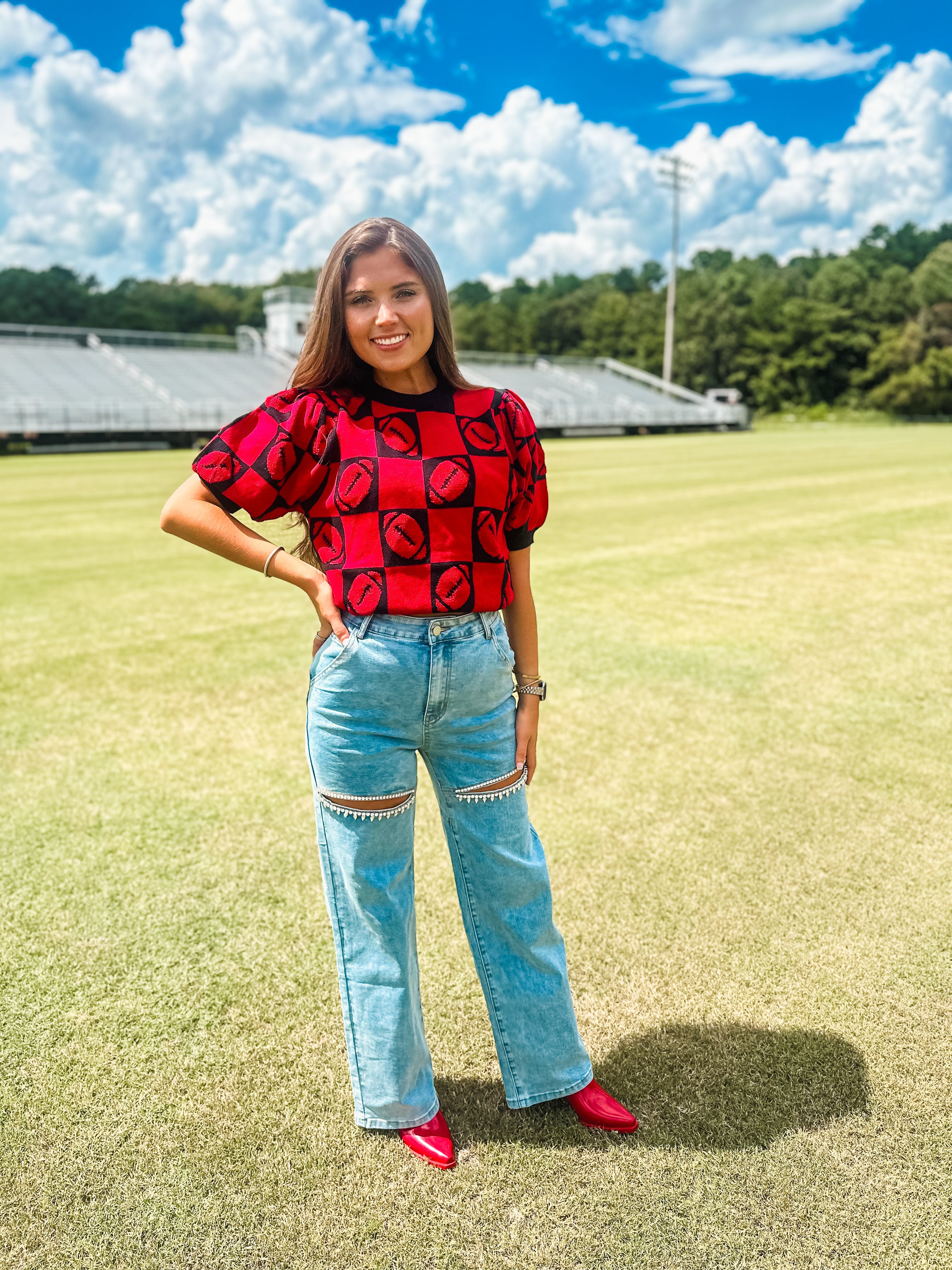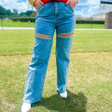 Washed Denim Cut Out Front Rhinestone Studded Loose Fit Jean