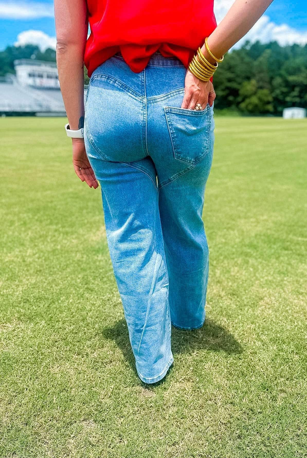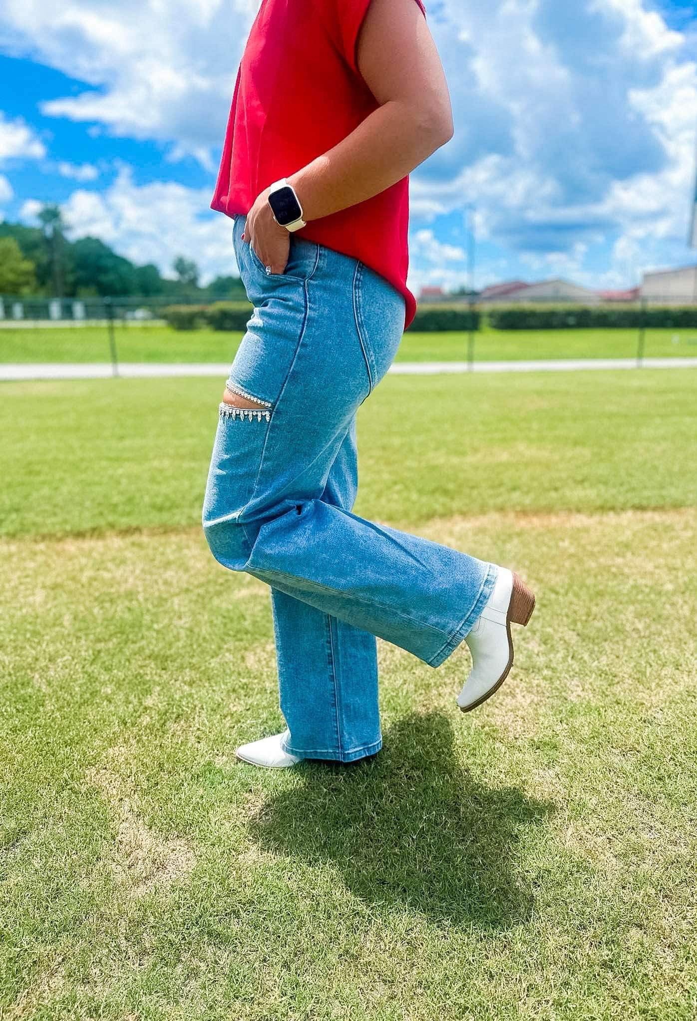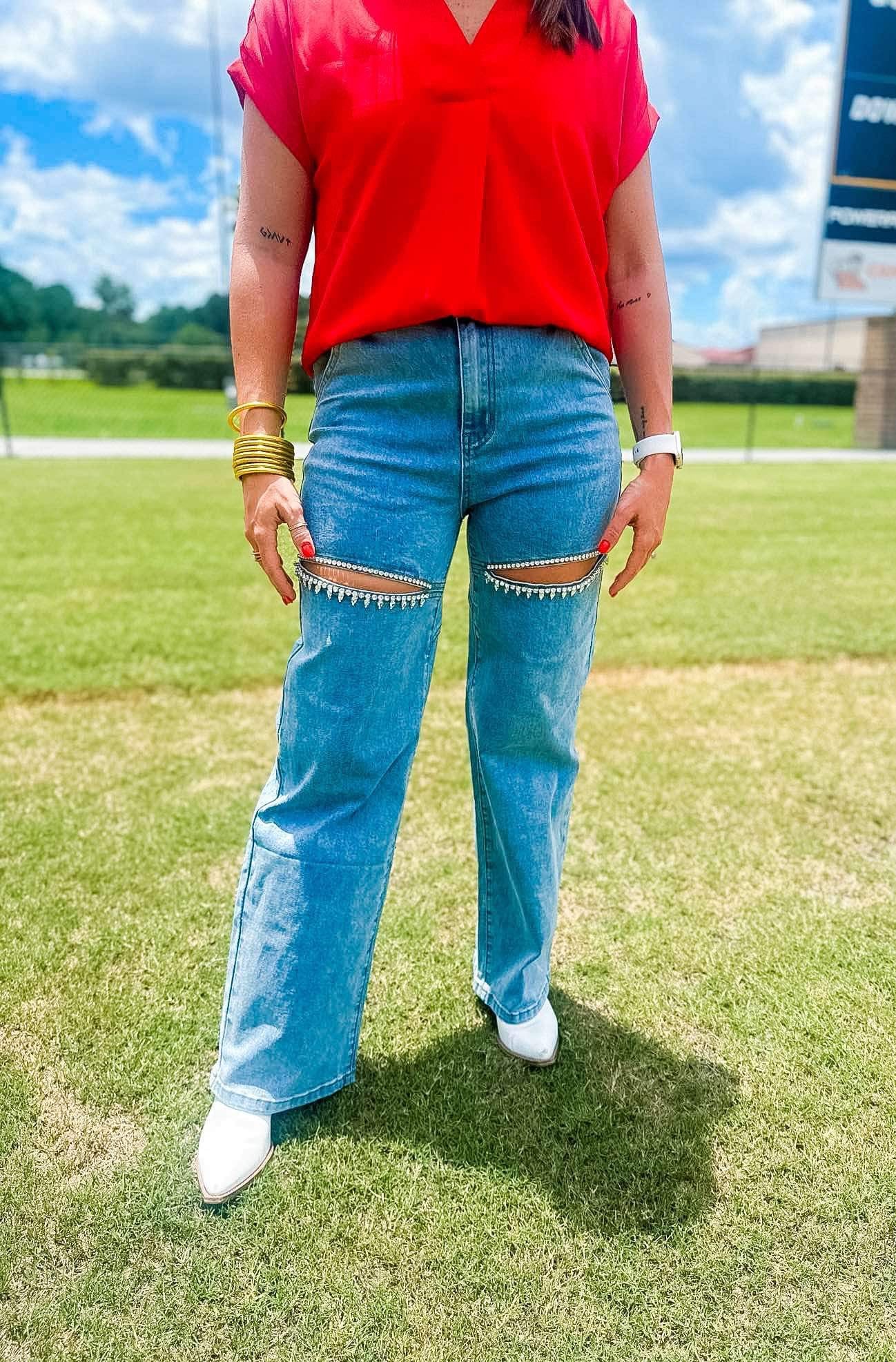 Cut Out Front Rhinestone Washed Denim Jeans- Light