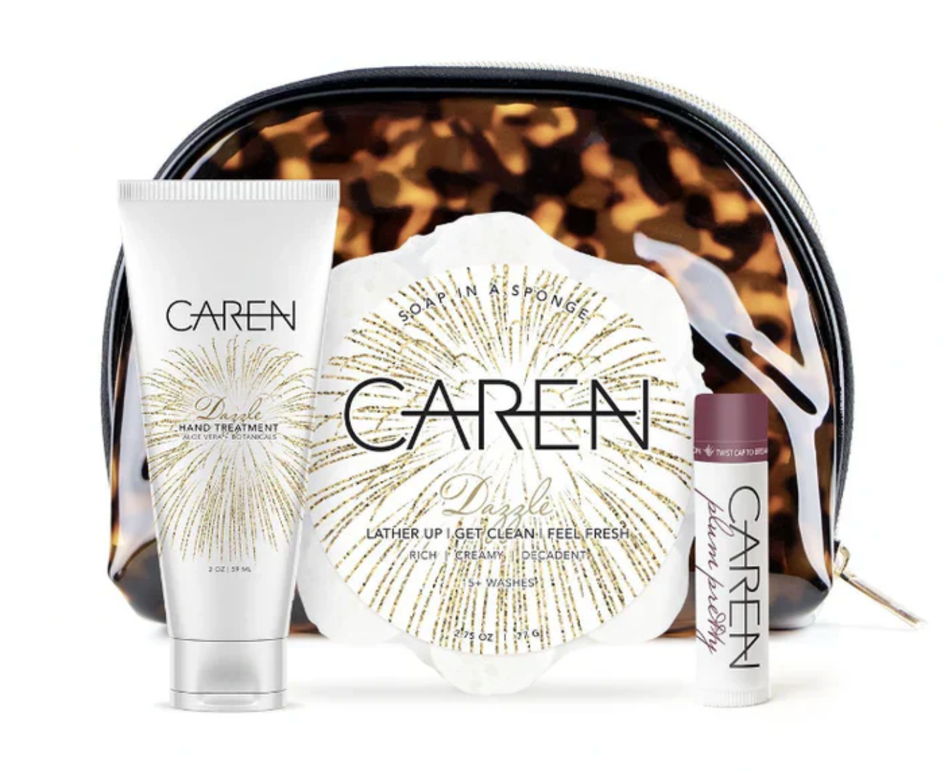 This set contains a 2oz Hand Treatment, Soap in a Sponge, and Plum Pretty Lip Treatment all packaged in a tortoise shell bag!
