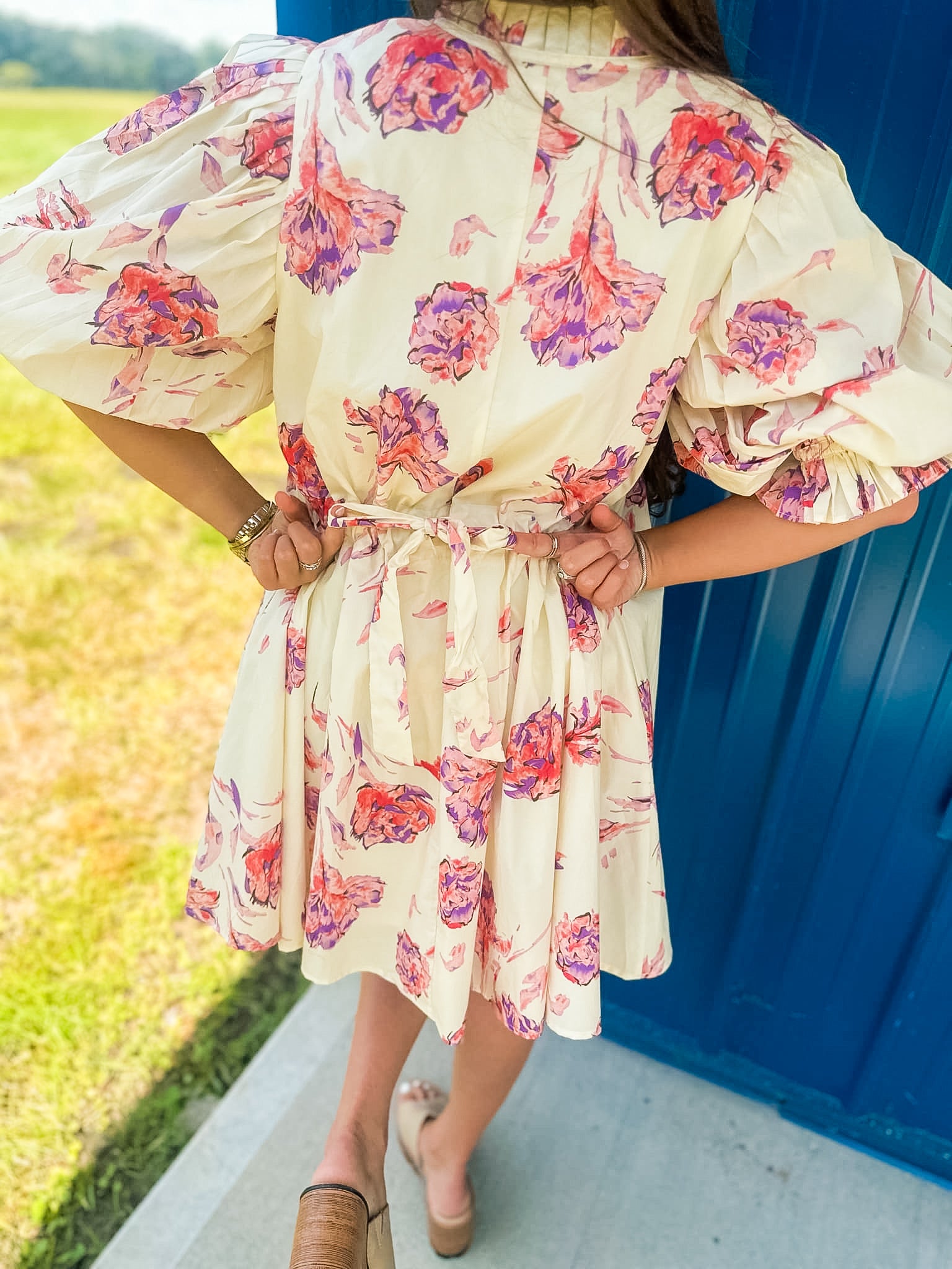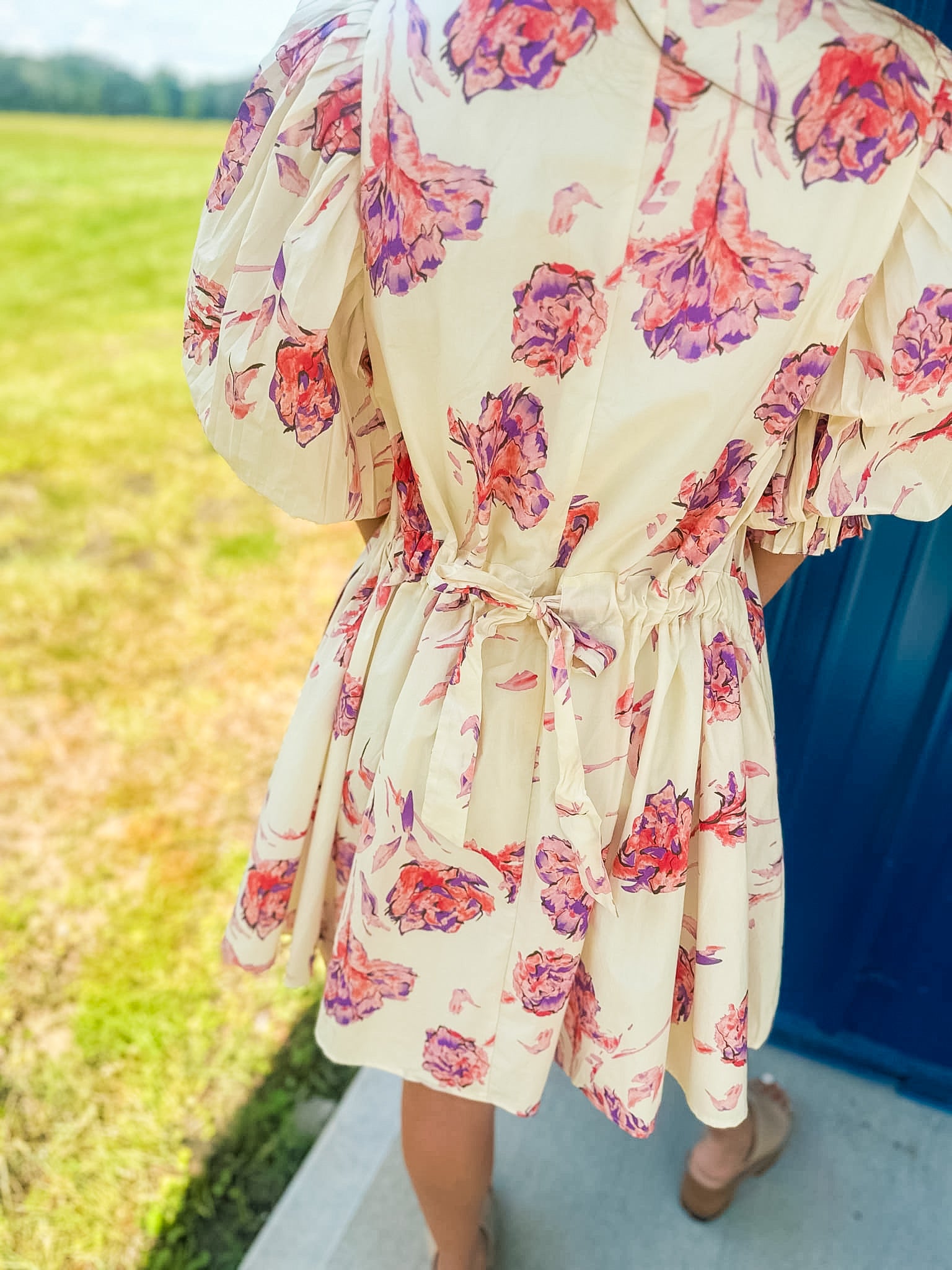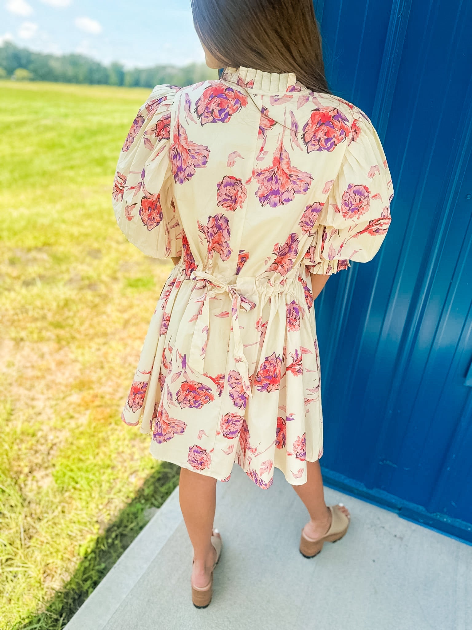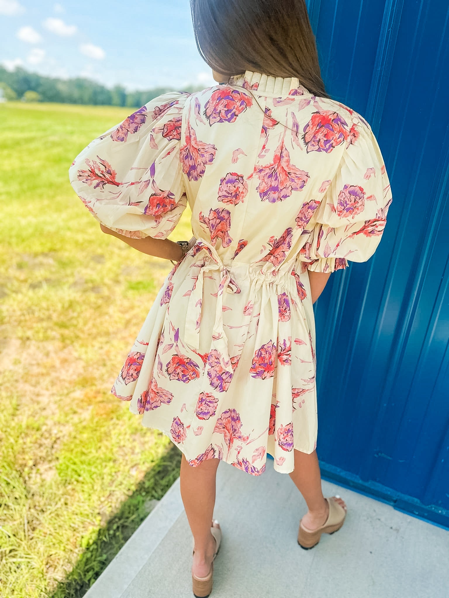 Floral print puff sleeve mini dress featuring adjustable self tie at back. Pleat detail at sleeves and neck. Button closures at front. Elastic at cuff. Pocket at sides. Lined. Woven. Non-sheer. Lightweight.