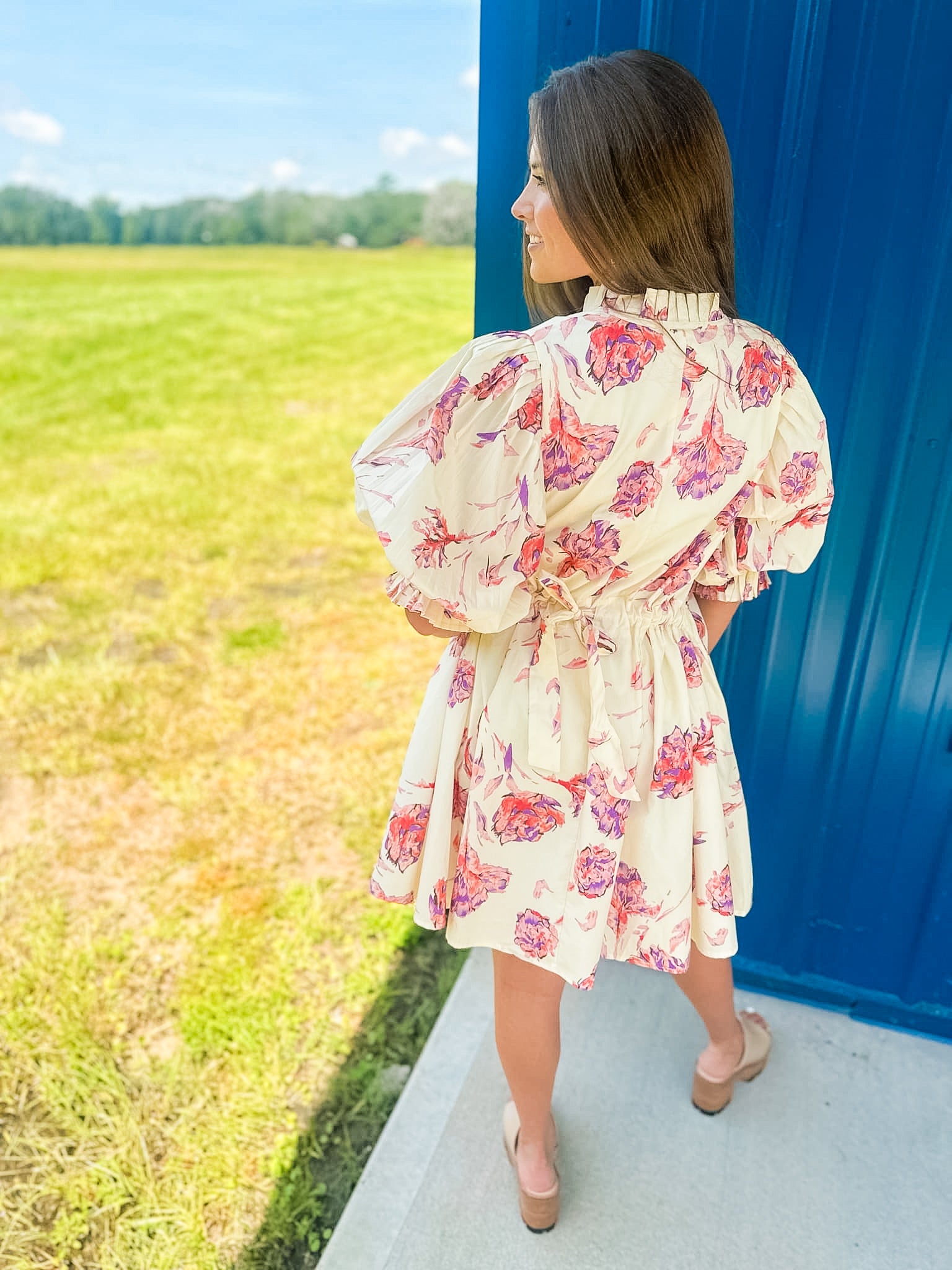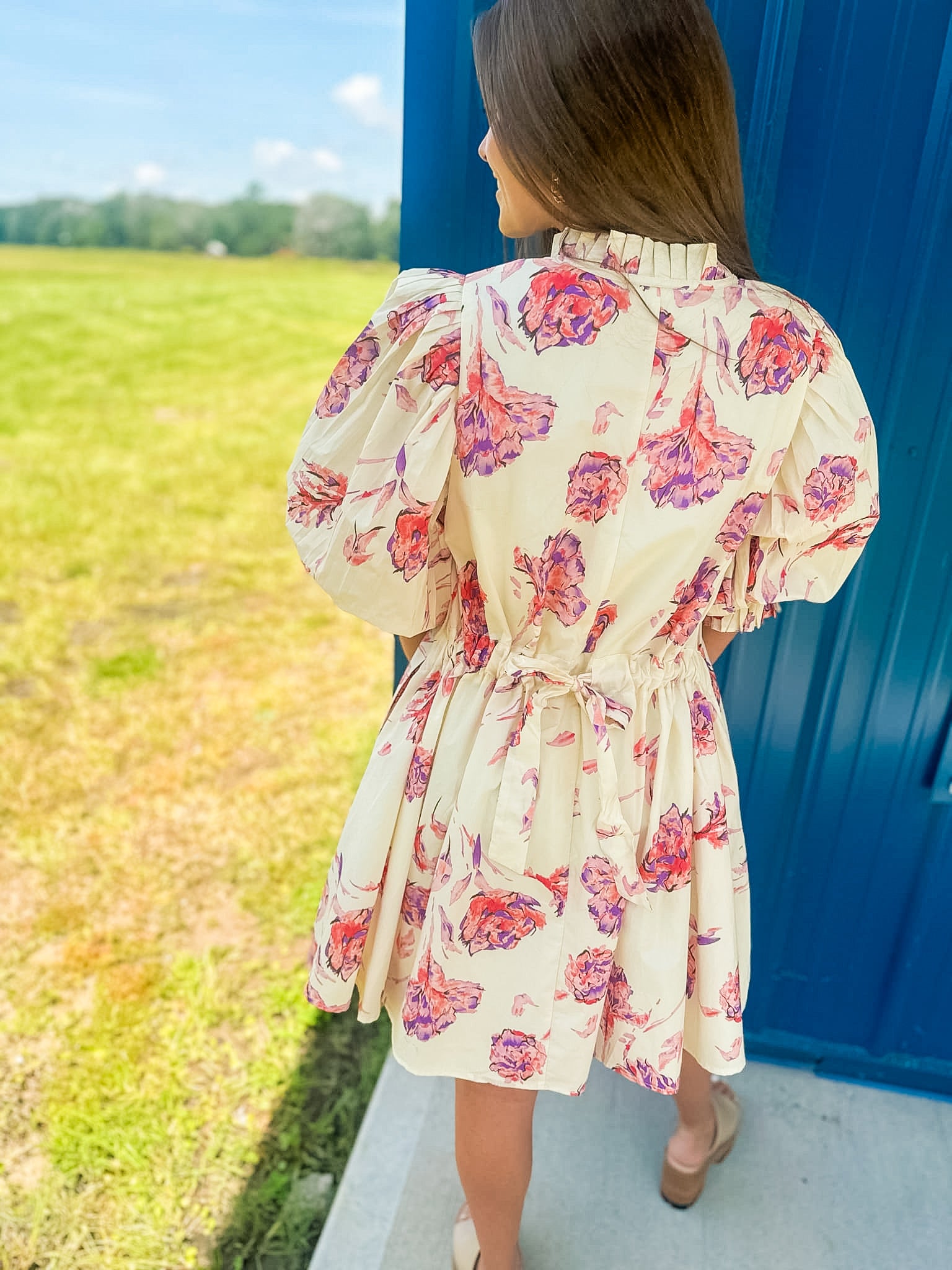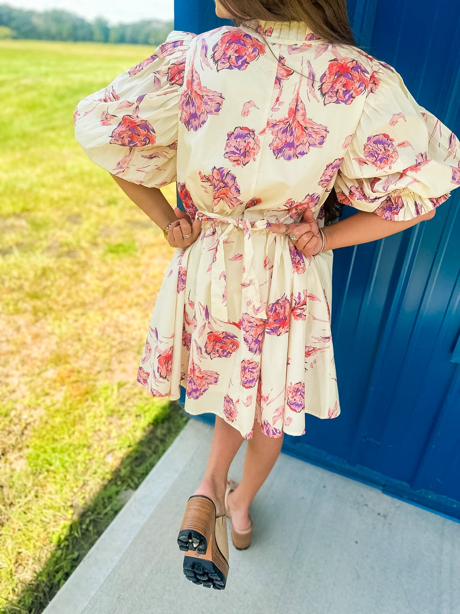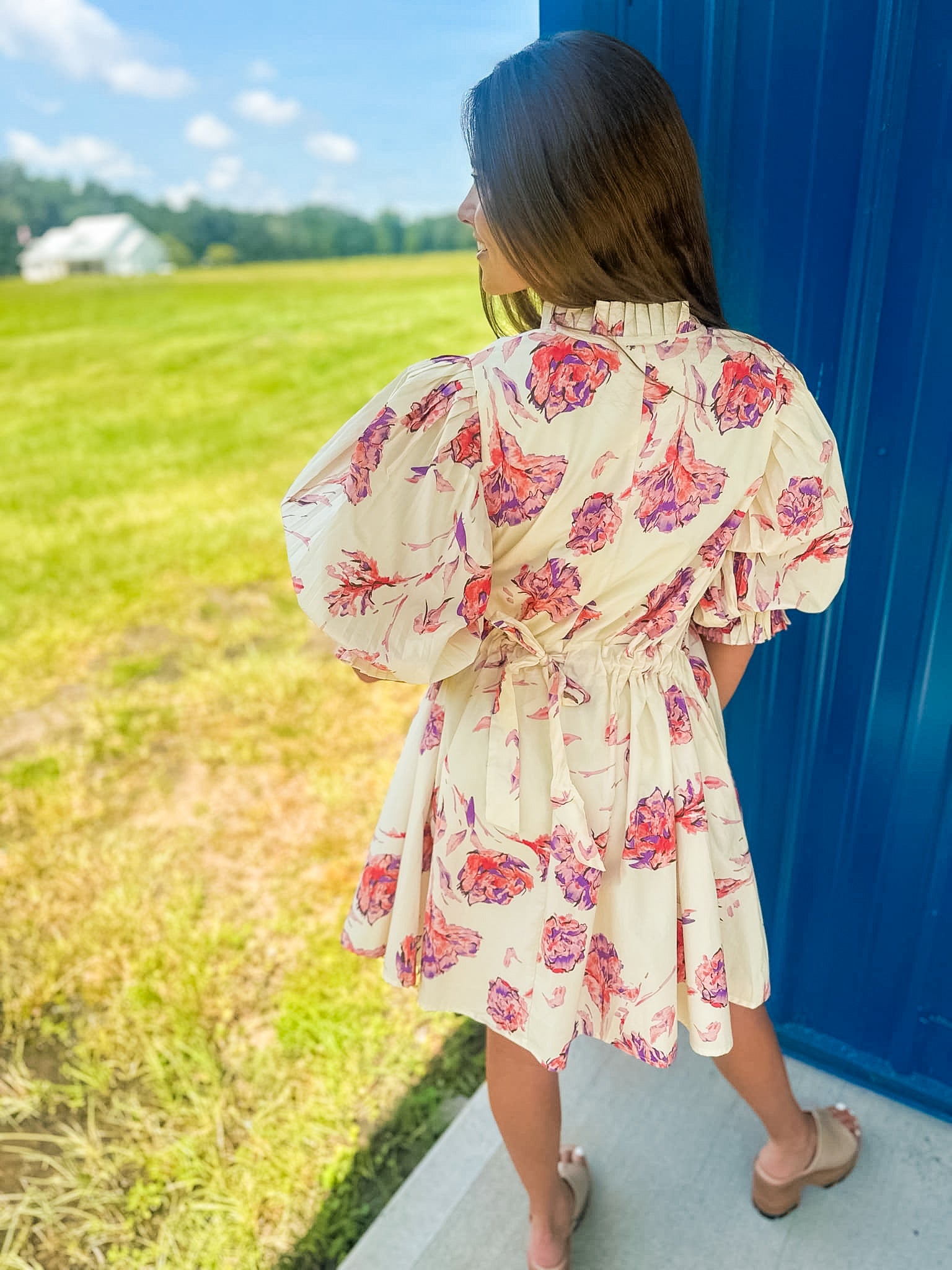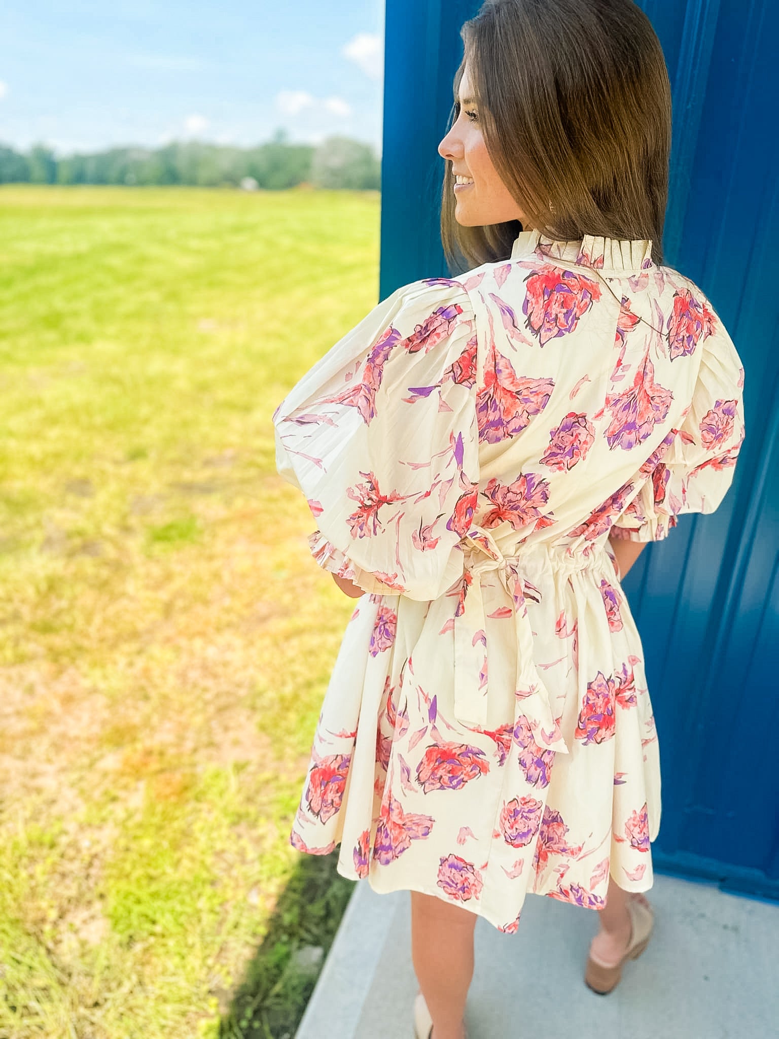 Floral print puff sleeve mini dress featuring adjustable self tie at back. Pleat detail at sleeves and neck. Button closures at front. Elastic at cuff. Pocket at sides. Lined. Woven. Non-sheer. Lightweight.