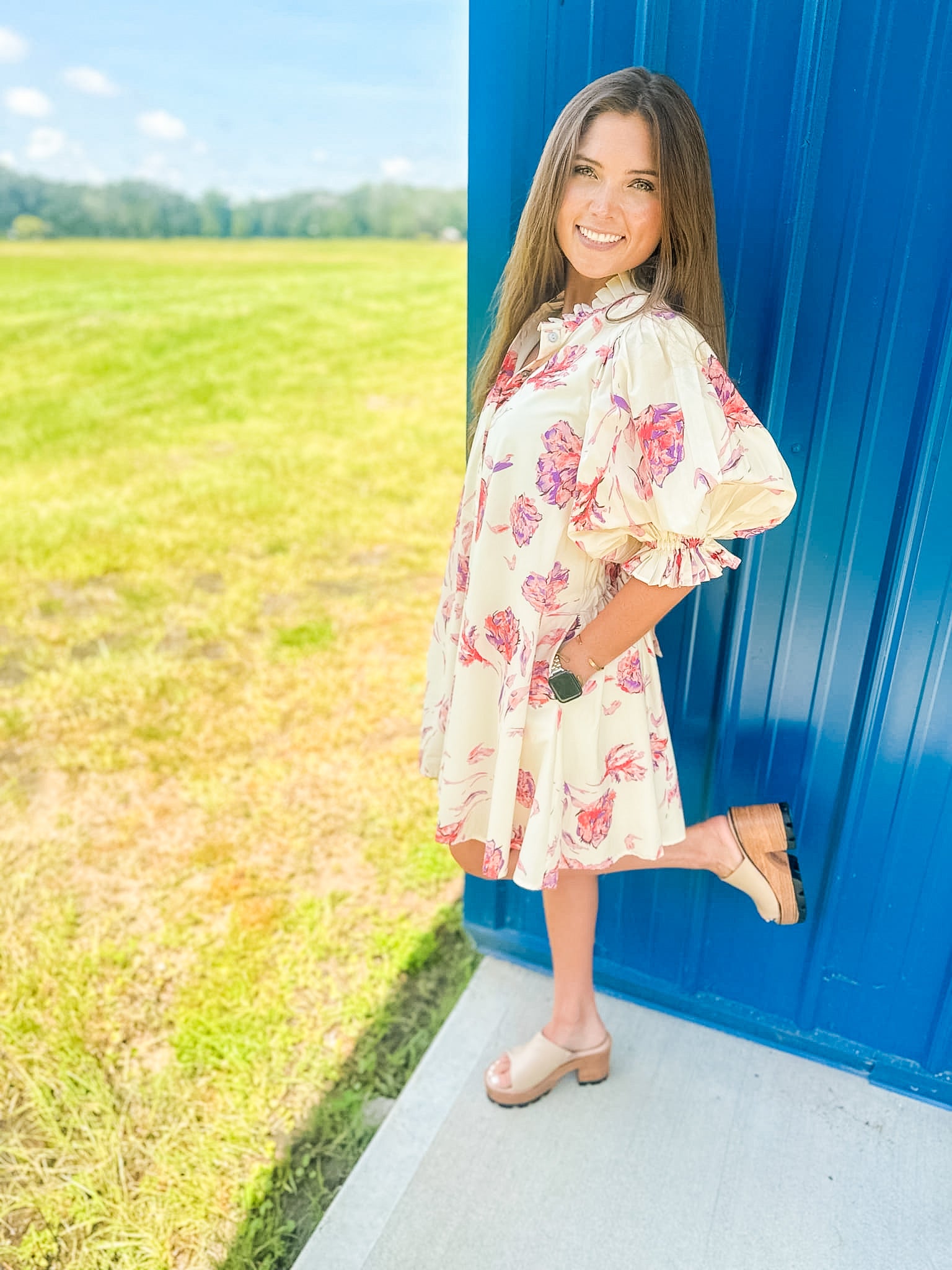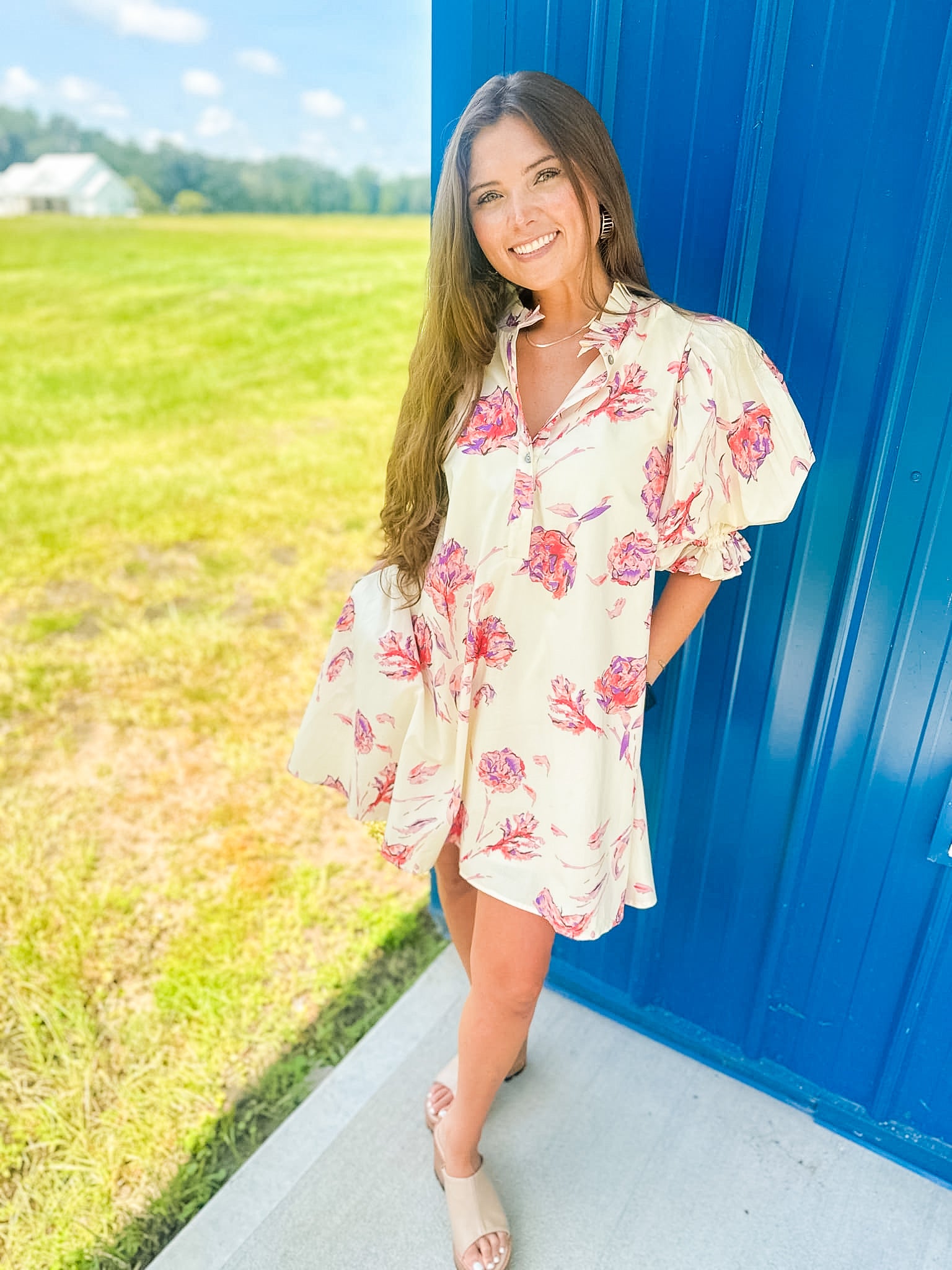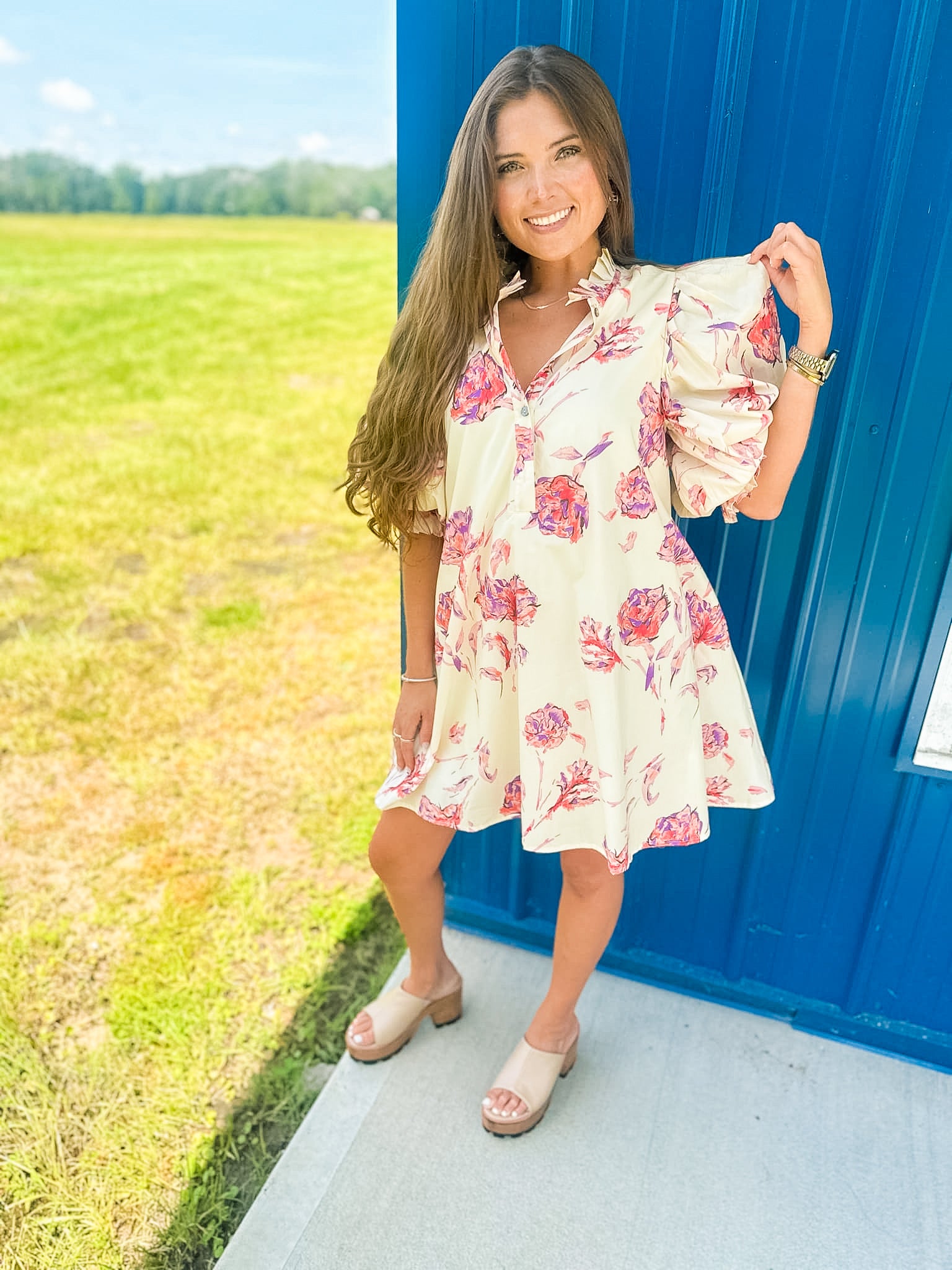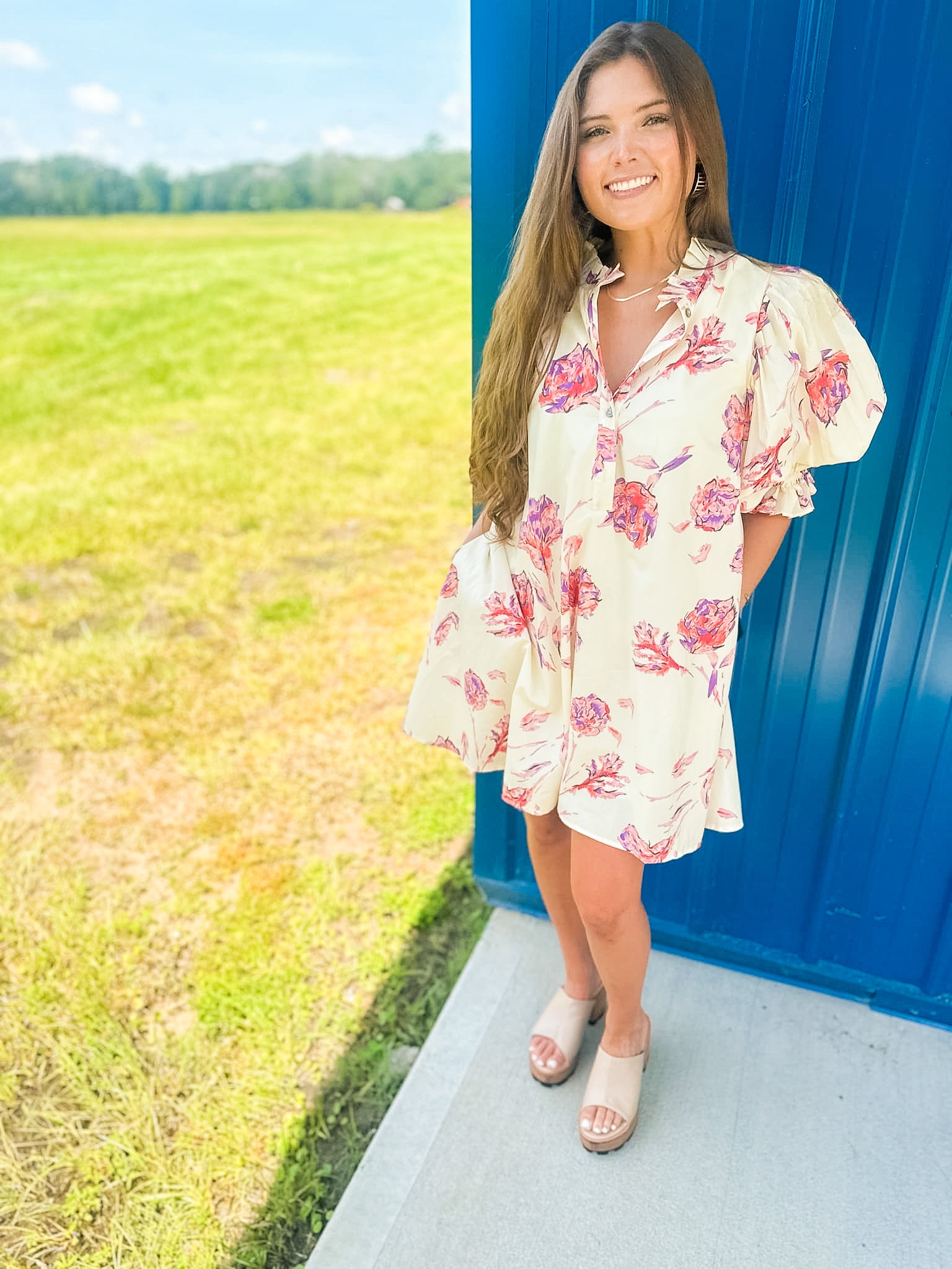 Floral print puff sleeve mini dress featuring adjustable self tie at back. Pleat detail at sleeves and neck. Button closures at front. Elastic at cuff. Pocket at sides. Lined. Woven. Non-sheer. Lightweight.