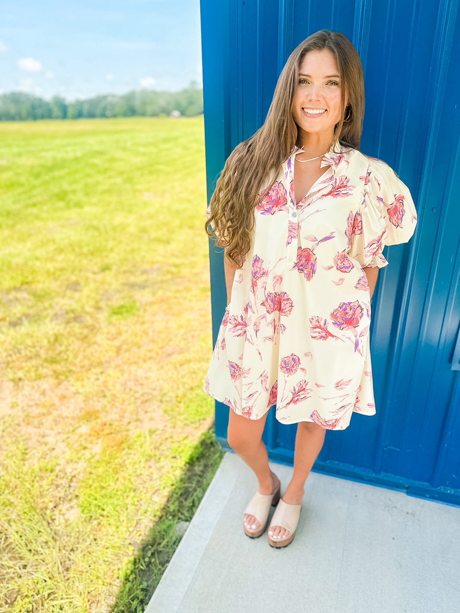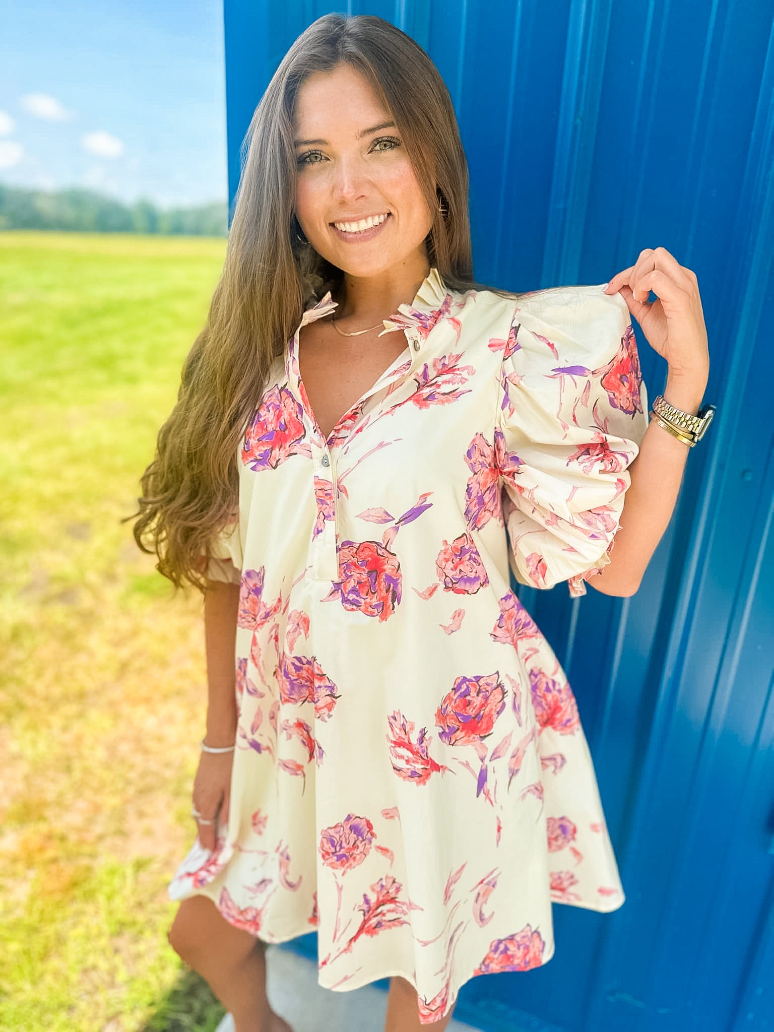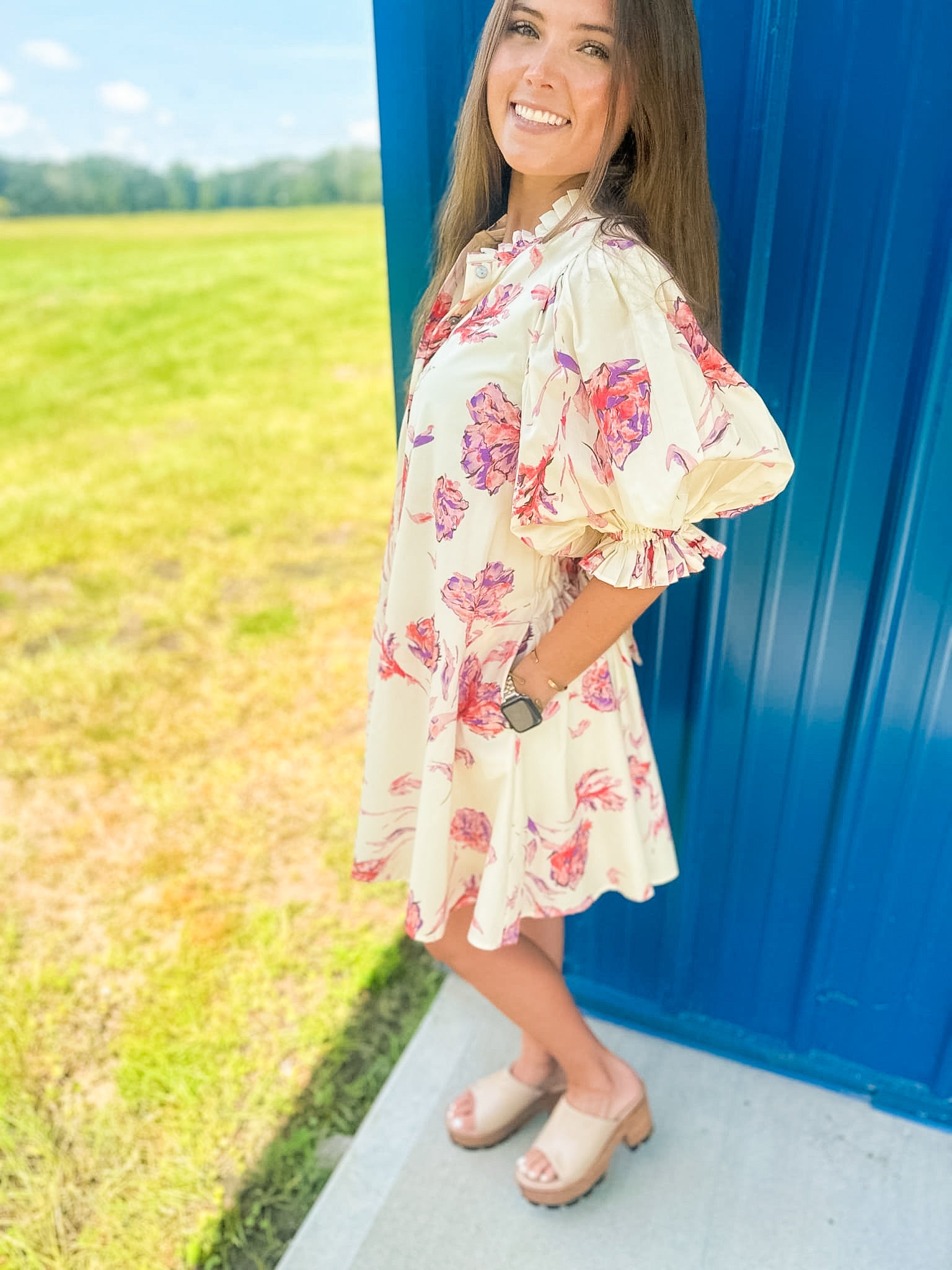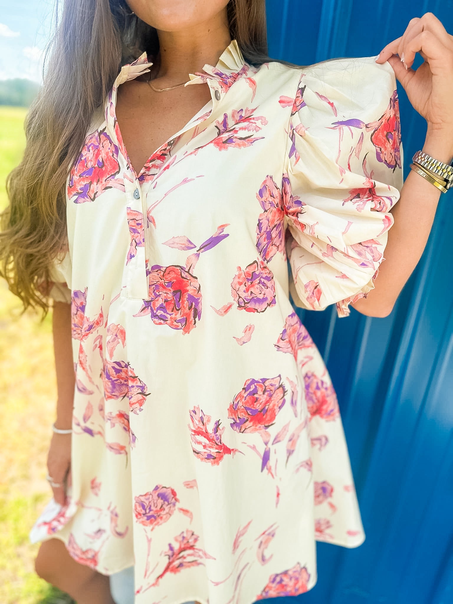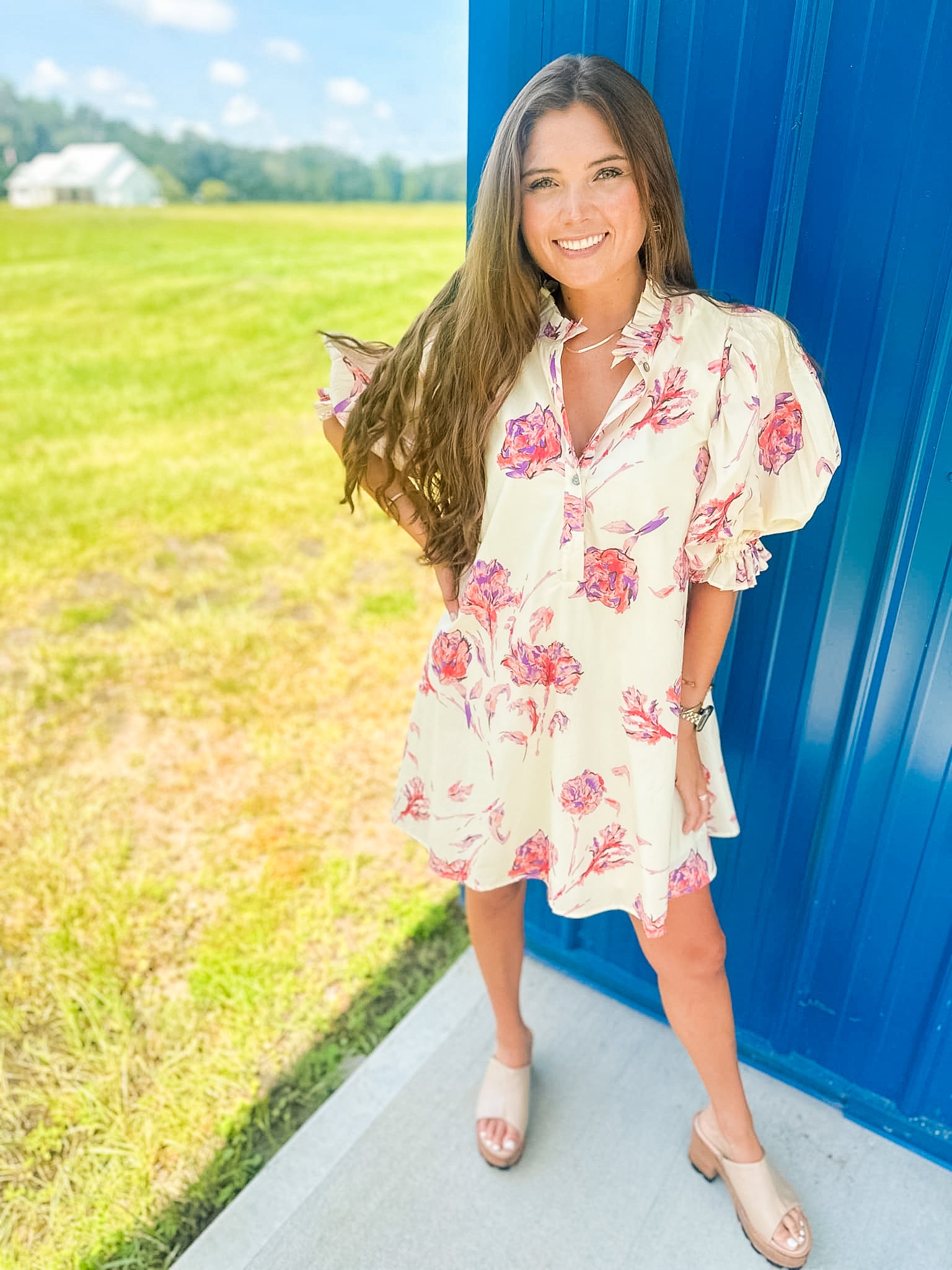 Floral print puff sleeve mini dress featuring adjustable self tie at back. Pleat detail at sleeves and neck. Button closures at front. Elastic at cuff. Pocket at sides. Lined. Woven. Non-sheer. Lightweight.