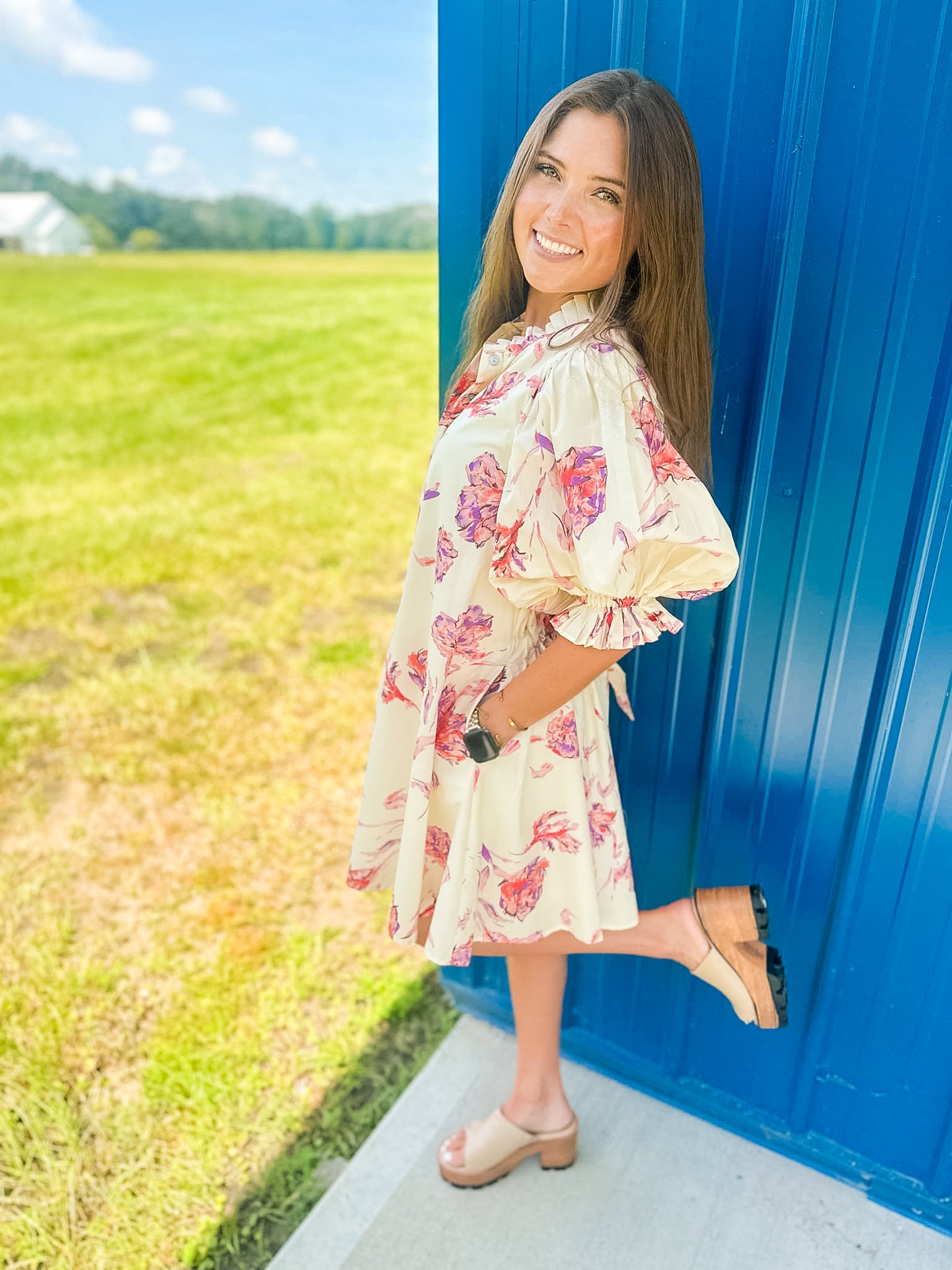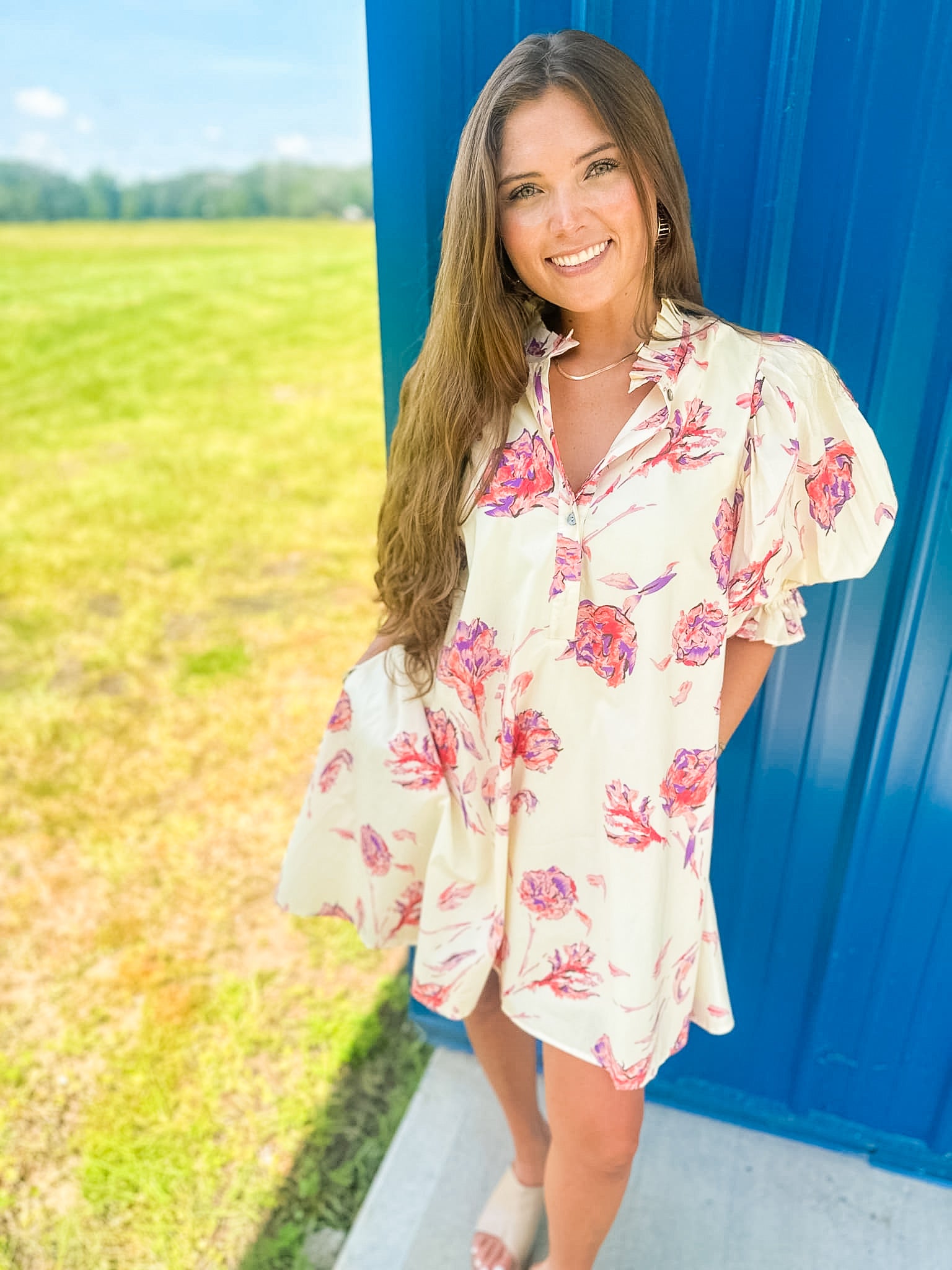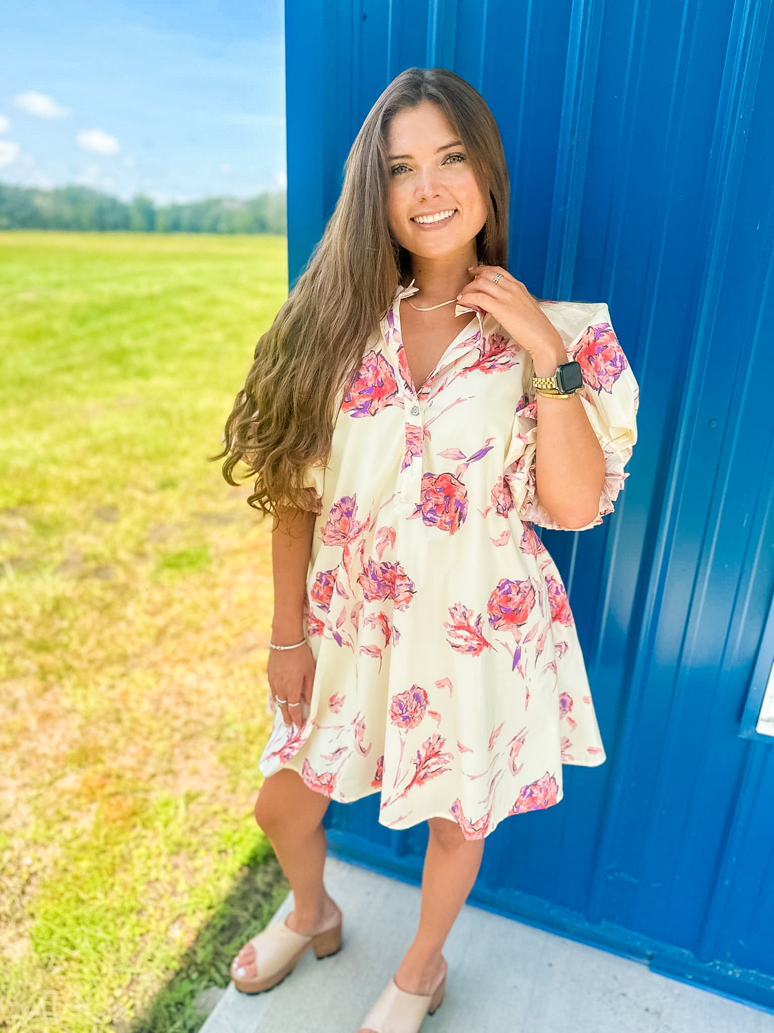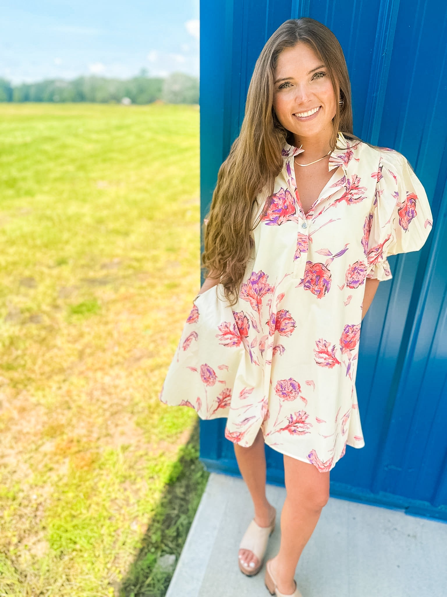 Floral print puff sleeve mini dress featuring adjustable self tie at back. Pleat detail at sleeves and neck. Button closures at front. Elastic at cuff. Pocket at sides. Lined. Woven. Non-sheer. Lightweight.