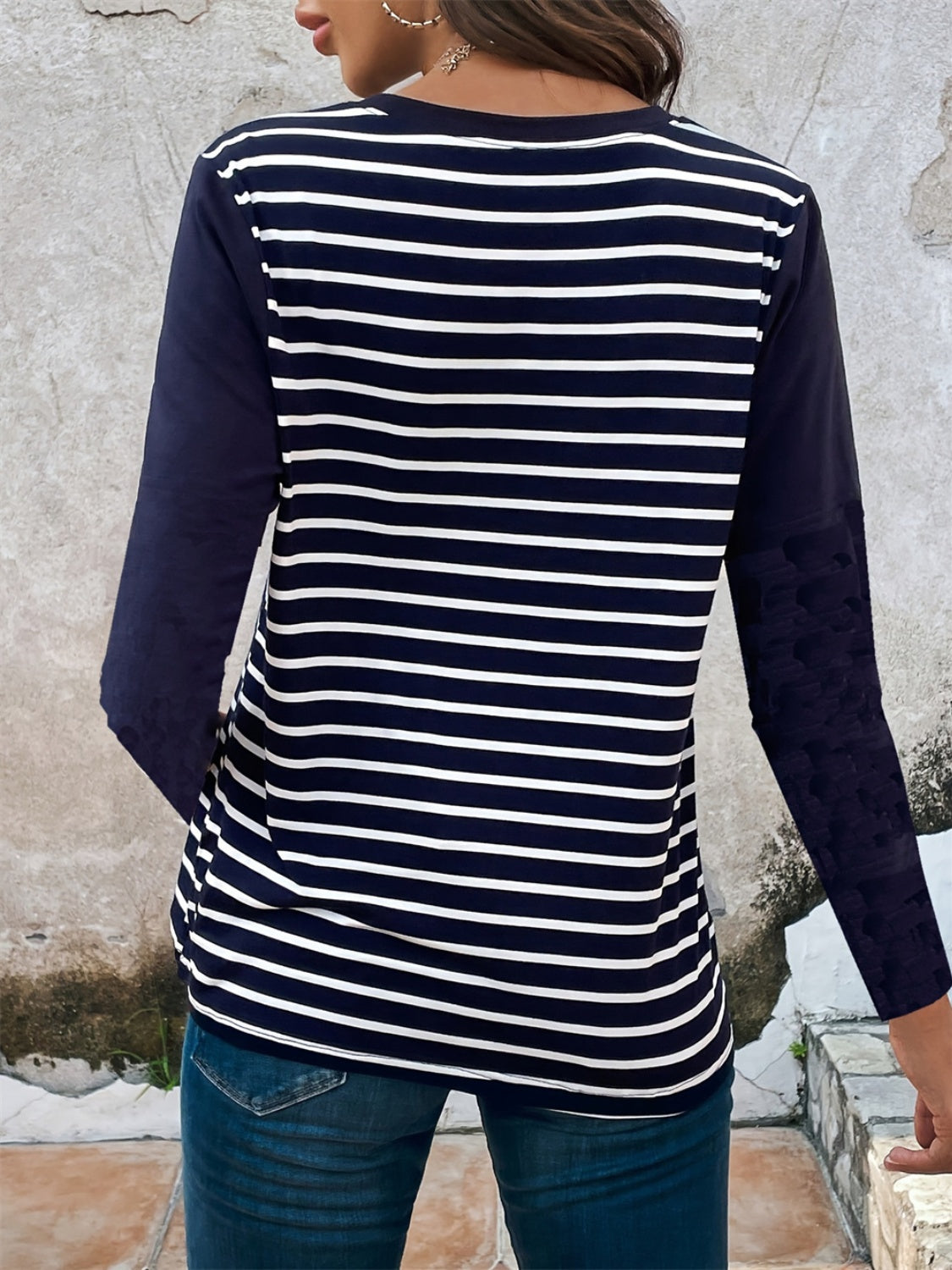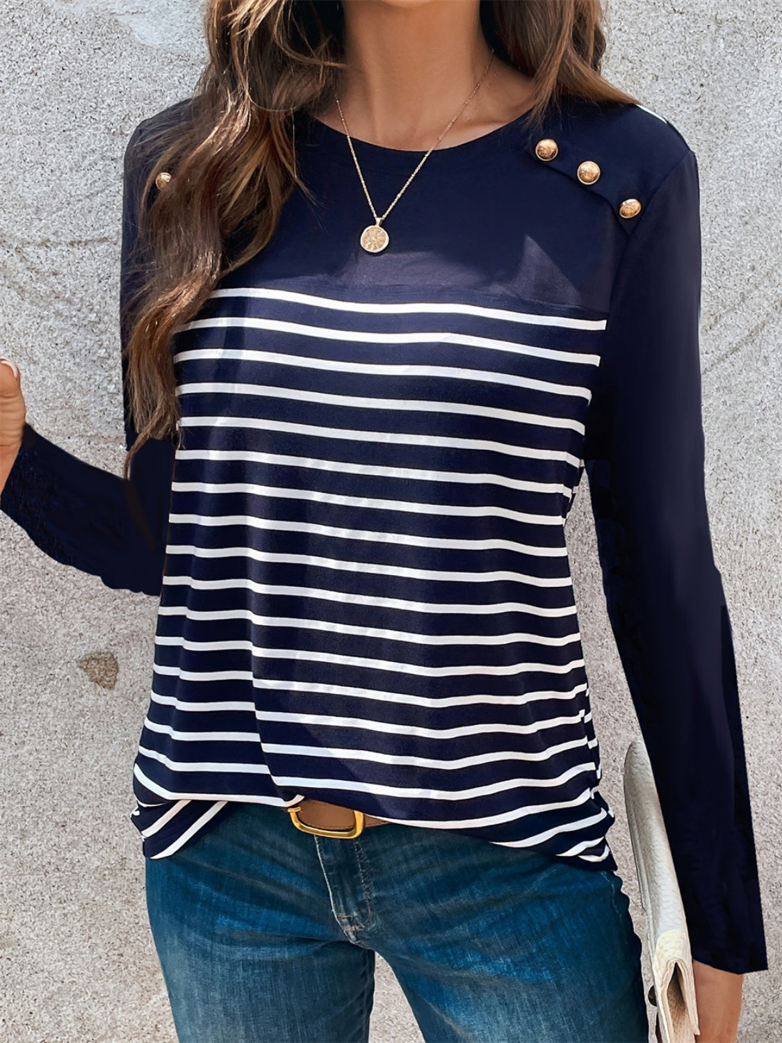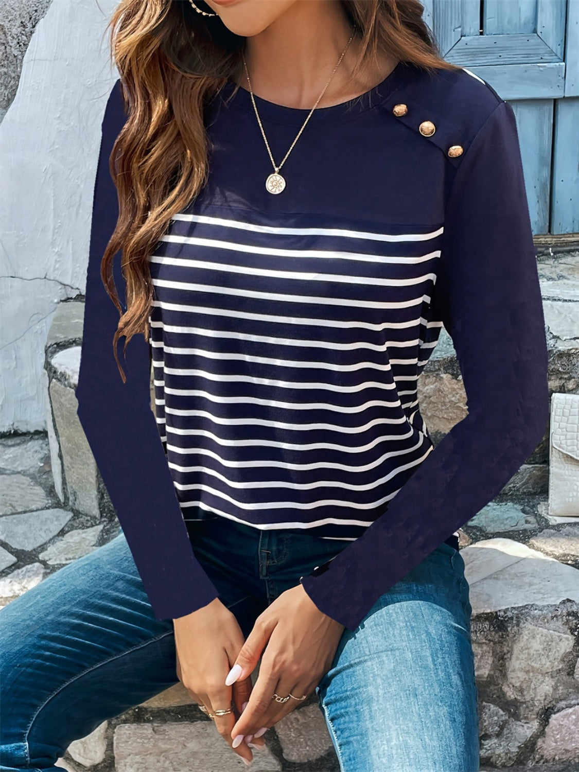 Decorative Button Striped Round Neck Long Sleeve T-Shirt