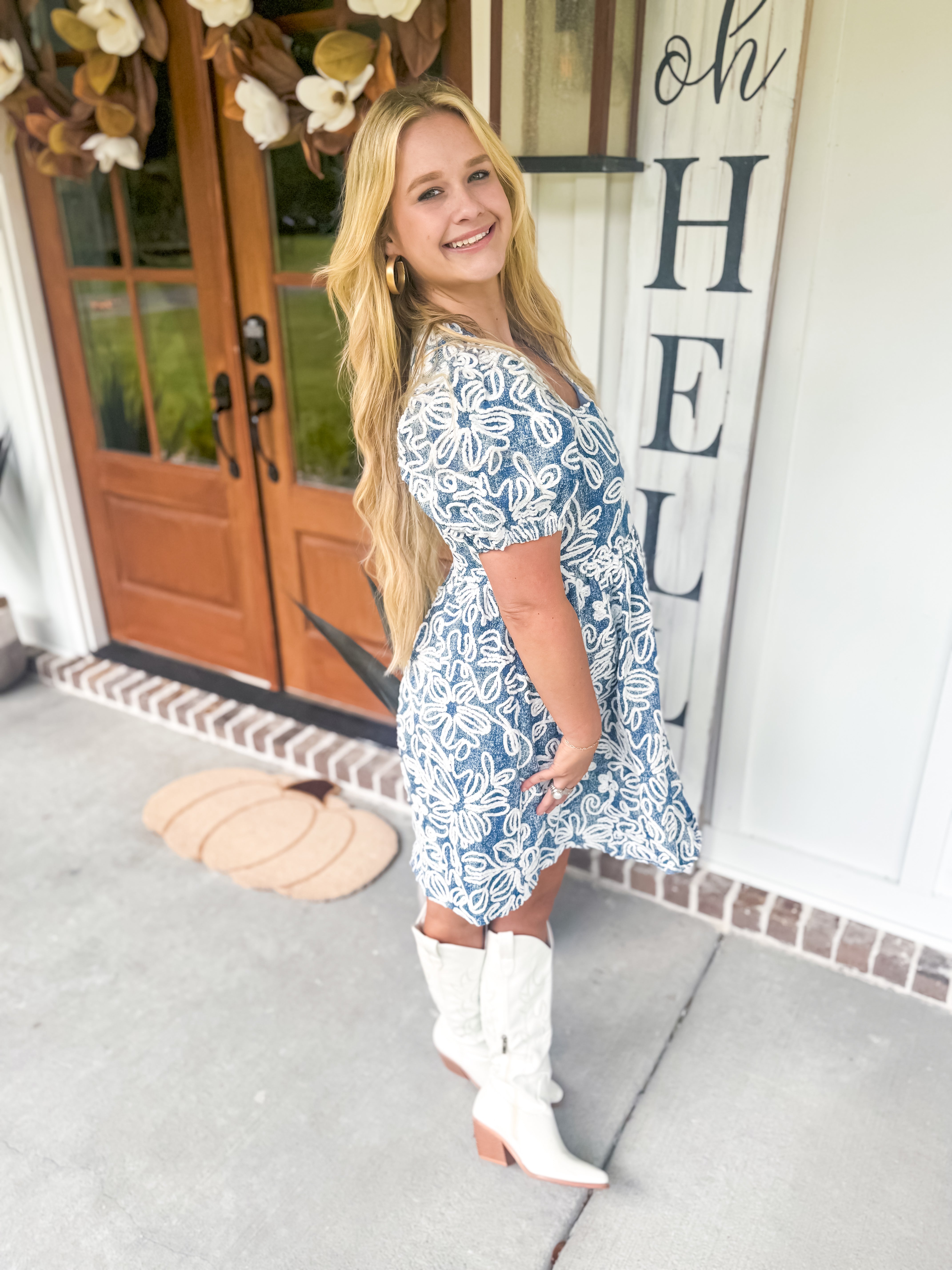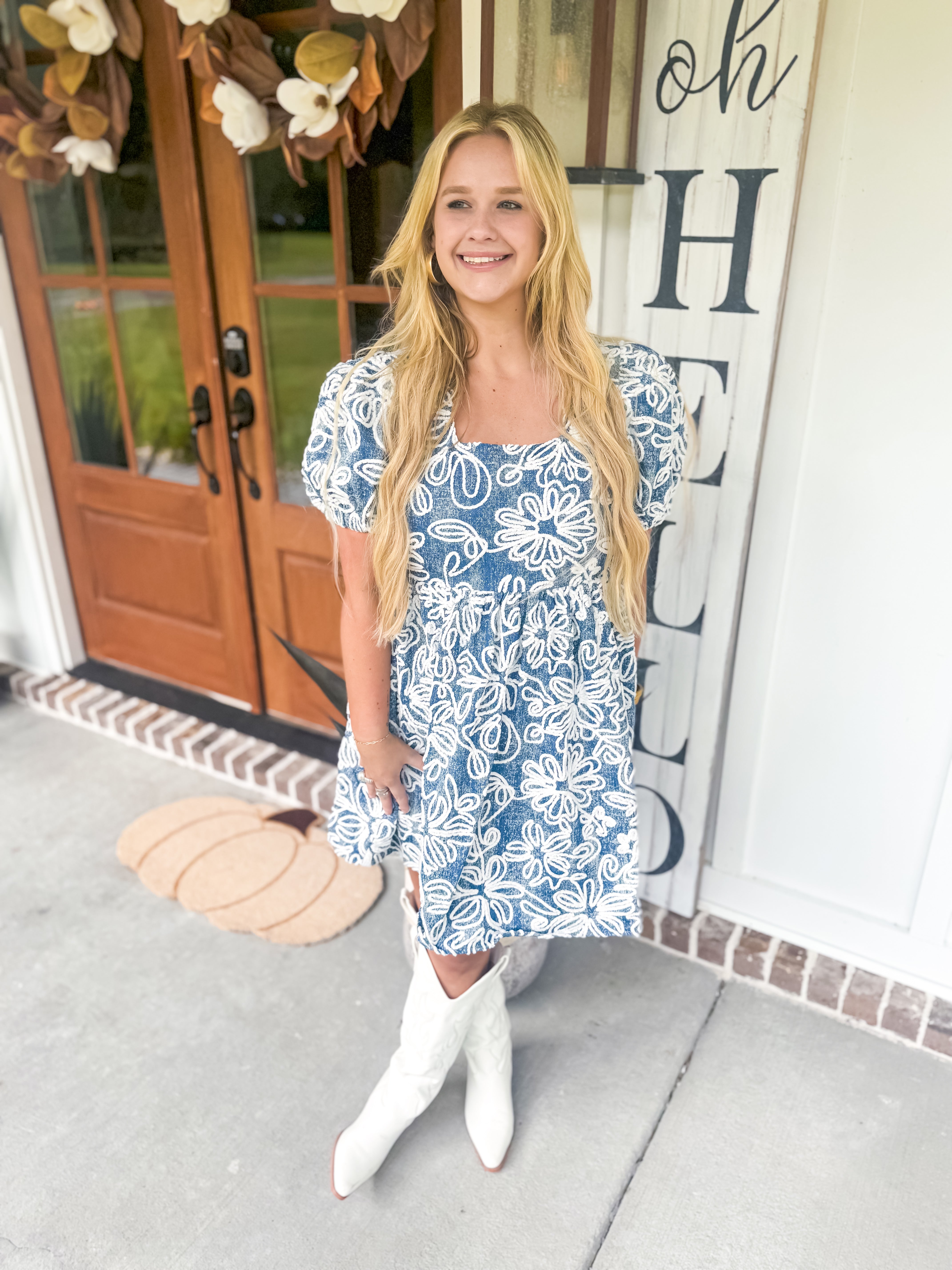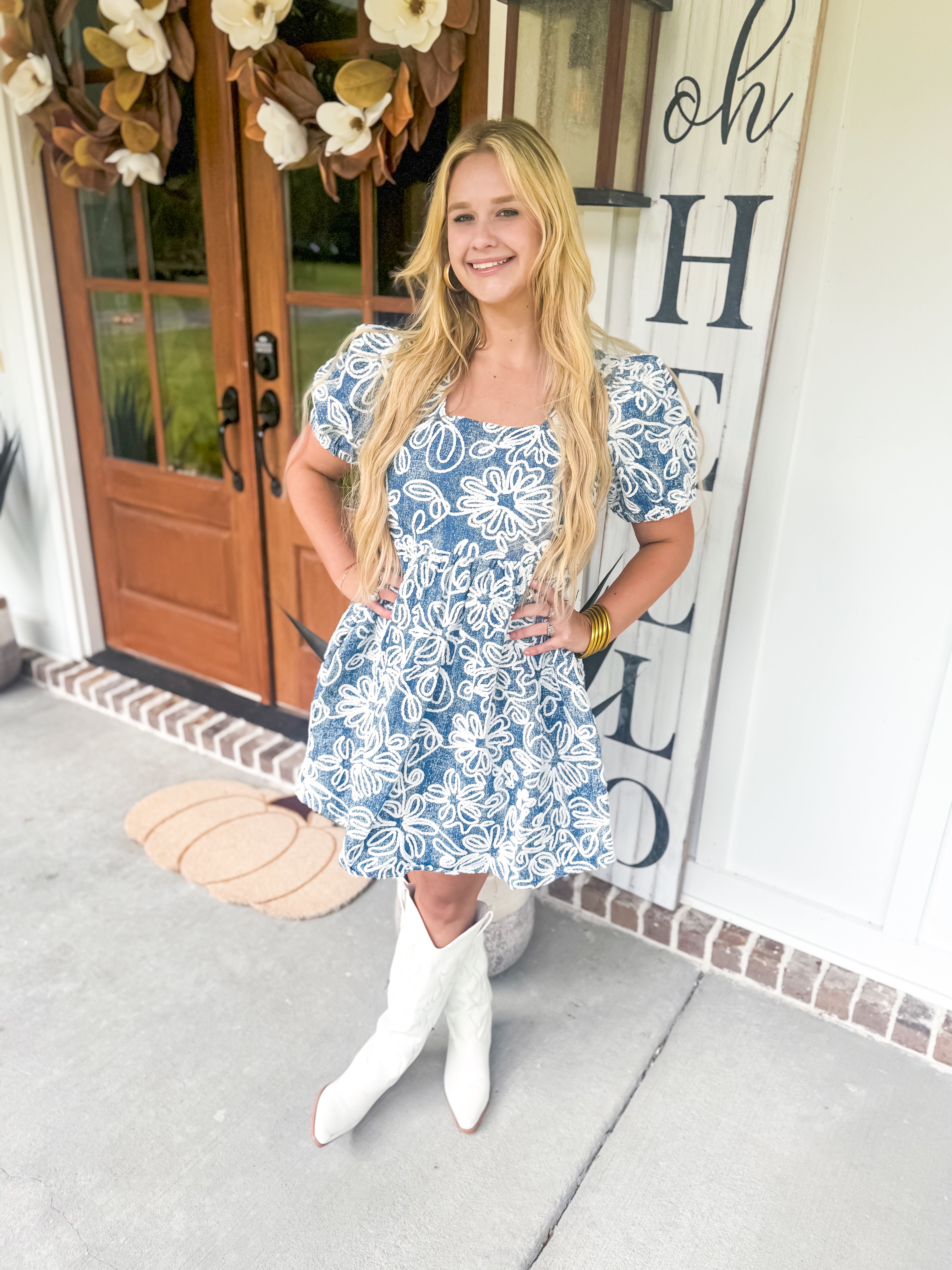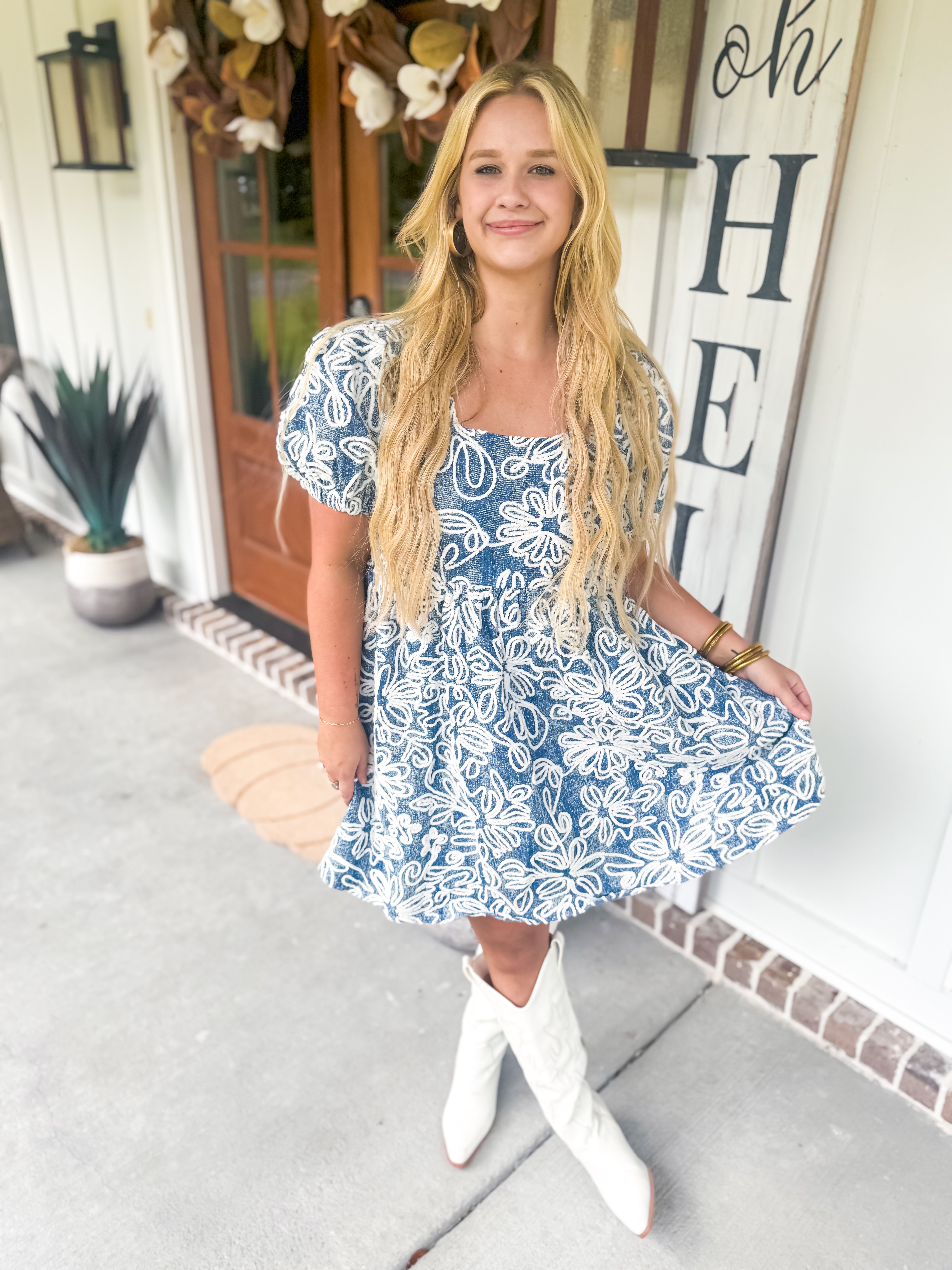 Step into charm with this floral embroidered denim mini dress. Featuring a square neck, puffy sleeves, and practical pockets - it combines playful details with effortless style, finished with a zipper closure in the back.