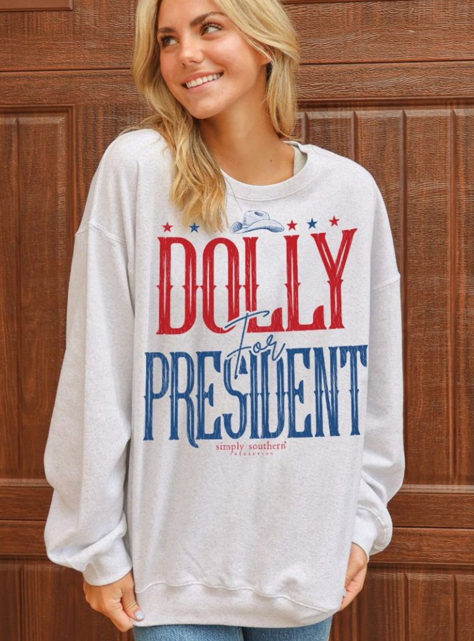 Flurry off-white long sleeve crew with the phrase 'Dolly for President' and the Simply Southern logo below. 60% cotton/40% polyester blend.