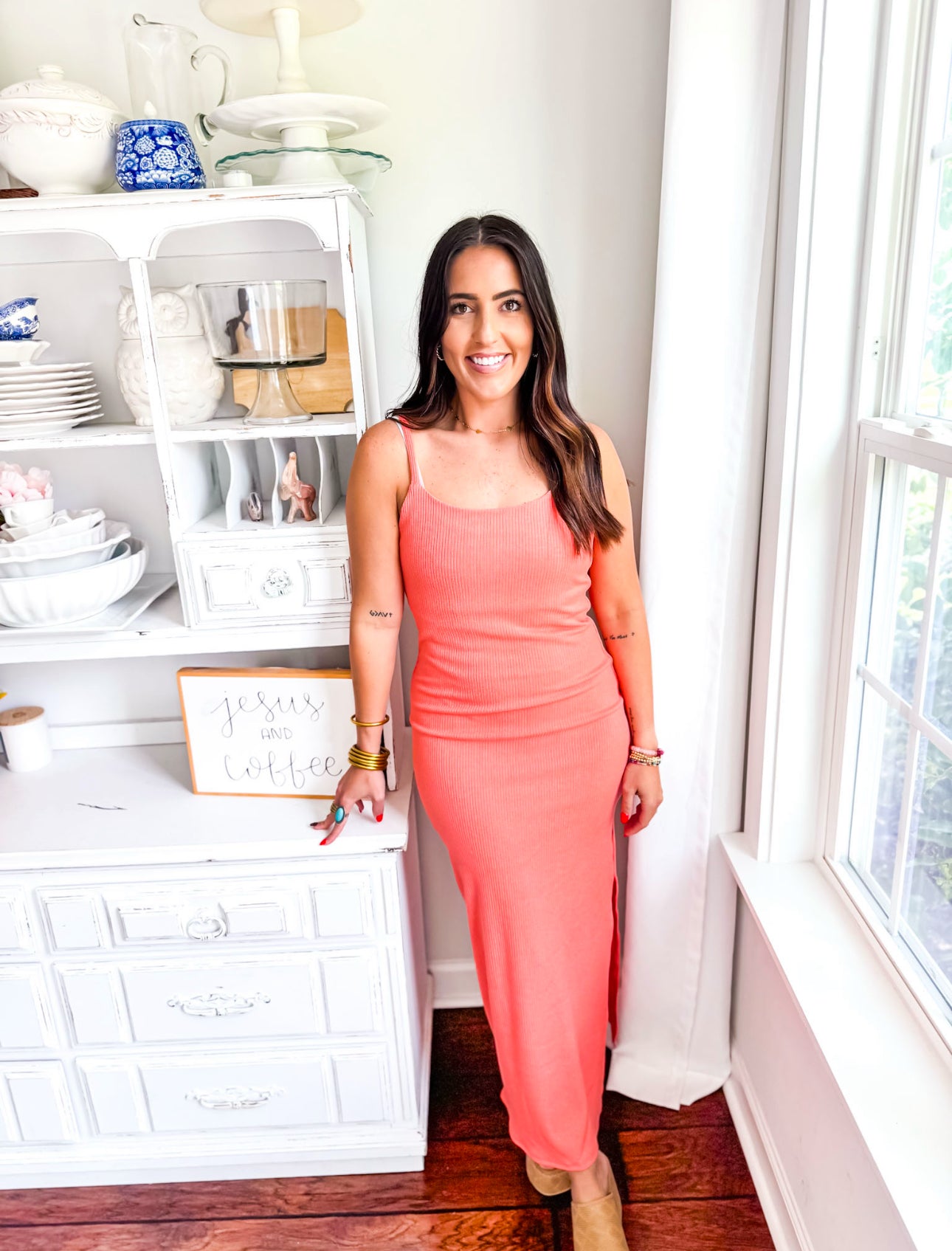 Great midi length dress. Adjustable Spaghetti Straps. Double lined, ribbed knit.