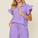 Double Take Full Size Texture Flounce Sleeve Top and Drawstring Shorts Set
