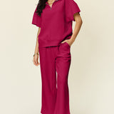Double Take Full Size Texture Half Zip Short Sleeve Top and Pants Set