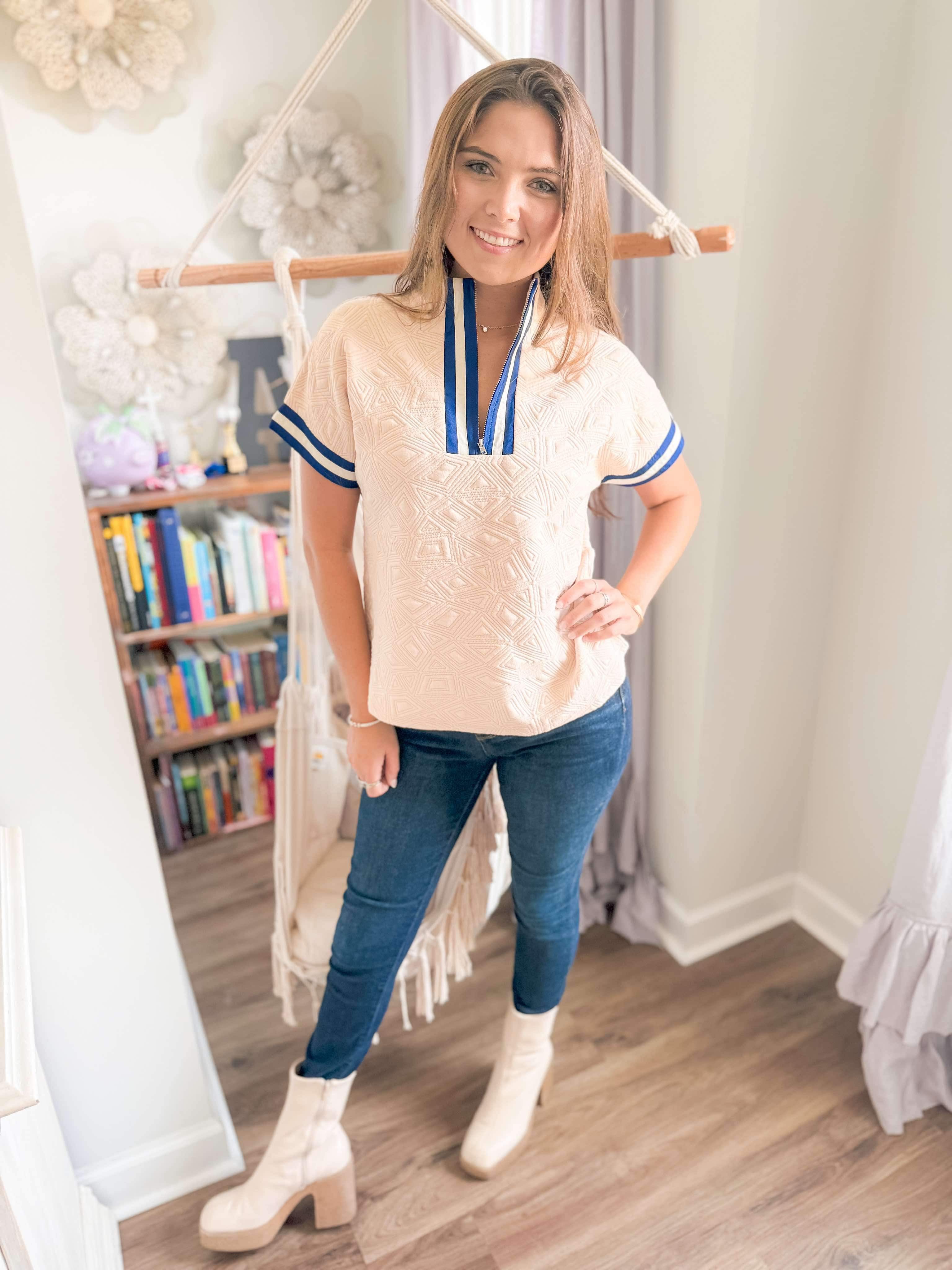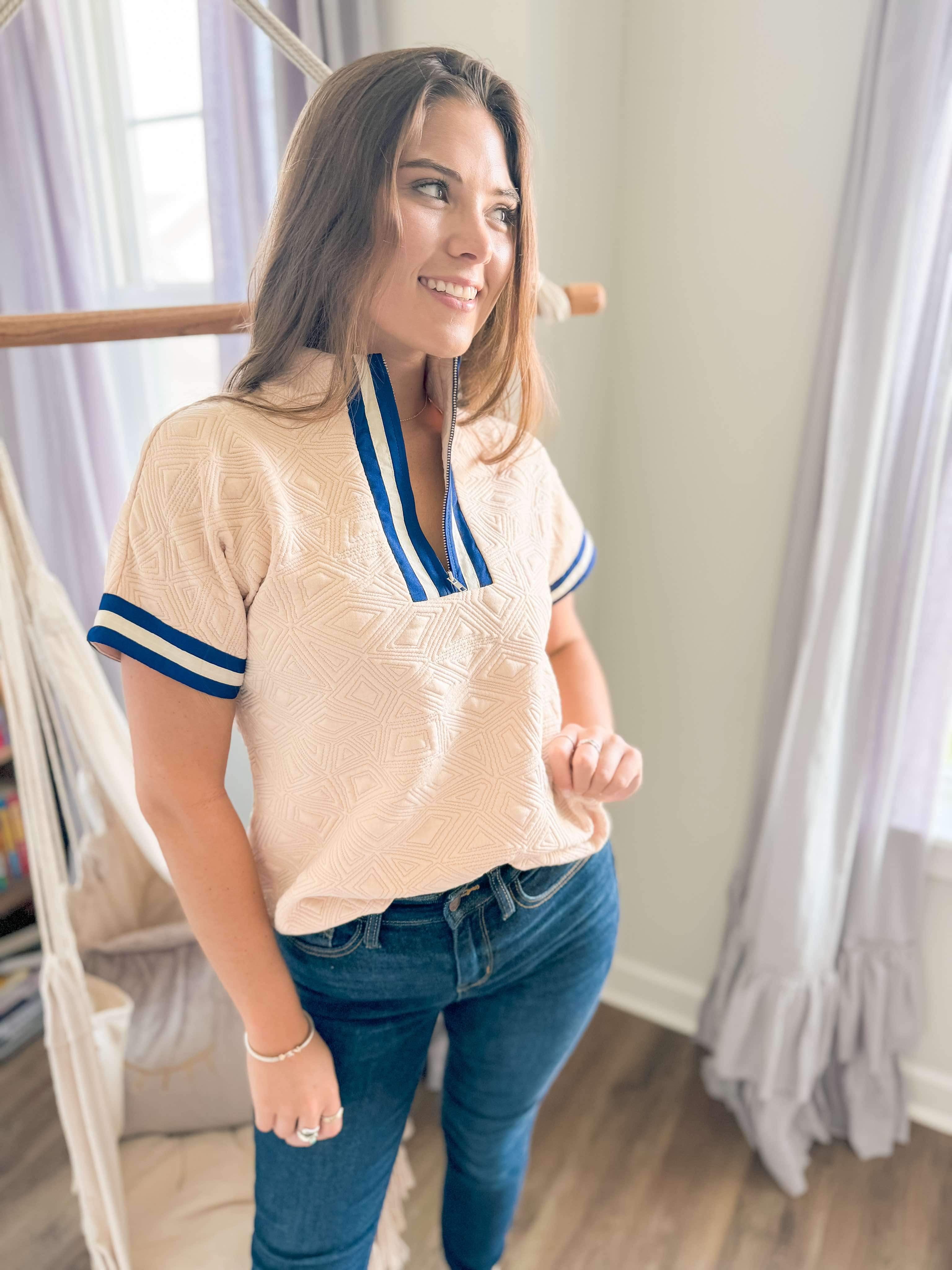 This top is everything you have dreamt of. It is absolutely beautiful. It is a cream base with the prettiest texture throughout. It has a collar detail and a half zip feature as well. On the quarter zip and a part of the sleeve - it does feature a navy and ivory stripe. Such a nice added feature. Gives it a little bit of a regal look.