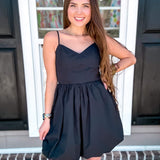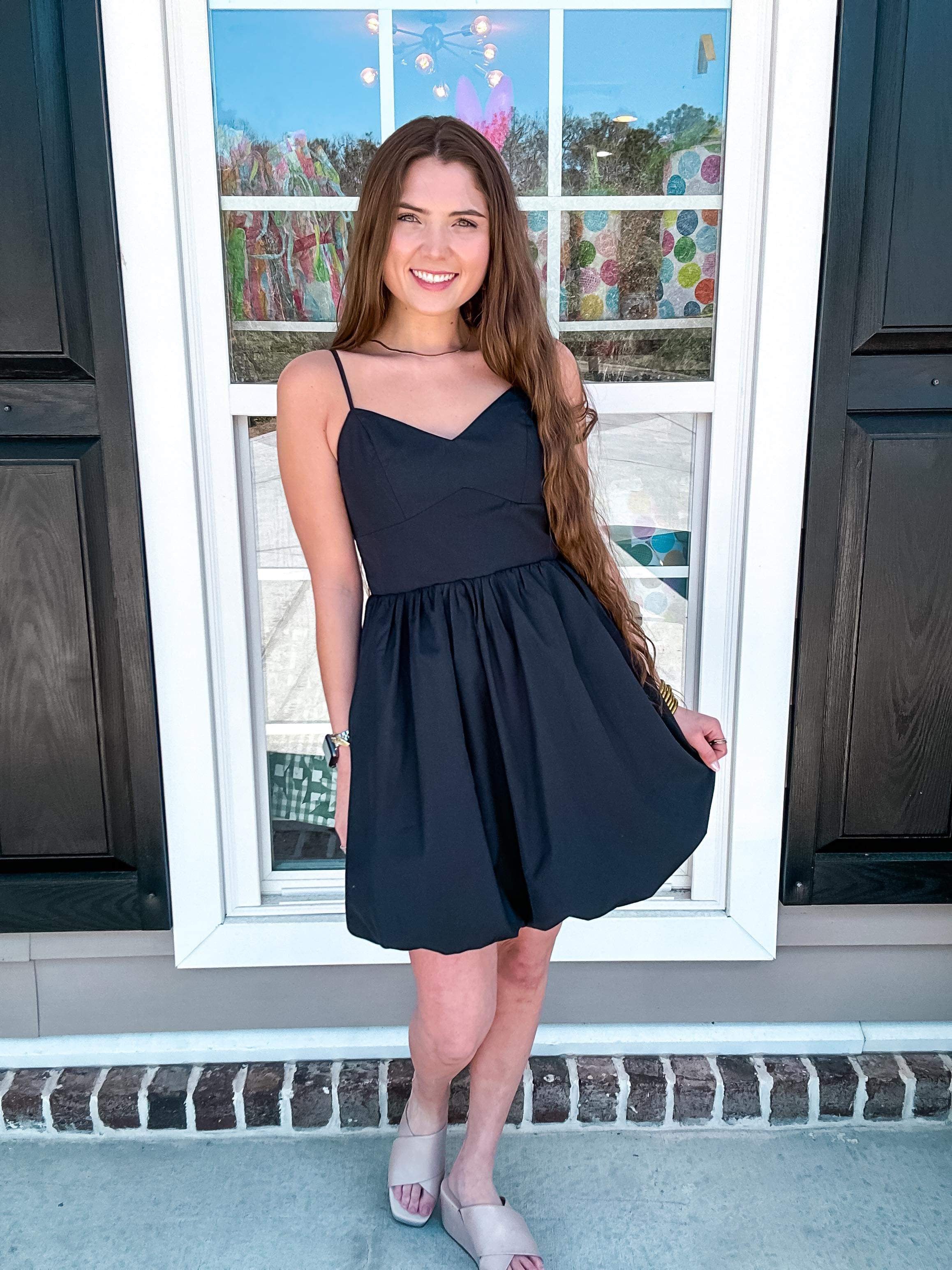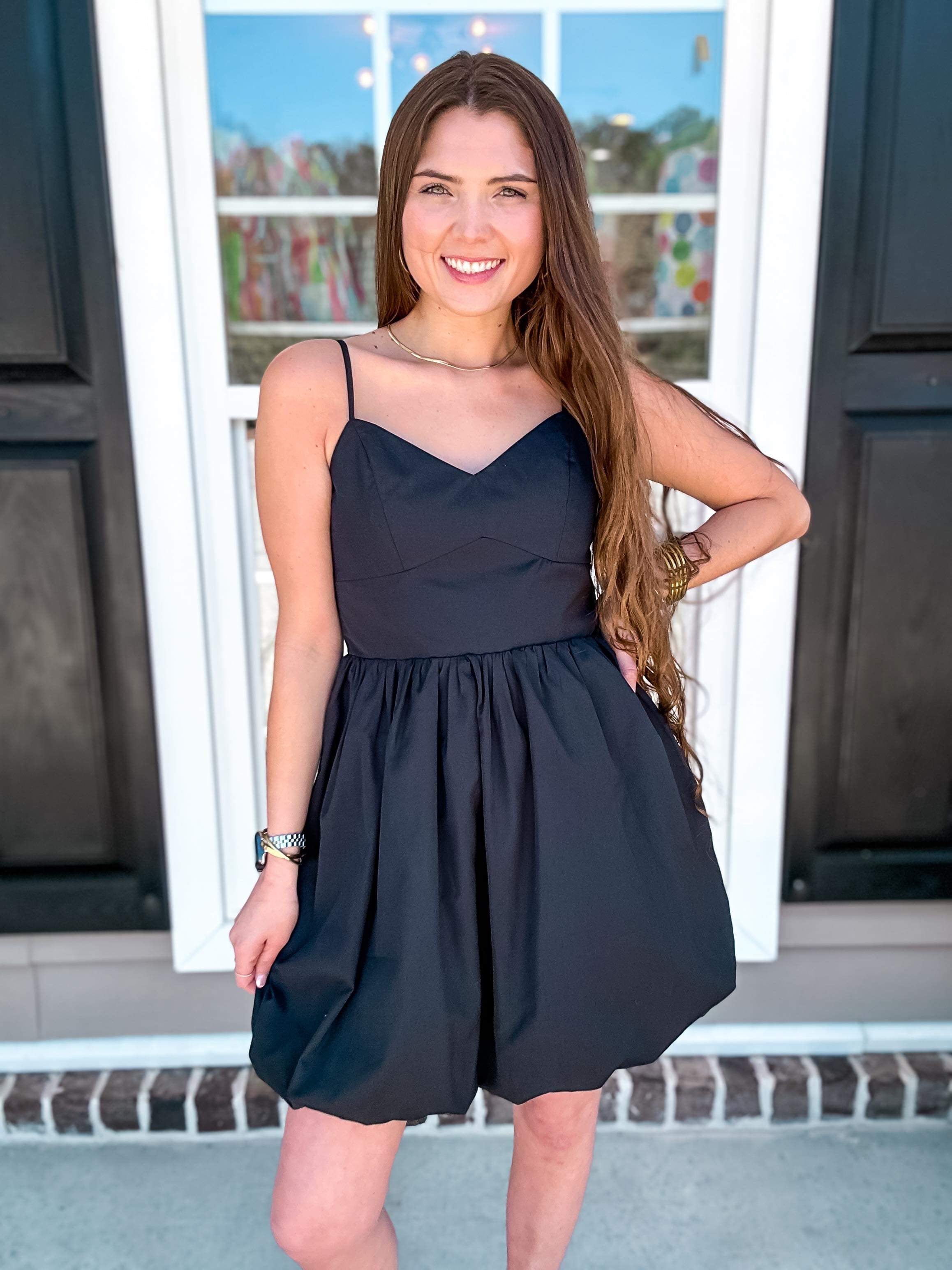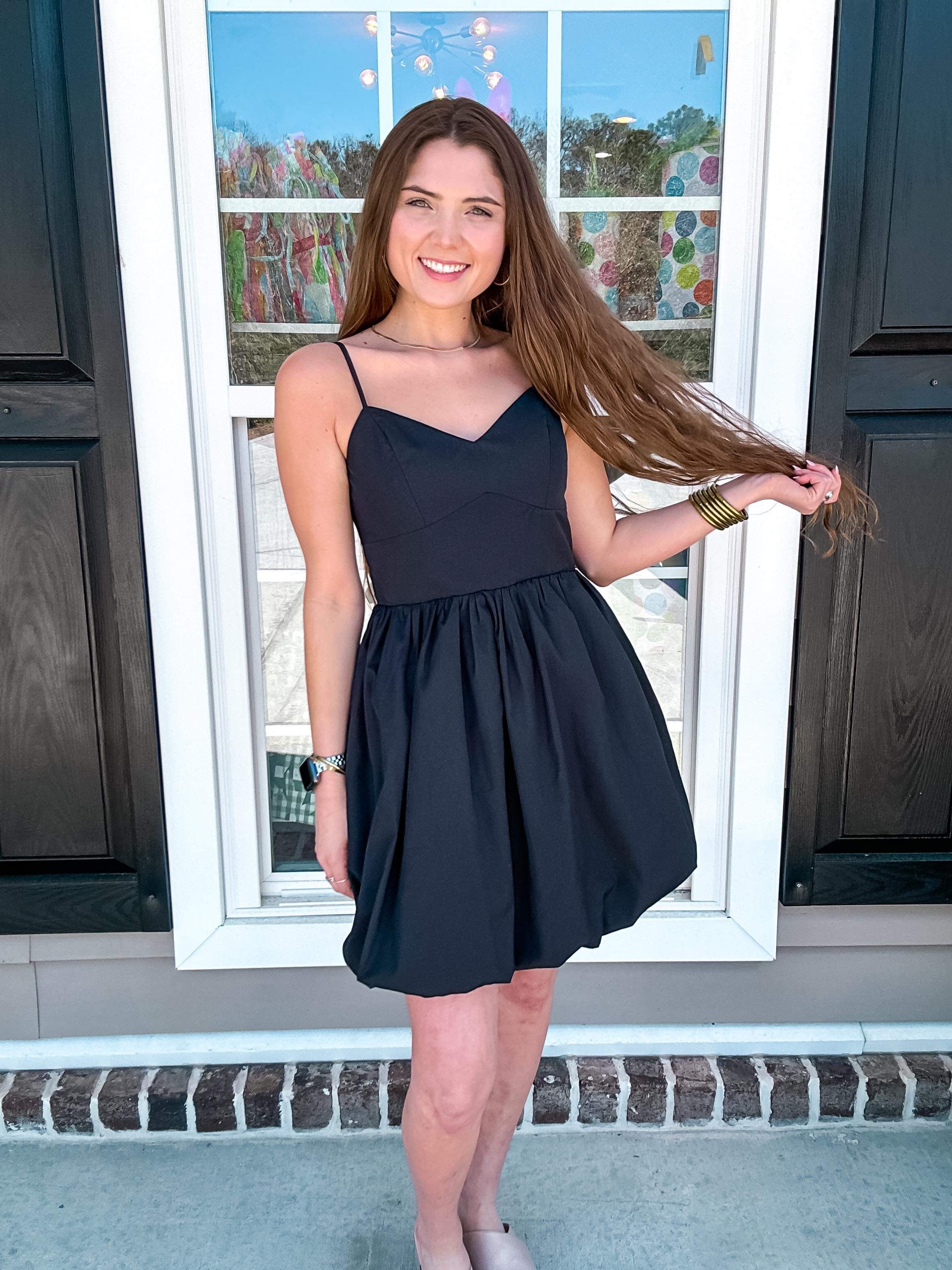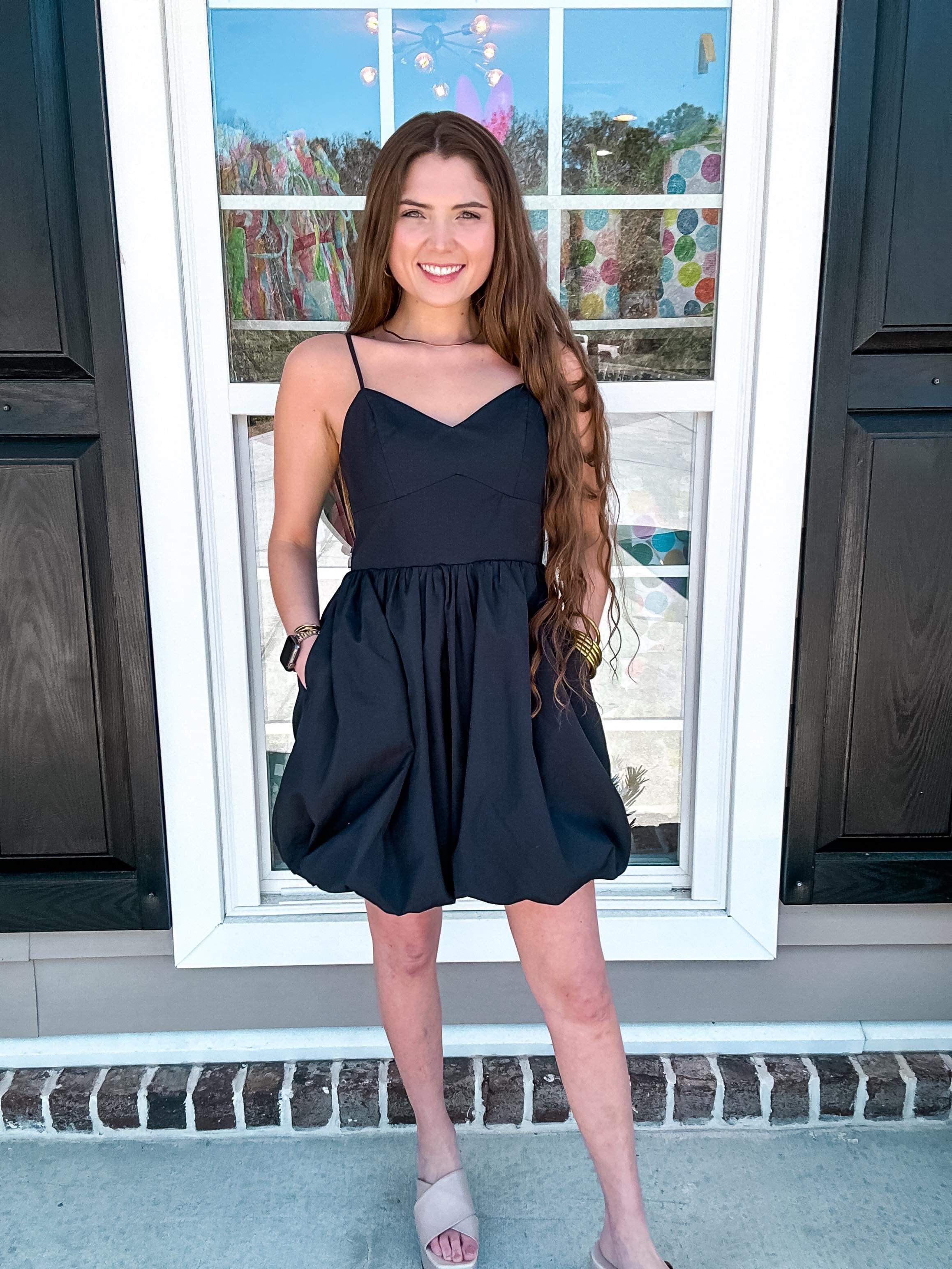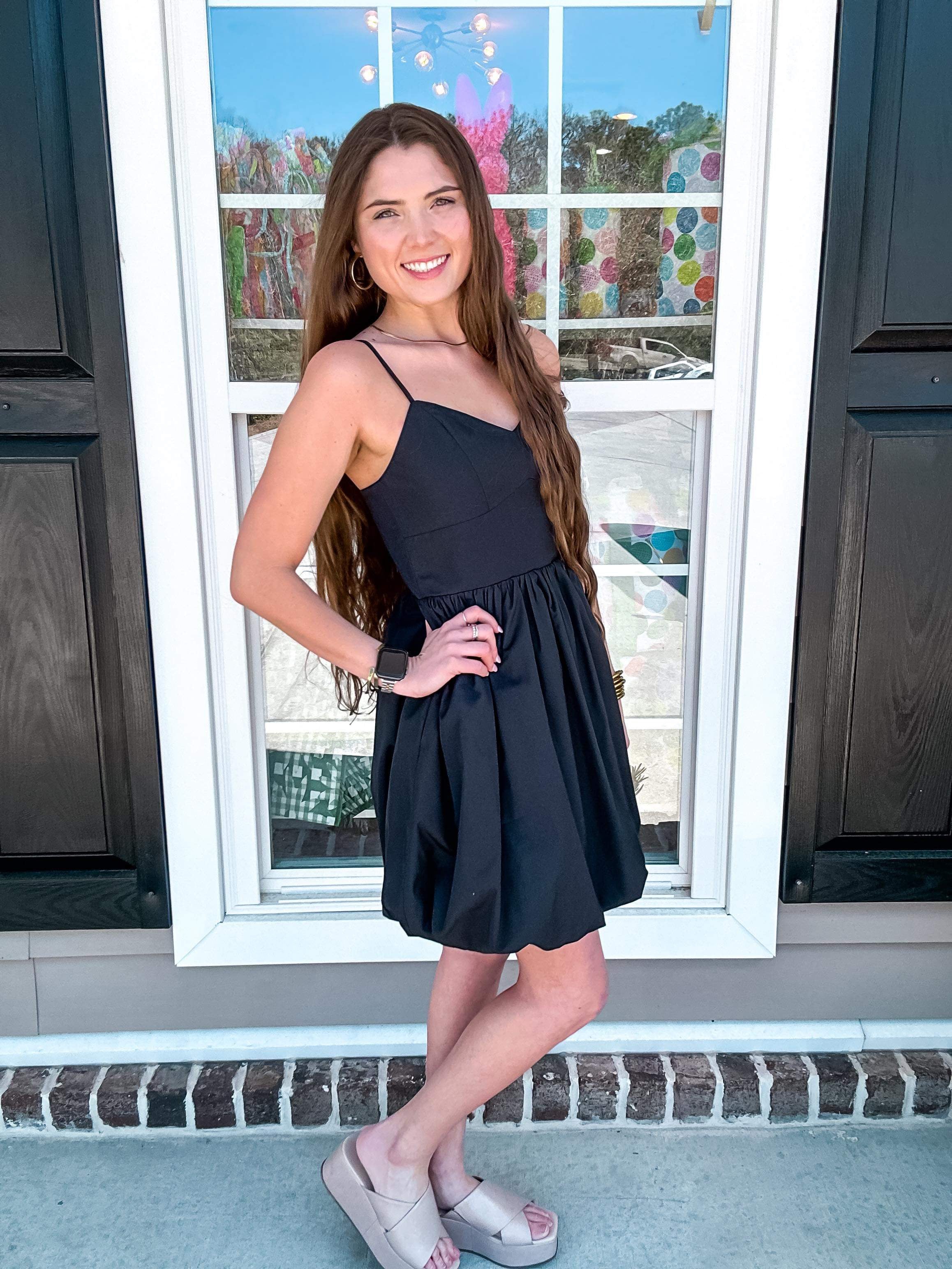 Solid spaghetti strap mini dress featuring bubble hem. Smocking detail at back. Pocket at sides. Lined. Woven. Non-sheer. Lightweight.
