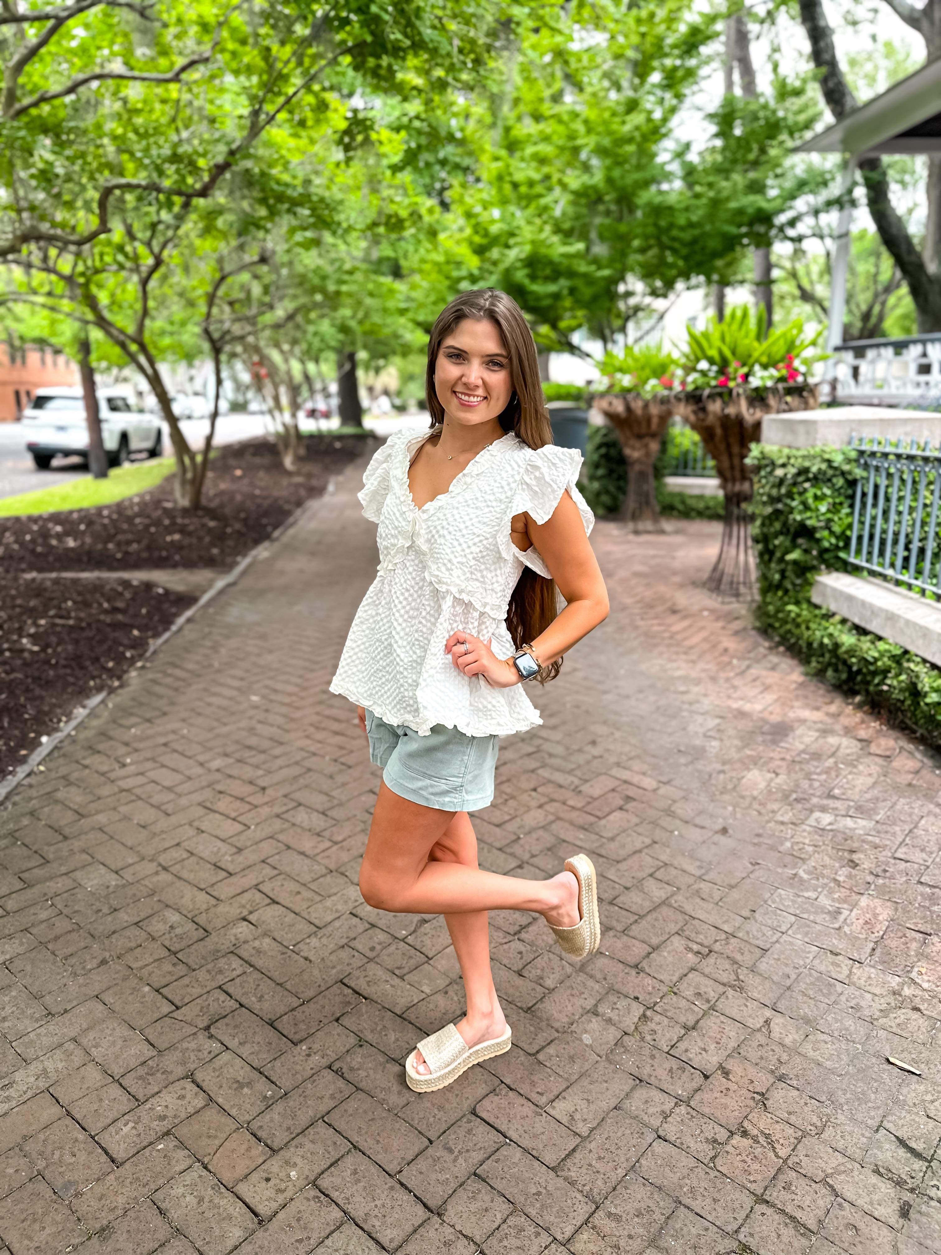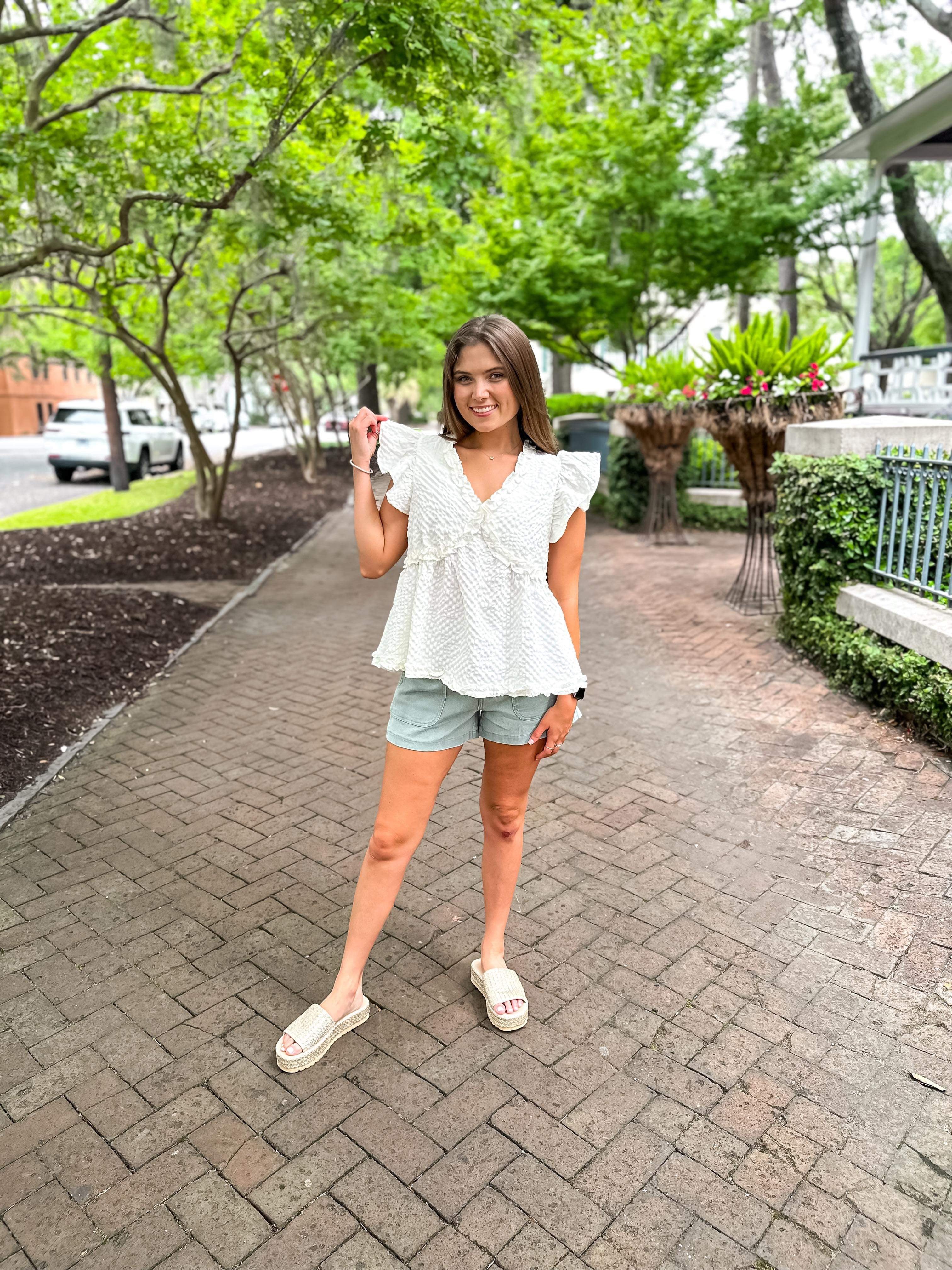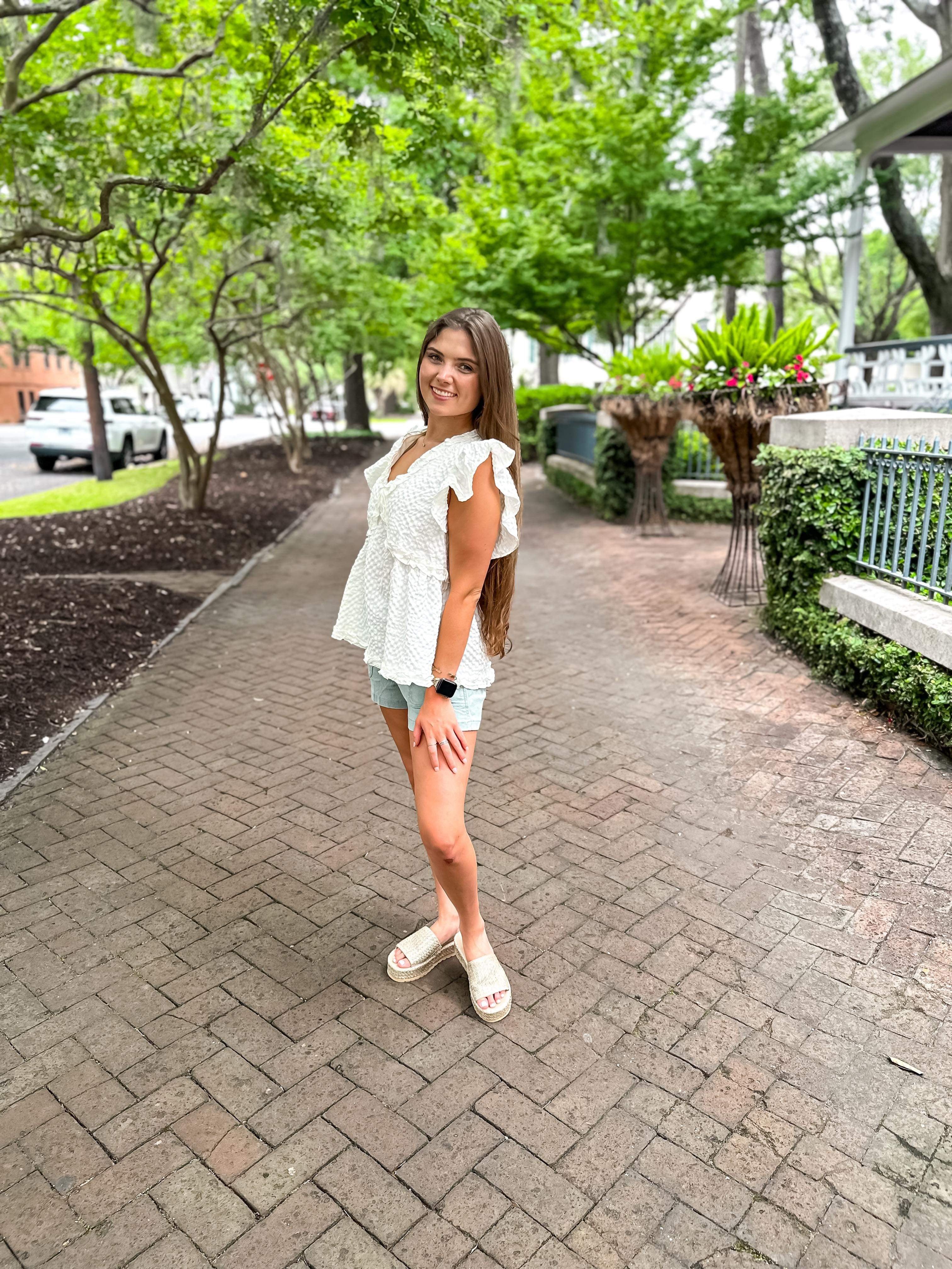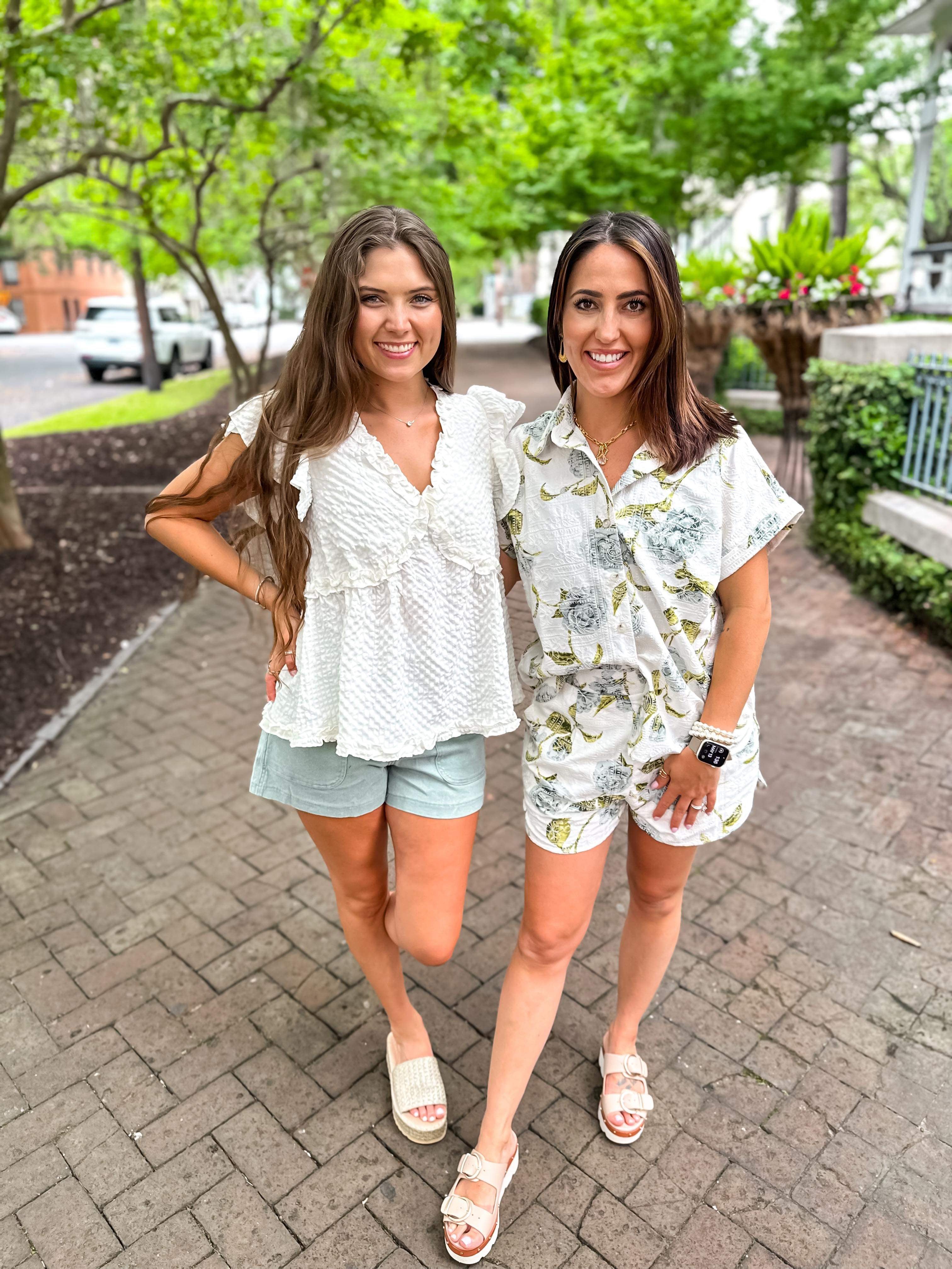 What a perfect top! This casual blouse is terrific for all spring and summer long and is so lightweight and easy to throw on. Pair her with denim jeans or shorts and with a cute wedge or sneaker for a fun summer look!