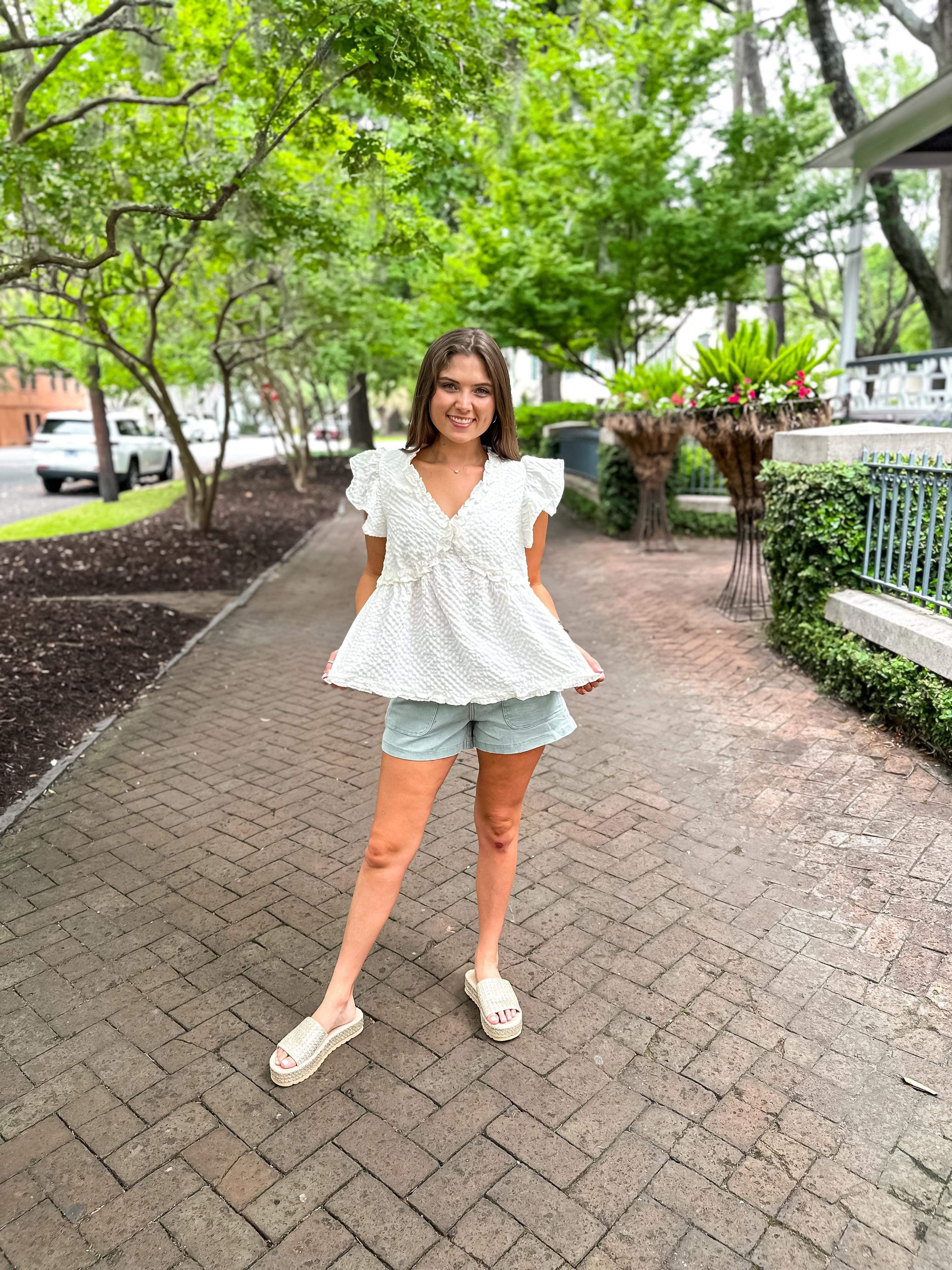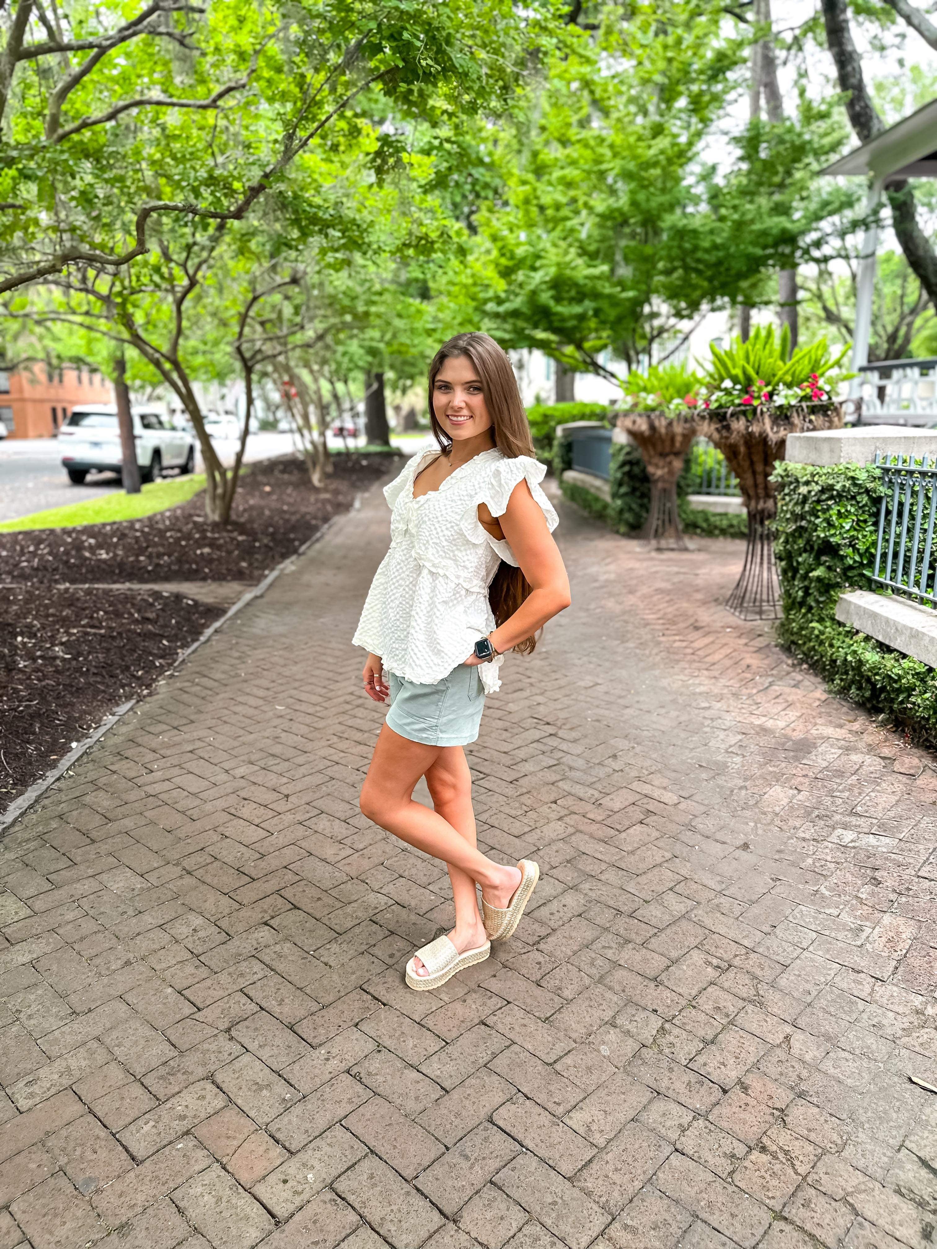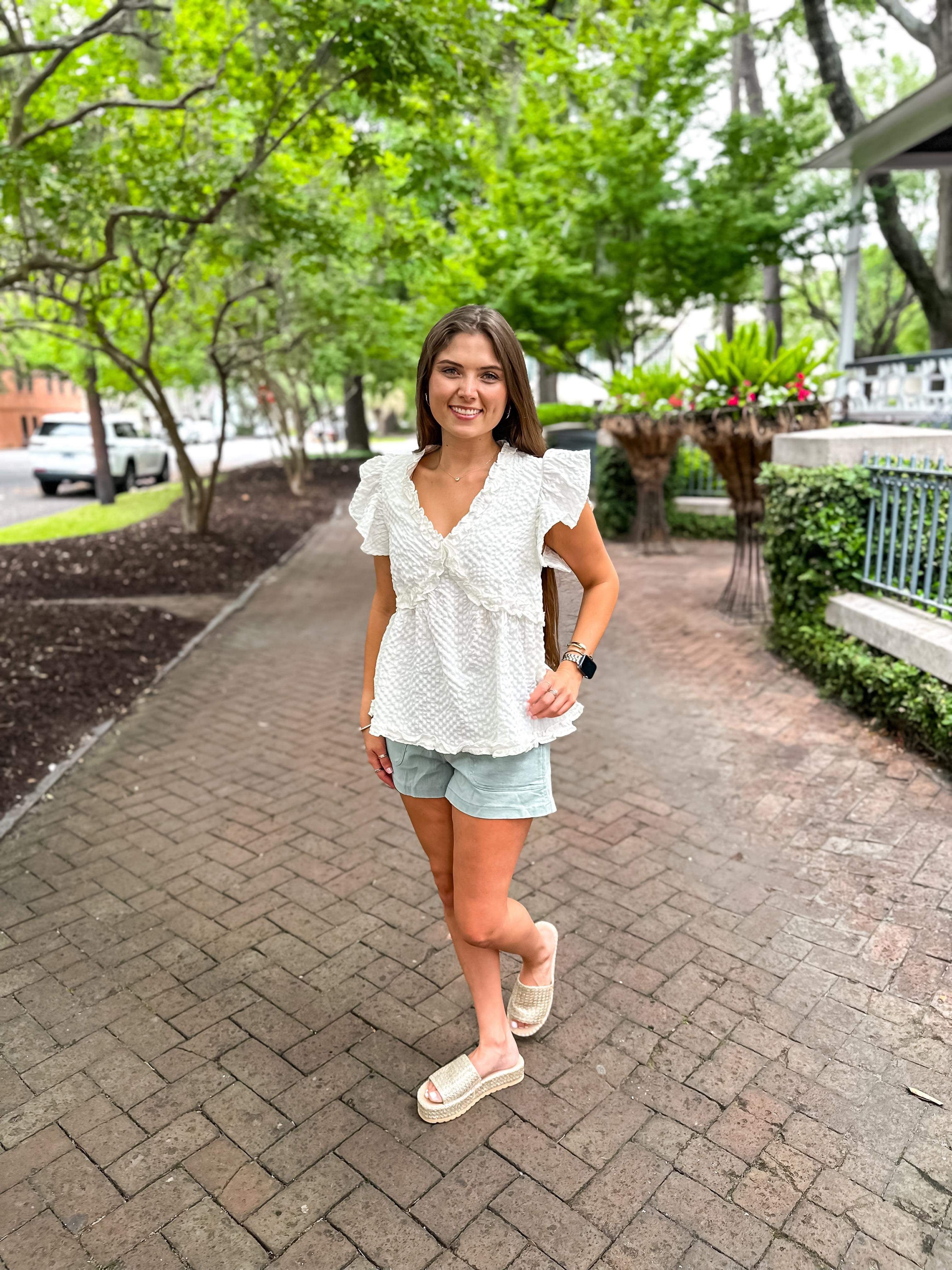 What a perfect top! This casual blouse is terrific for all spring and summer long and is so lightweight and easy to throw on. Pair her with denim jeans or shorts and with a cute wedge or sneaker for a fun summer look!