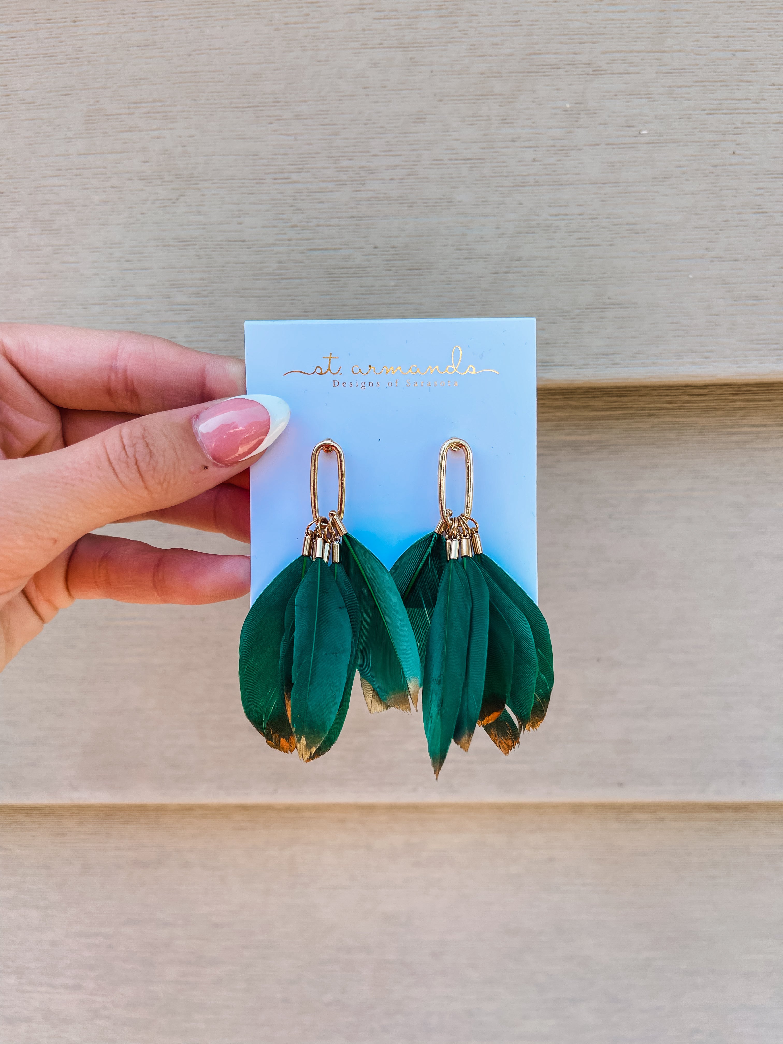 We present the newest addition to our feather family! Our hand-selected emerald green feathers are dipped in gold accent then combined with gold hardware for a touch of stunning glamour! The lightweight design ensures comfortable wear while the approximately 2.5-inch length adds an elegant touch!