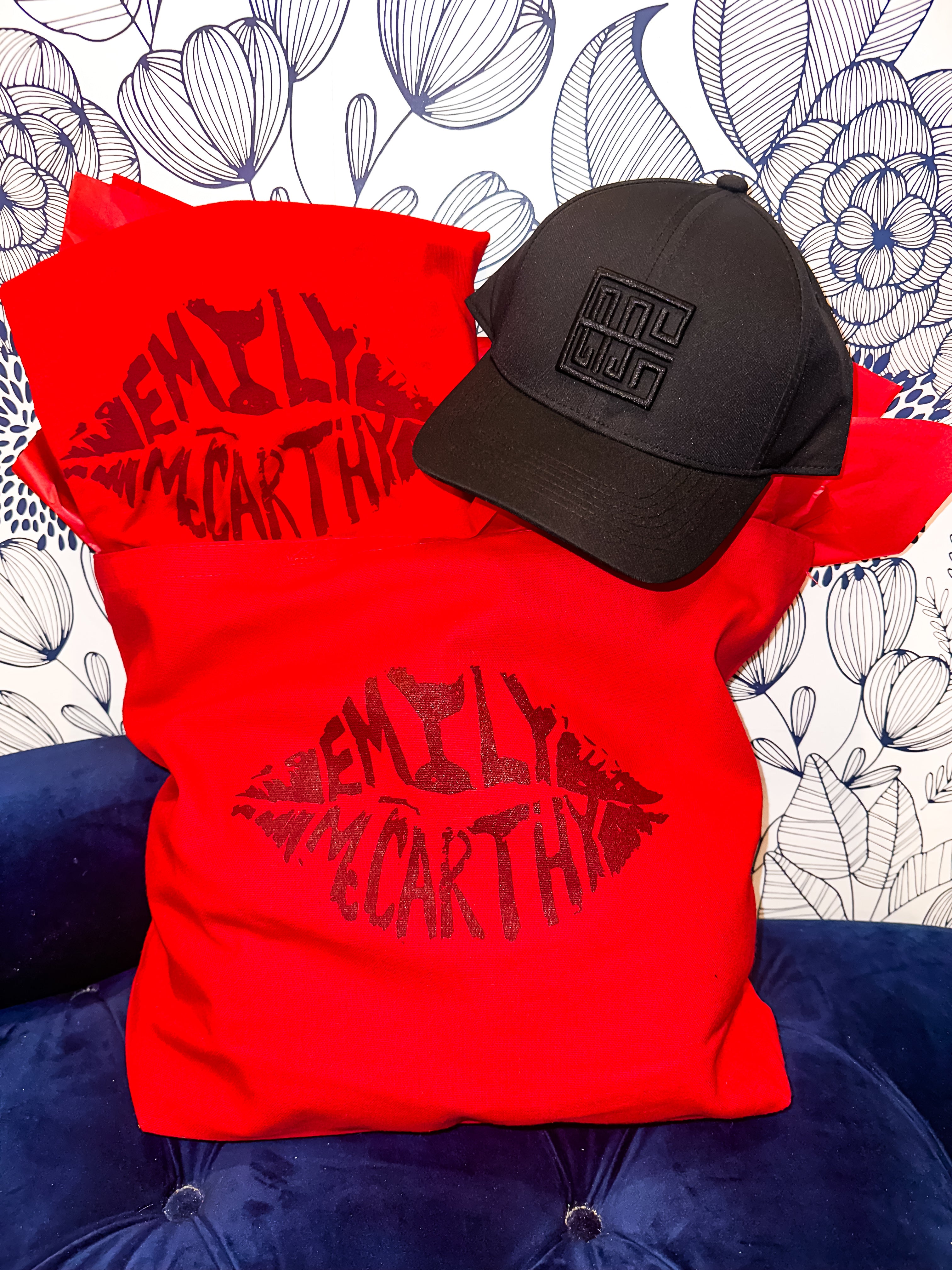 Crafted from soft, breathable cotton, this comfortable and groovy tee features "Emily McCarthy" creatively formed into the shape of lips. In a bold and vibrant red, this tee is the perfect statement piece to add a little bit of edge to any outfit!