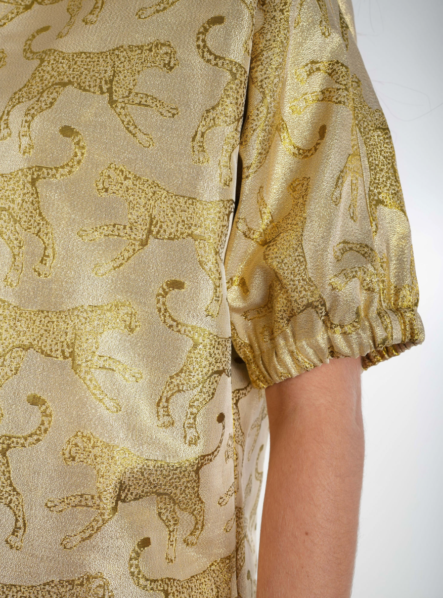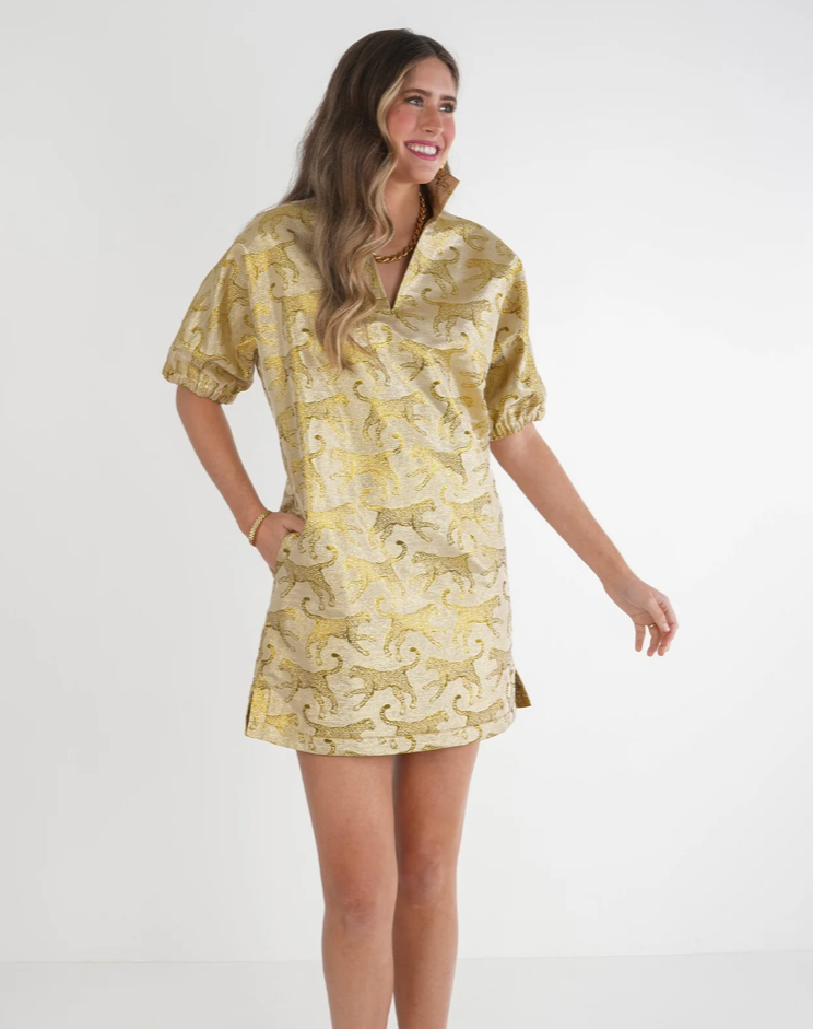 The Poppy Dress in Jaguar Jacquard blends classic style and with a touch of playful personality. Crafted in a textured jacquard fabric featuring glistening gold cheetahs, this piece is timeless and eye-catching. Featuring a loose fitting body, classic stand collar, and loose elastic dolman sleeves. The classic silhouette makes it perfect for a variety of occasions, while the unique cheetah print adds a touch of elevated flair. Grab your pearls and best heels for a stylish and elevated look!