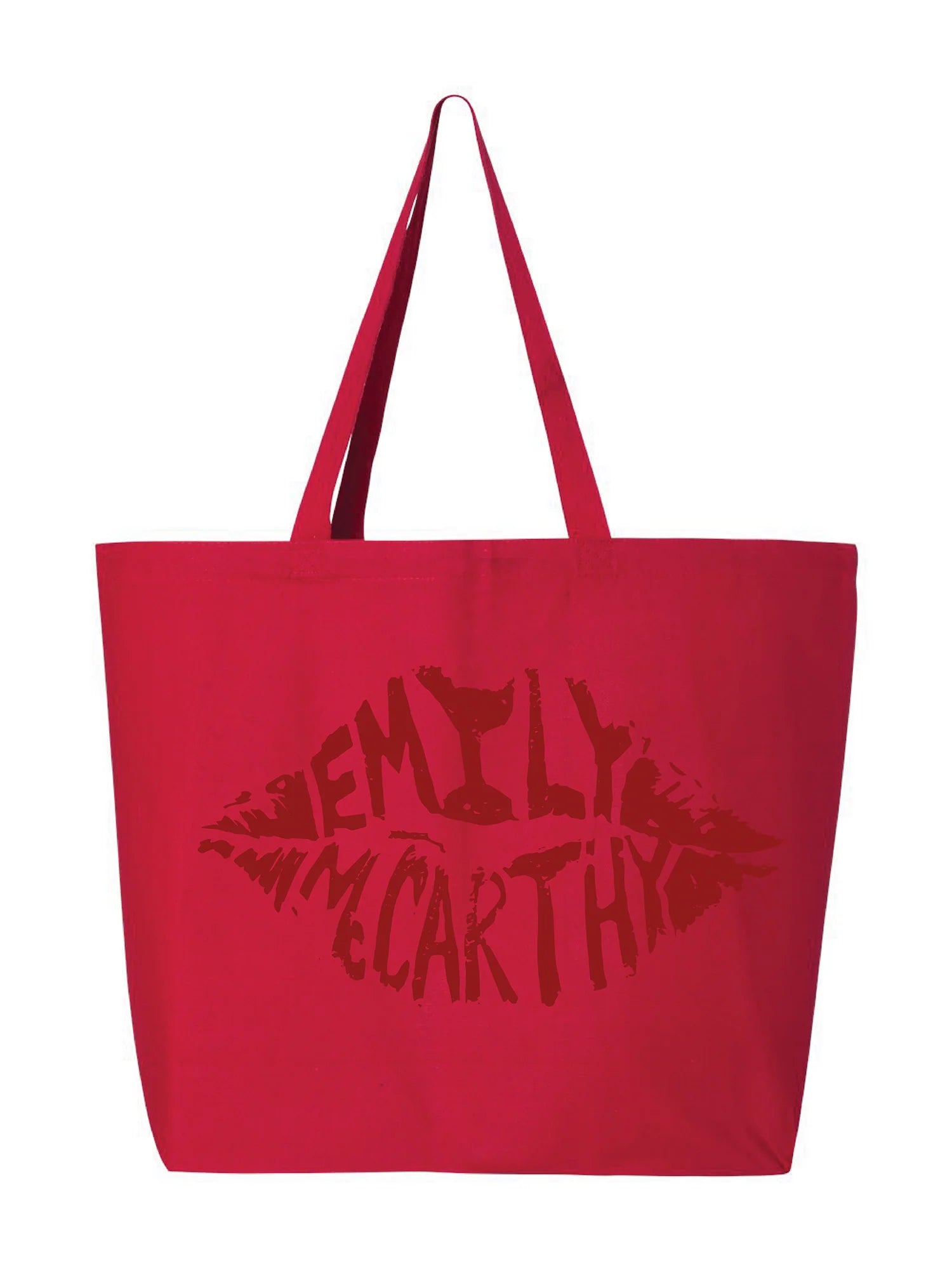 This trendy and groovy tote bag features "Emily McCarthy" creatively formed into the shape of lips. In a bold and vibrant red, this bag is the perfect accessory to add a little bit of edge to your look. Carry all of life's everyday essentials in joyful style!