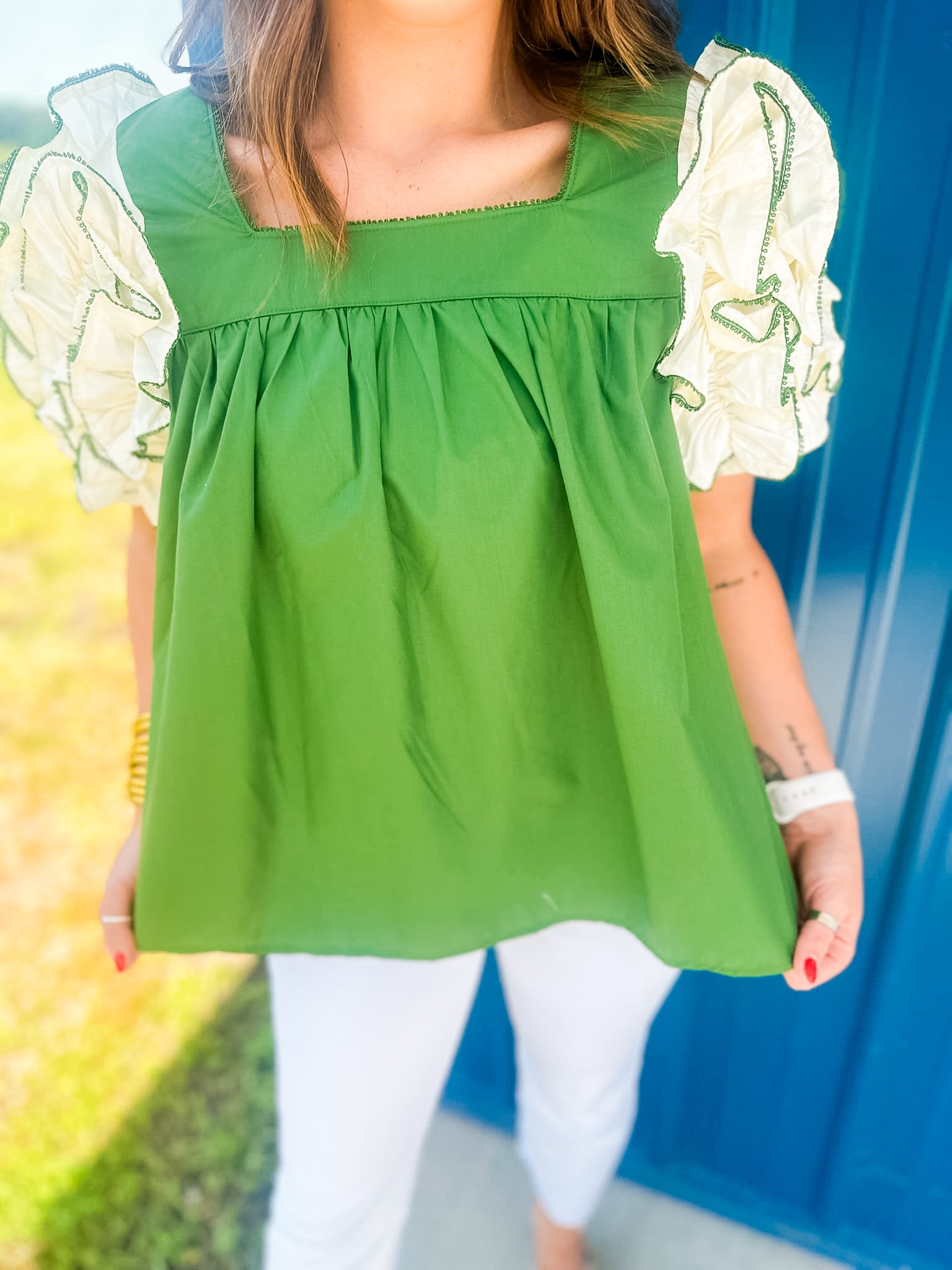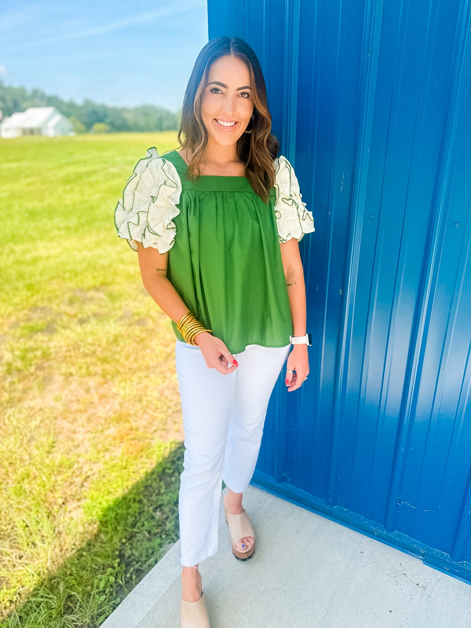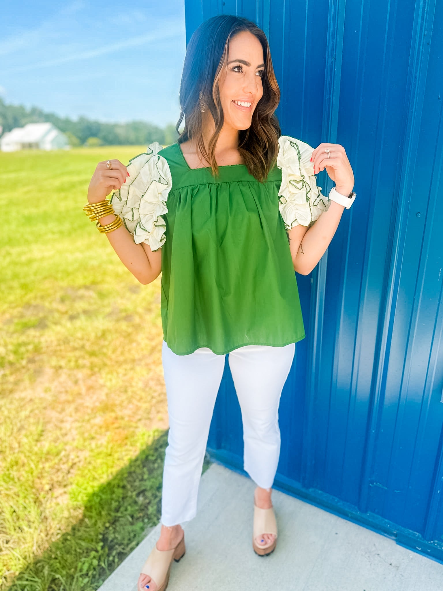 Solid square neck short sleeve top featuring ruffle detail at sleeves. Unlined. Woven. Non-sheer. Lightweight.