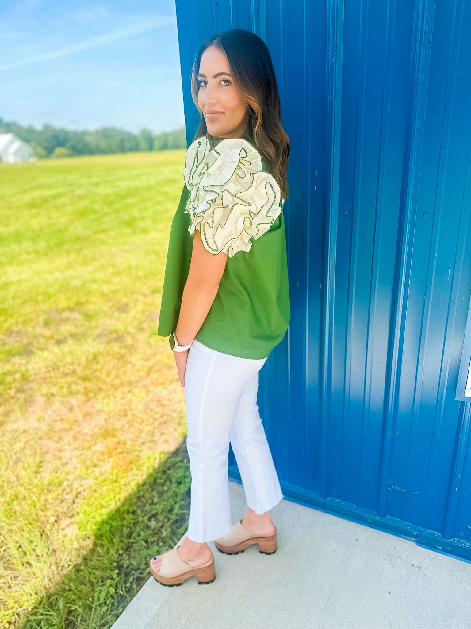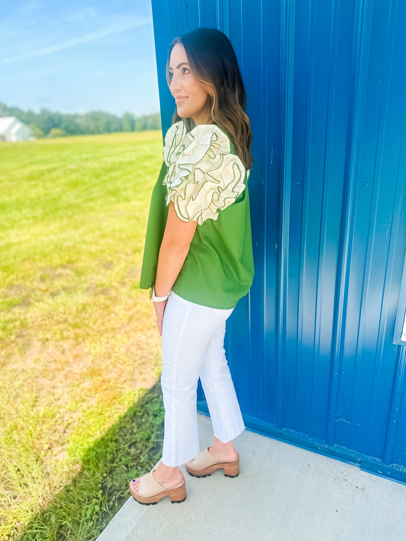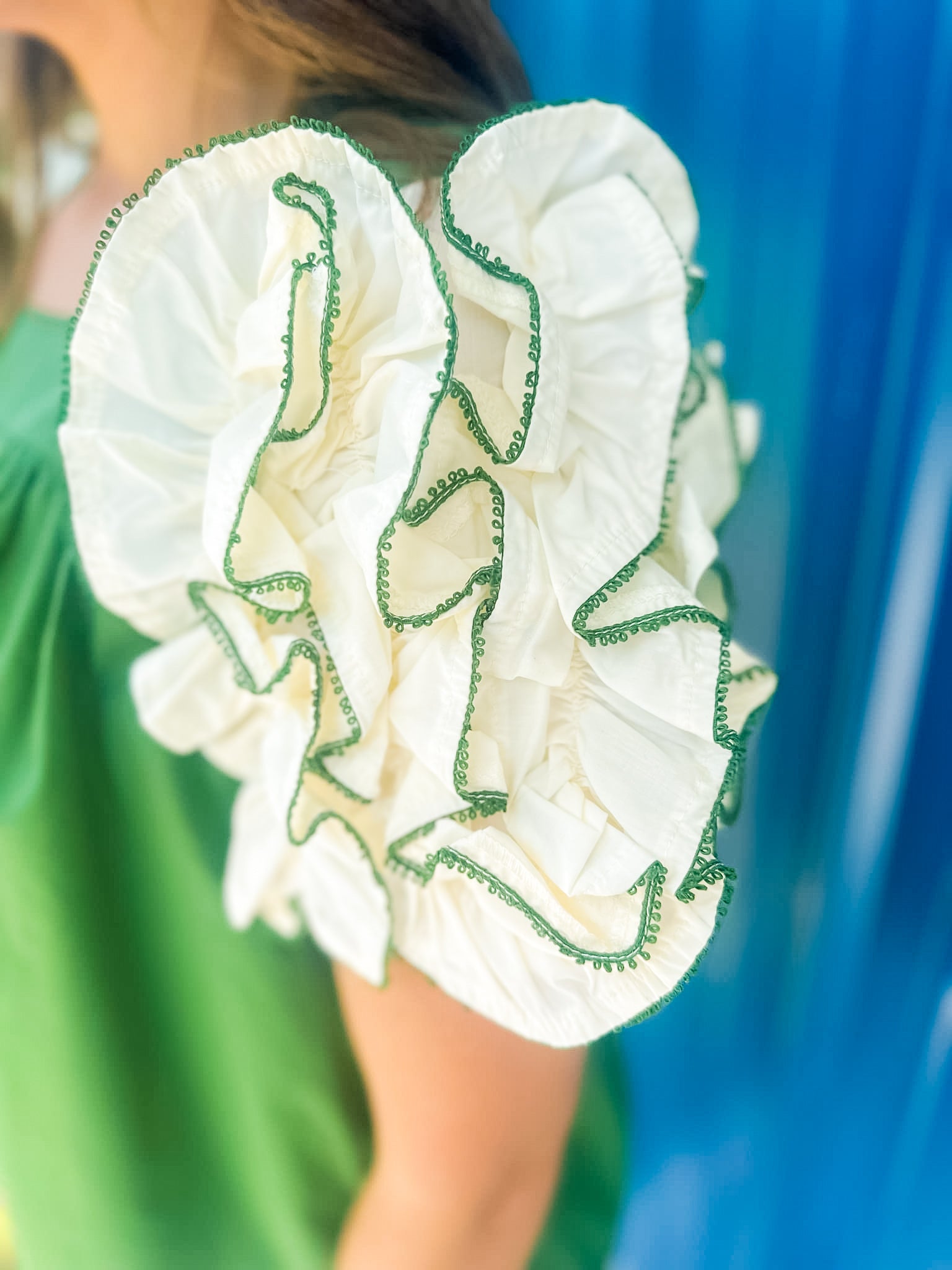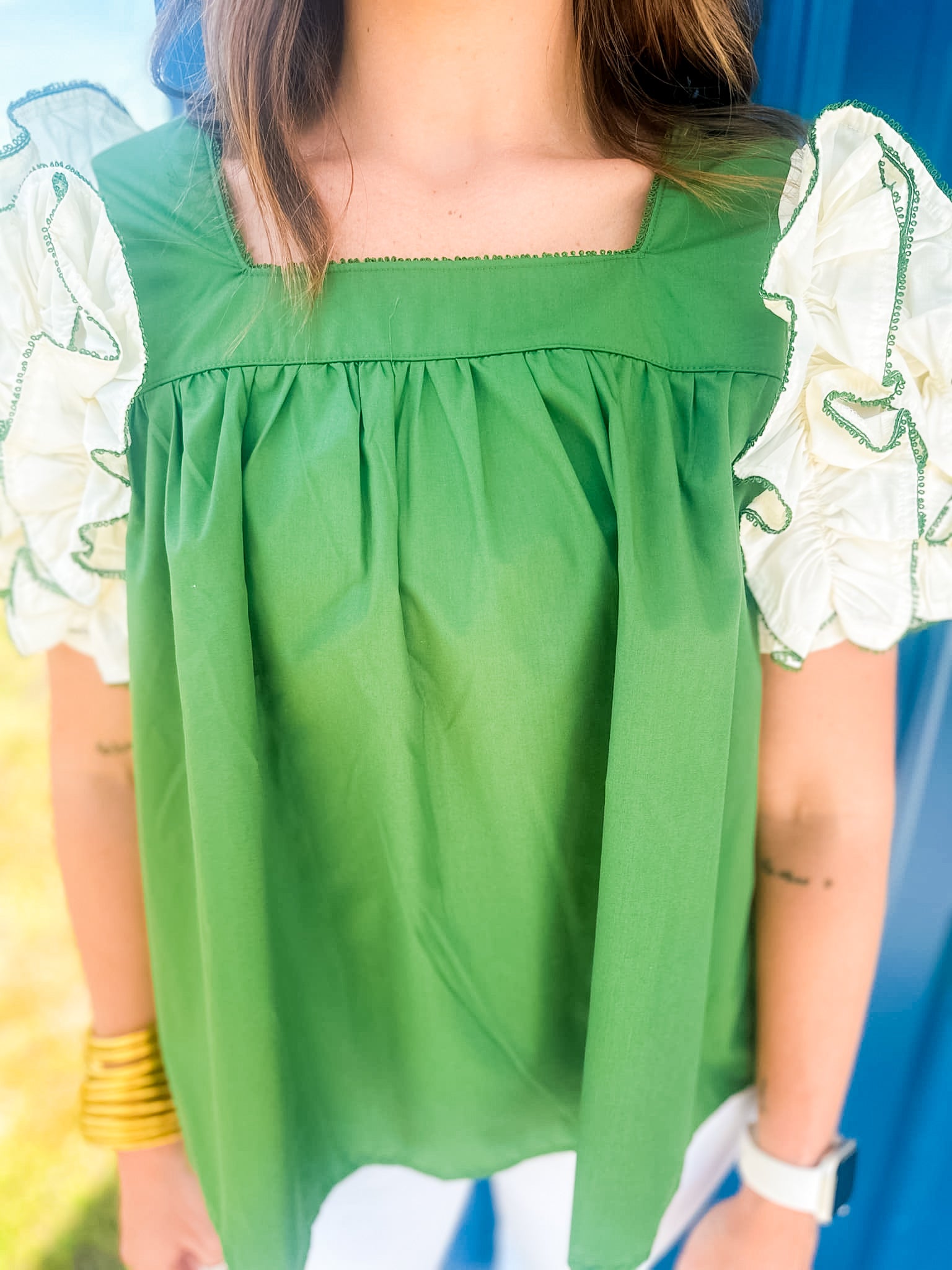 Solid square neck short sleeve top featuring ruffle detail at sleeves. Unlined. Woven. Non-sheer. Lightweight.
