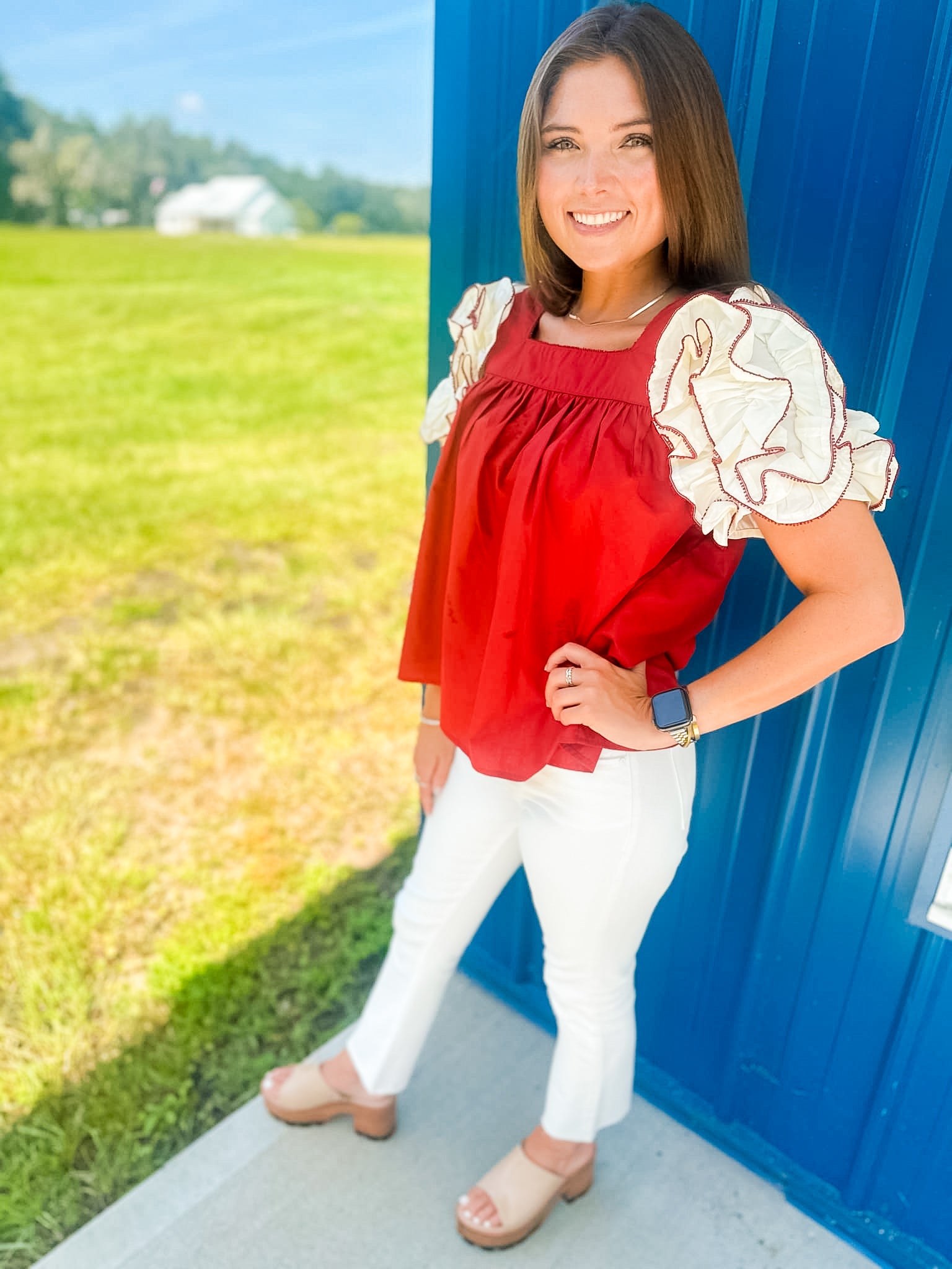 Solid square neck short sleeve top featuring ruffle detail at sleeves. Unlined. Woven. Non-sheer. Lightweight.