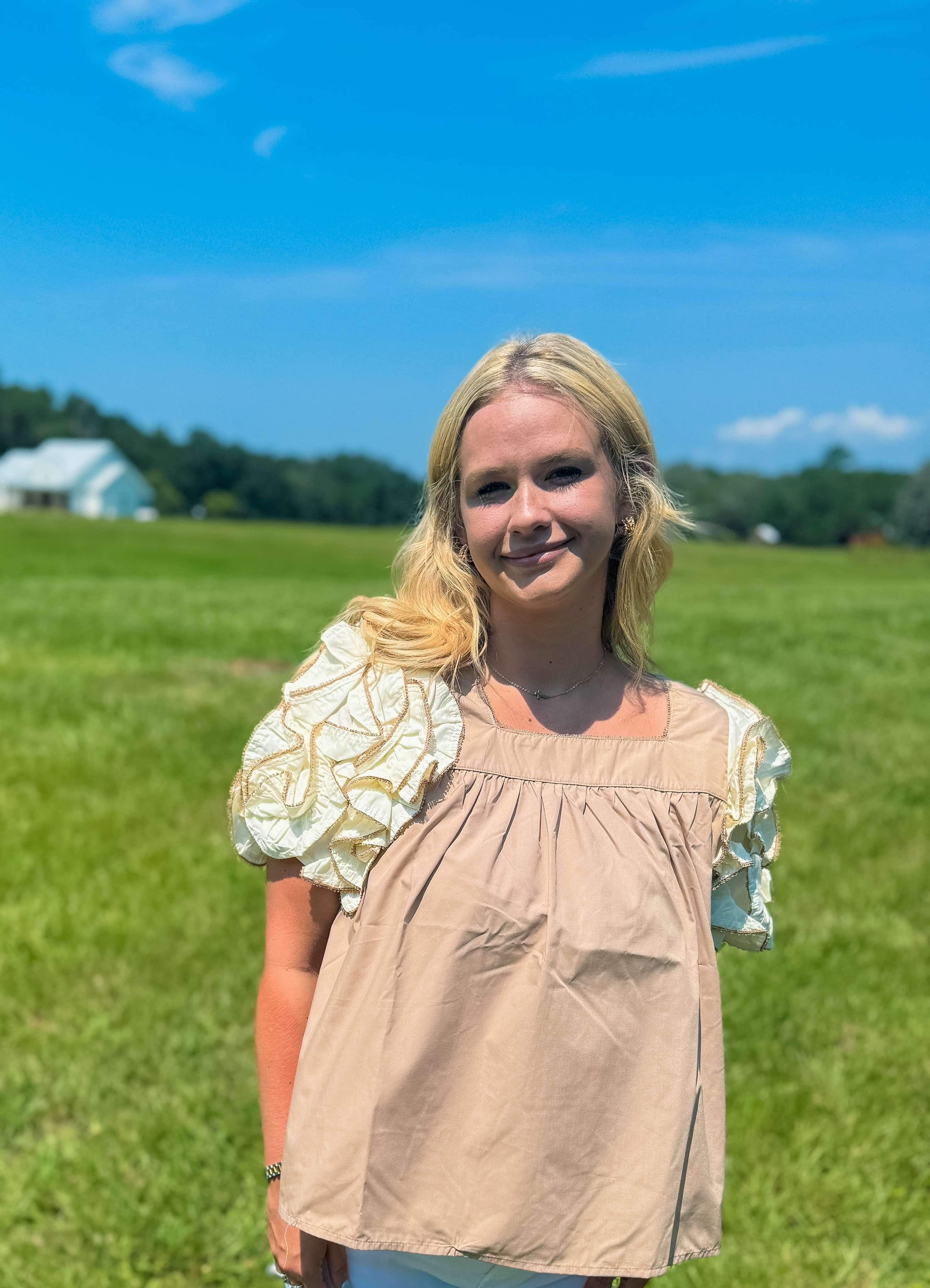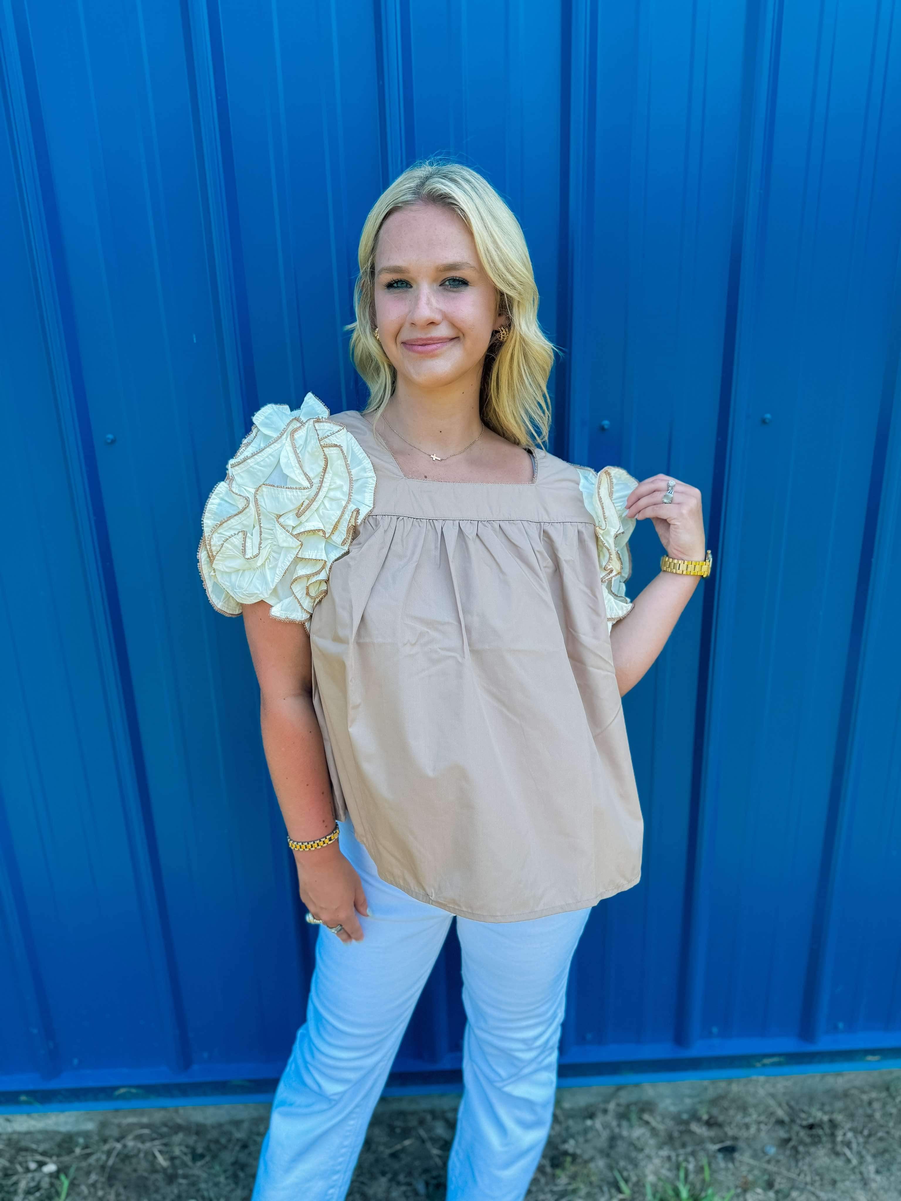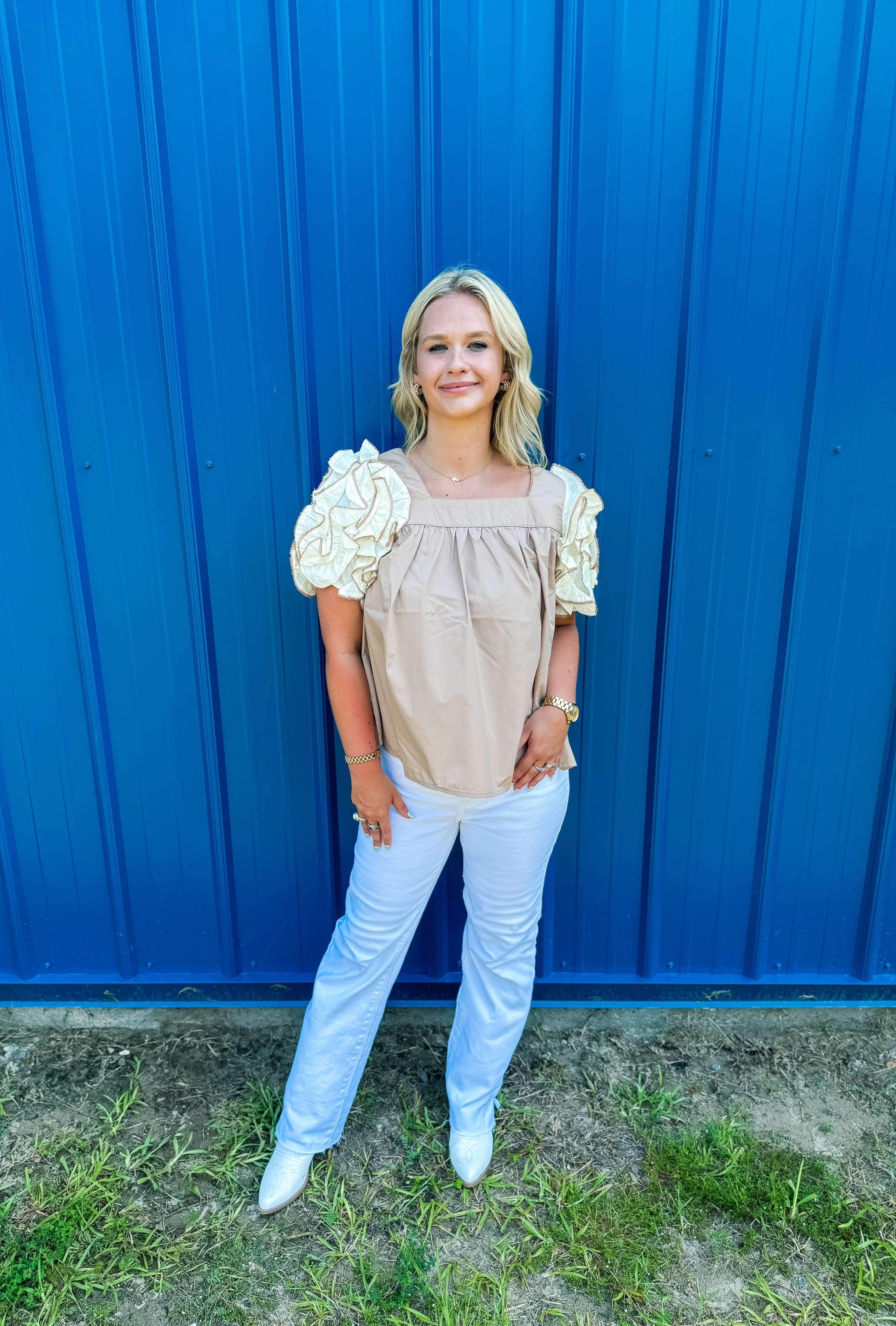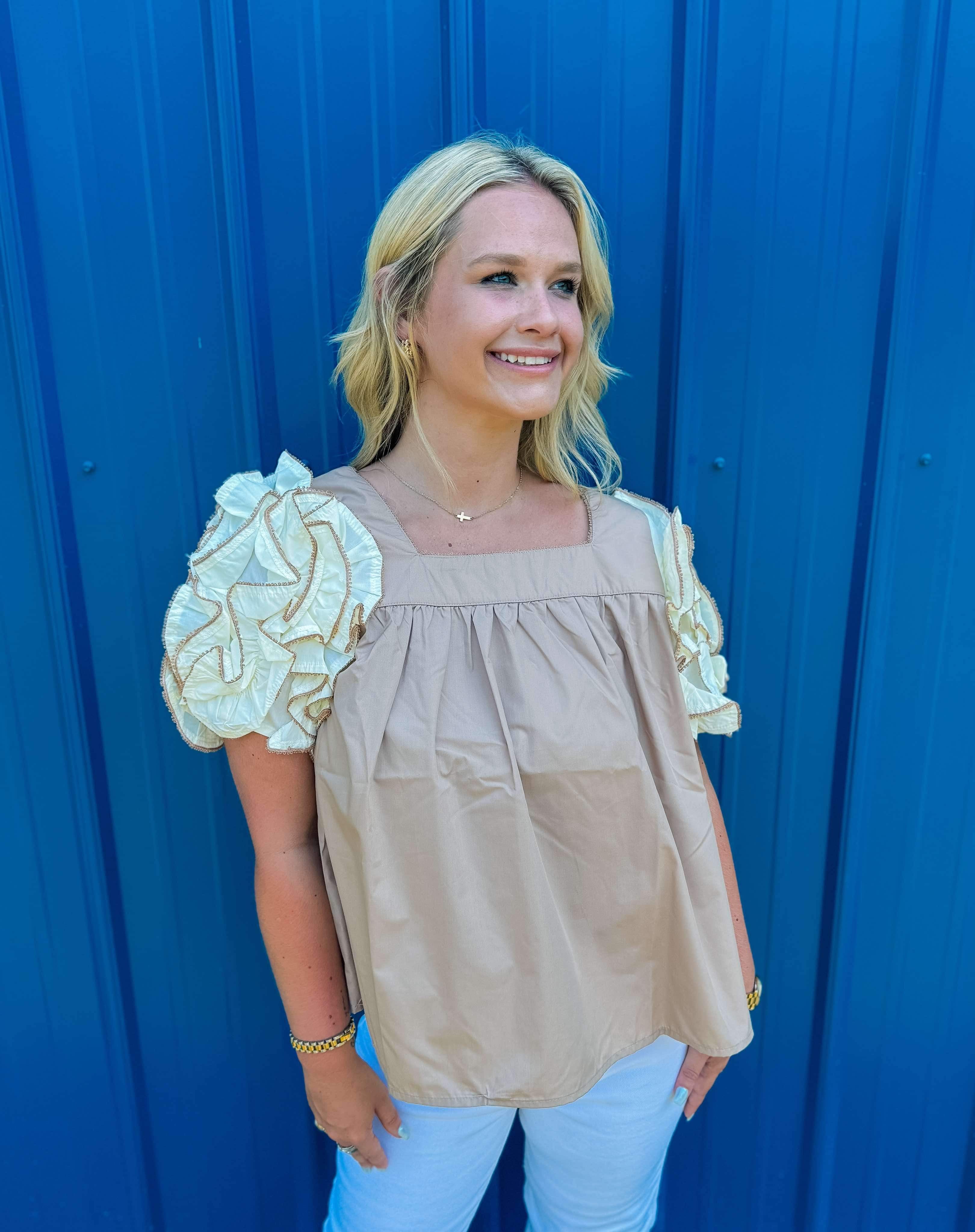 Solid square neck short sleeve top featuring ruffle detail at sleeves. Unlined. Woven. Non-sheer. Lightweight.