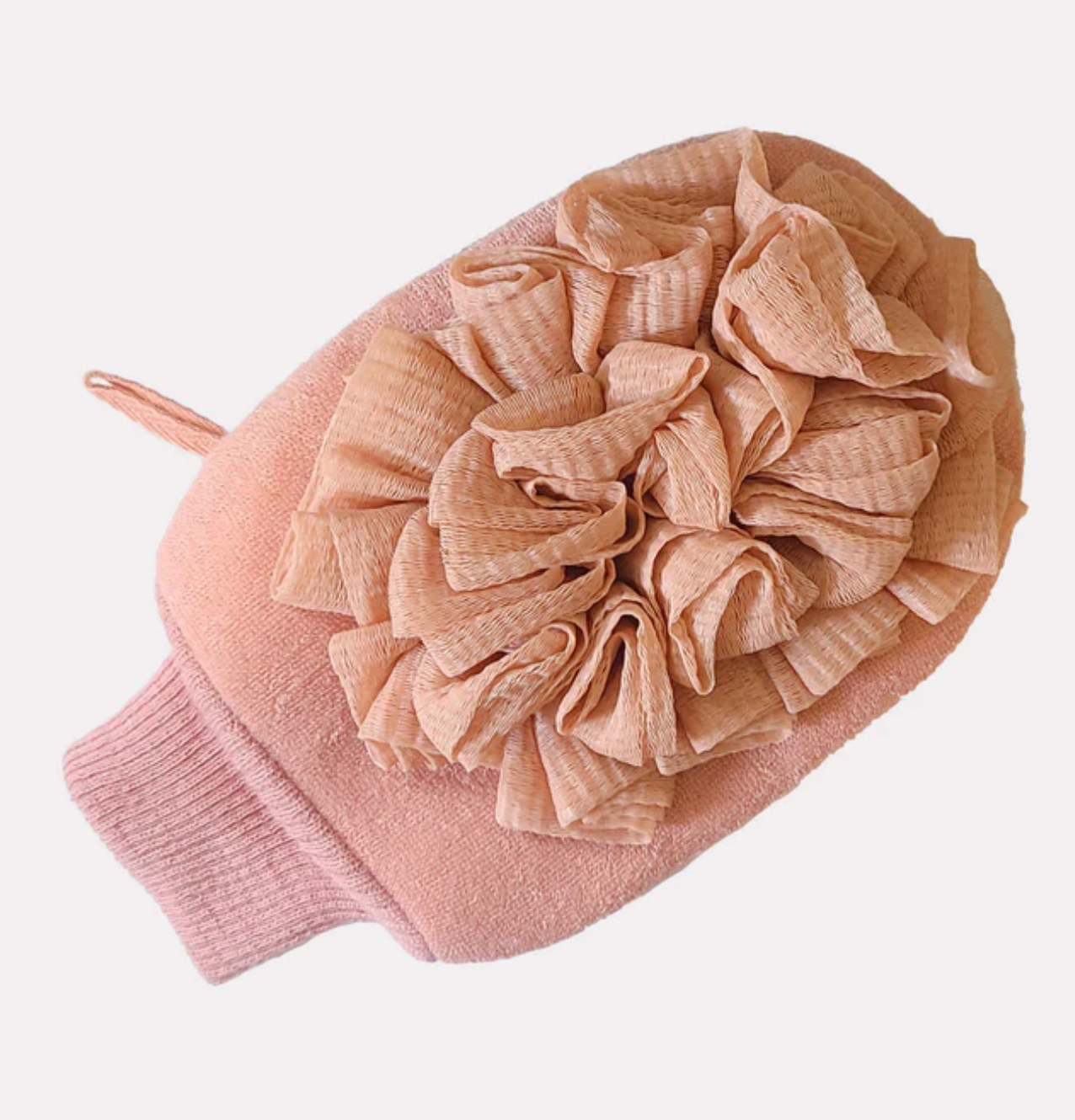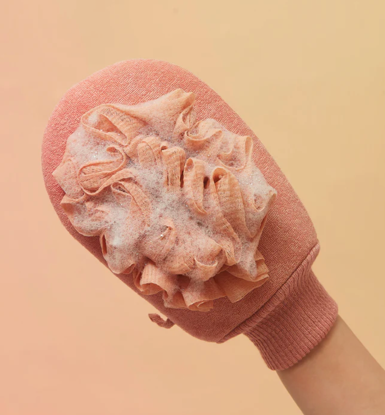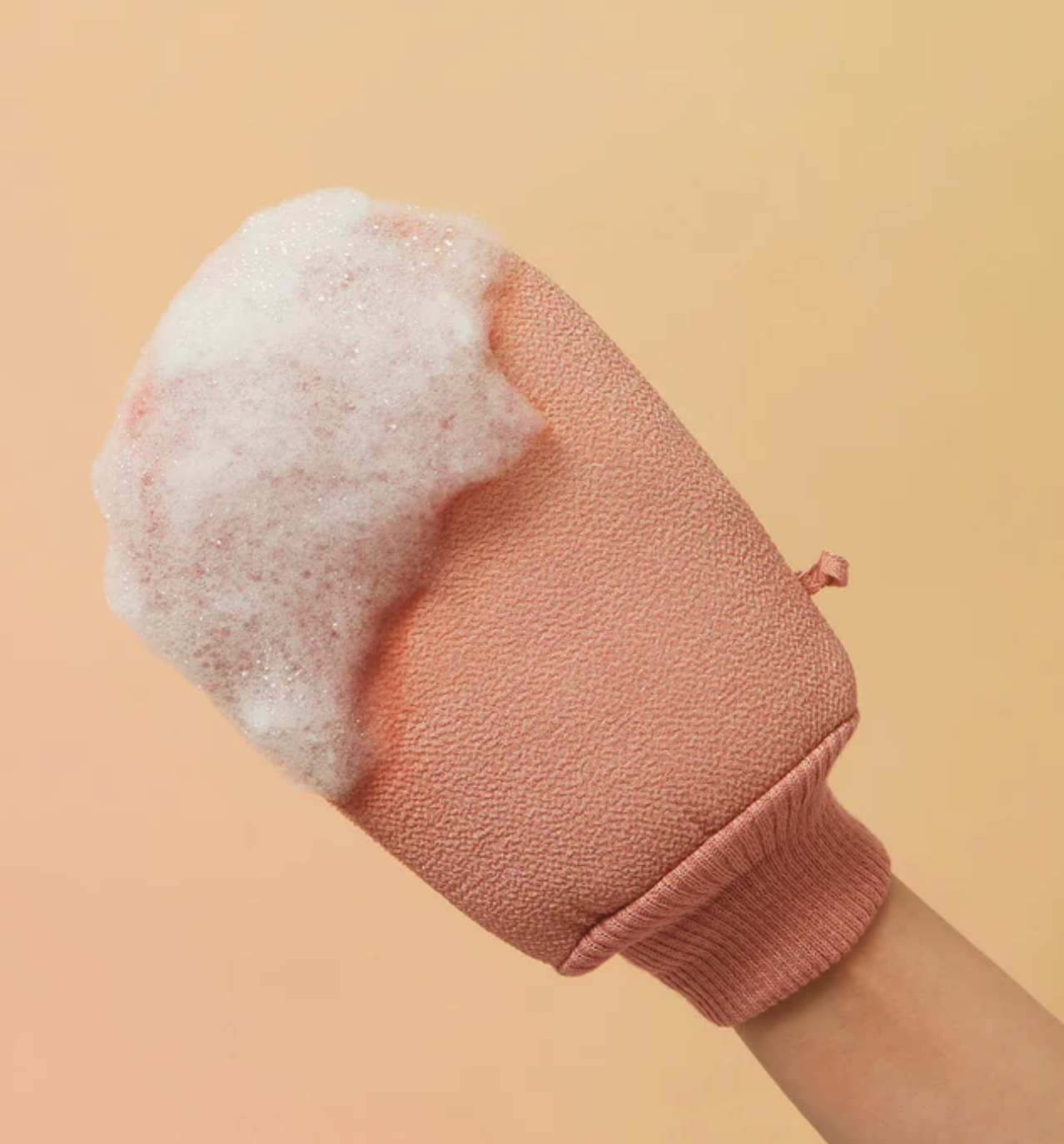 While you’re in the shower, wet the glove in lukewarm water. Apply soap + gently massage the skin using long and mild strokes. Rinse with water and hang to dry when done.