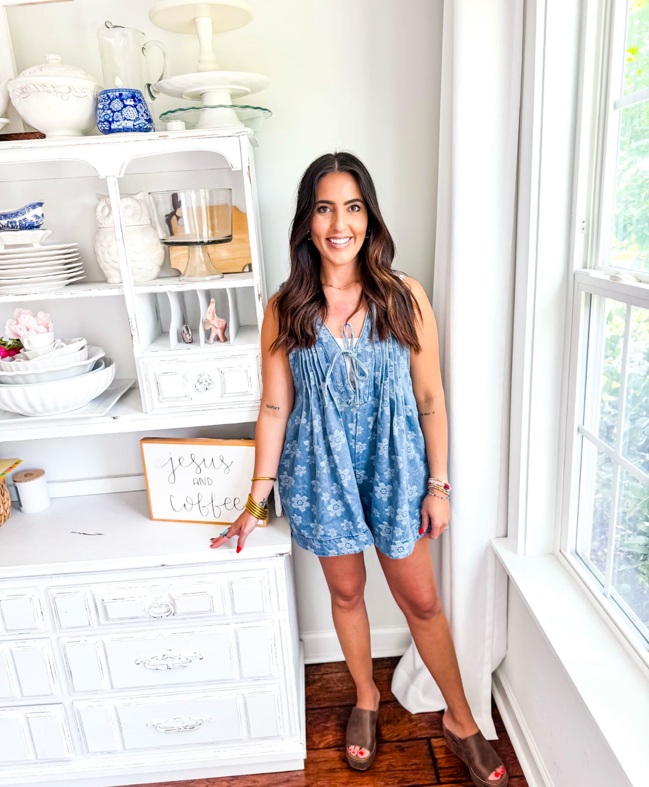-Printed -Washed denim -Deep v-neck with string tie -Pleated detail back -Sleeveless -Side pocket -Mini length -Imported Handwash Cold 100% Cotton Model is 5'10" and wearing a size Small.