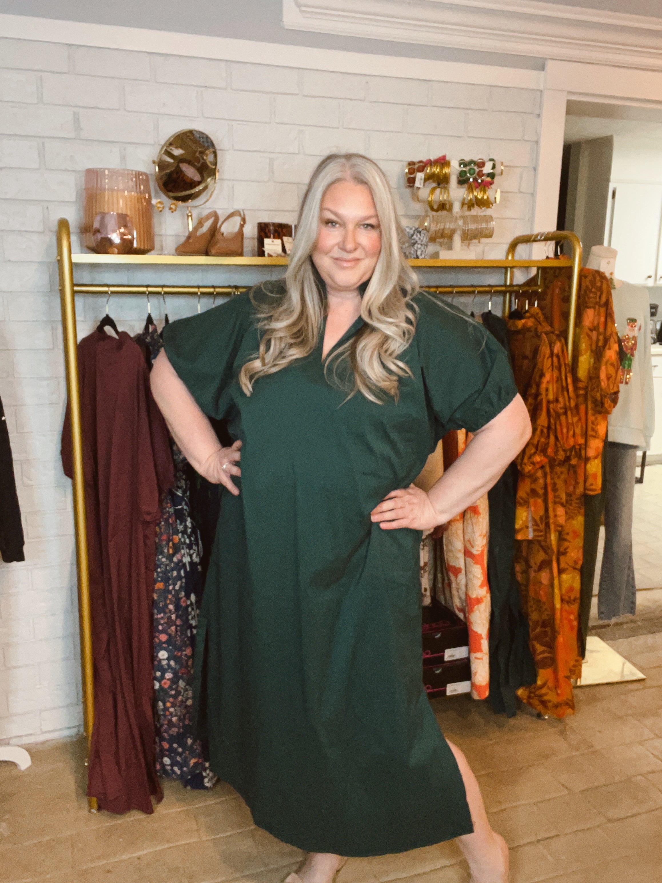 Solid short puff sleeve midi dress featuring band collar with V-neckline. Elasticated sleeve opening. Side pockets. Side slits. Lined. Woven. Non-sheer. Lightweight.