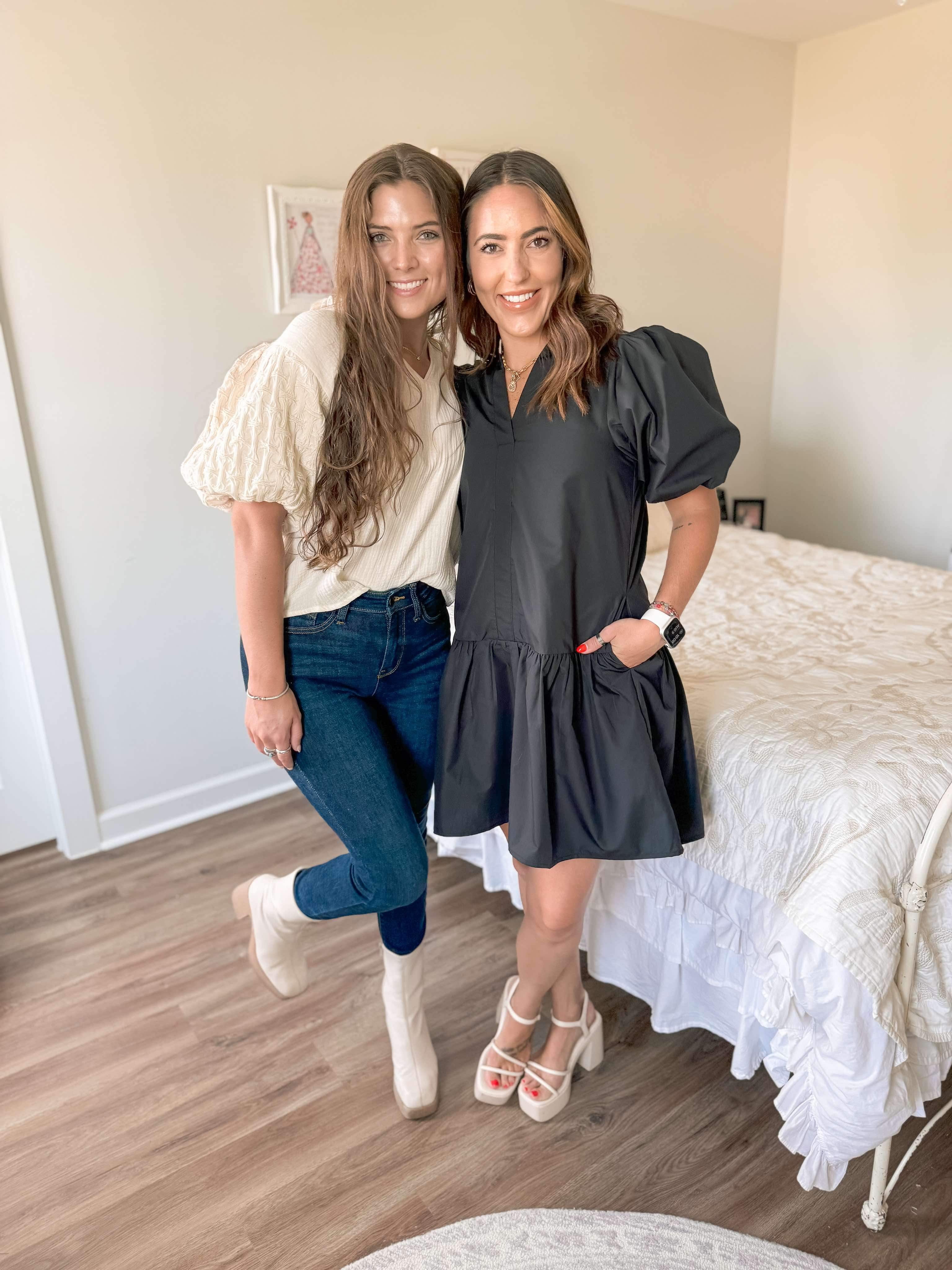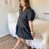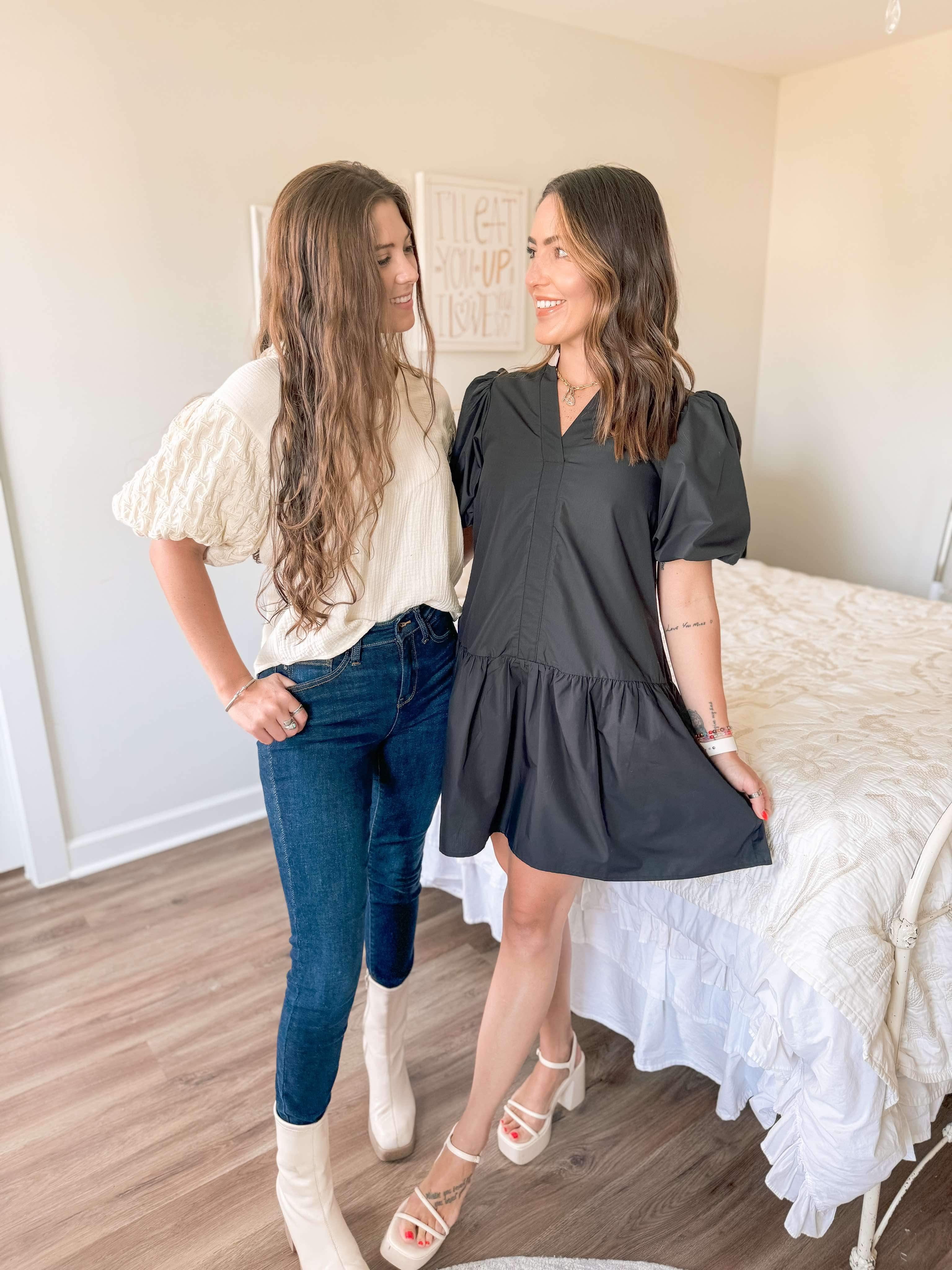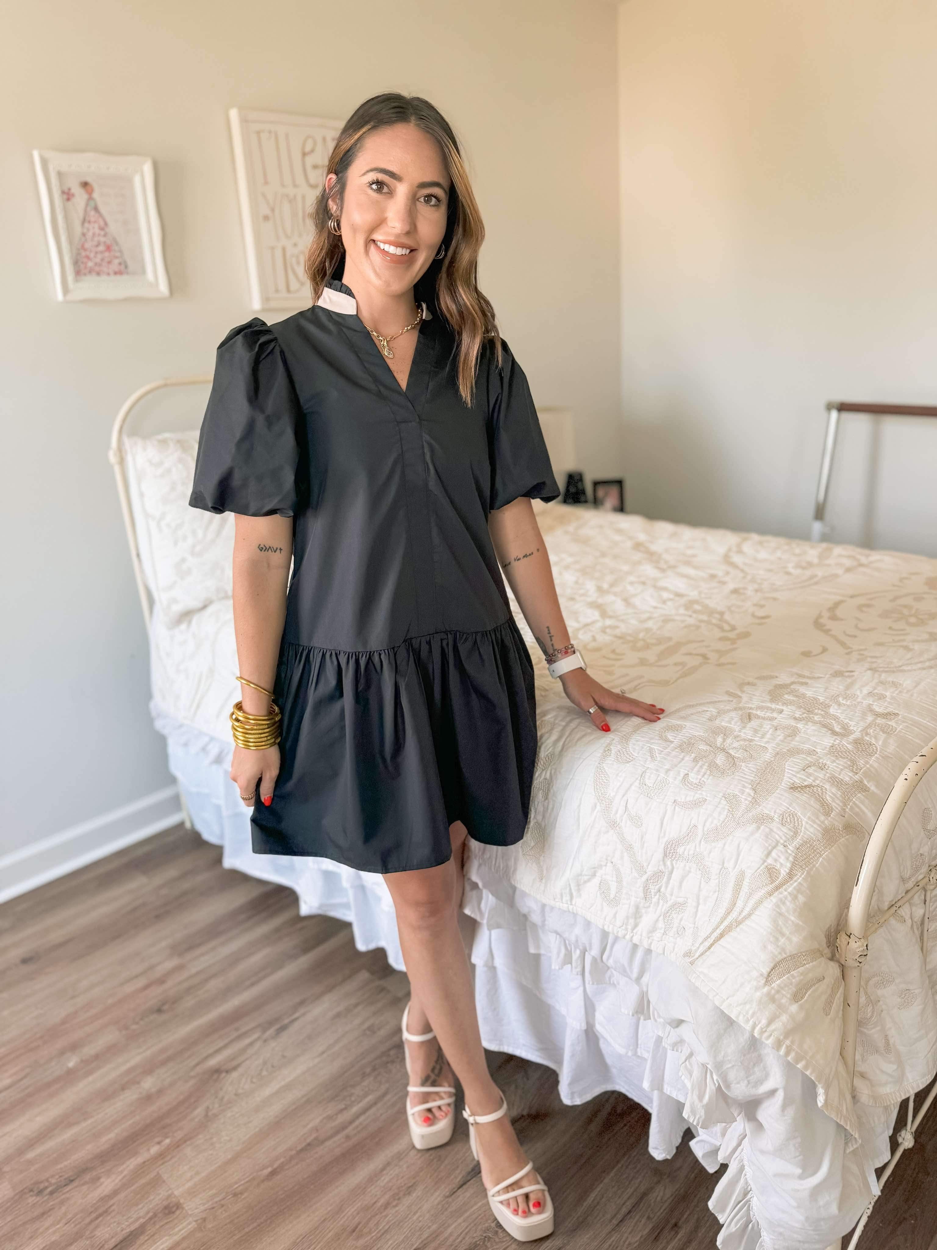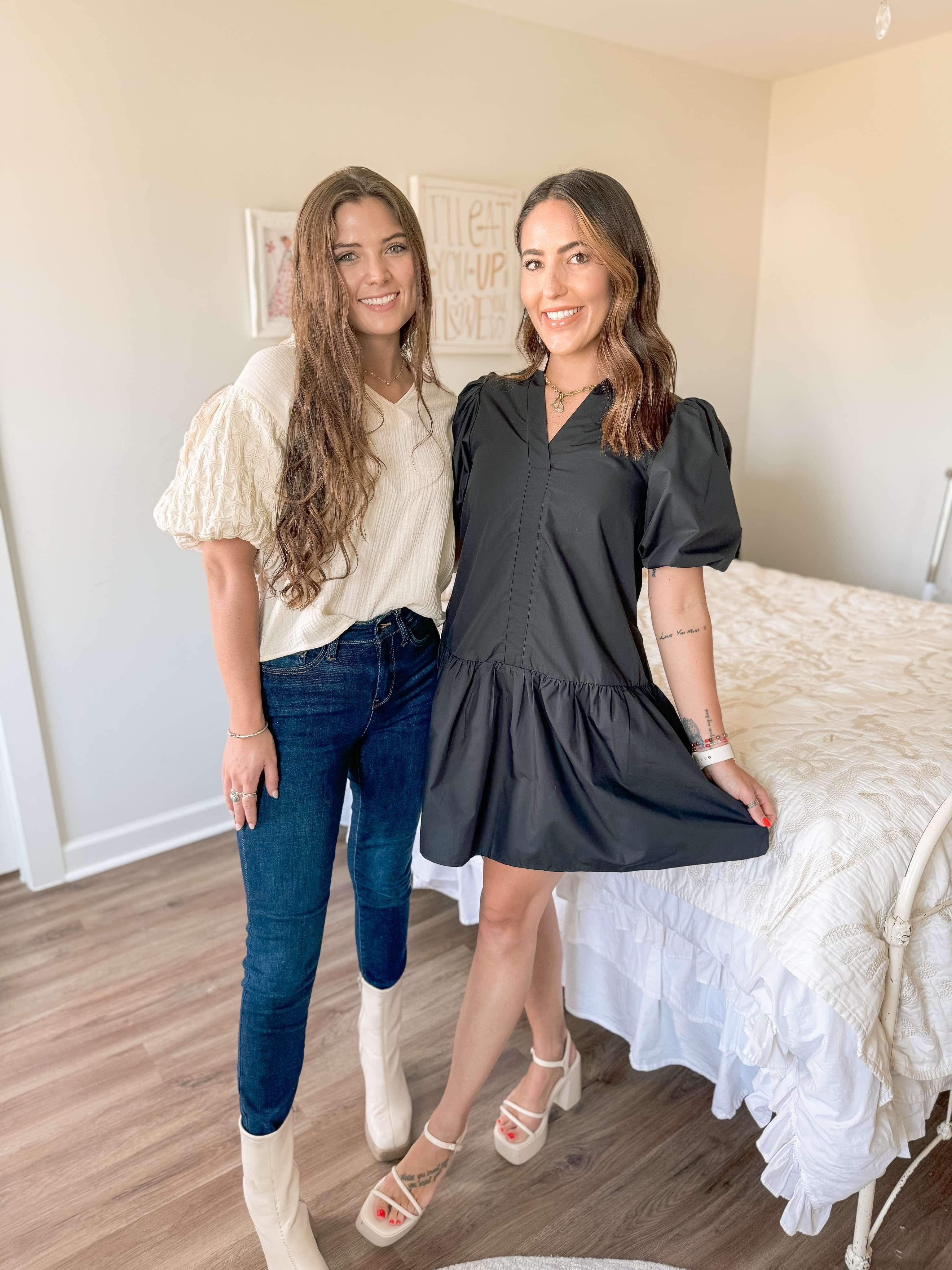 Introducing our Fall Impressions Dress in Black! We are loving her for any and all reasons! She has the cutest drop hem at the bottom to give her a little flirty flow! She also features poof sleeves - y’all know we are DEFINITELY here for that feature. She features a collar with a taupe contrast on it - just to give it a little flare - break up the black a little. This would pair so nicely with a pair of taupe boots - thigh high or booties! Cowgirl boots as well would pair nicely with her. Think of all the fun Fall activities you can sport her - whether you’re going to work, date night, or an event that is a little more casual.