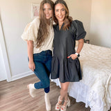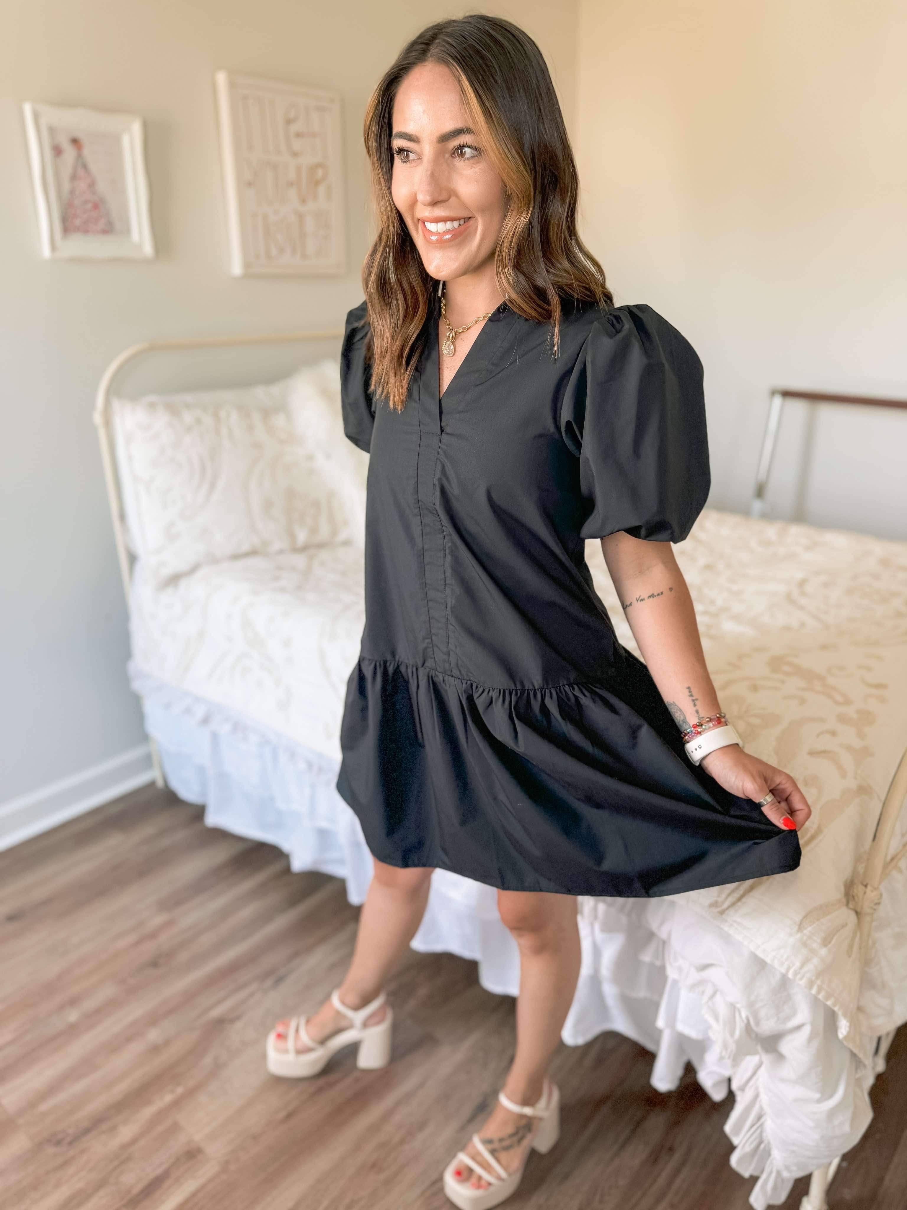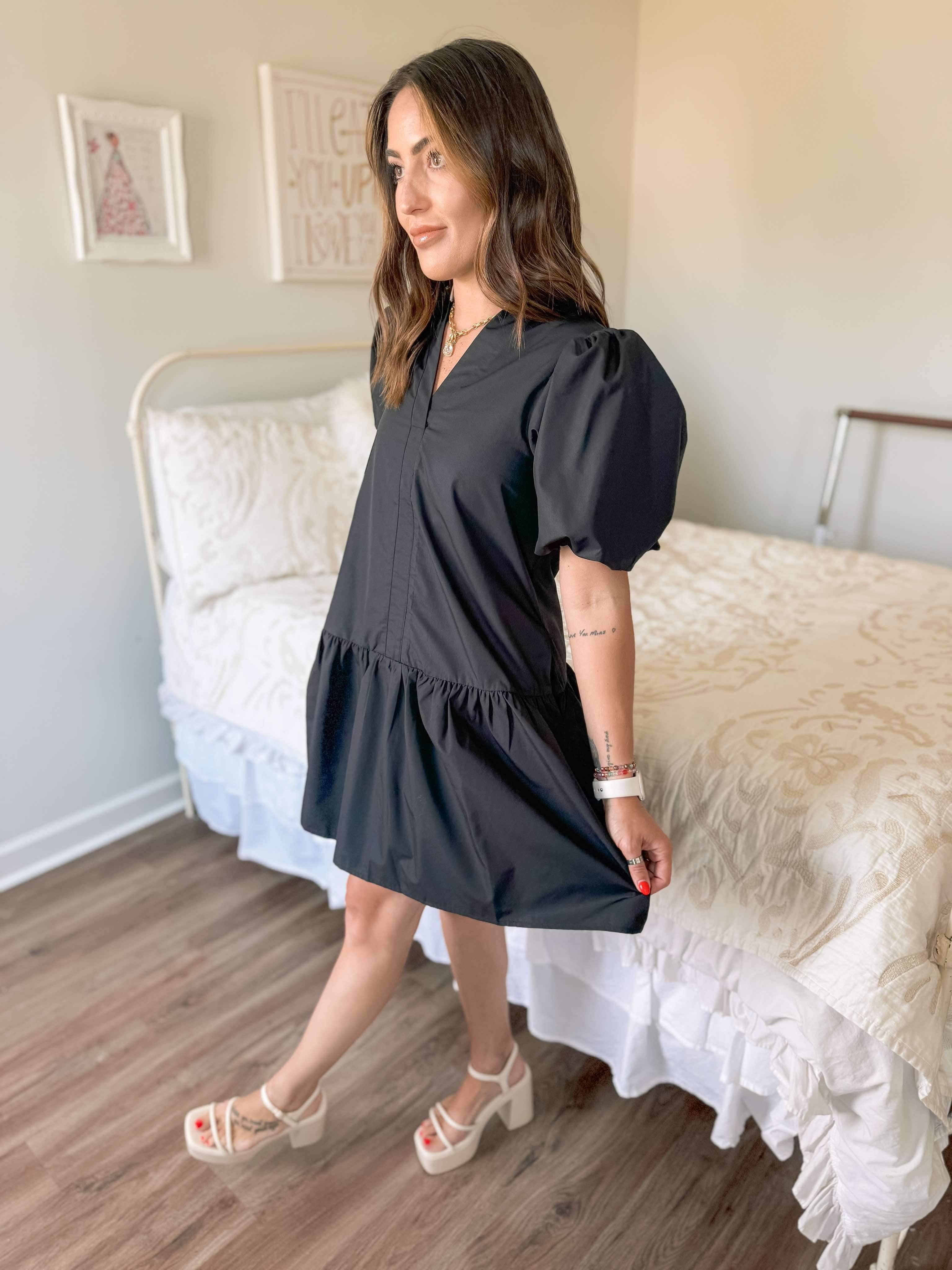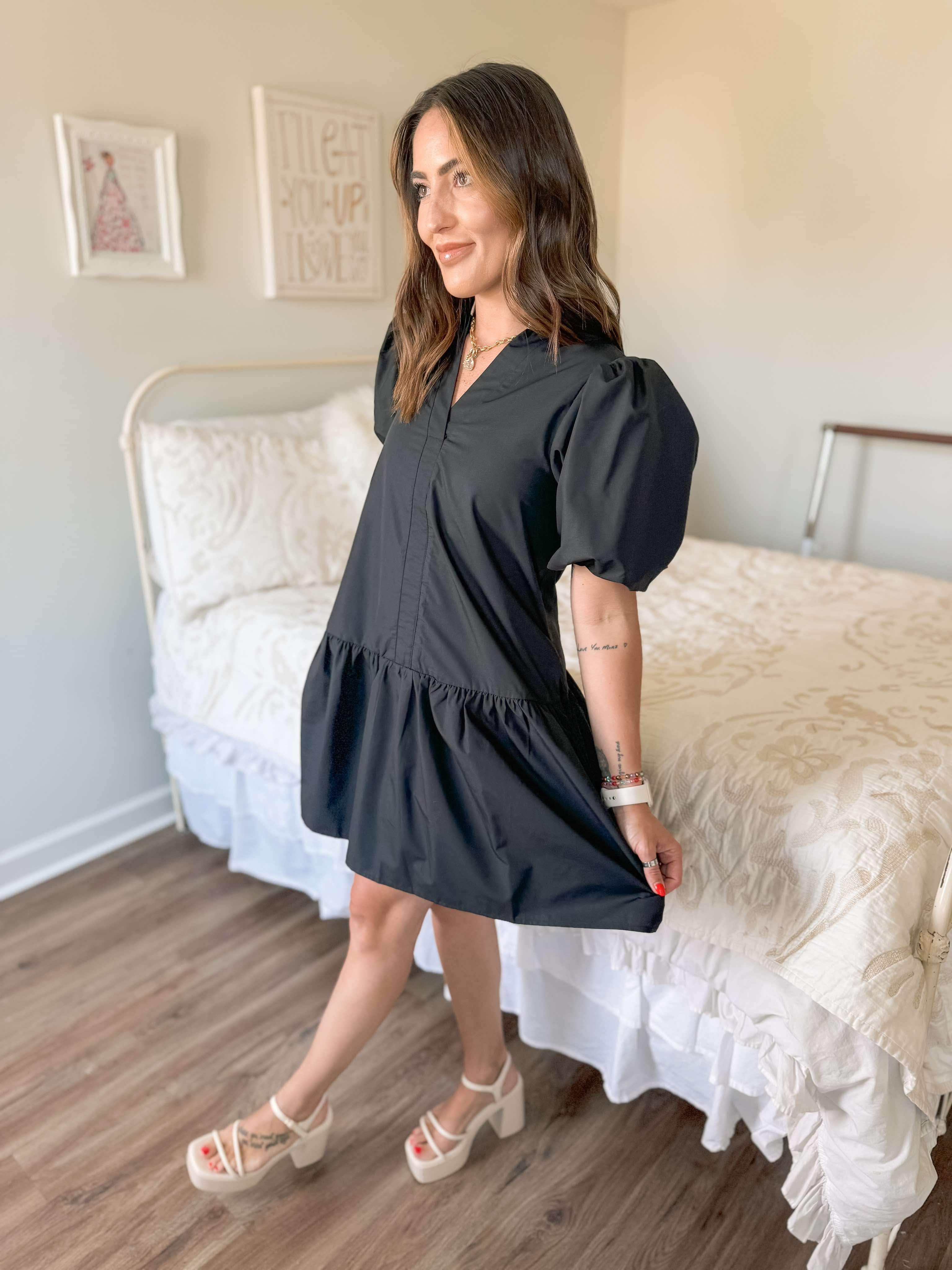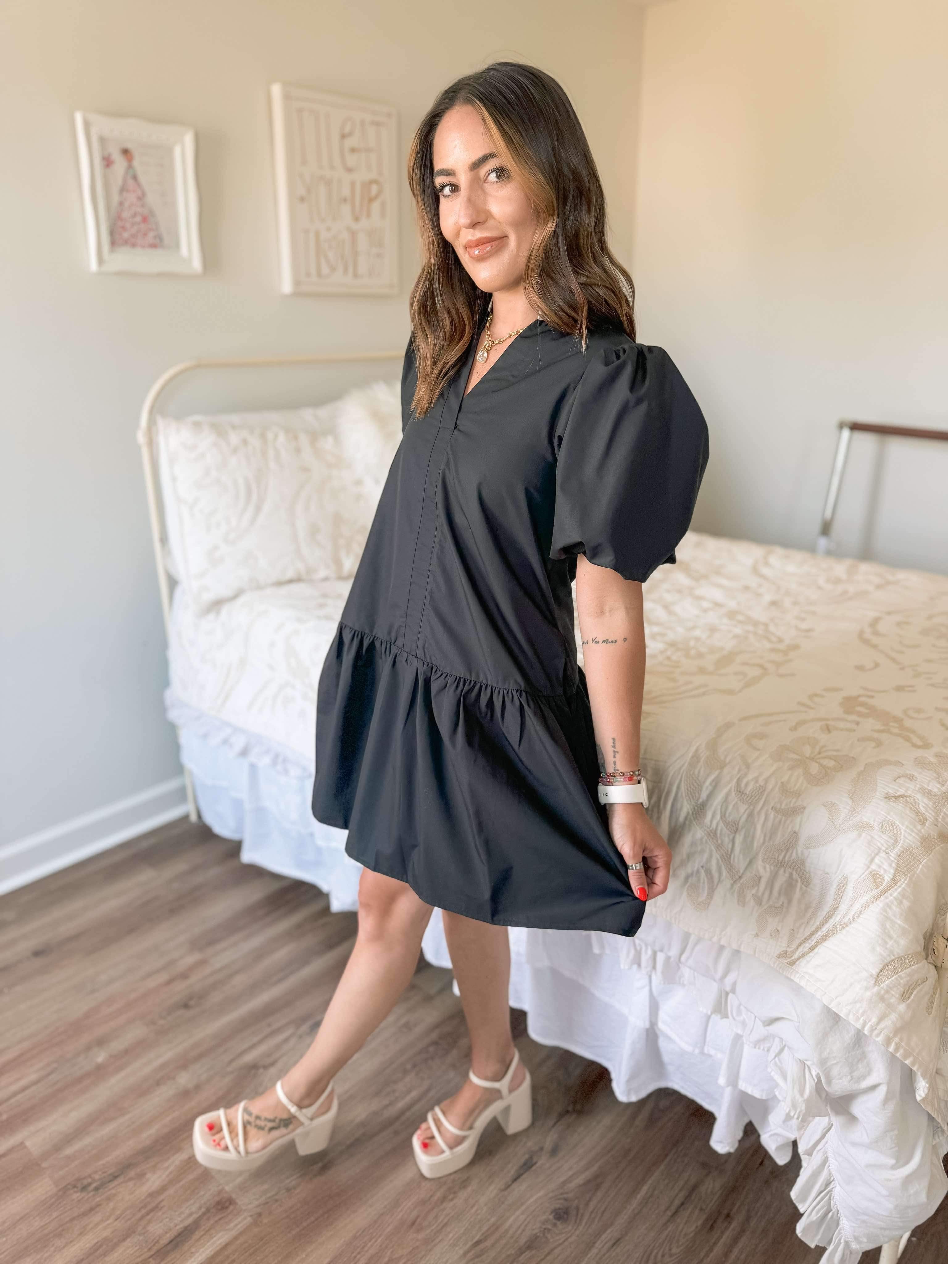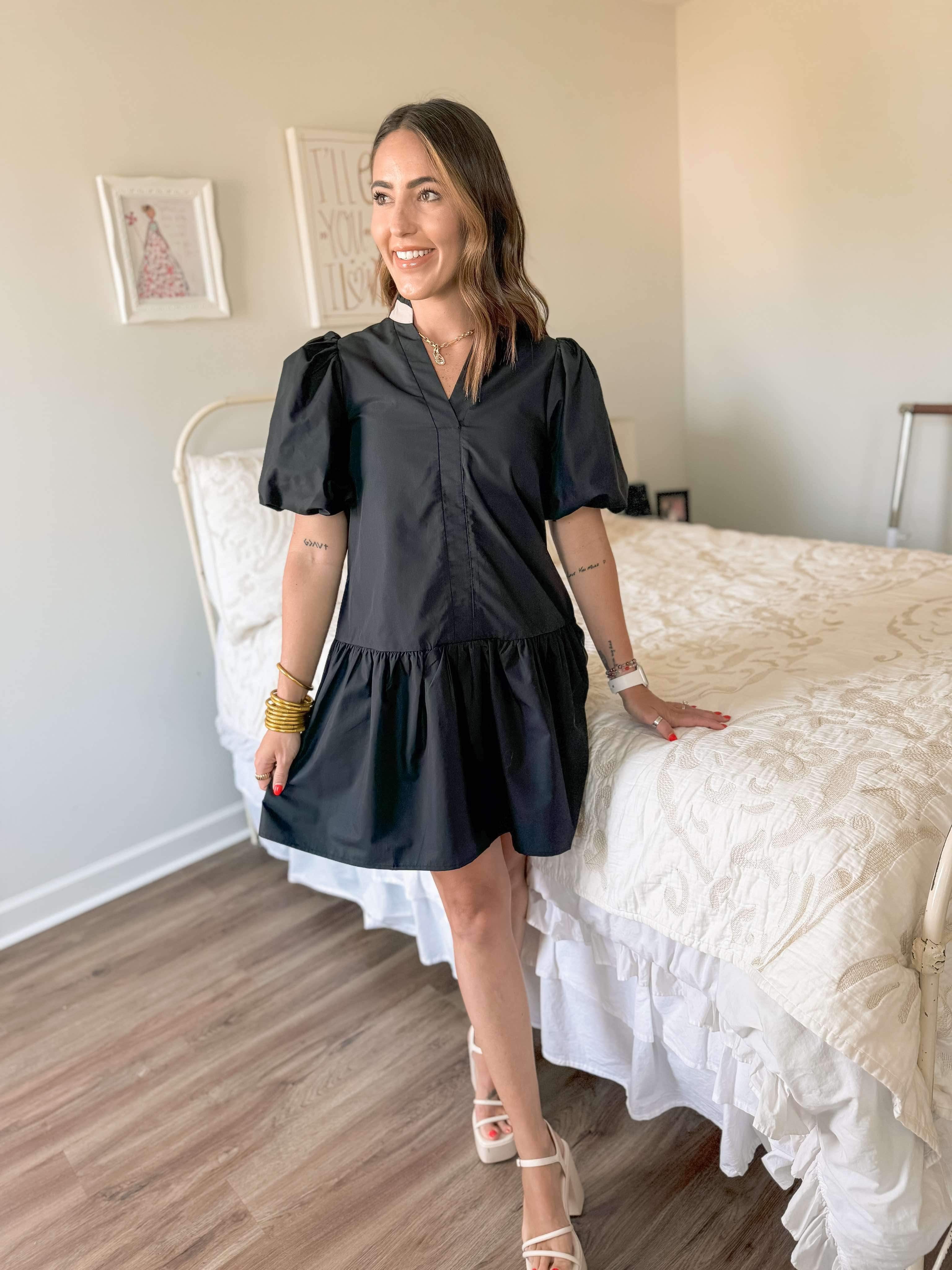 Introducing our Fall Impressions Dress in Black! We are loving her for any and all reasons! She has the cutest drop hem at the bottom to give her a little flirty flow! She also features poof sleeves - y’all know we are DEFINITELY here for that feature. She features a collar with a taupe contrast on it - just to give it a little flare - break up the black a little. This would pair so nicely with a pair of taupe boots - thigh high or booties! Cowgirl boots as well would pair nicely with her. Think of all the fun Fall activities you can sport her - whether you’re going to work, date night, or an event that is a little more casual.