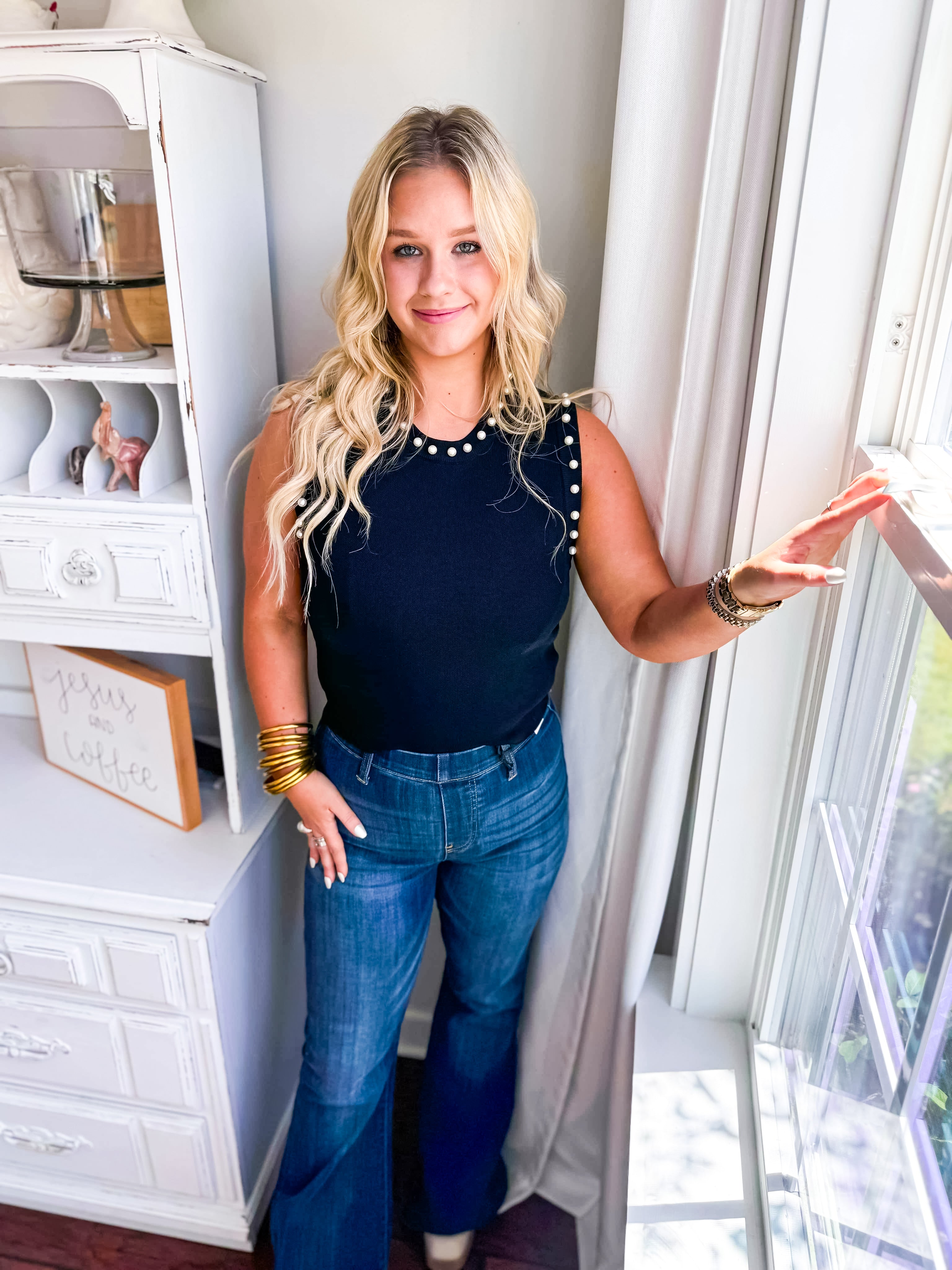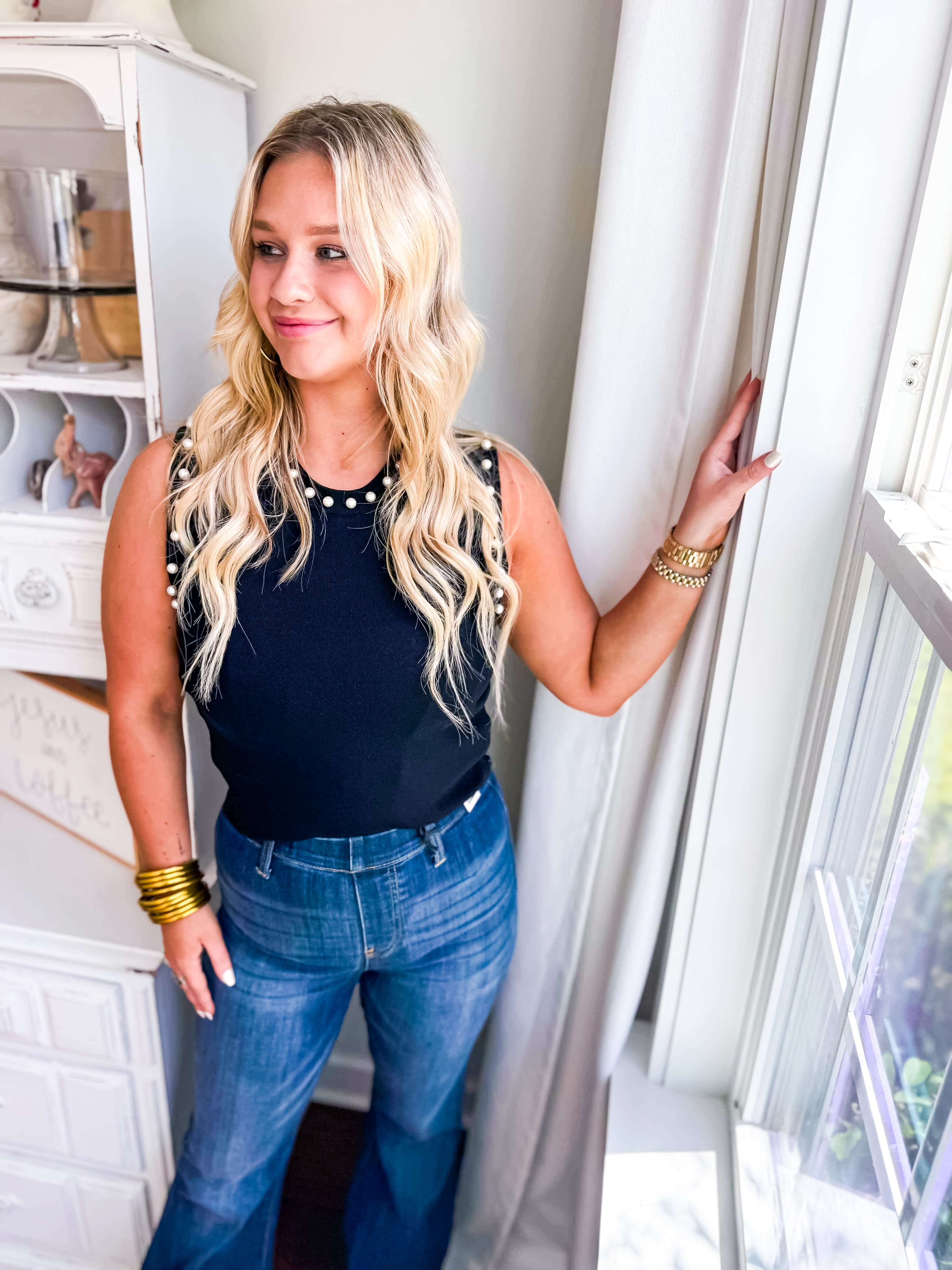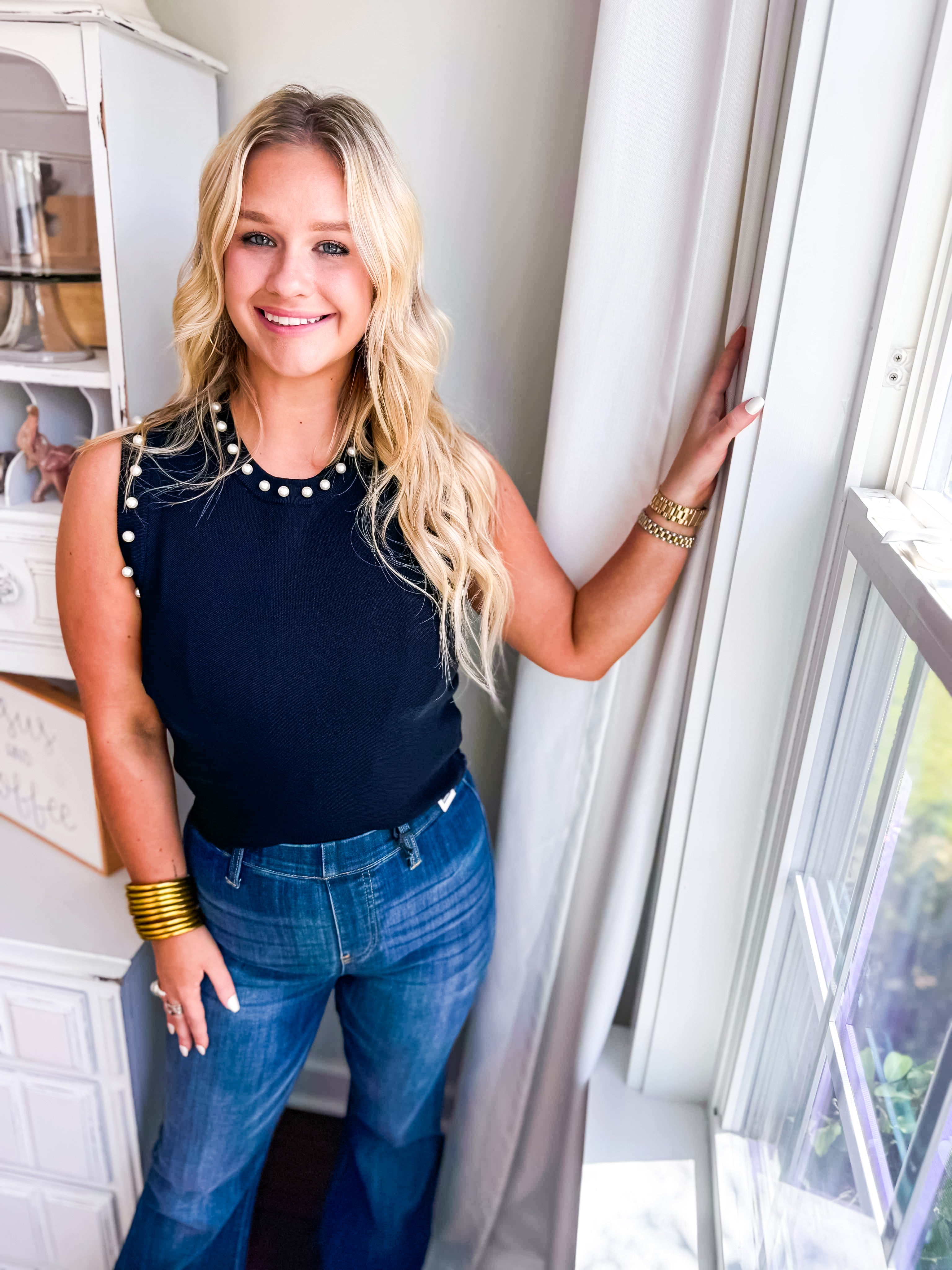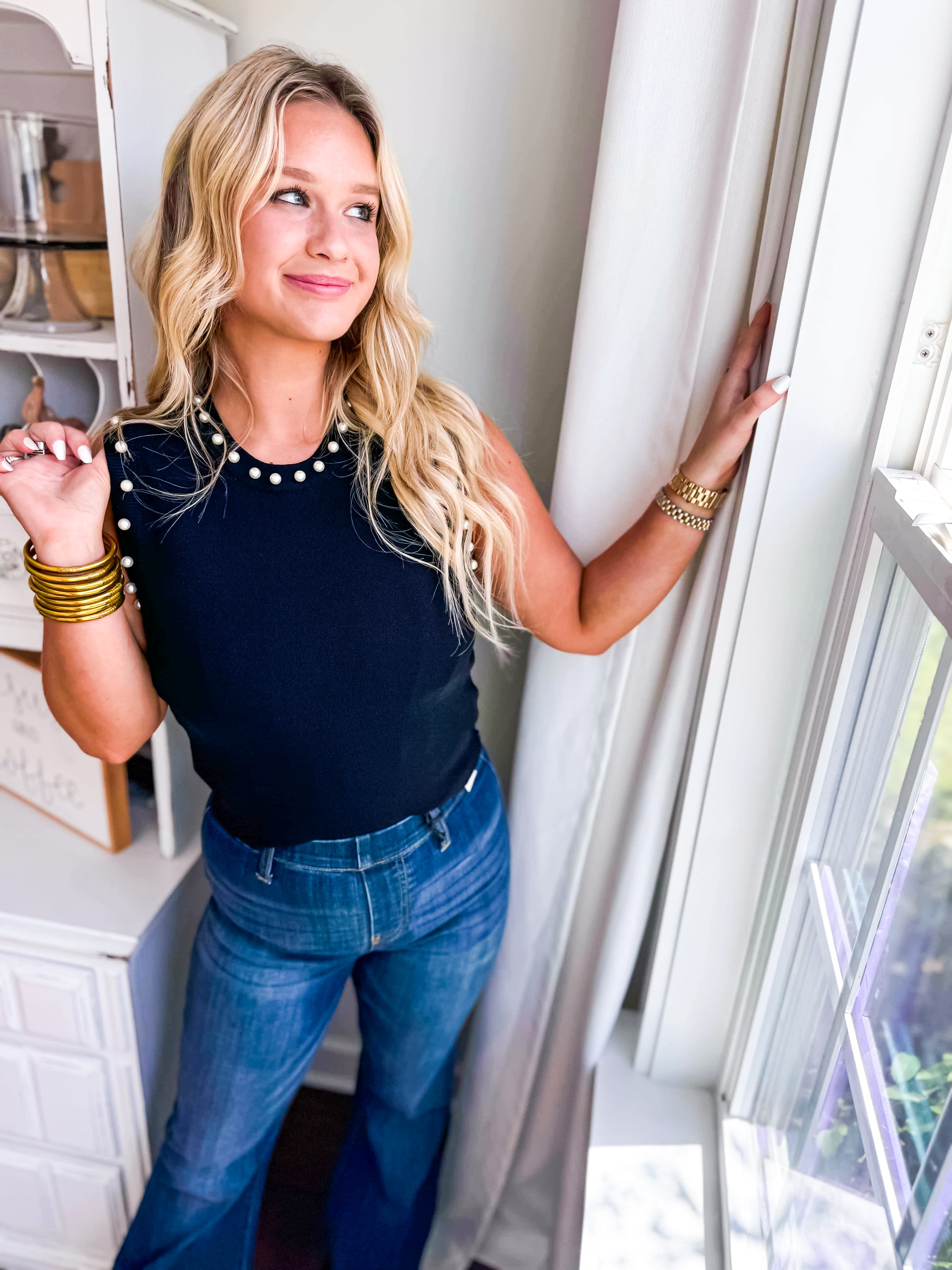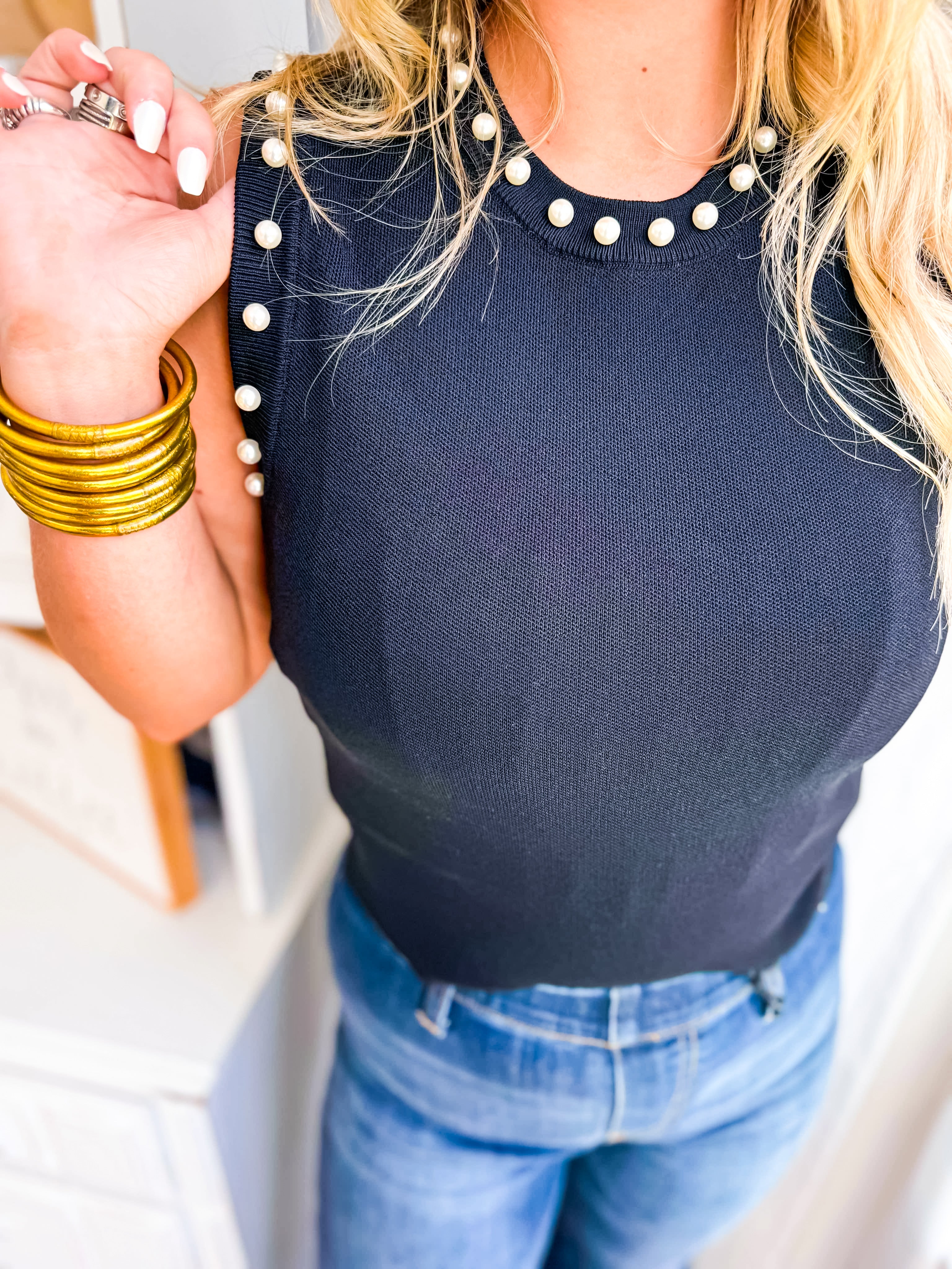 Solid round neck sleeveless cropped top featuring pearl detail.