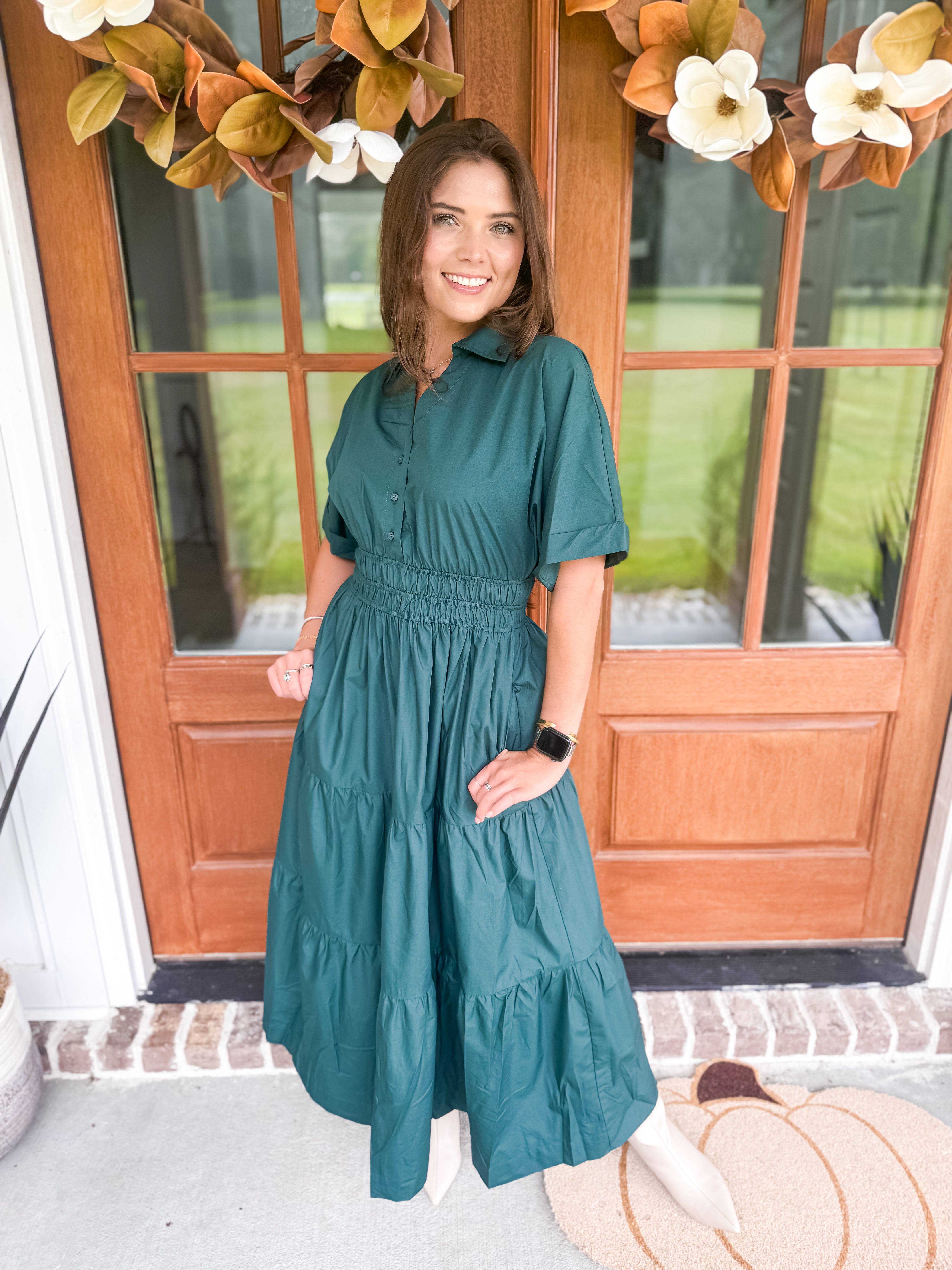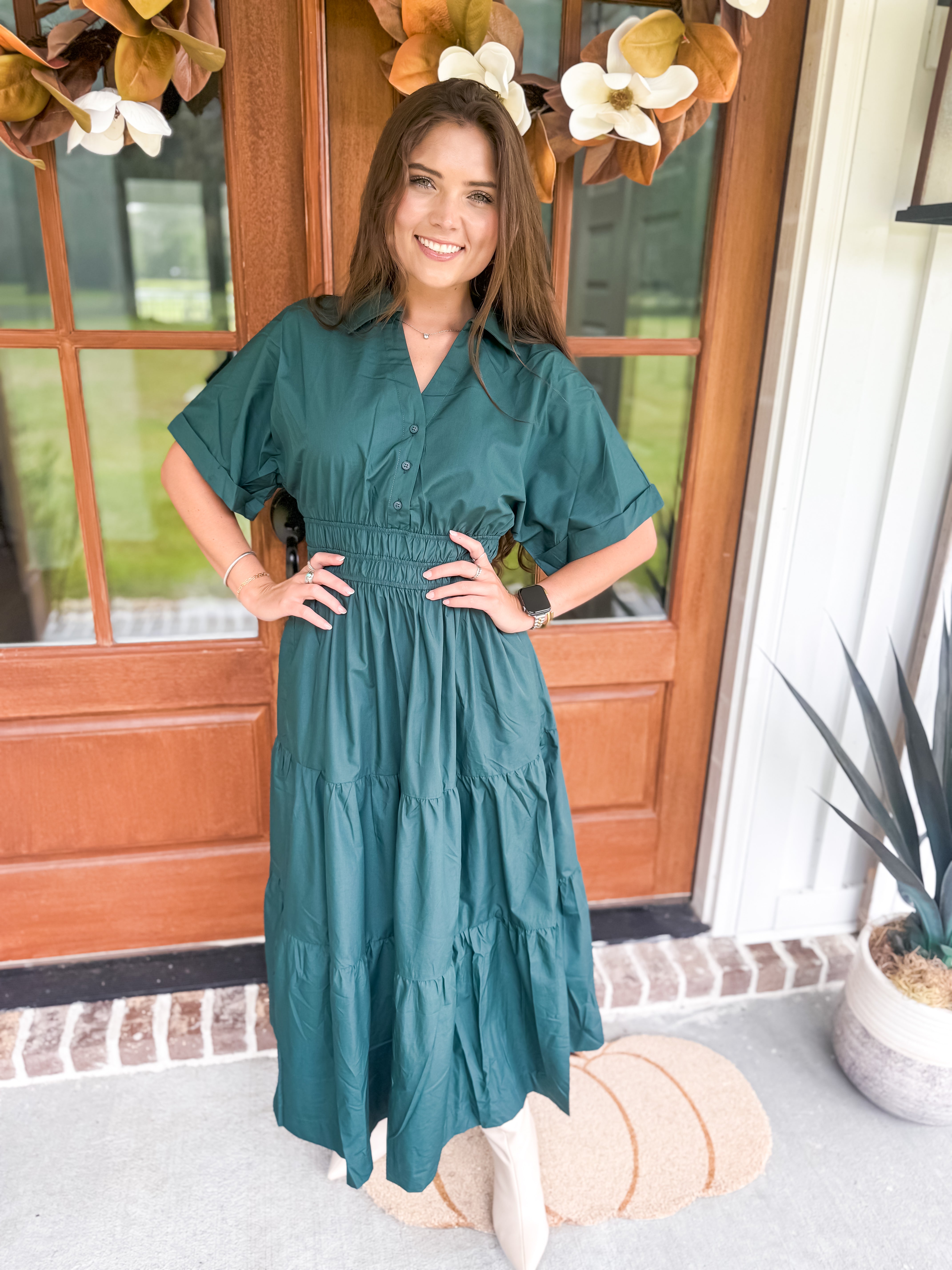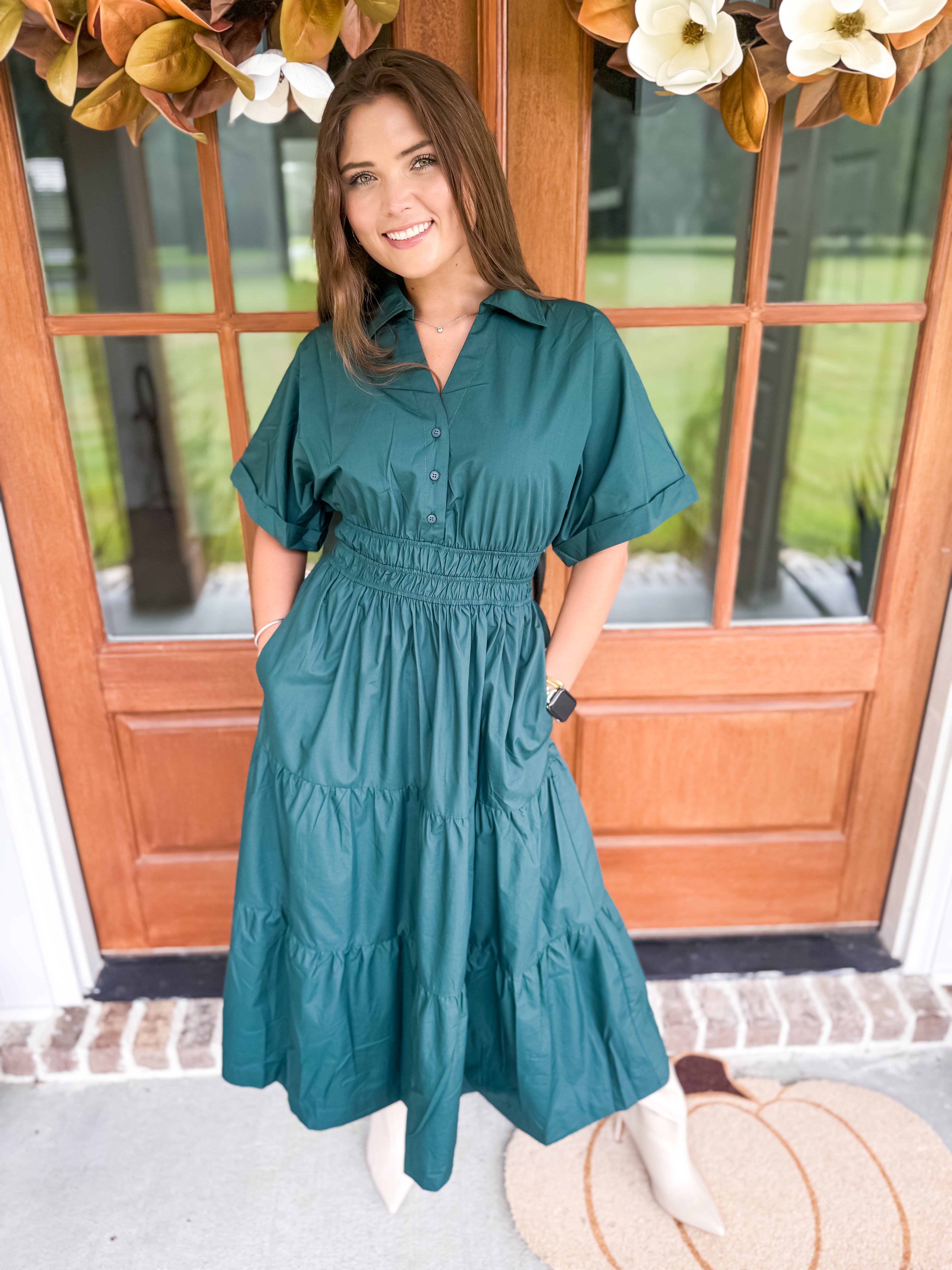 Chic and versatile, this short sleeve collared tiered midi dress boasts button-up detailing at the bust and practical pockets. Lined for a smooth fit, it’s perfect for effortless elegance.