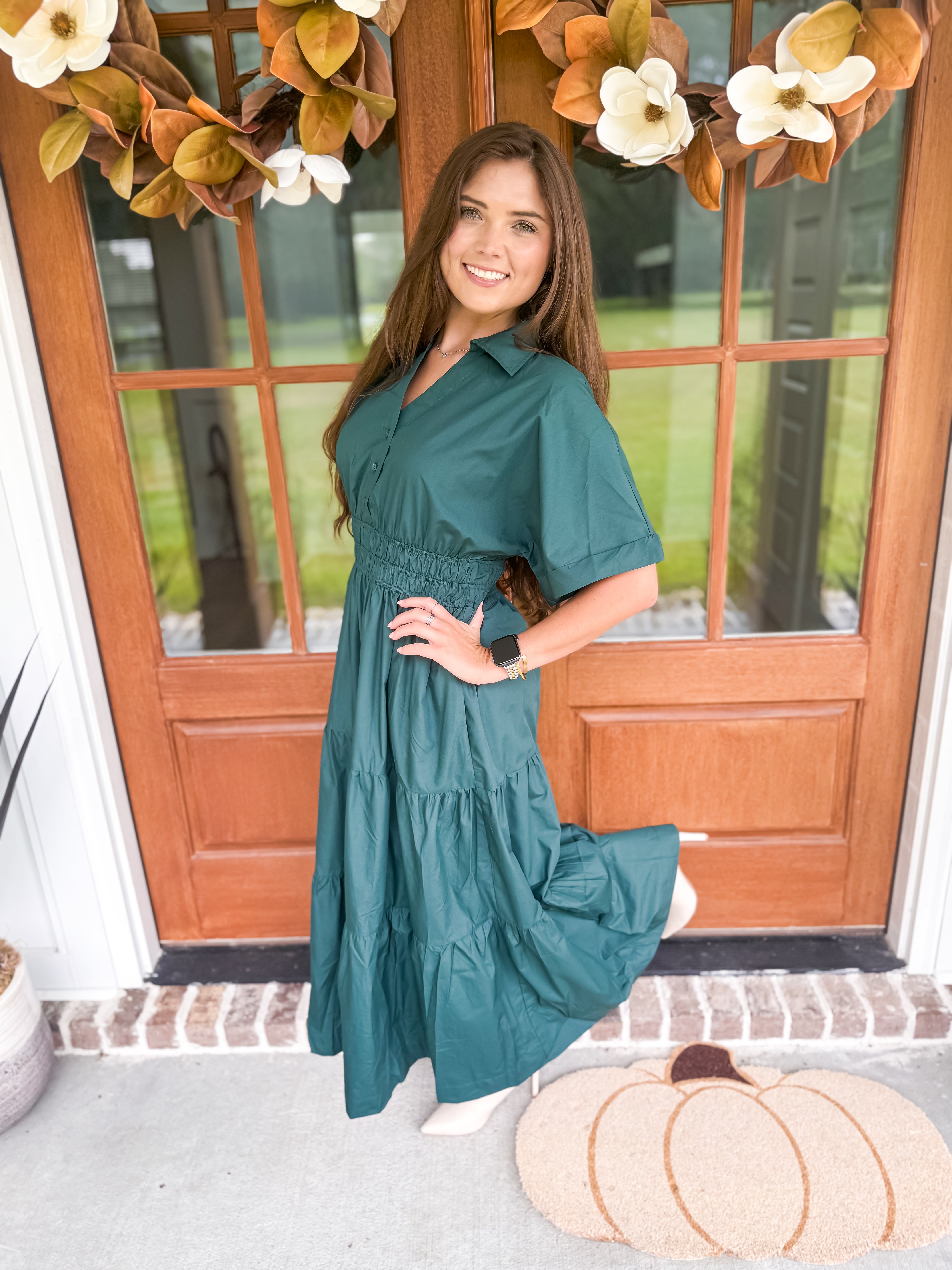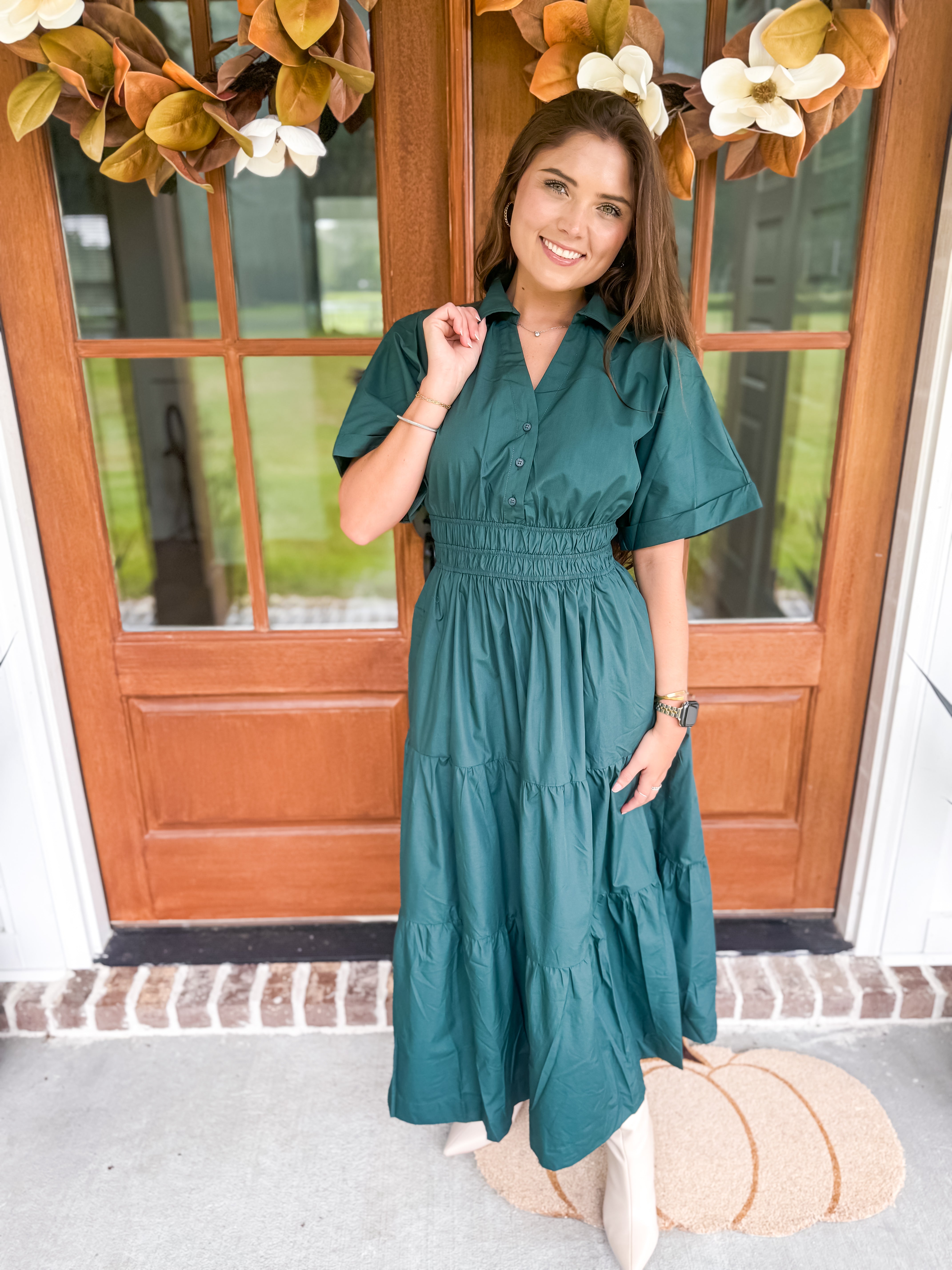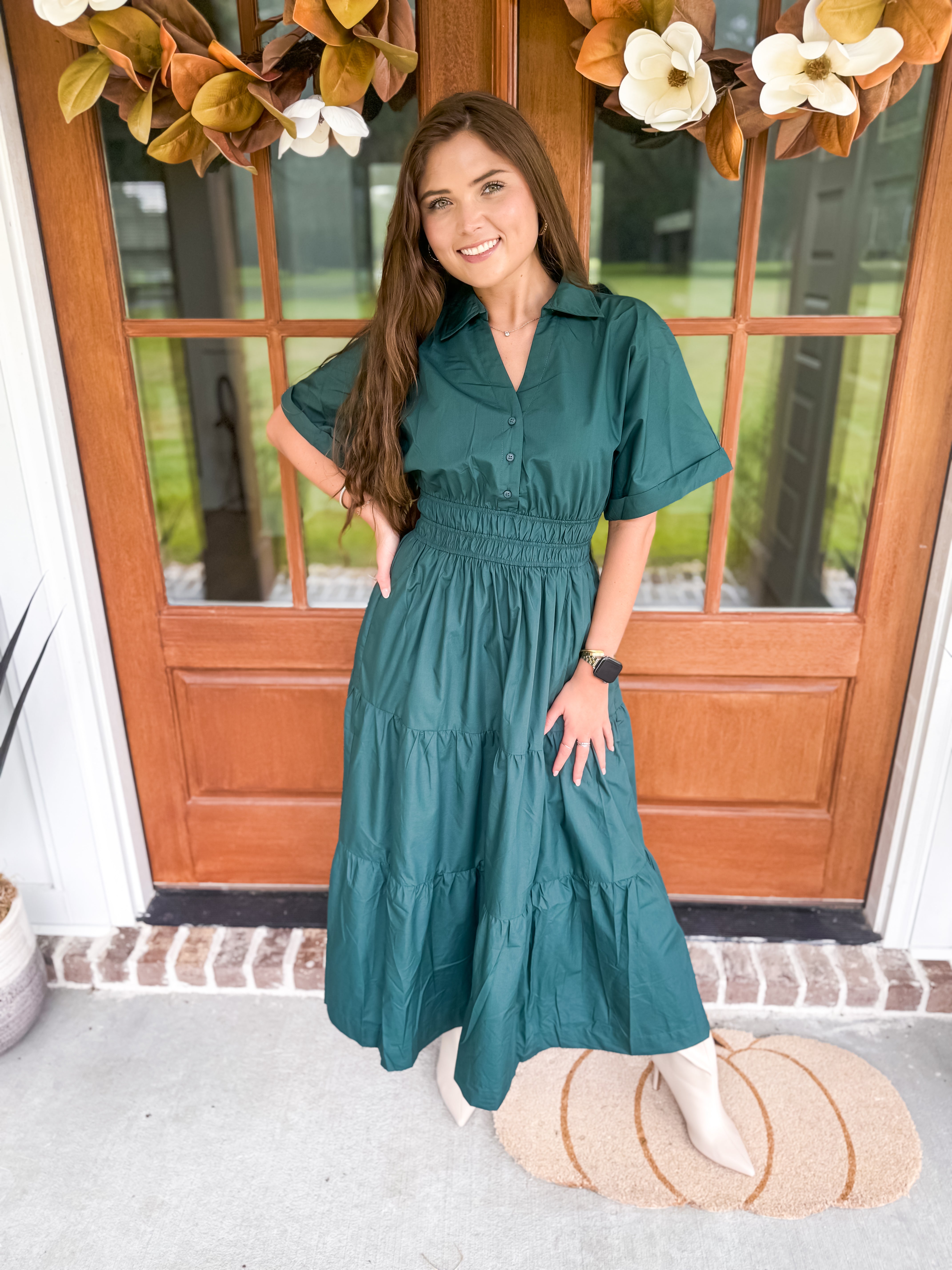 Chic and versatile, this short sleeve collared tiered midi dress boasts button-up detailing at the bust and practical pockets. Lined for a smooth fit, it’s perfect for effortless elegance.
