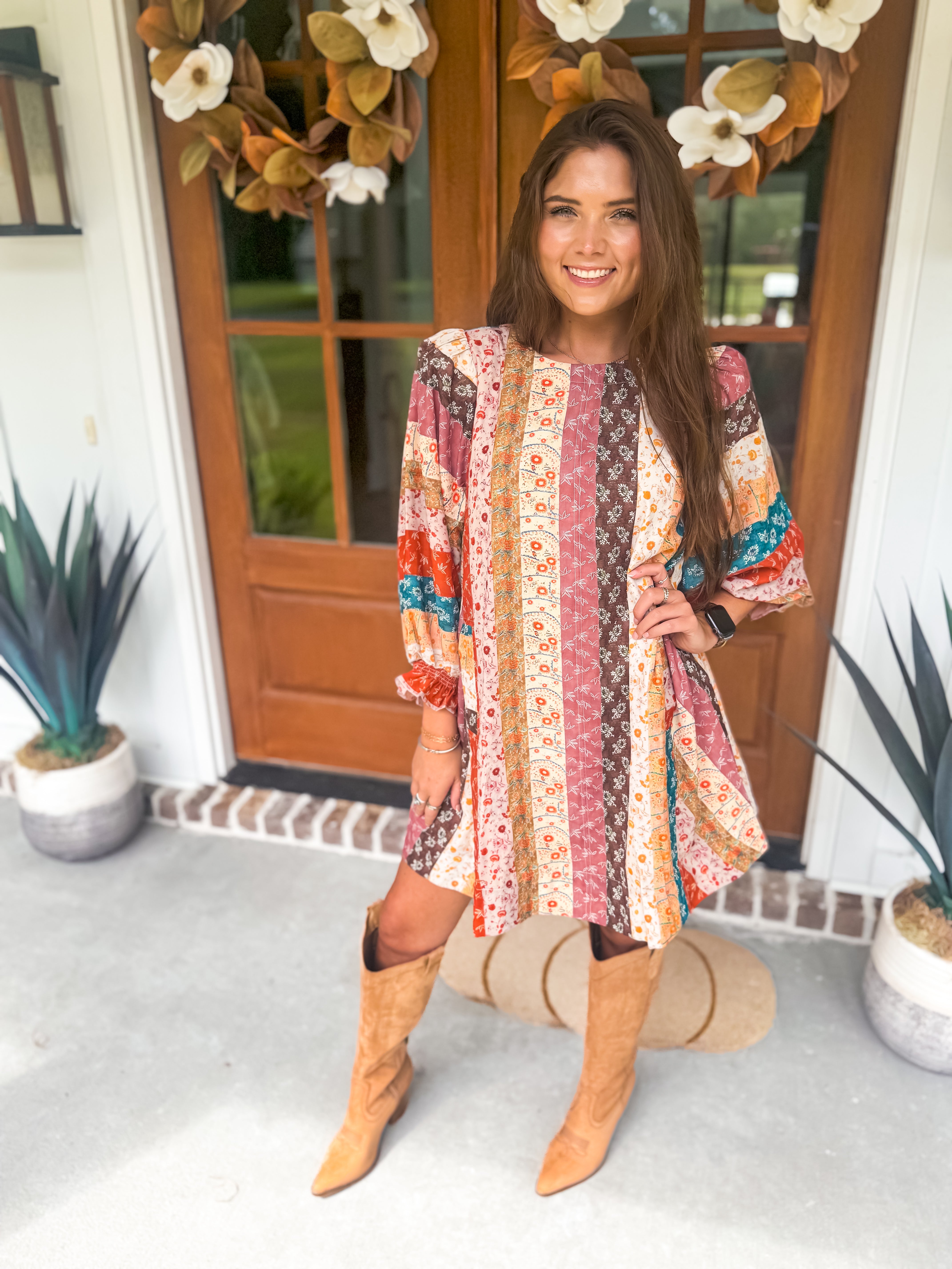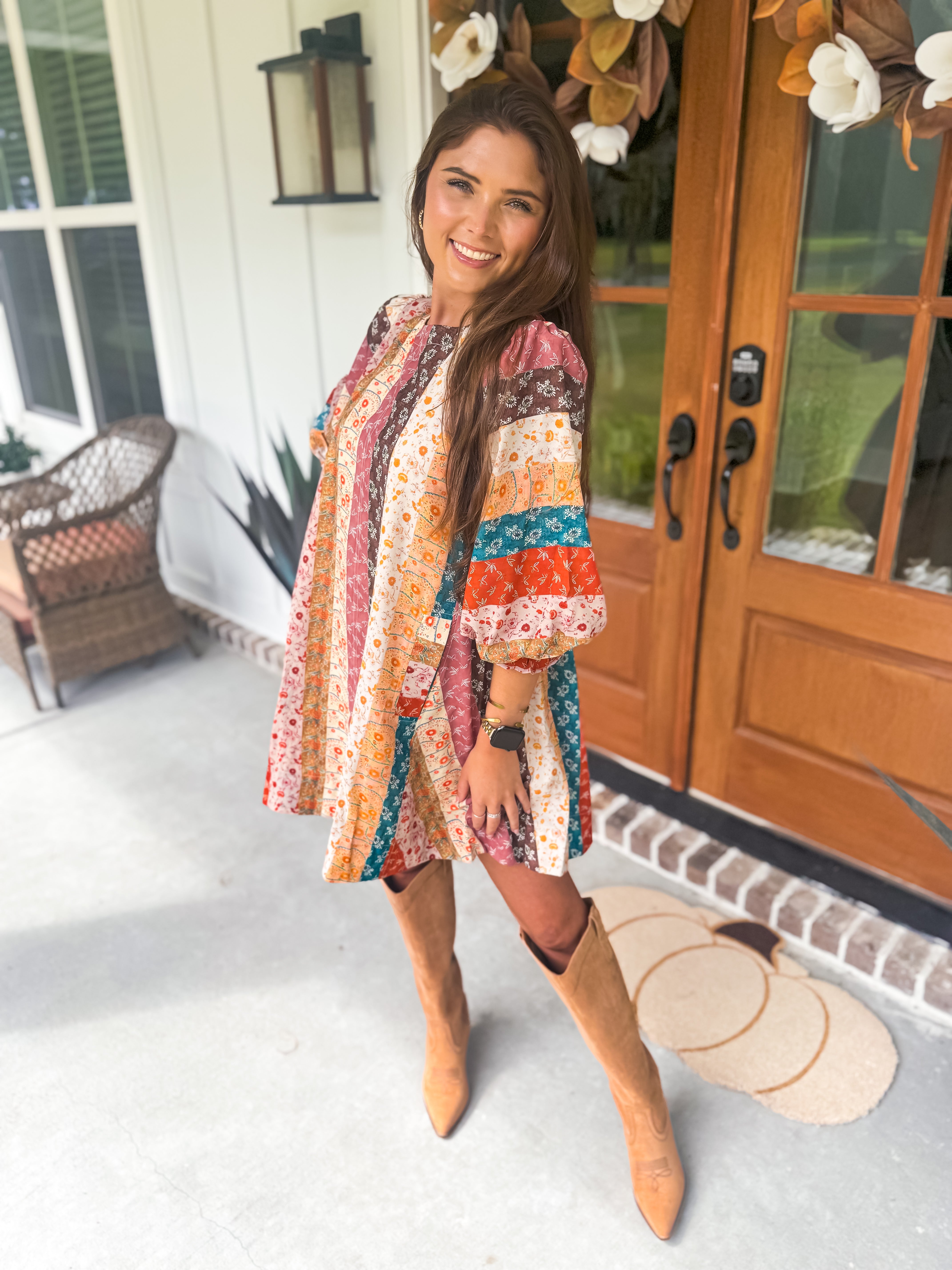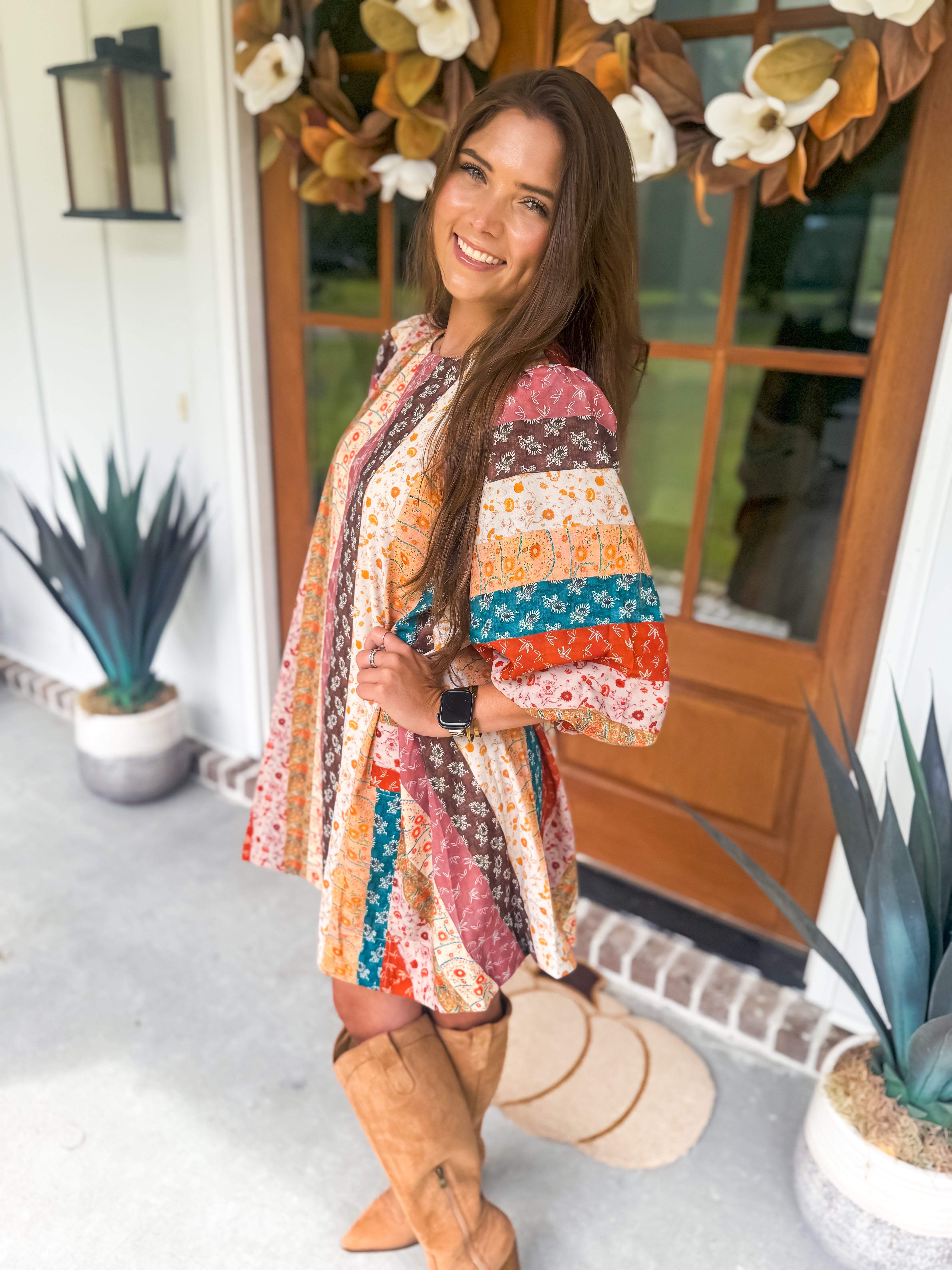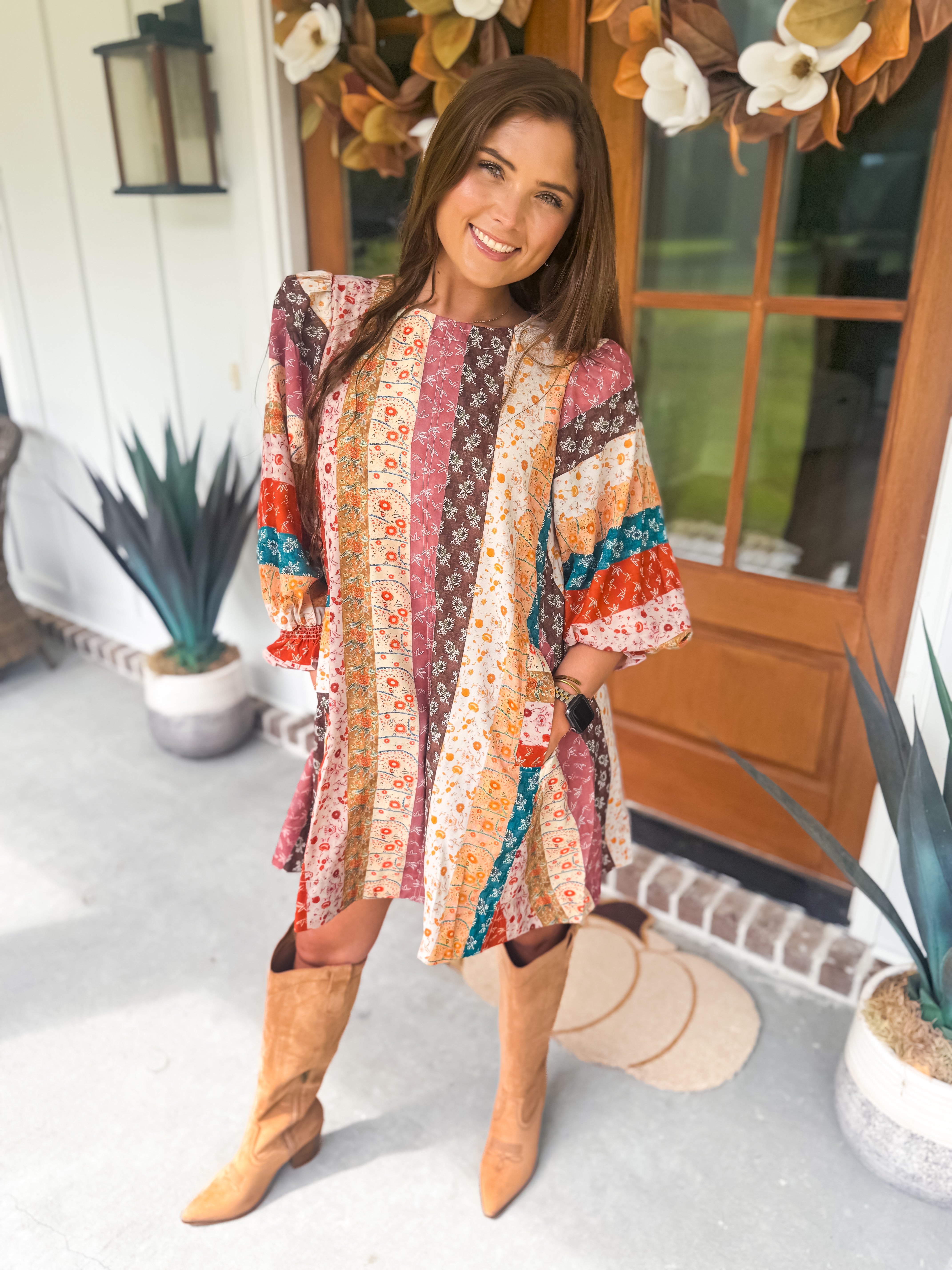 Embrace boho chic with this floral mini dress, showcasing a mix of vibrant patterns and 3/4 sleeves. With handy pockets and a keyhole back closure, it’s a perfect blend of style and practicality.