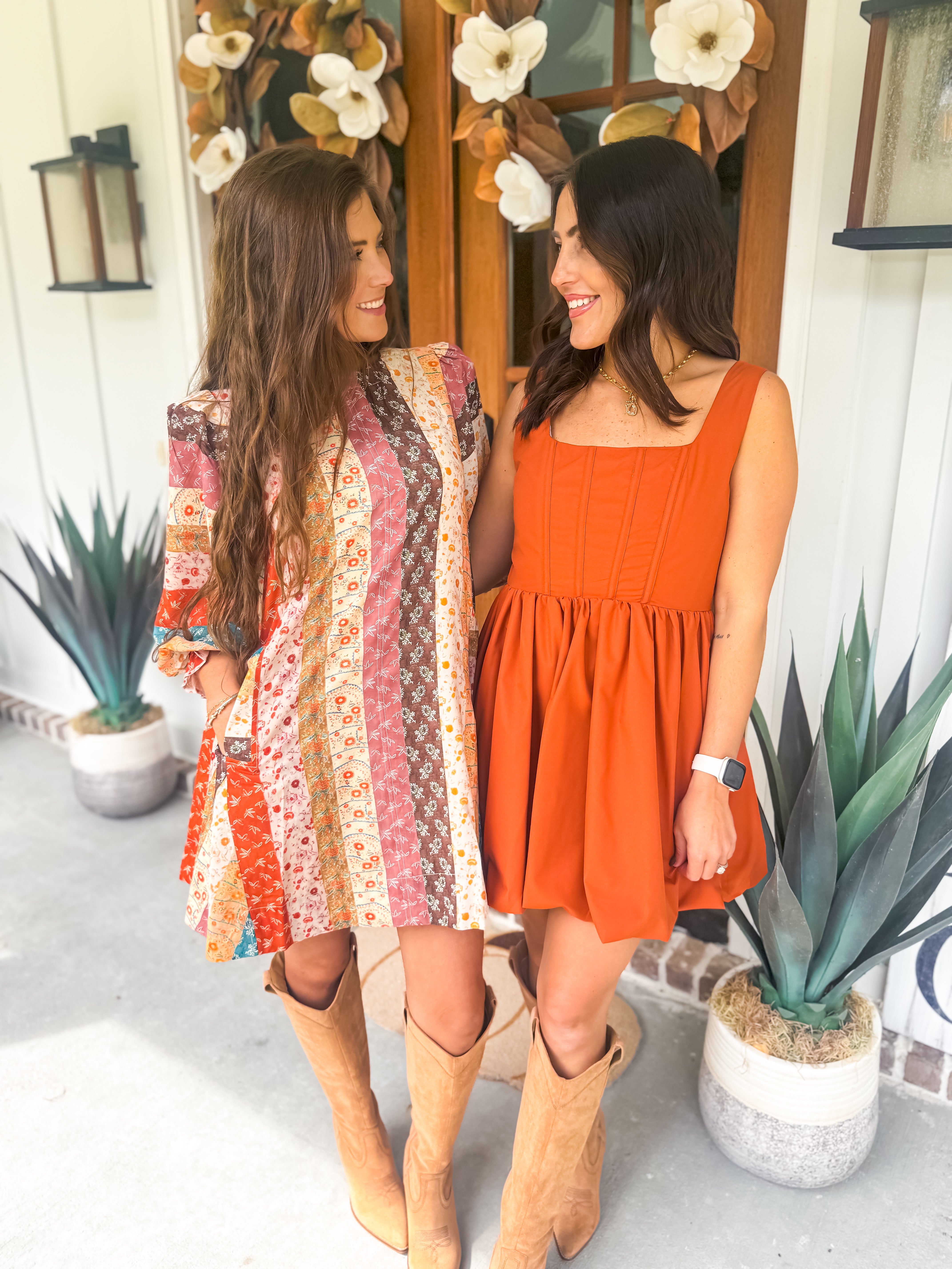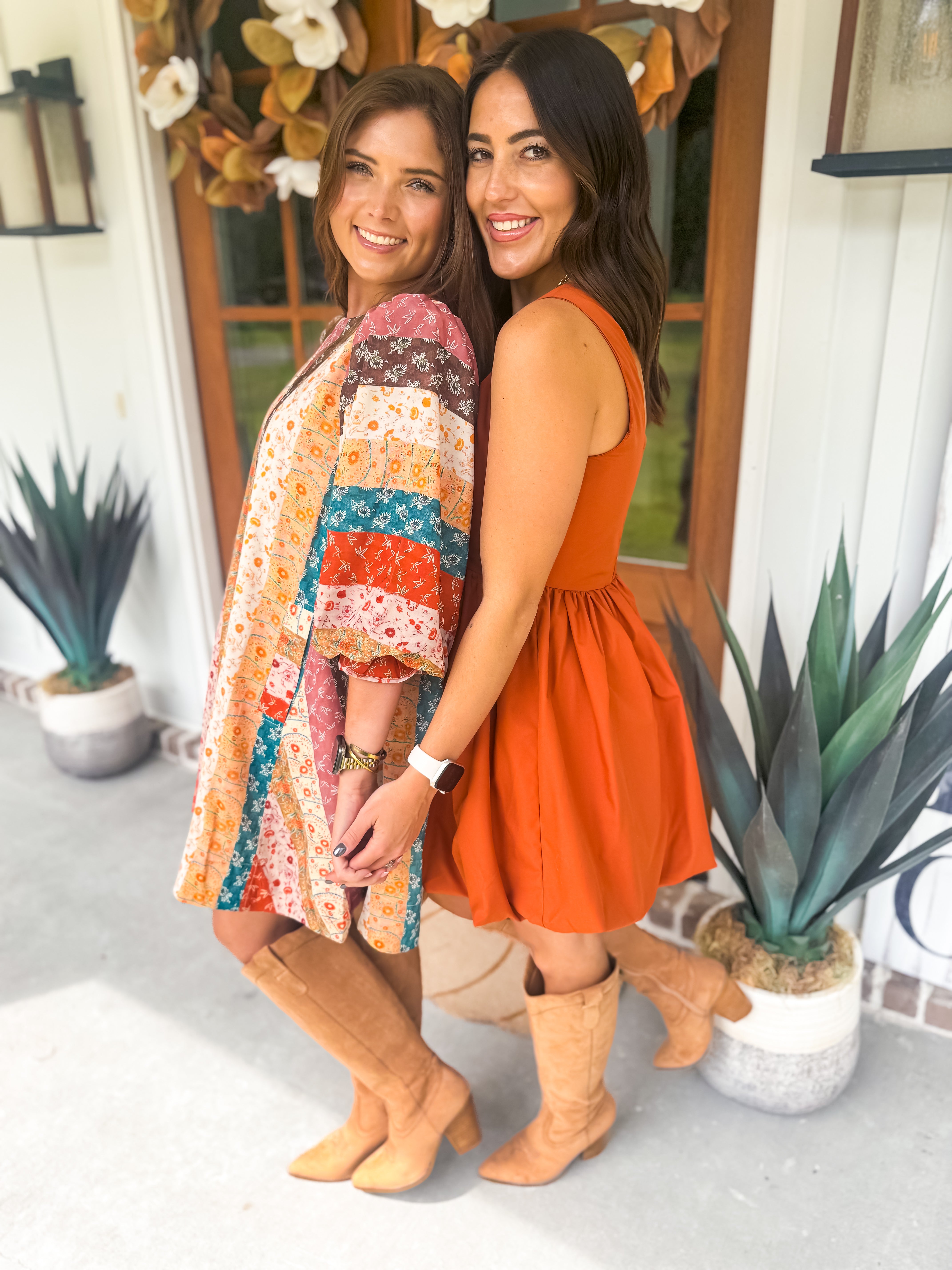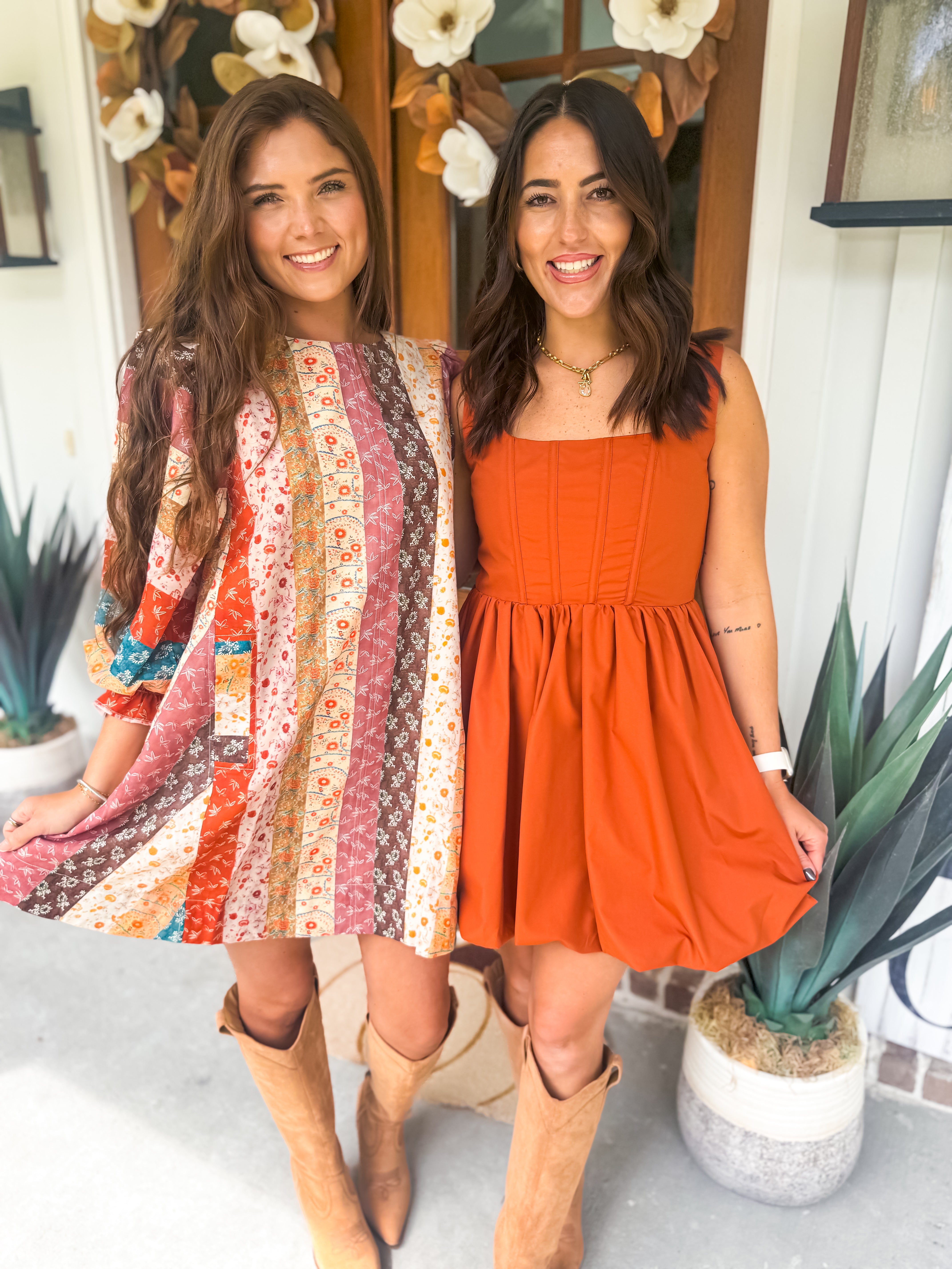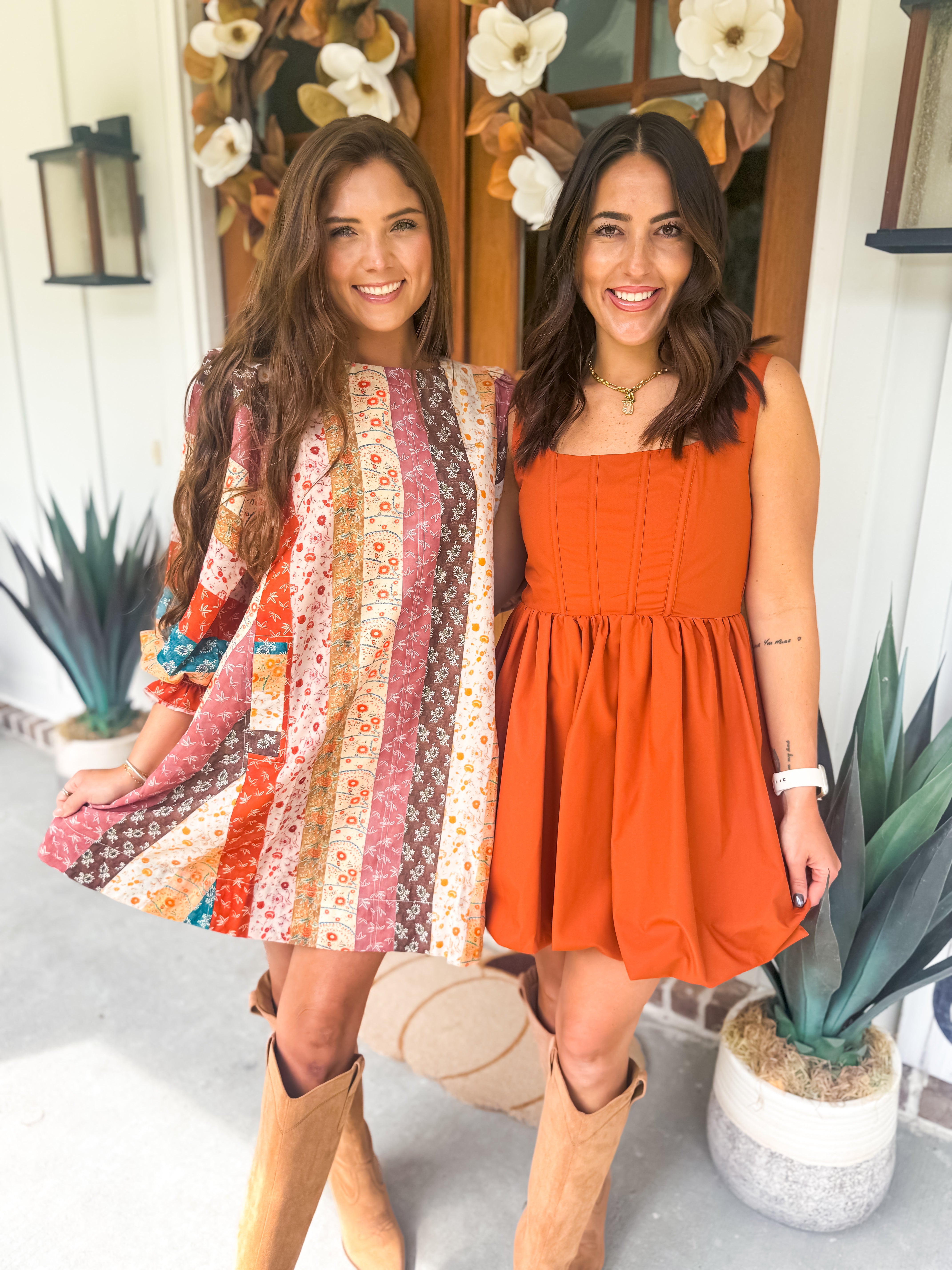 Embrace boho chic with this floral mini dress, showcasing a mix of vibrant patterns and 3/4 sleeves. With handy pockets and a keyhole back closure, it’s a perfect blend of style and practicality.