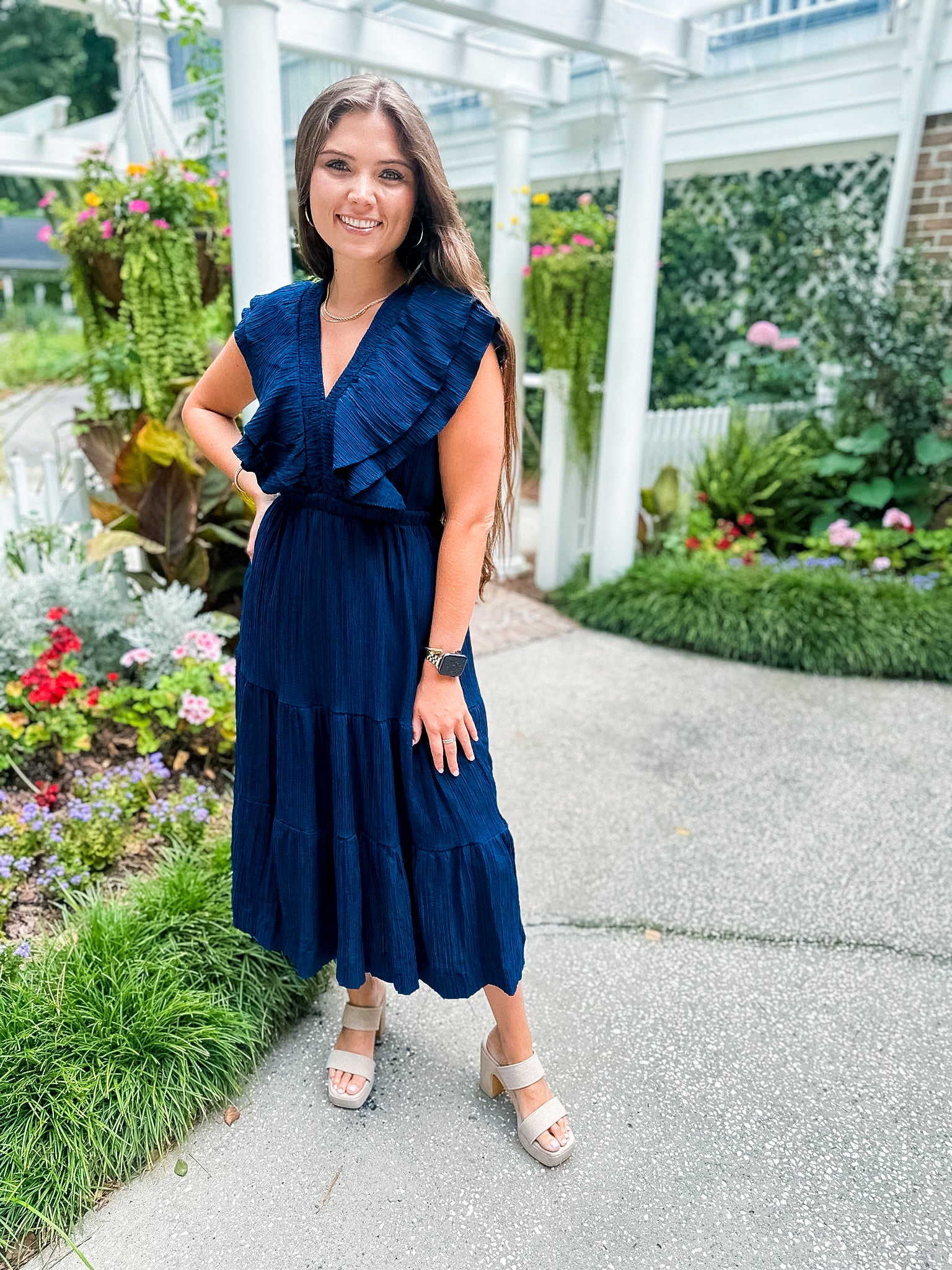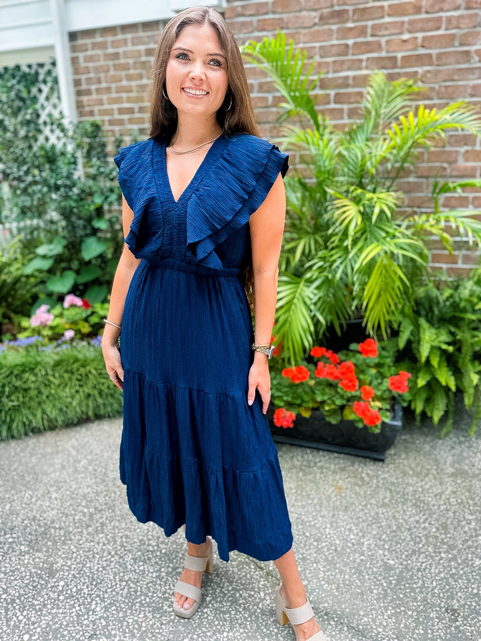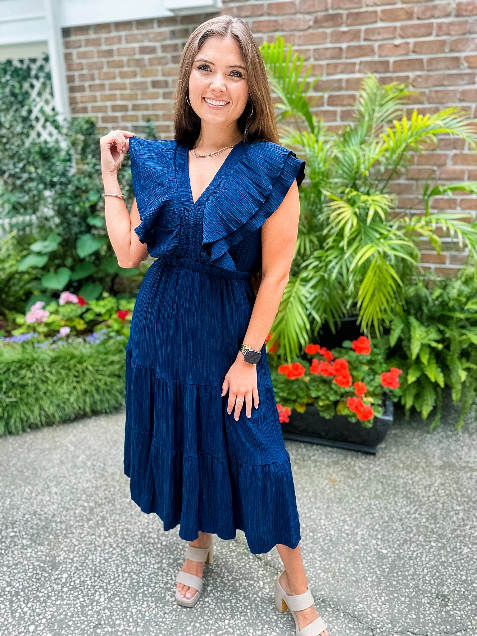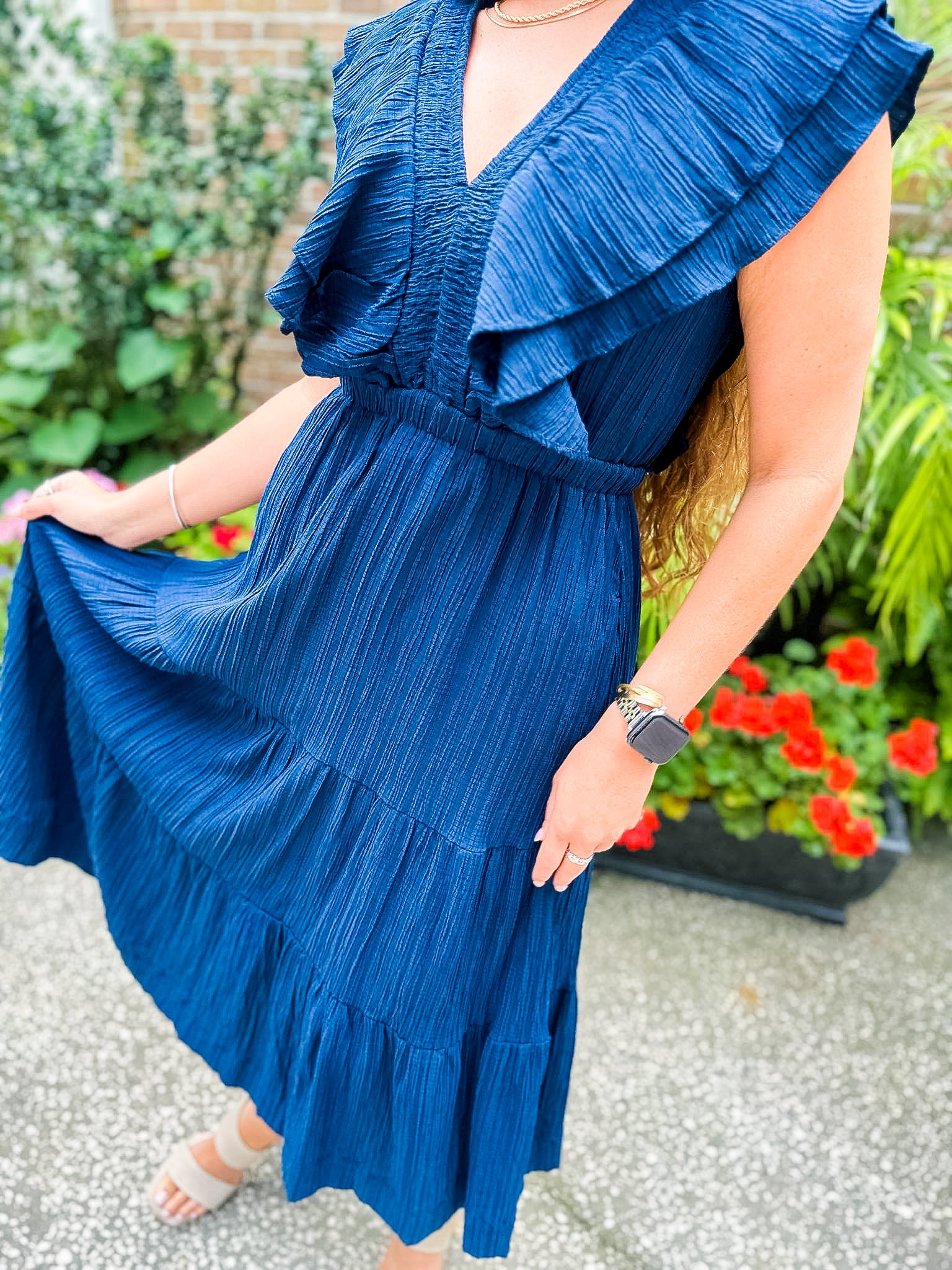 Flutter Sleeve Textured Midi Dress- Navy