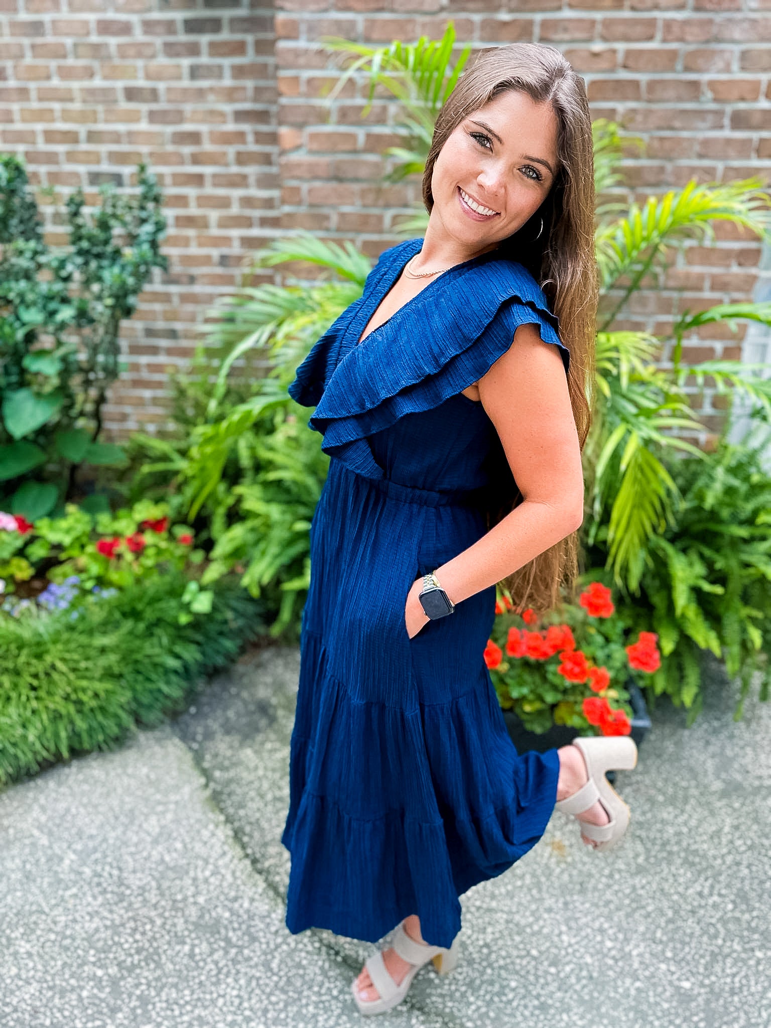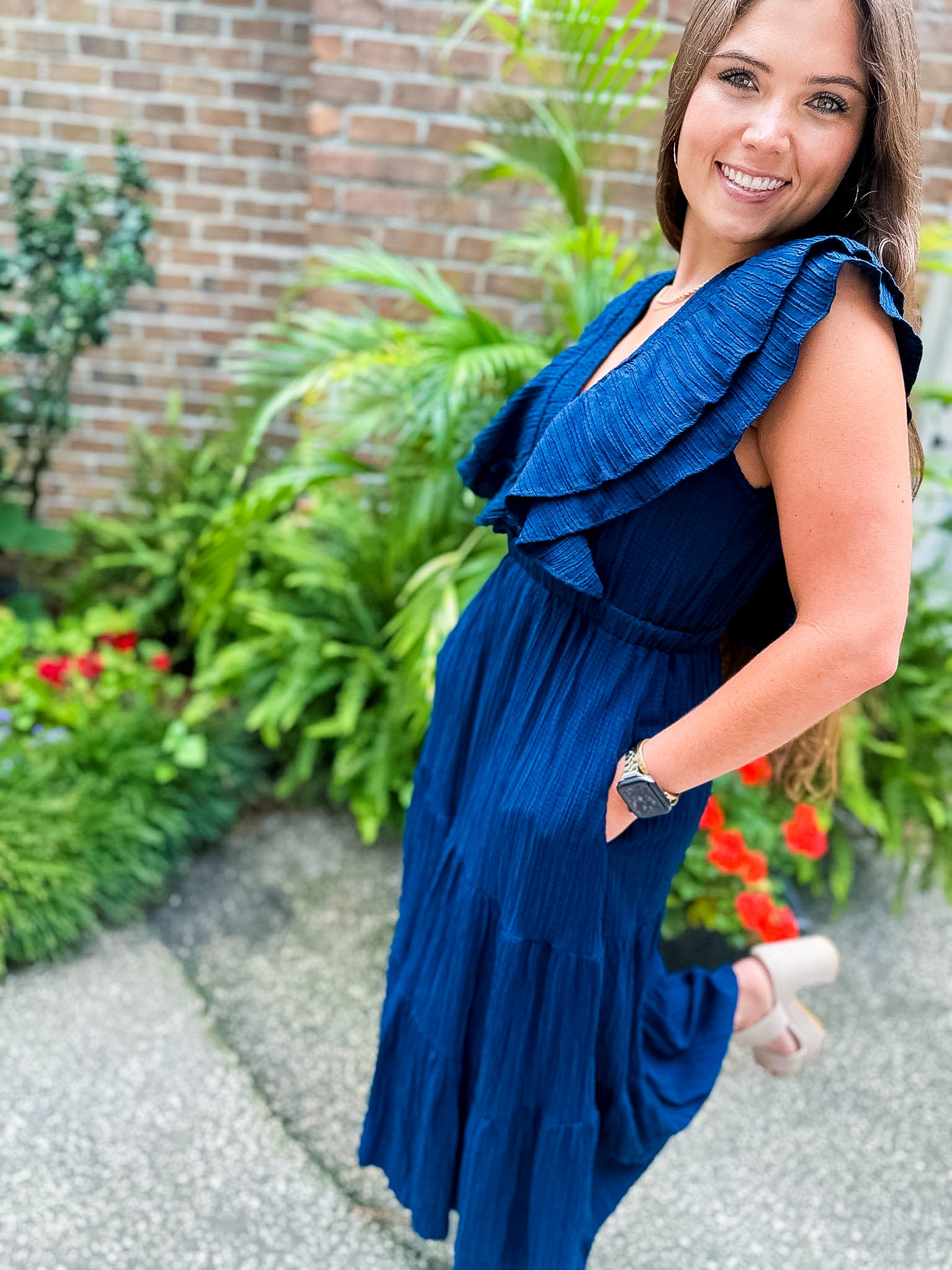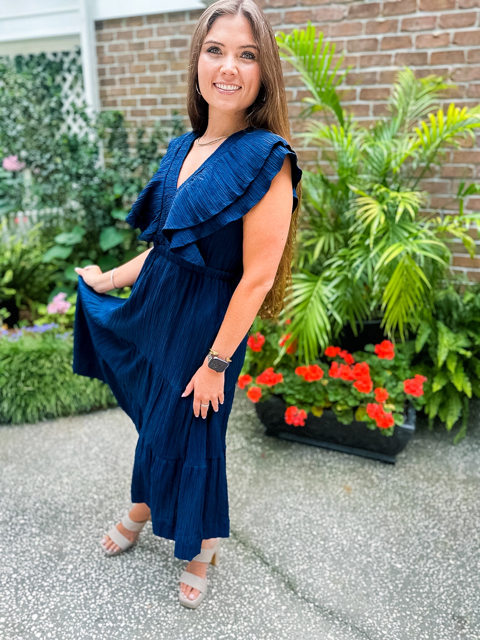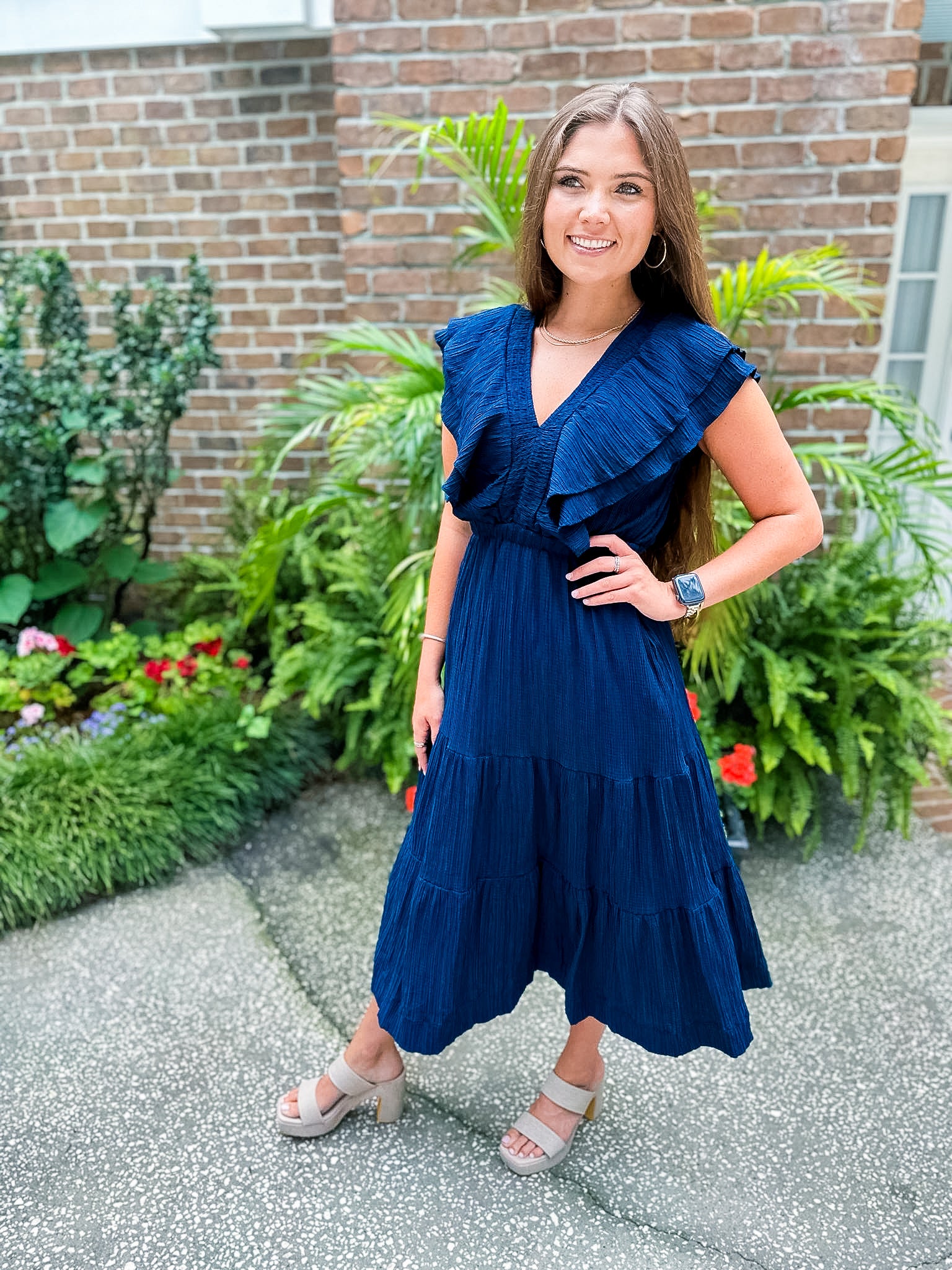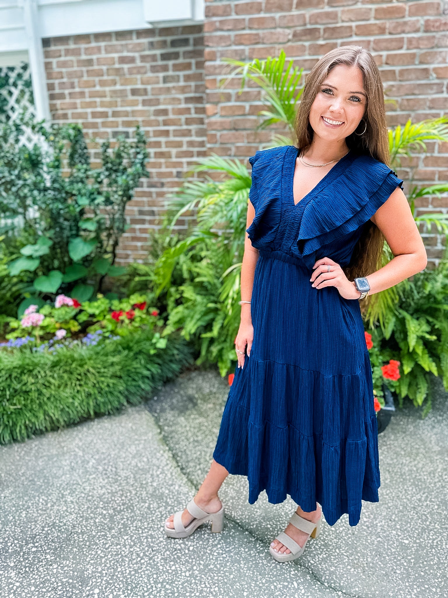 Flutter Sleeve Textured Midi Dress- Navy