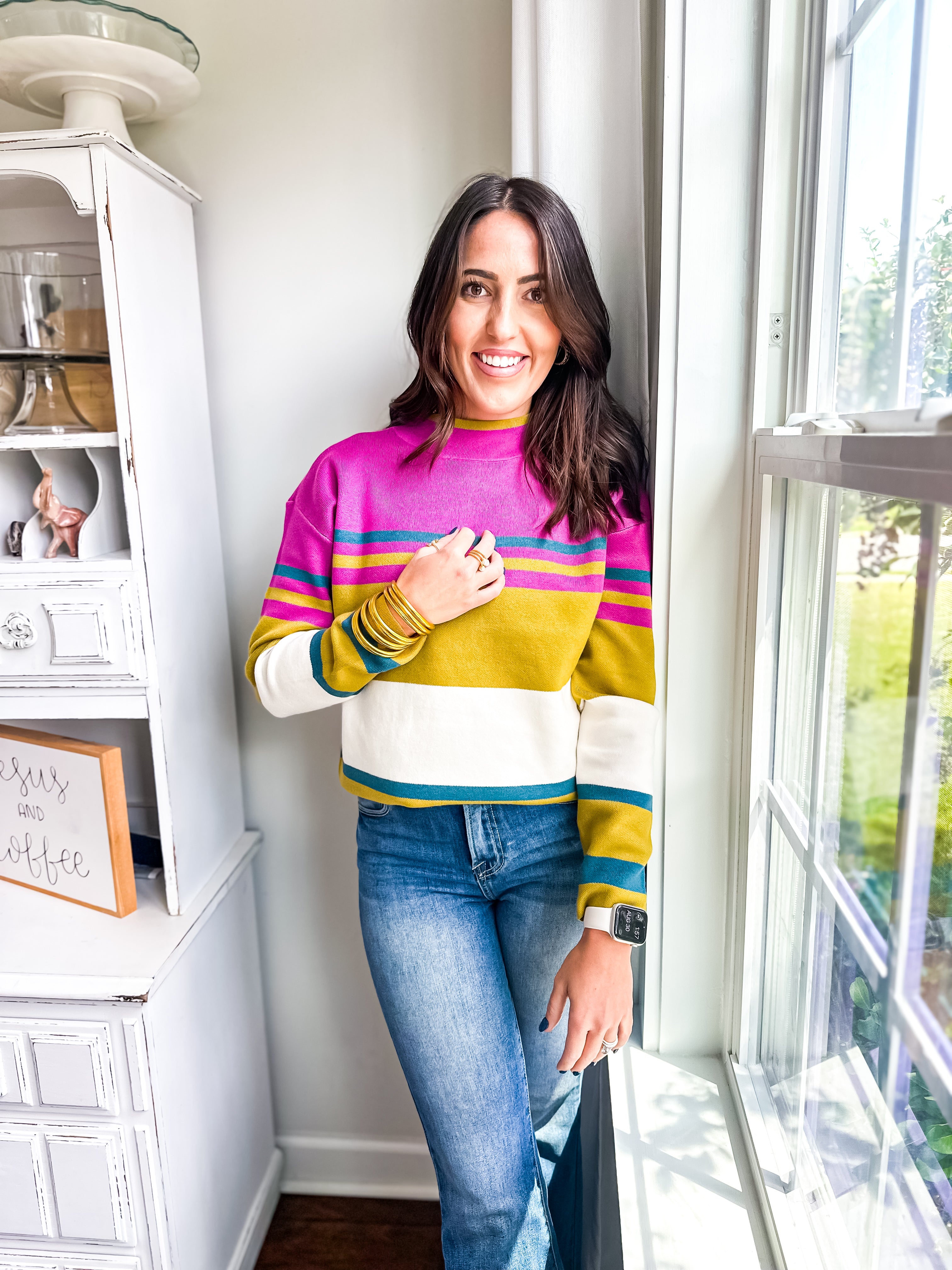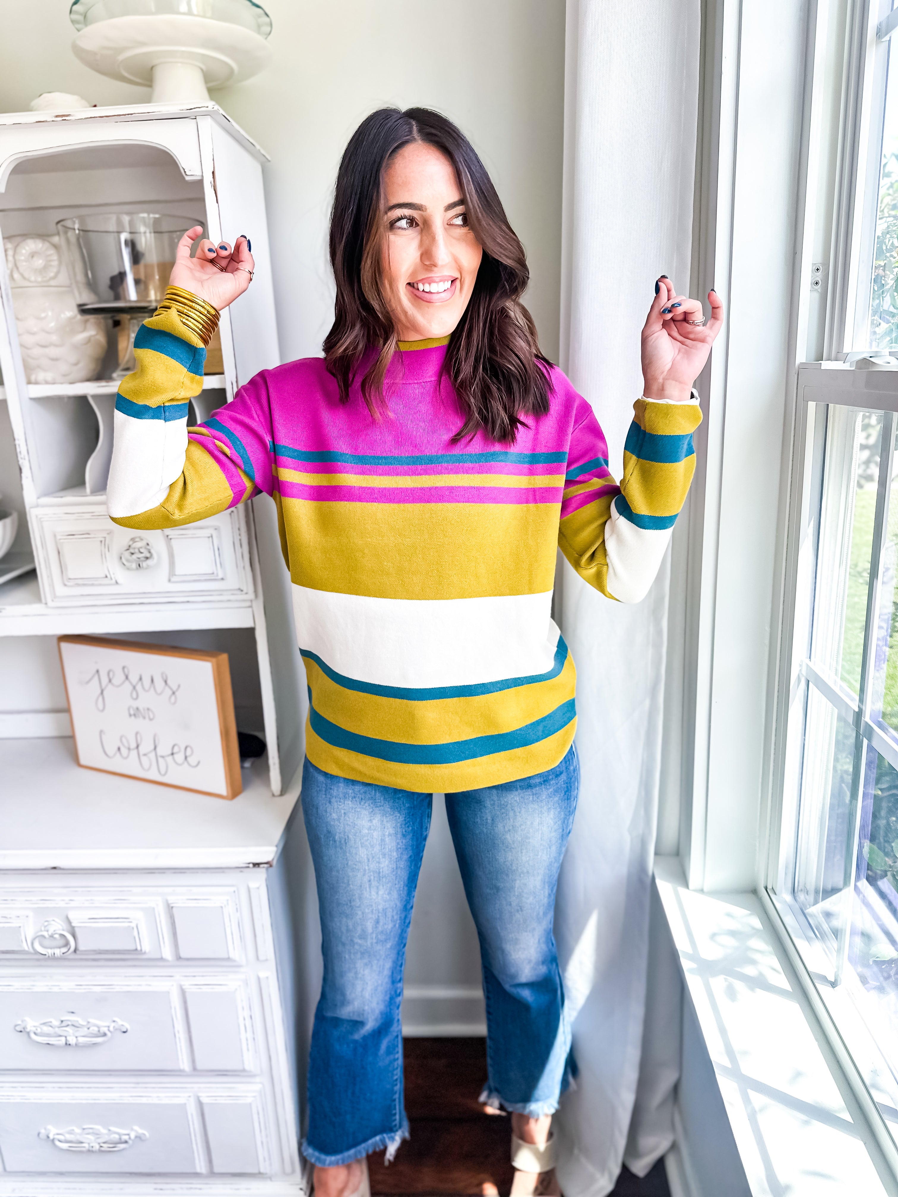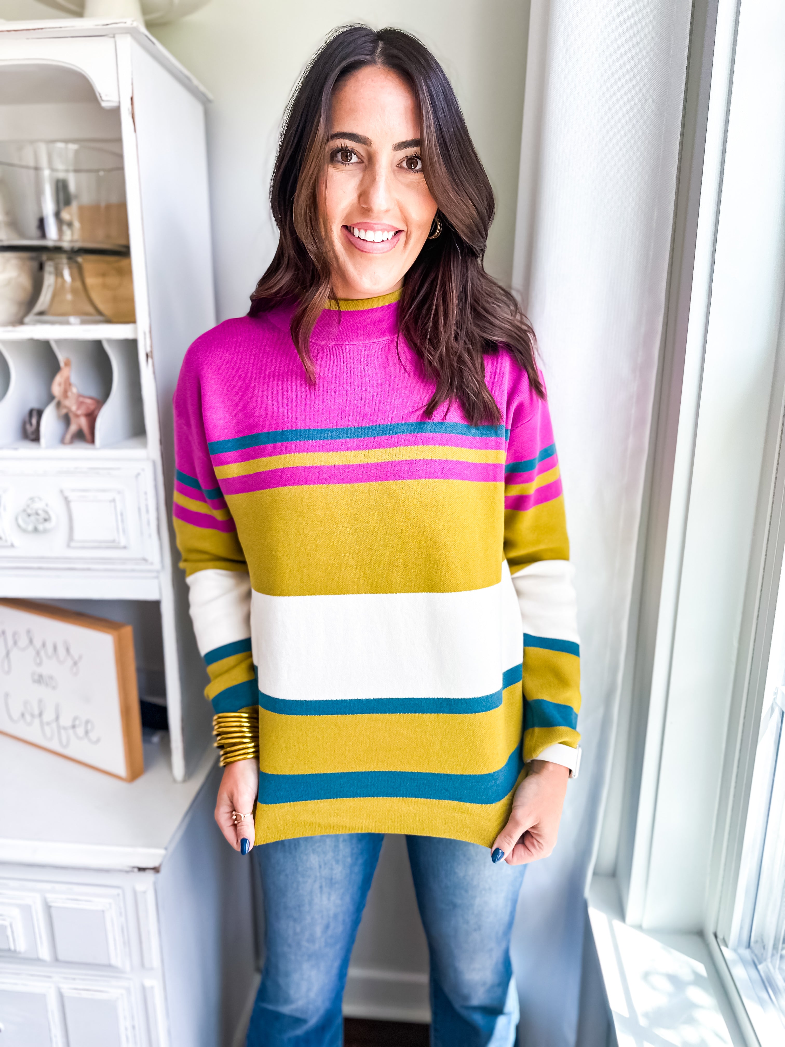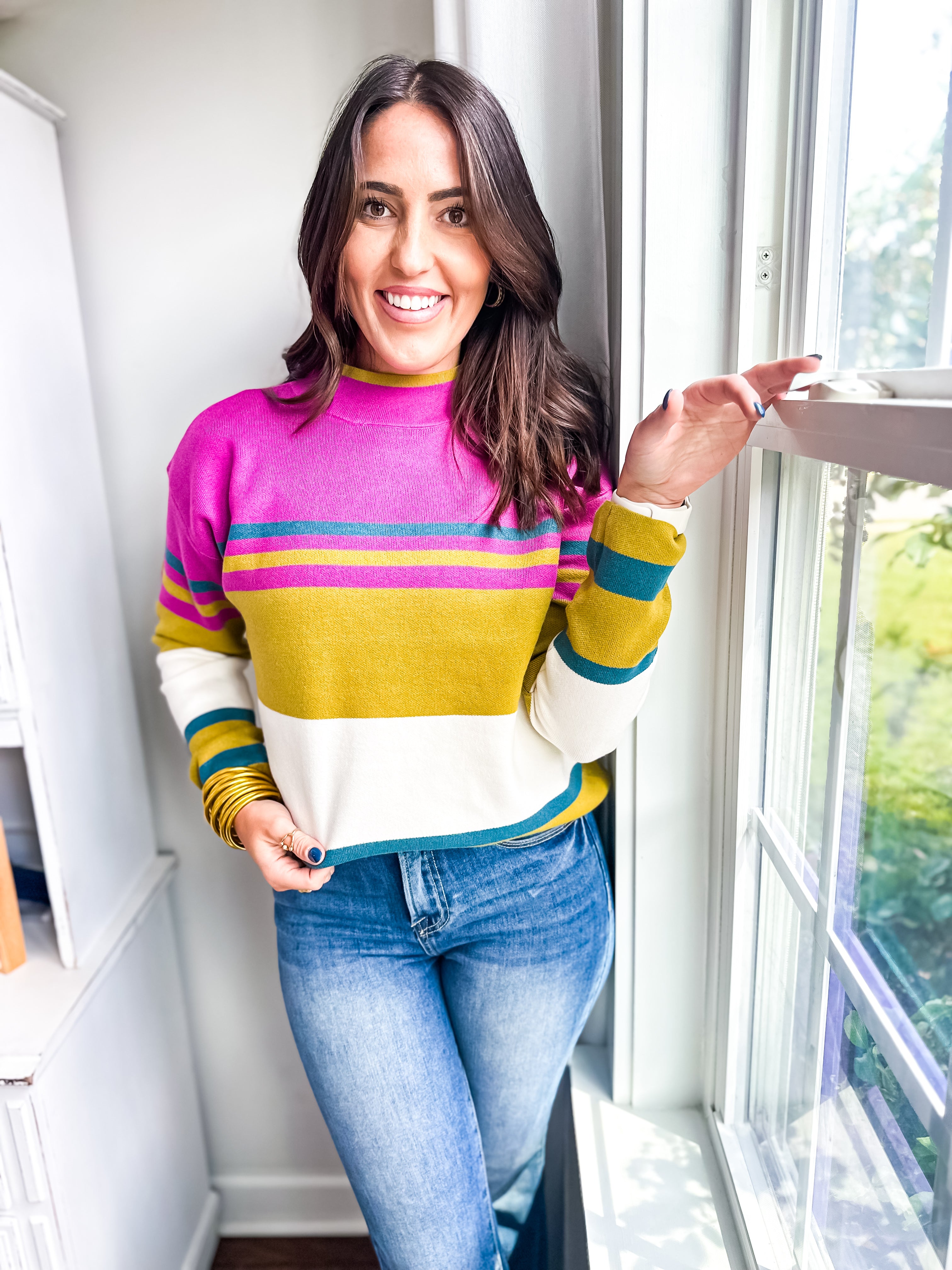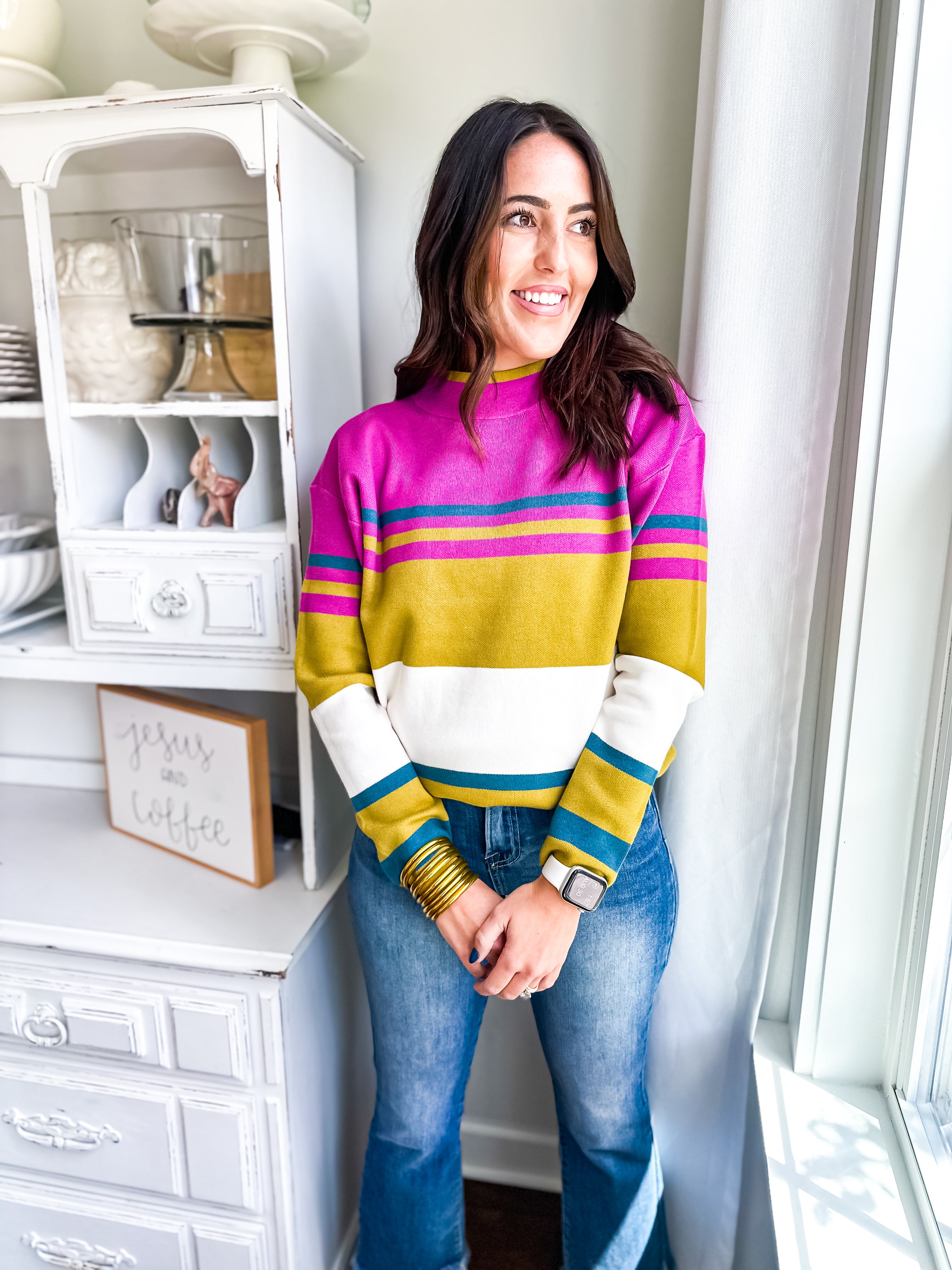 Introducing our Forever Feels Like Sweater in Magenta. We are absolute swooning over this sweater y'all. It features a crew neckline and has a pullover style to it. This sweater is BUTTERY soft - we wish you could feel it through the screen - you would add to cart immediately. This sweater has the prettiest color combo! It has a magenta base with green and mustard throughout. A great sweater to pair with leggings or your favorite denim.