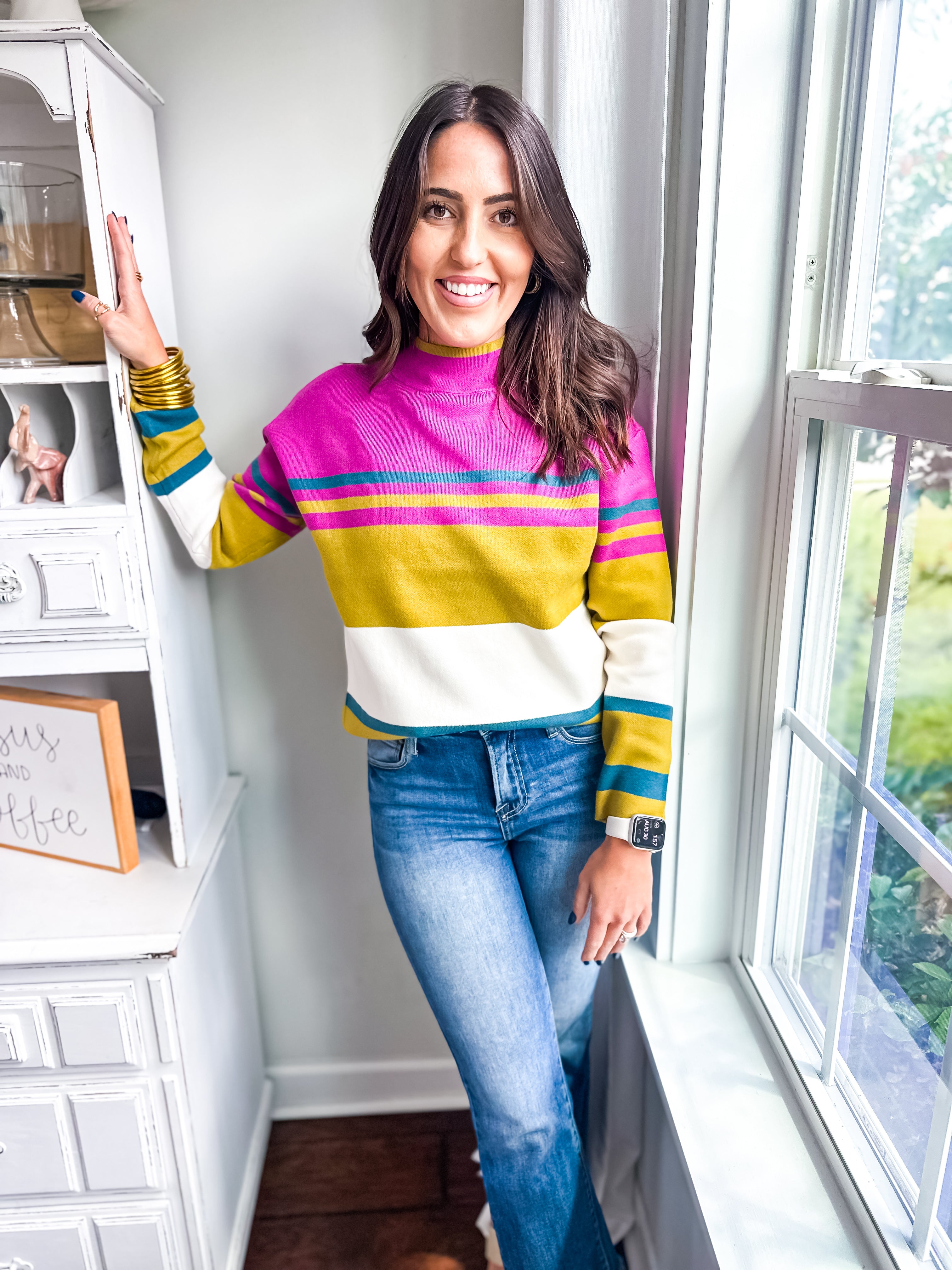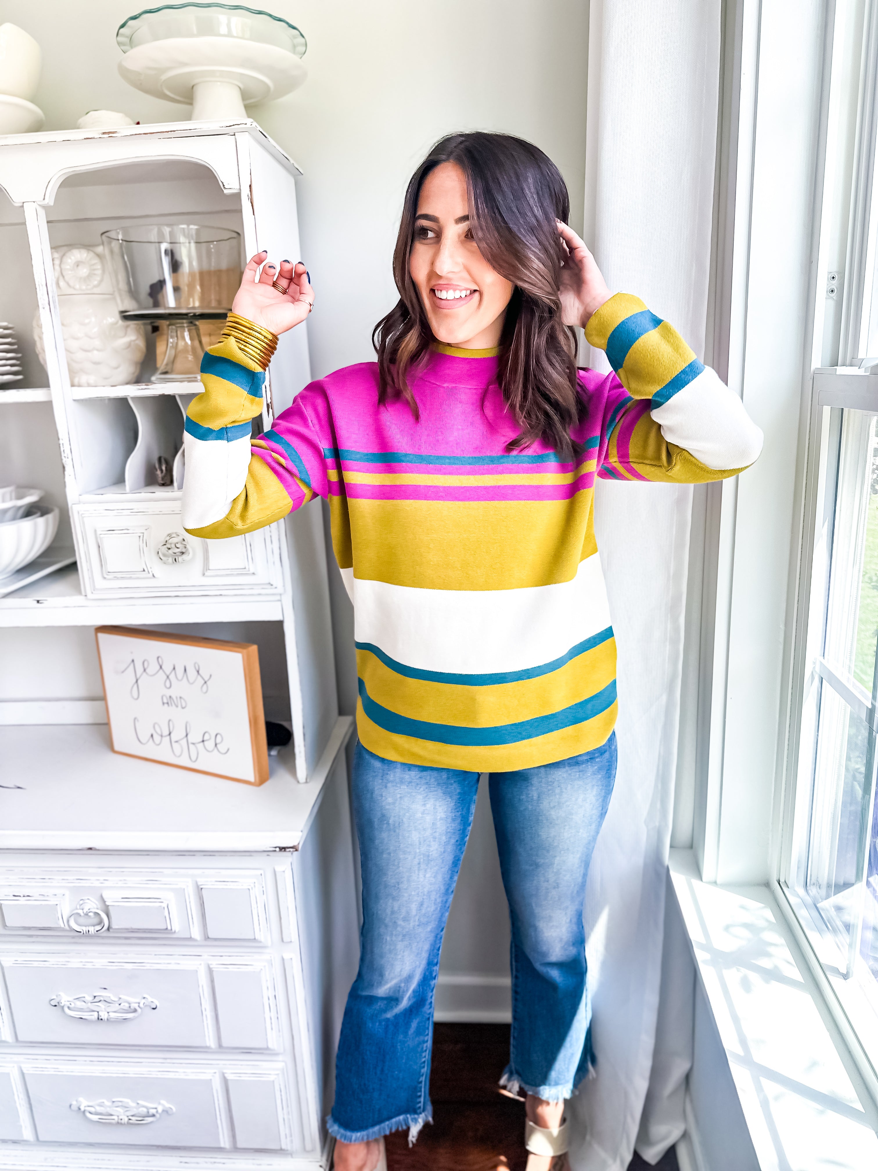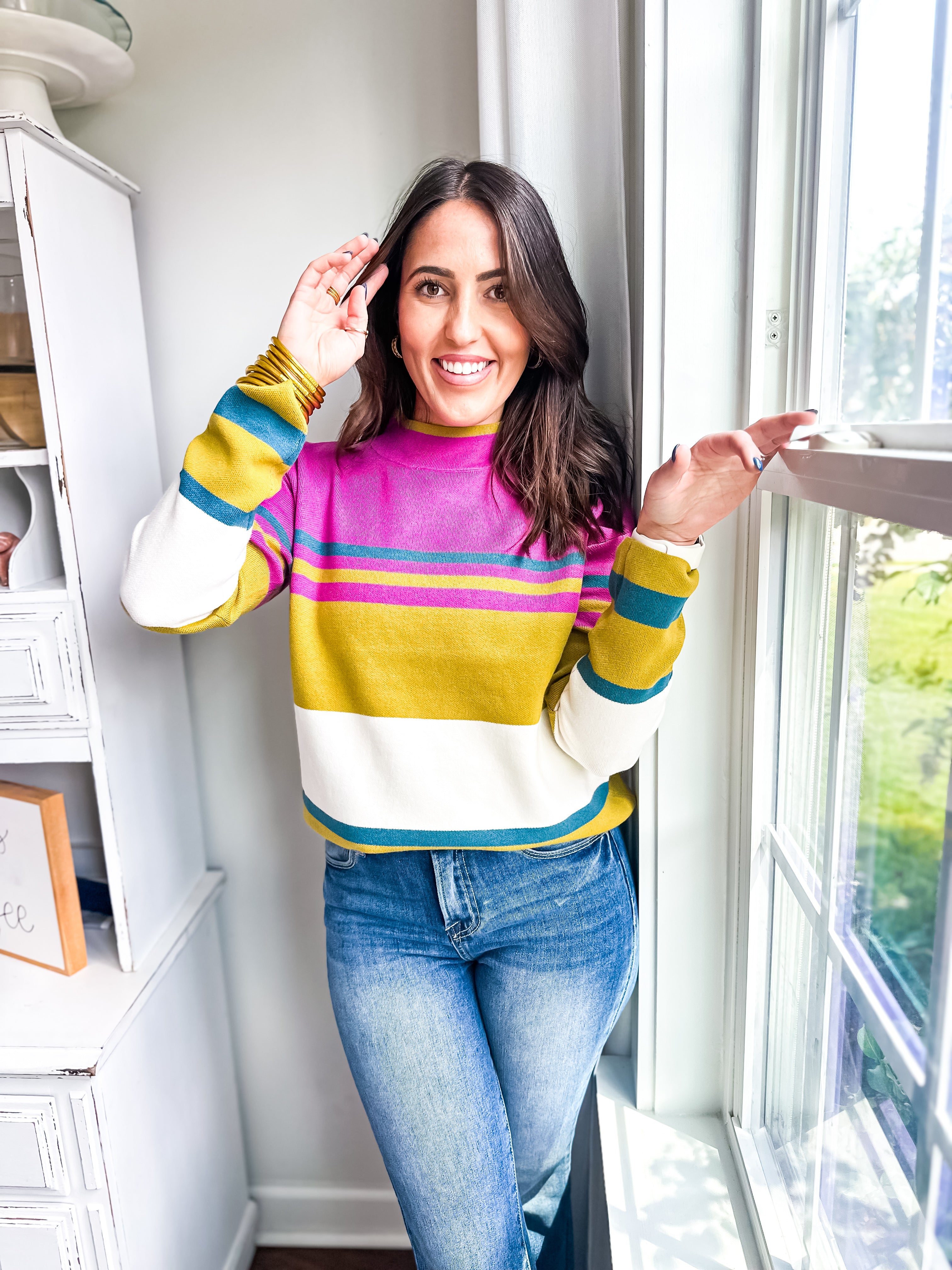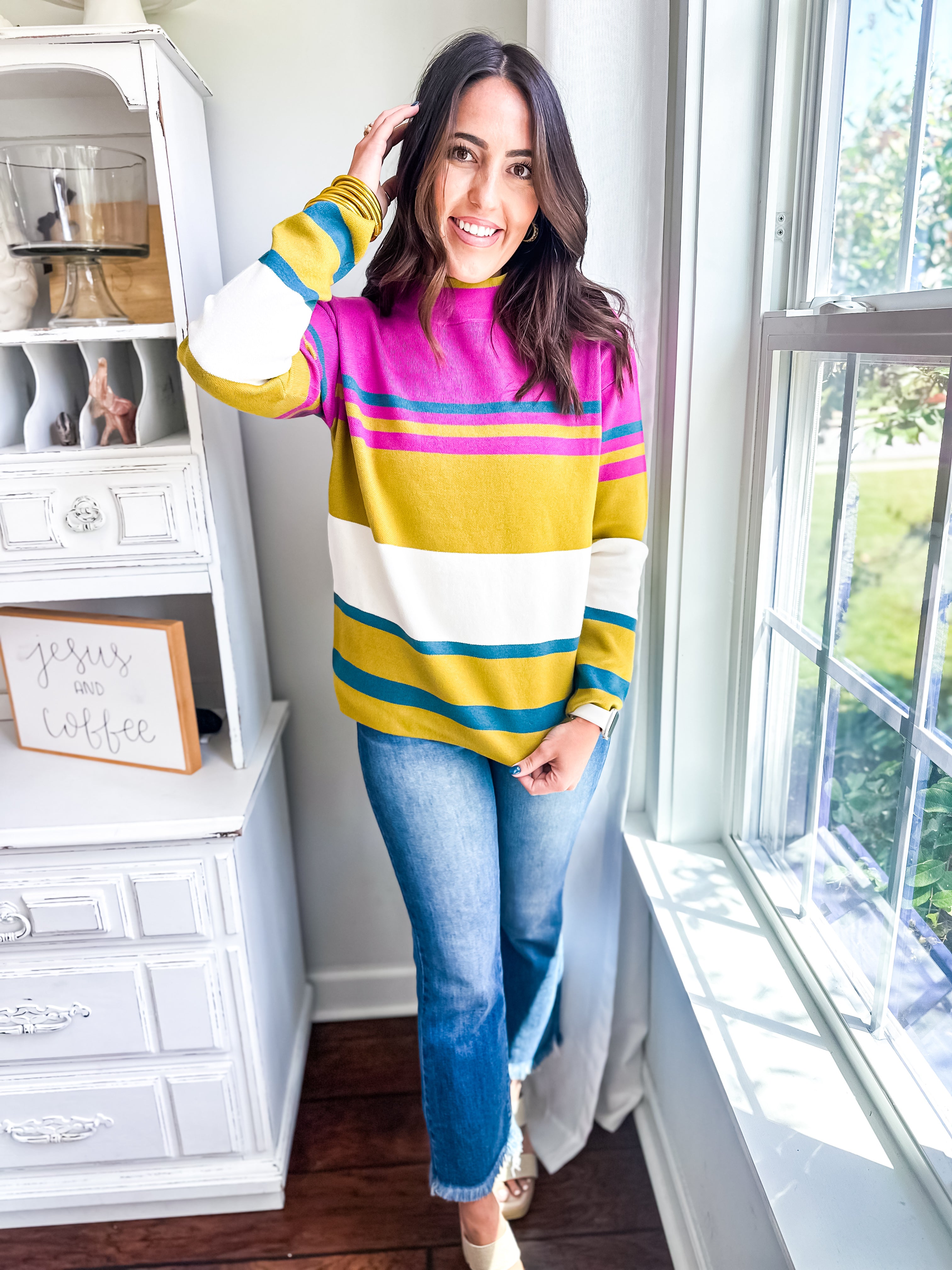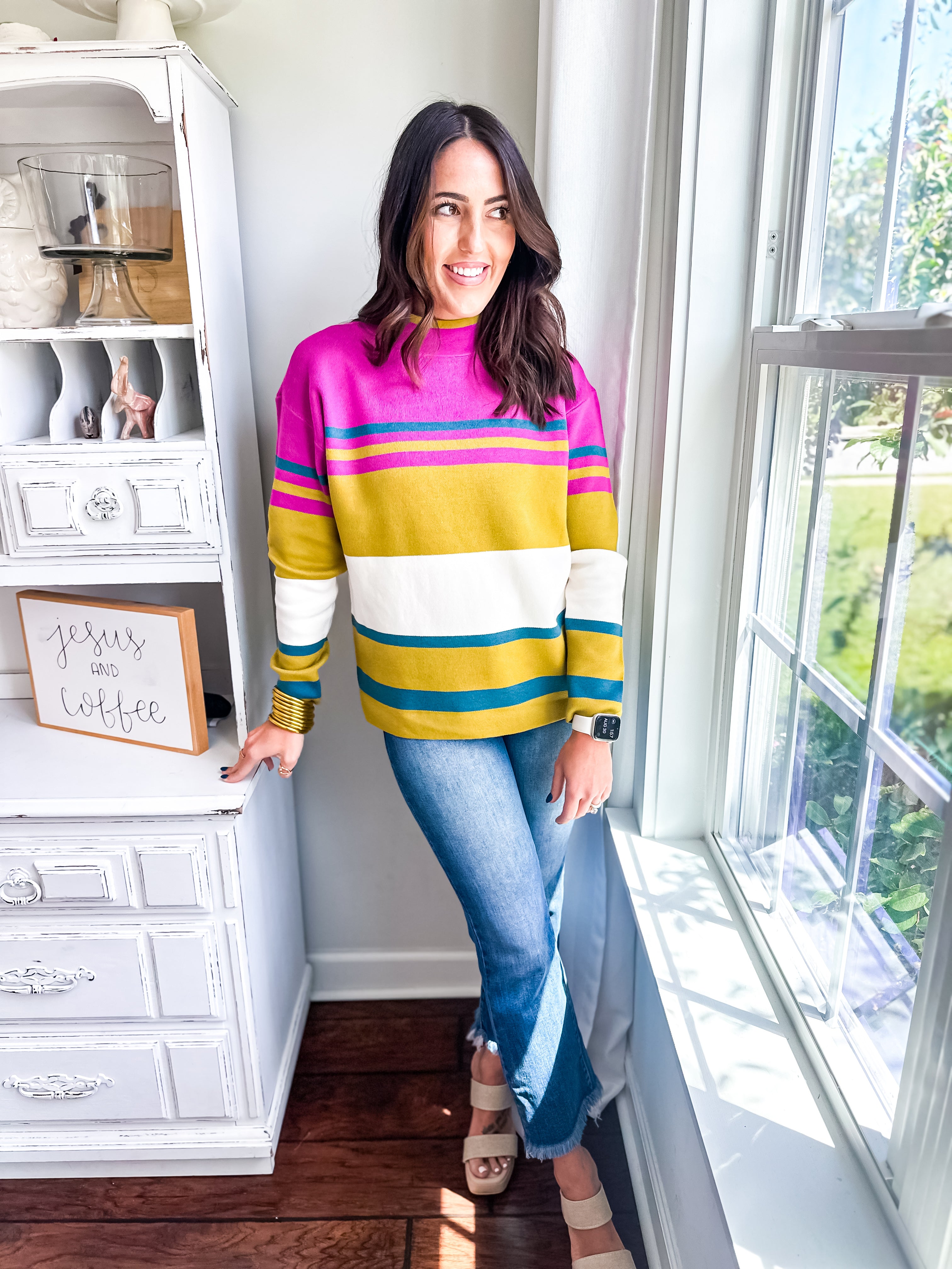Introducing our Forever Feels Like Sweater in Magenta. We are absolute swooning over this sweater y'all. It features a crew neckline and has a pullover style to it. This sweater is BUTTERY soft - we wish you could feel it through the screen - you would add to cart immediately. This sweater has the prettiest color combo! It has a magenta base with green and mustard throughout. A great sweater to pair with leggings or your favorite denim.