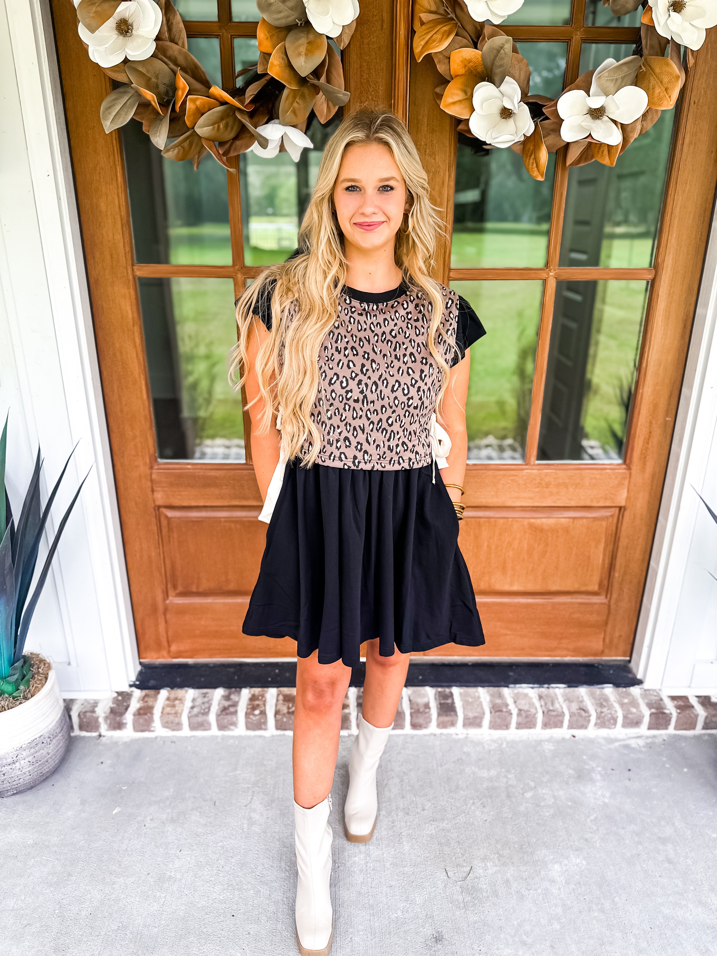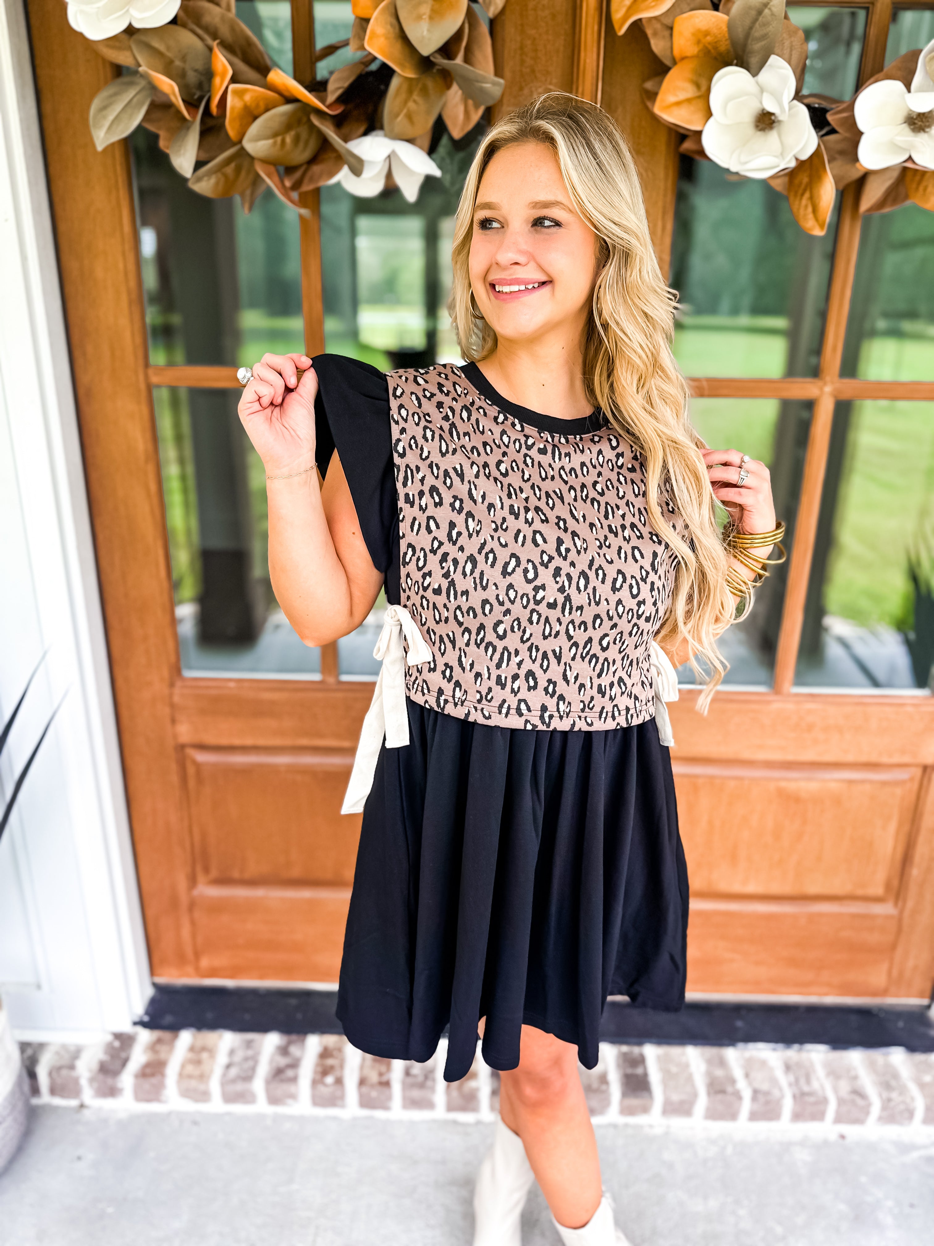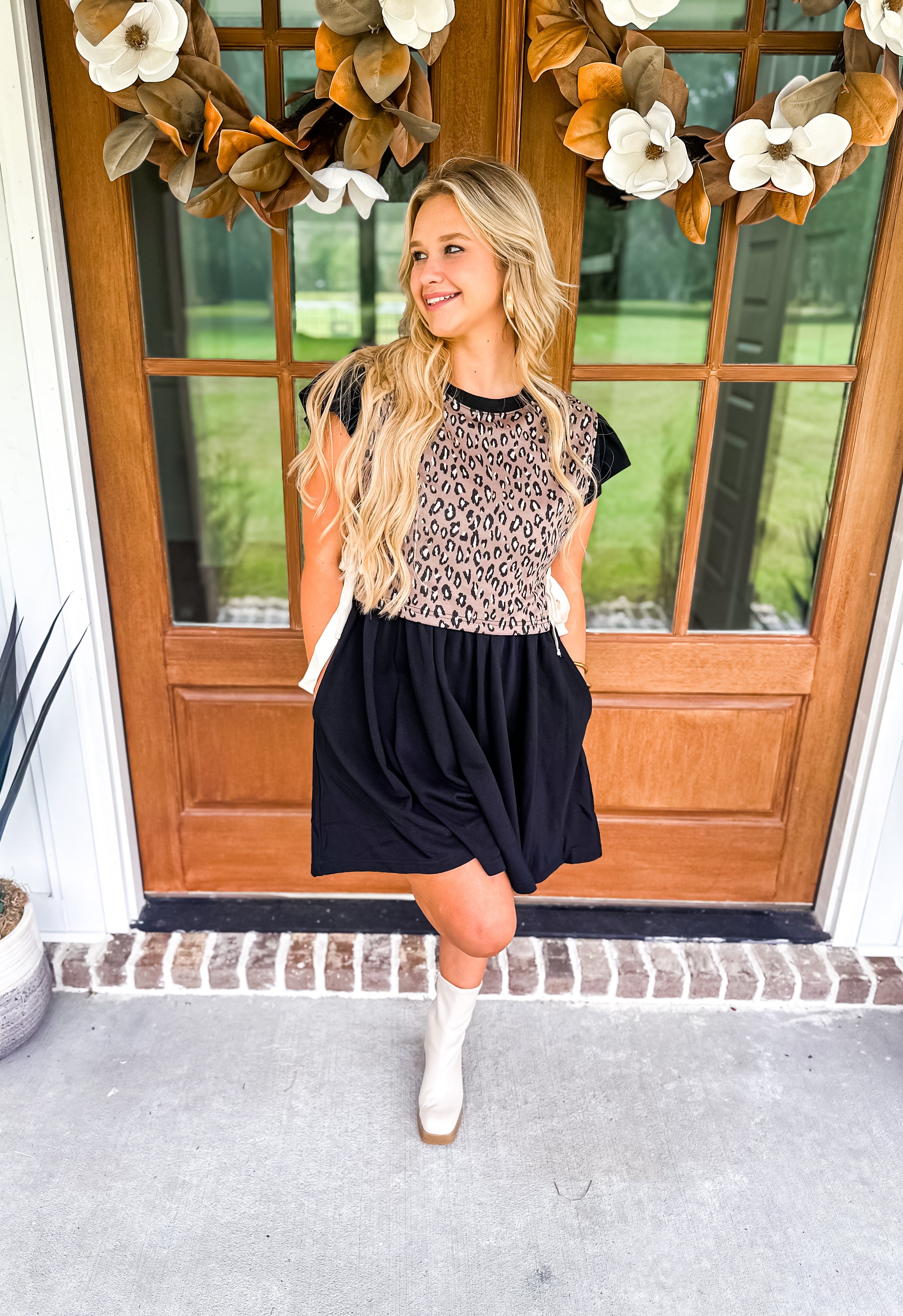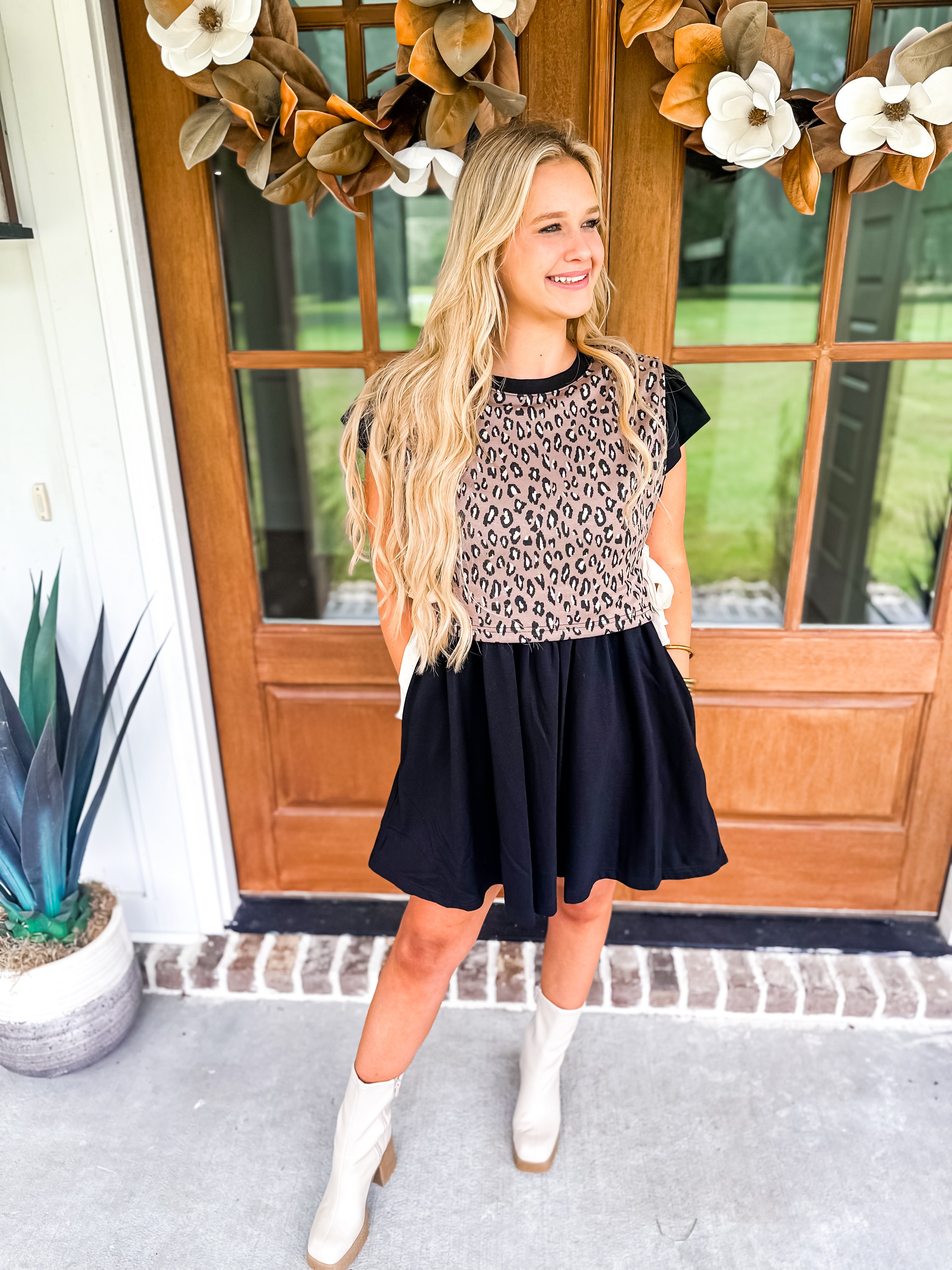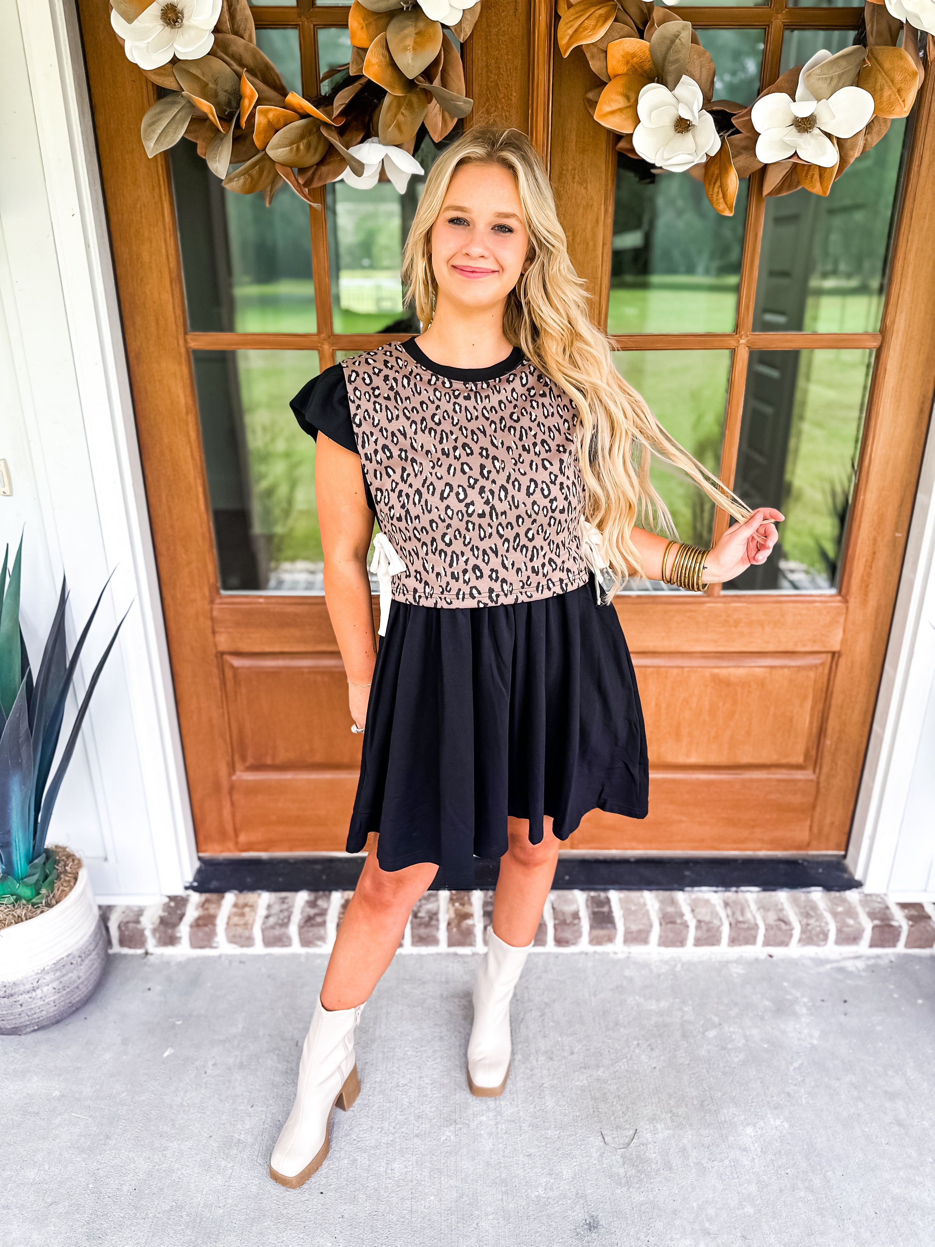Turn heads in this playful mini dress featuring a bold leopard print twofer! The flutter sleeves add a flirty touch to the solid-colored silhouette, while the side pockets bring a practical edge. Whether you're stepping out for brunch or a night out, this dress is the perfect blend of fierce and feminine!
