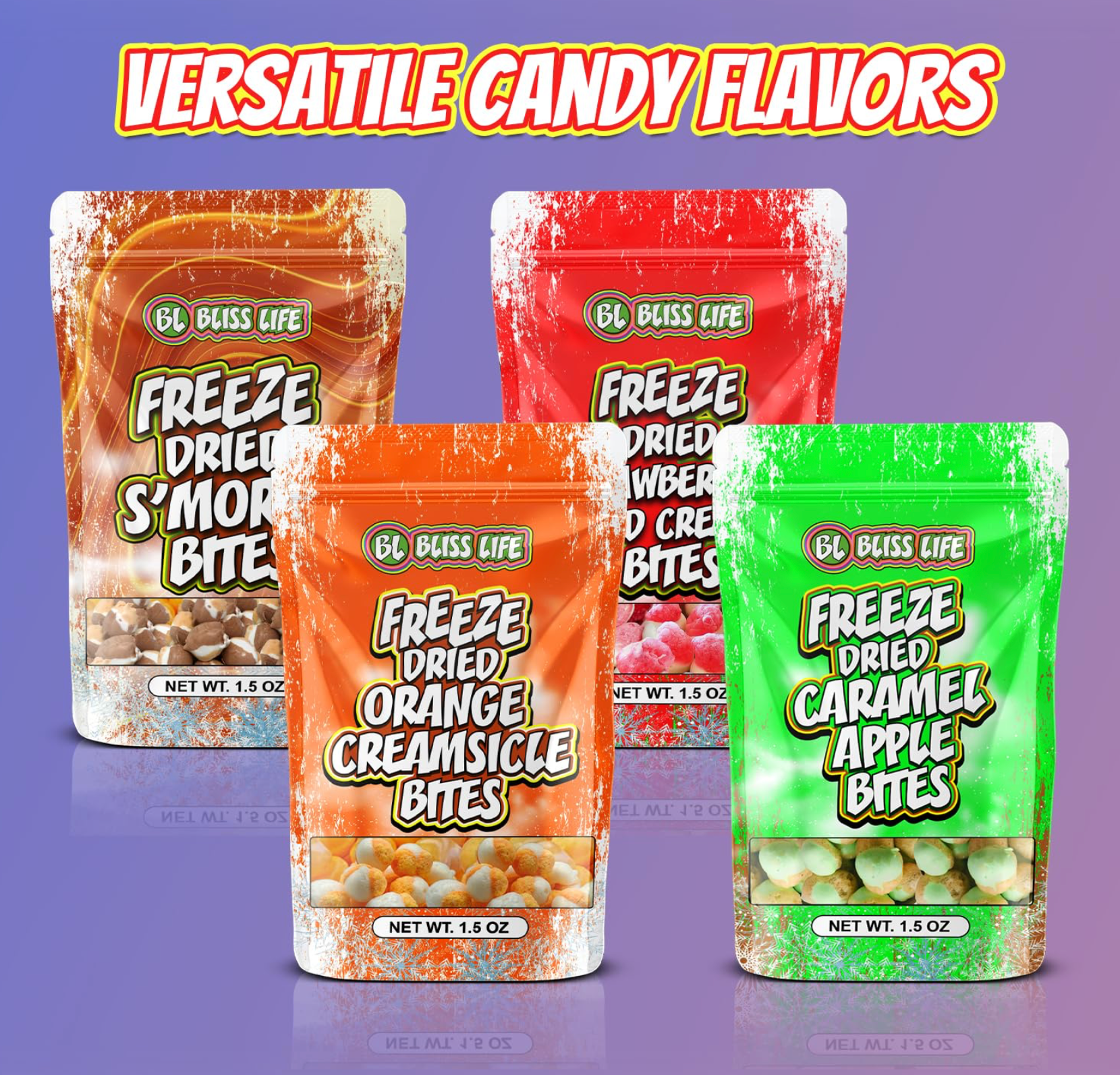 - Deliciously Unique Freeze-Dried Candy: Indulge in Bliss Life's freeze-dried candy bites, featuring four mouthwatering flavors—Strawberries & Cream, S'mores, Caramel Apple, and Orange Creamsicle. Perfect for satisfying your sweet tooth in a healthier way.